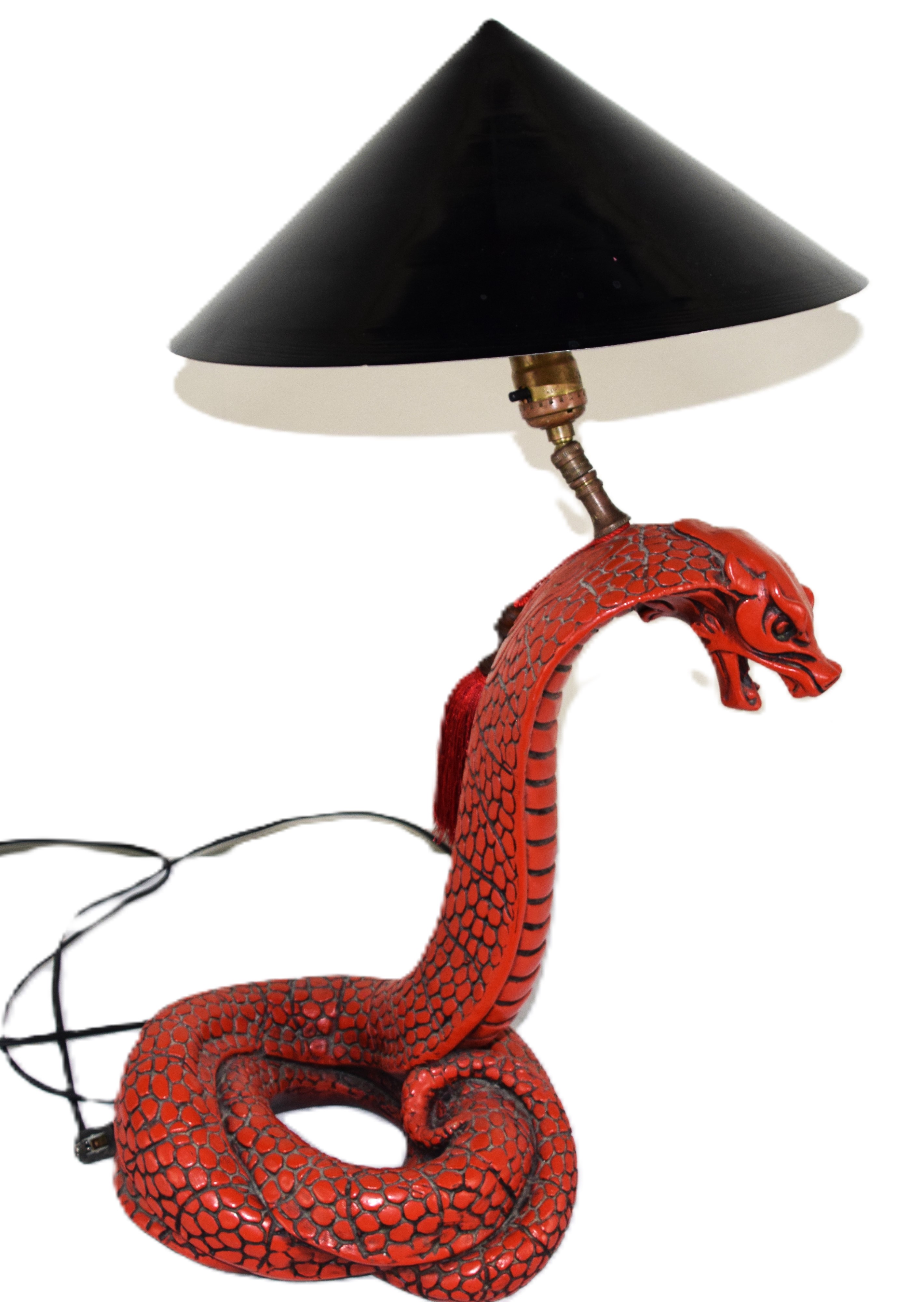 Resin made cobra snake lamp, red color , Asian design with tin shade. Dimensions: 24″ H