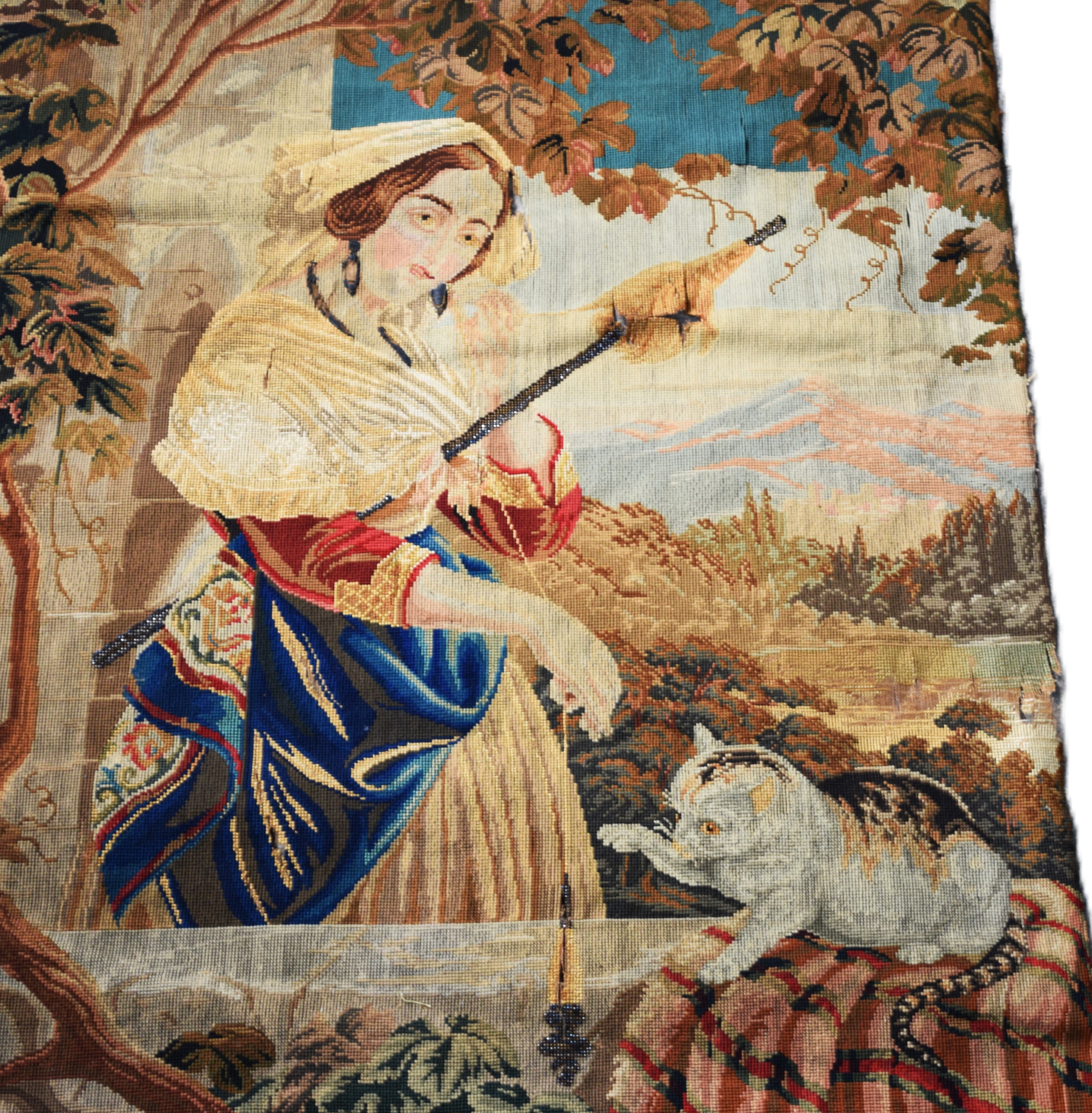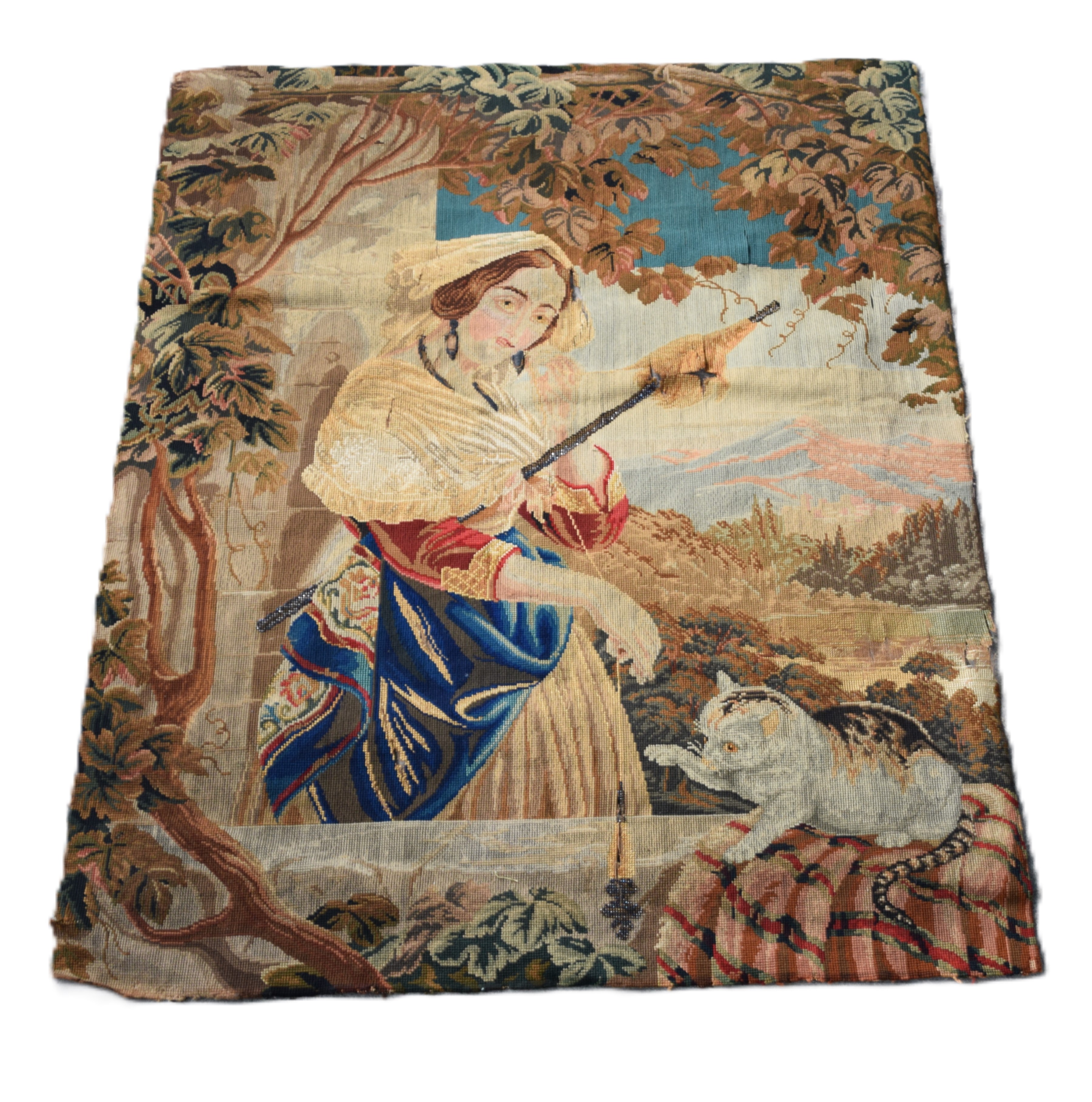 Needlework tapestry of a girl with cat, From a New London NH home. Dimensions: 37″ x 30″