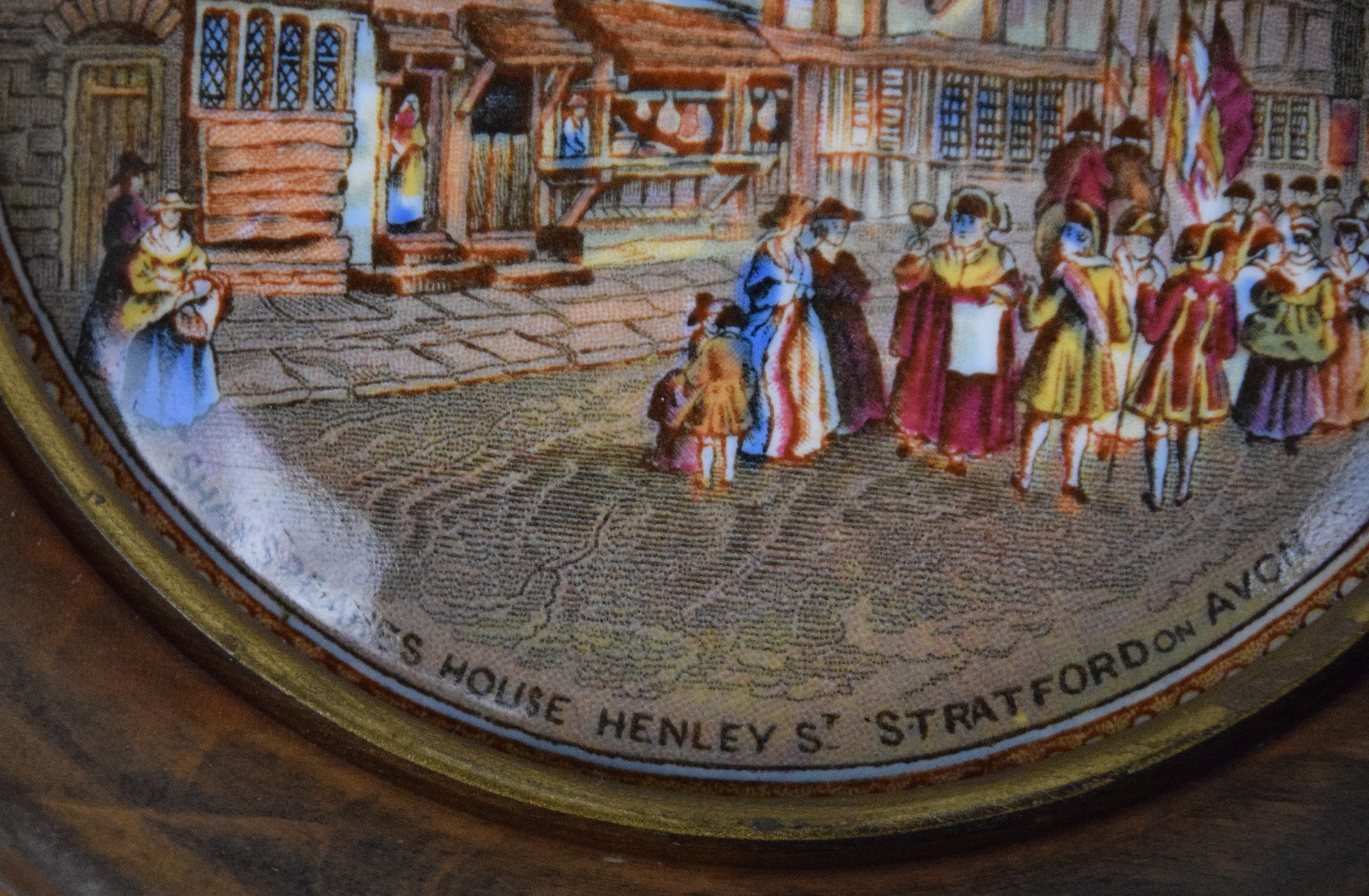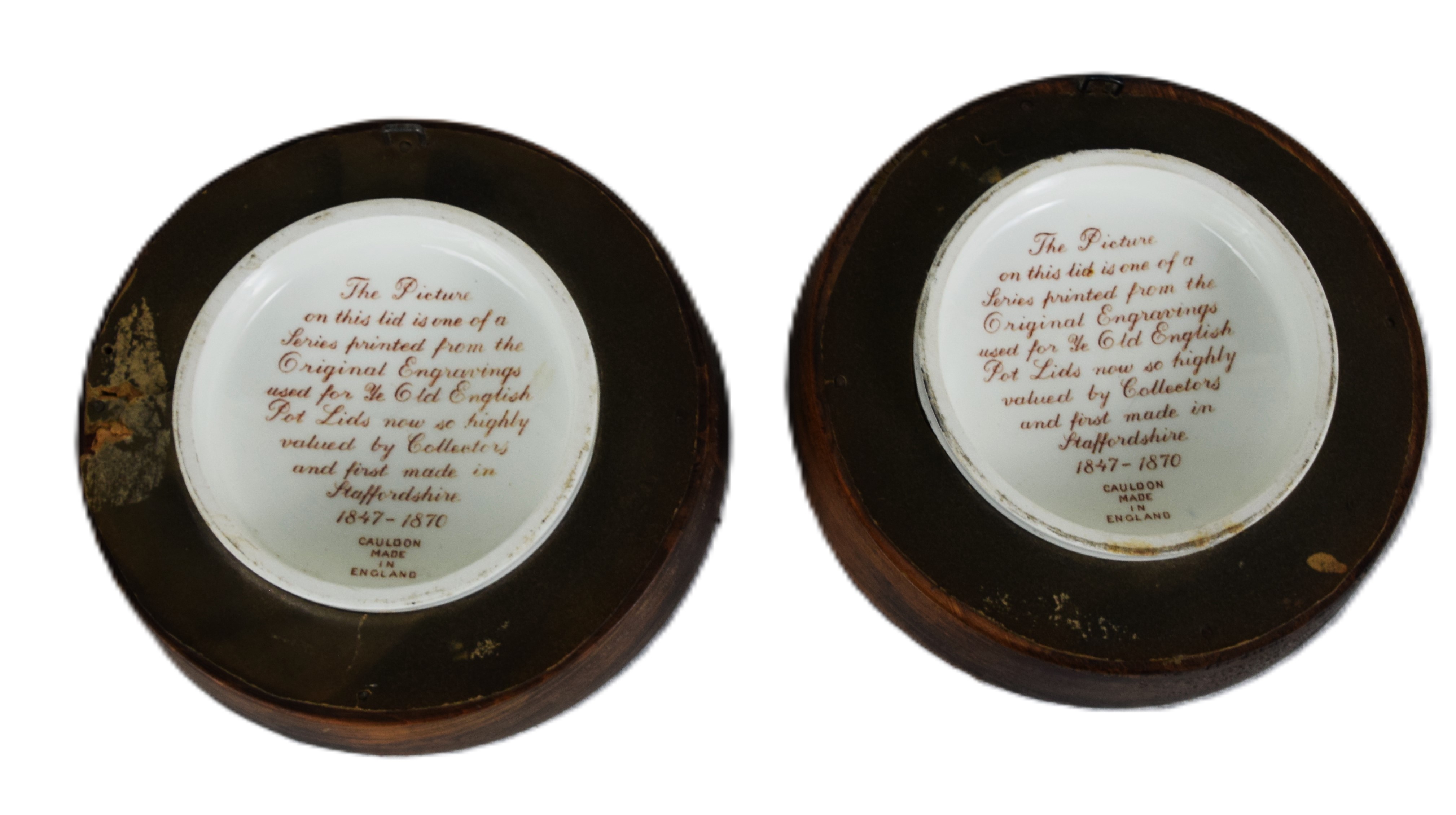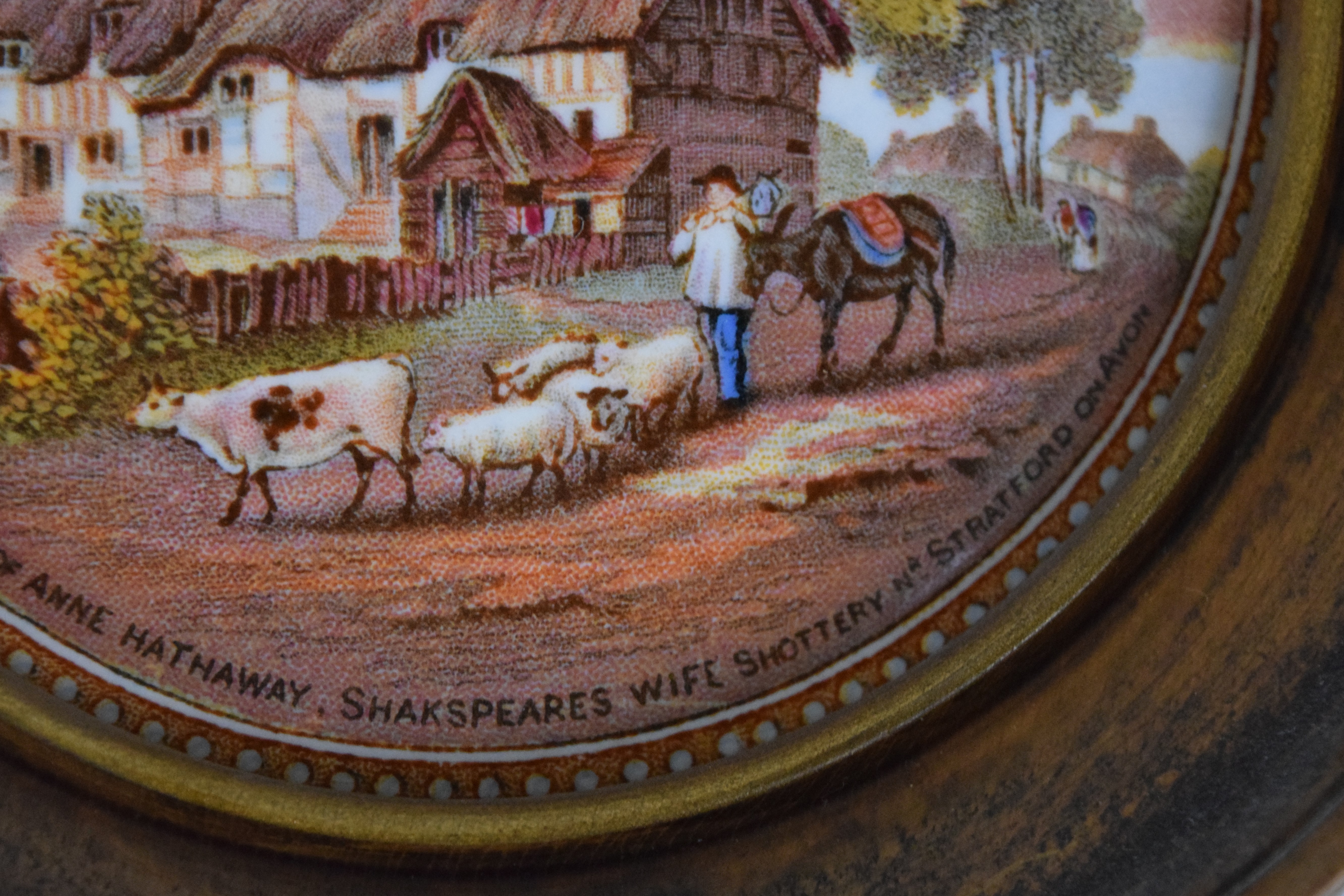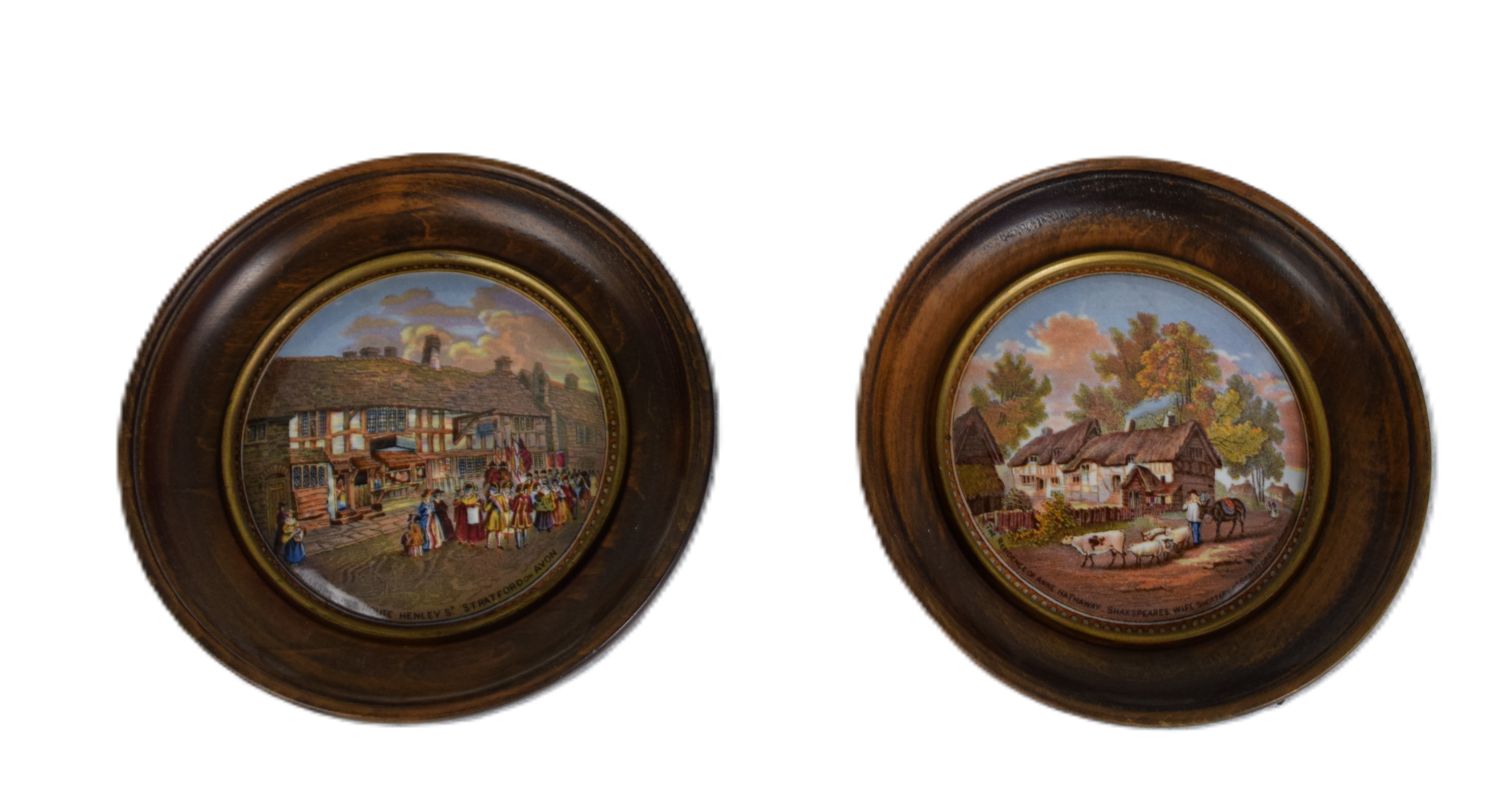 Pair of Staffordshire Pratt lids with the title “The Residence of Anne Hawthaway, Shakespeare’s wife Shottery Stratford on Avon” and “Shakespeare’s House Henley’s Stratford on Avon” both in circular frames. Dimensions 6″ Dia