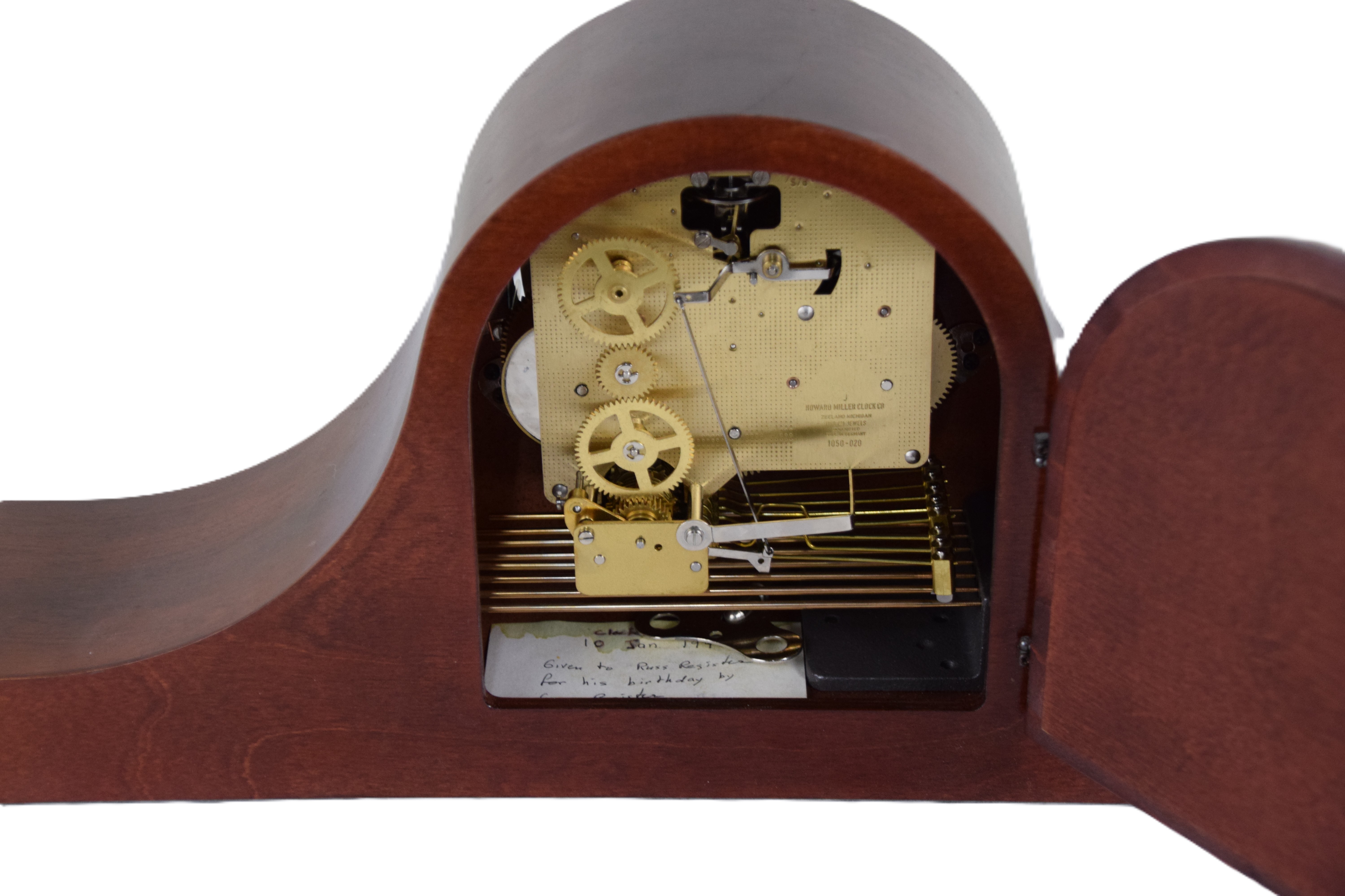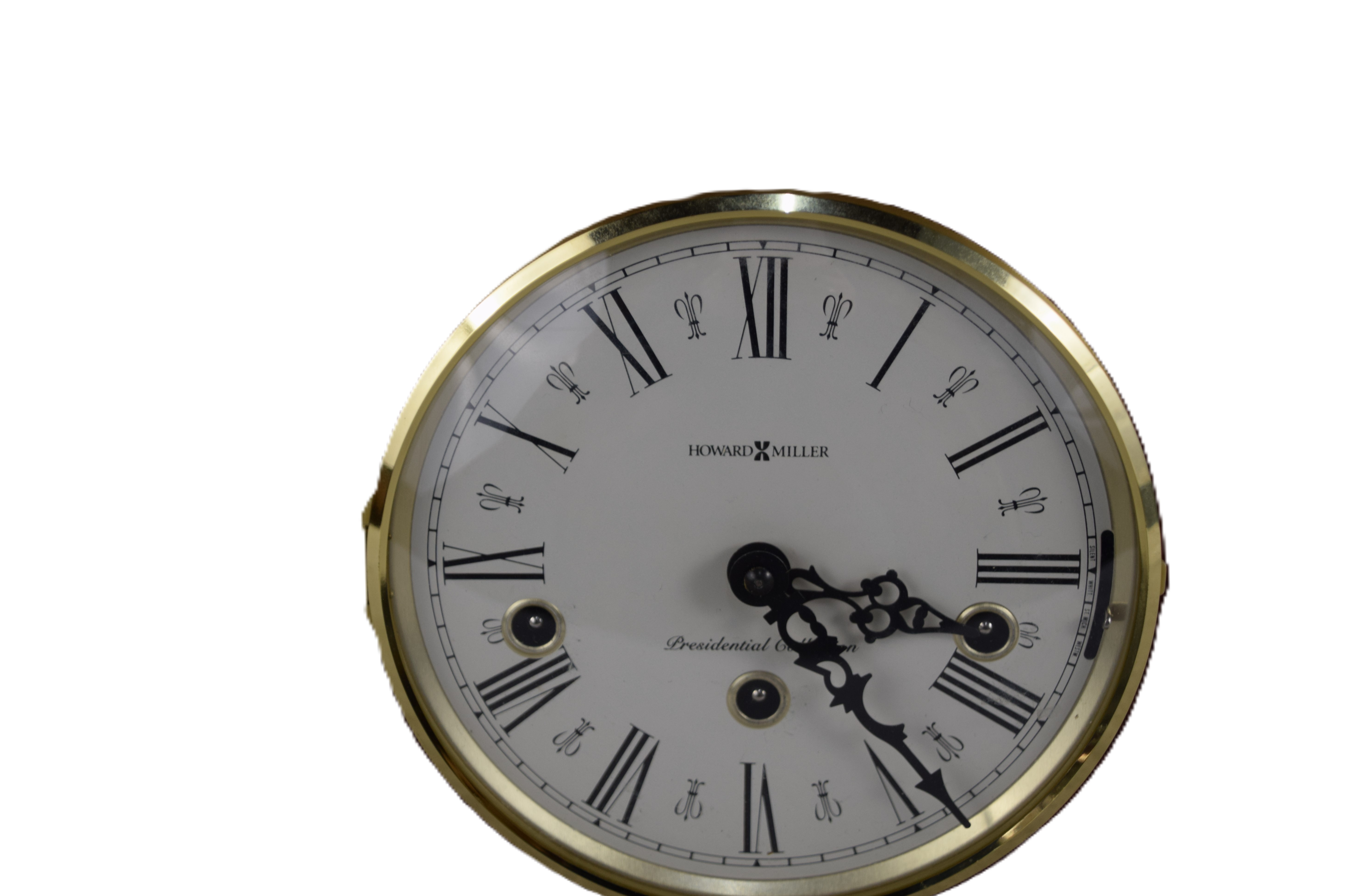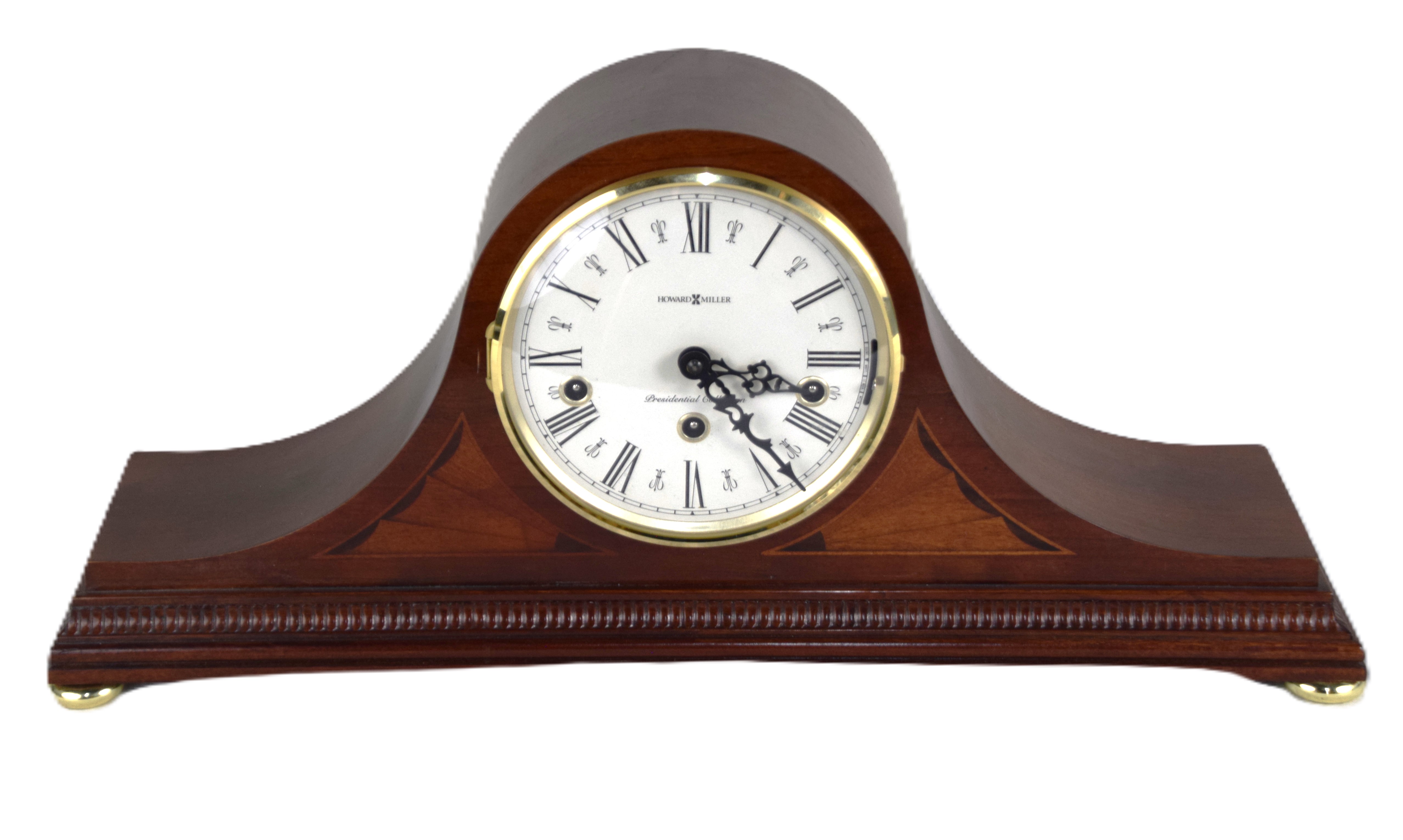 Beautiful inlaid Howard Miller hump back shelf clock, Presidential Collection with Roman numeral dial, chimes. Dimensions: 21″ L
