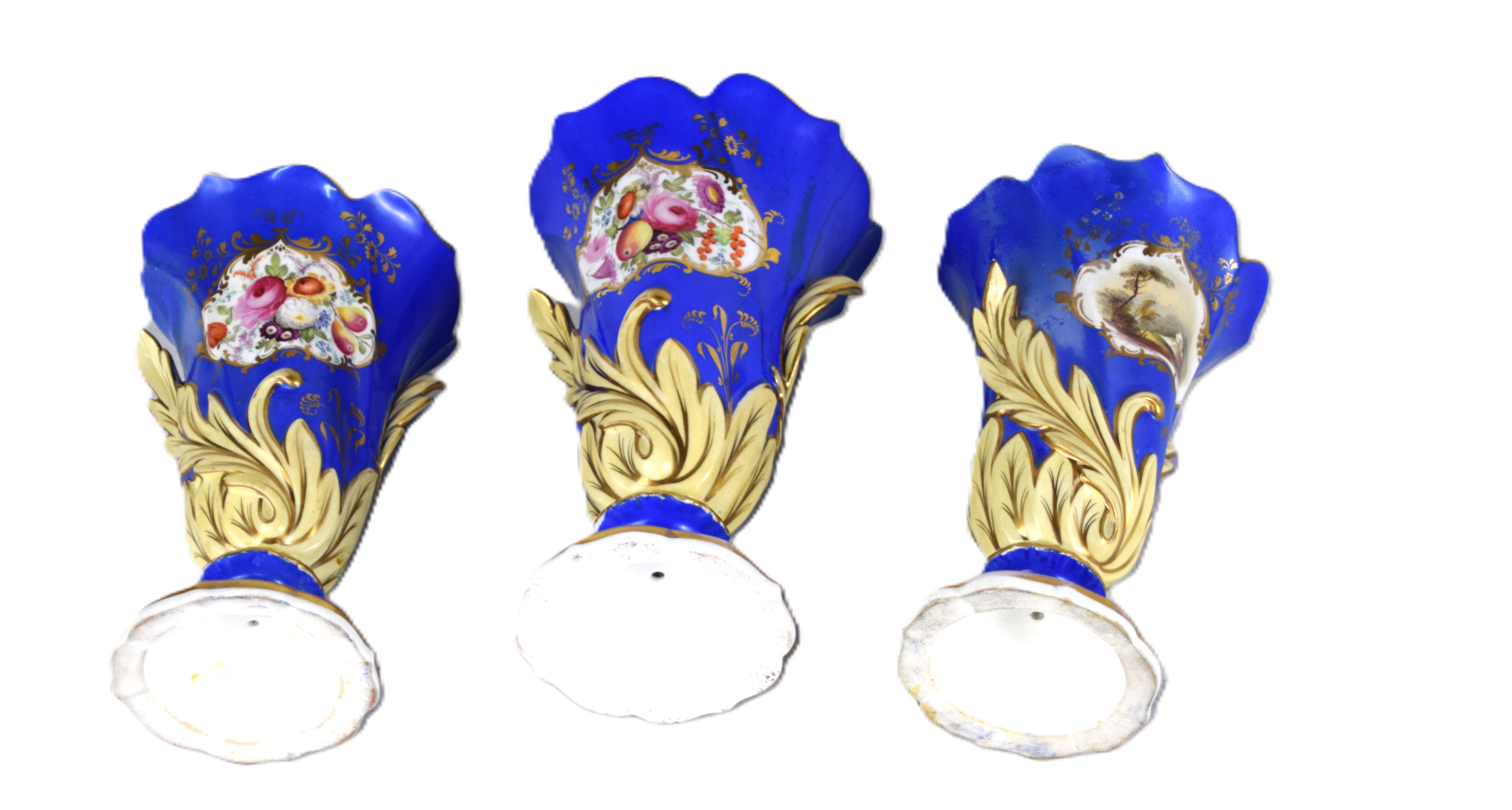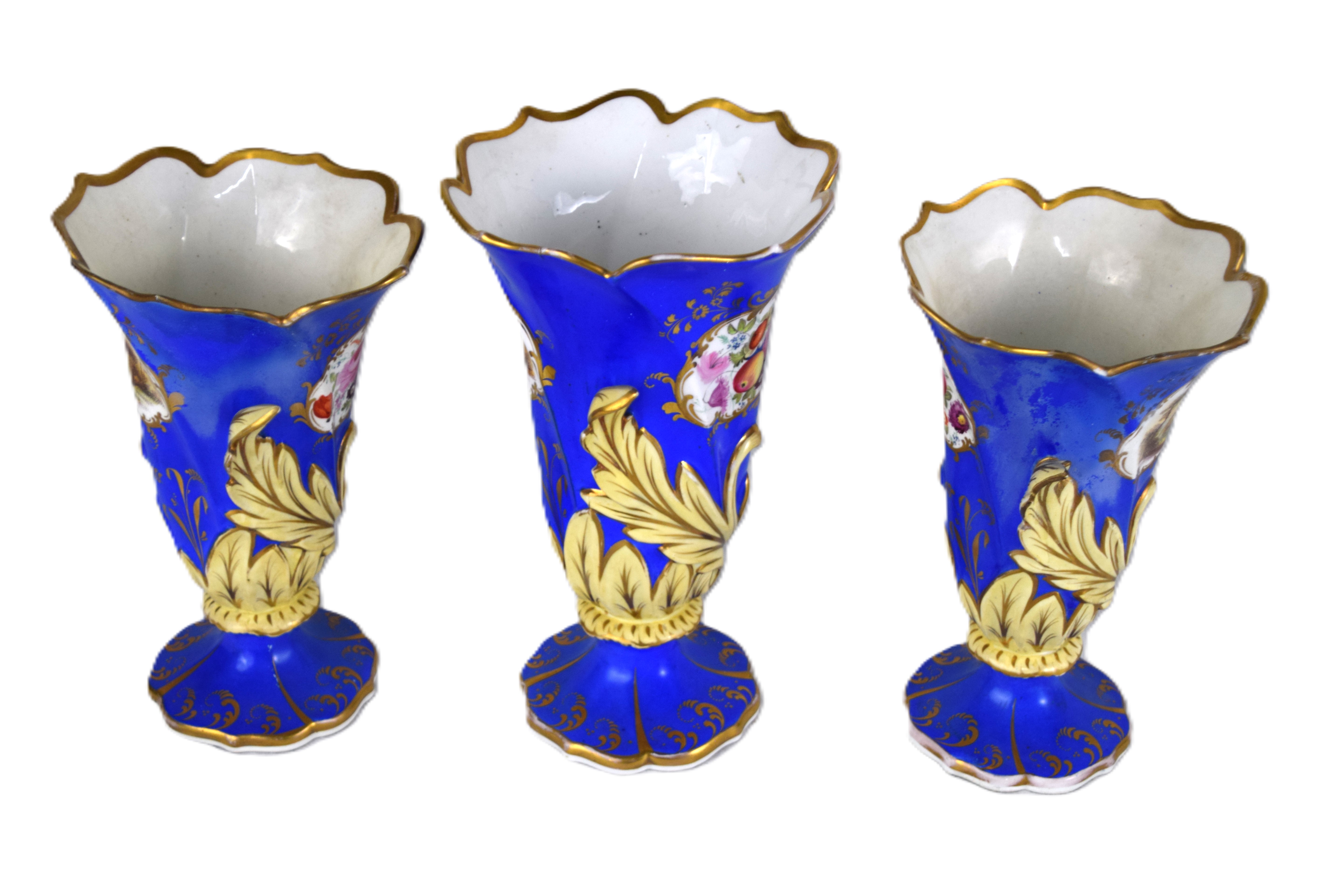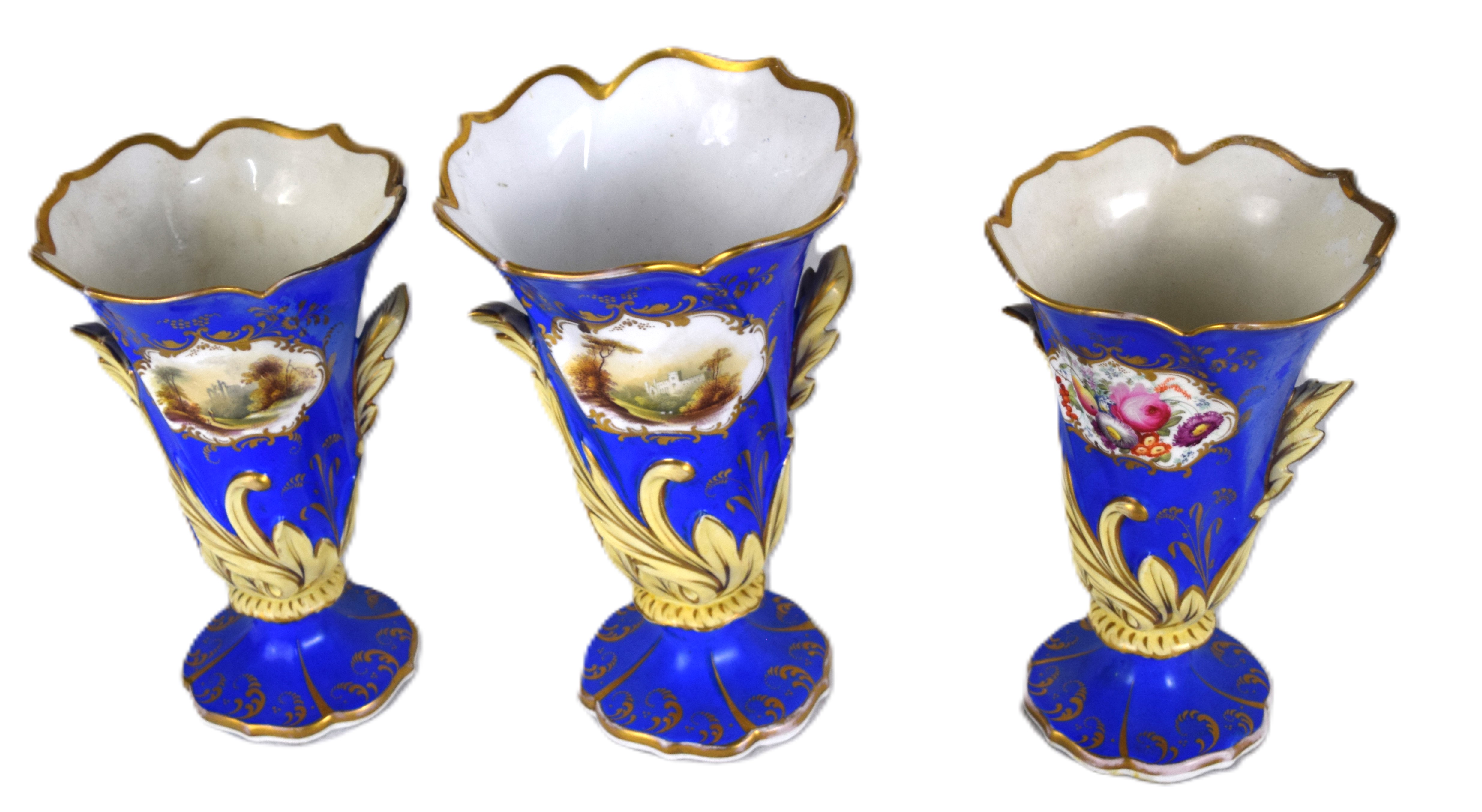 Three early old Paris vases with shaped tops, painted scenes with floral and leaf designs. Dimensions: 9″ H and 8″ H