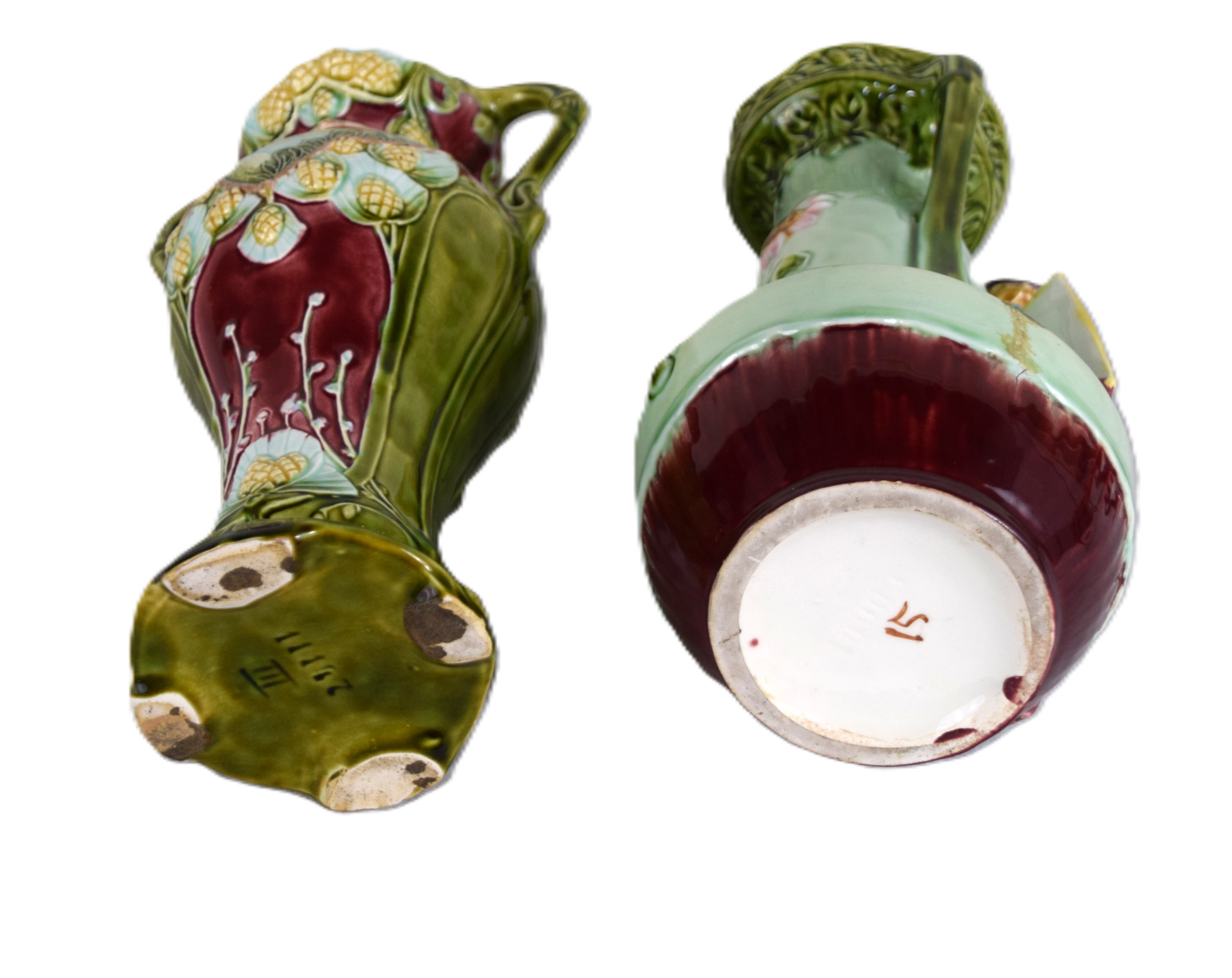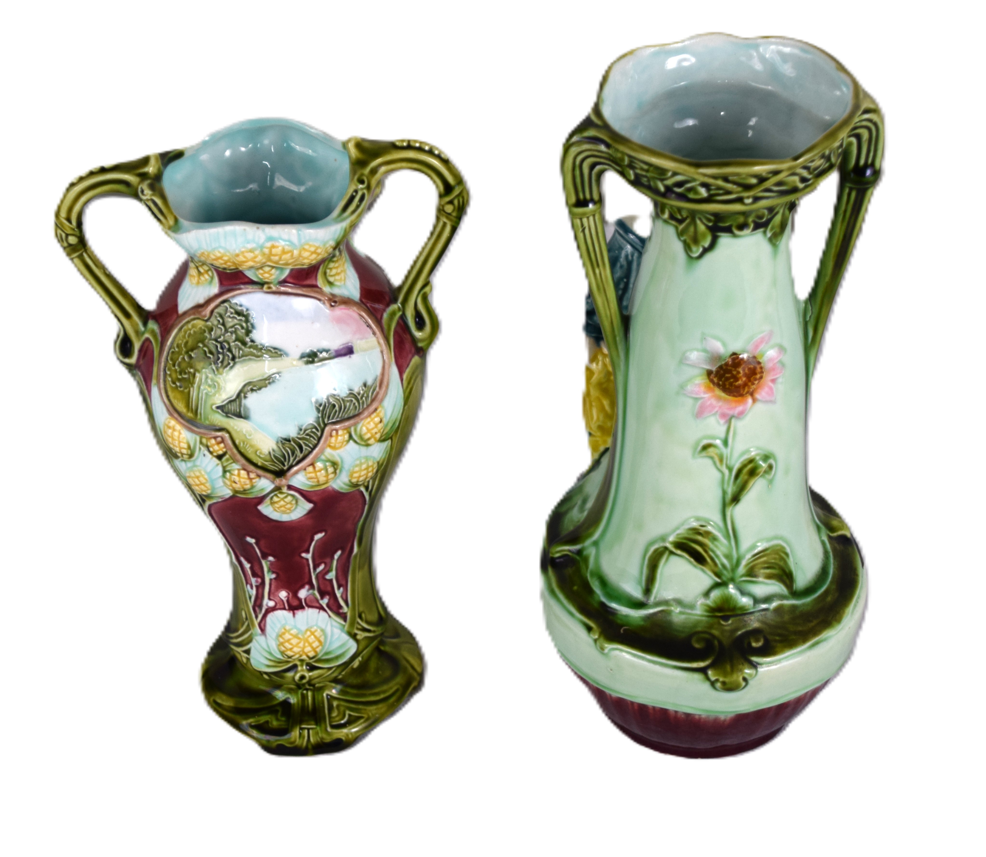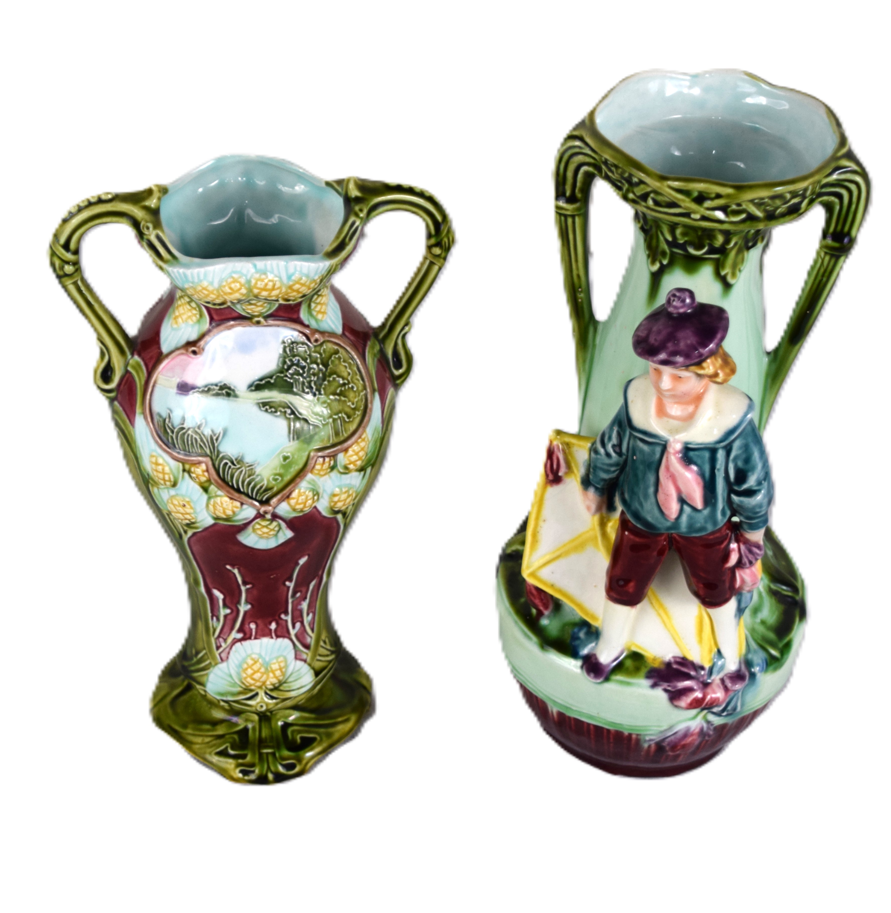 Two Majolica vase including one figure of a boy and the other an all-over design. Dimensions: 10″ and 11″
