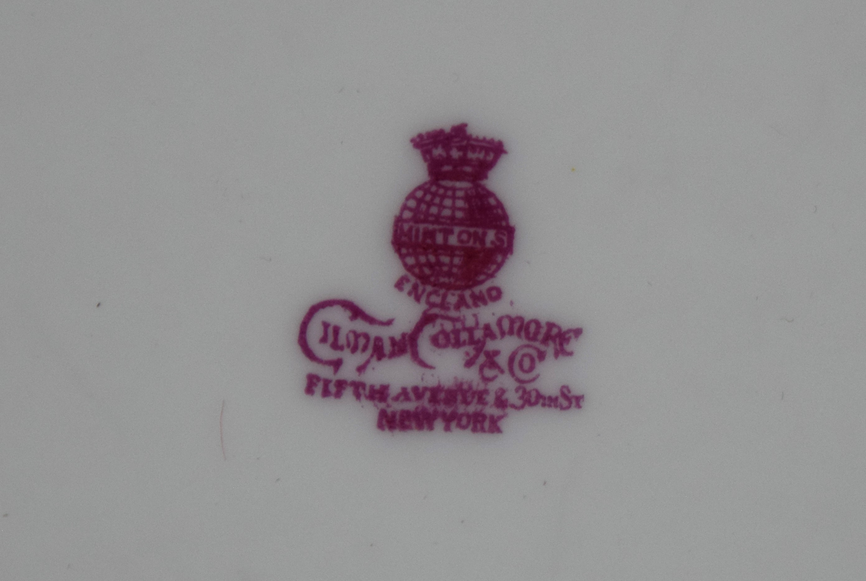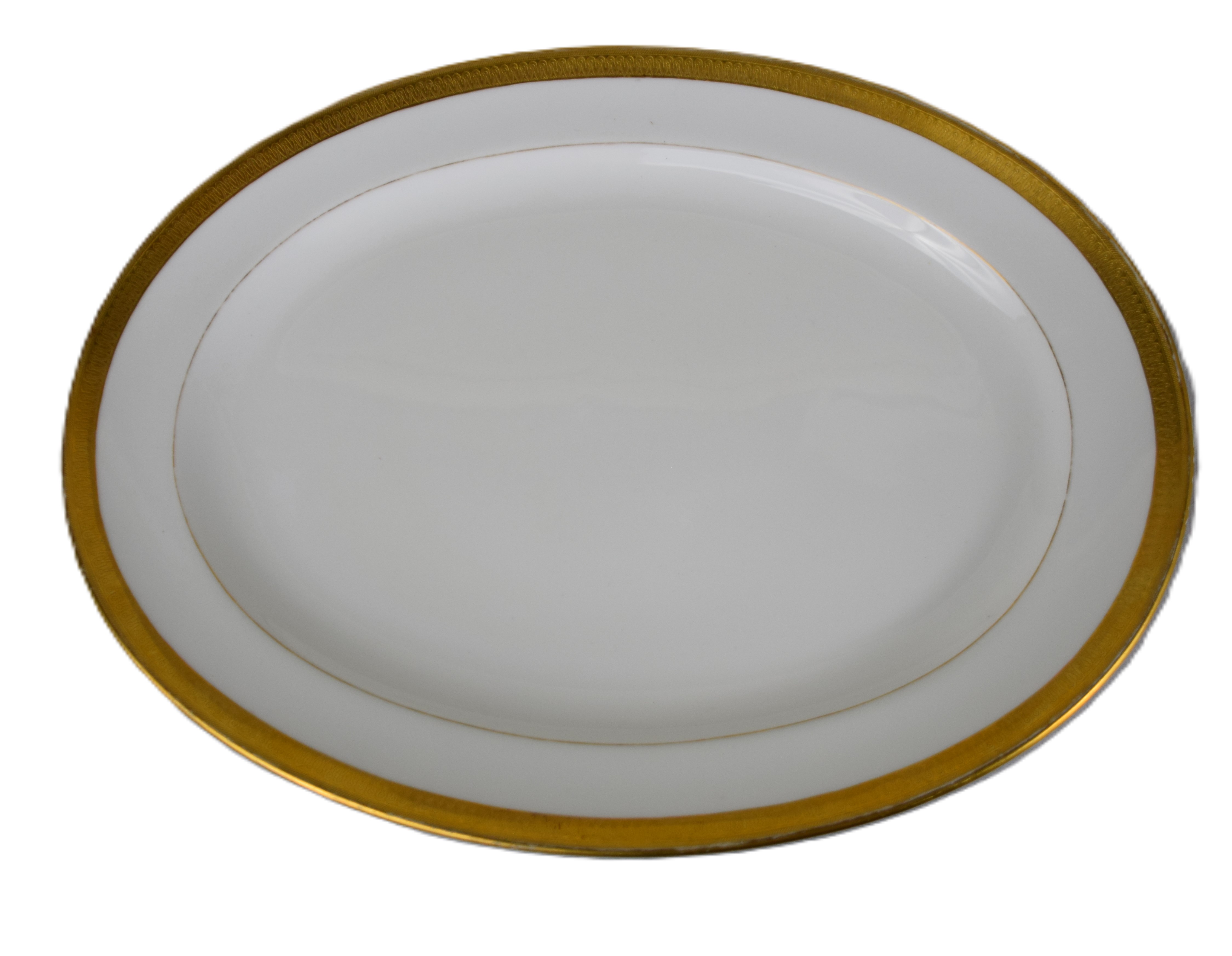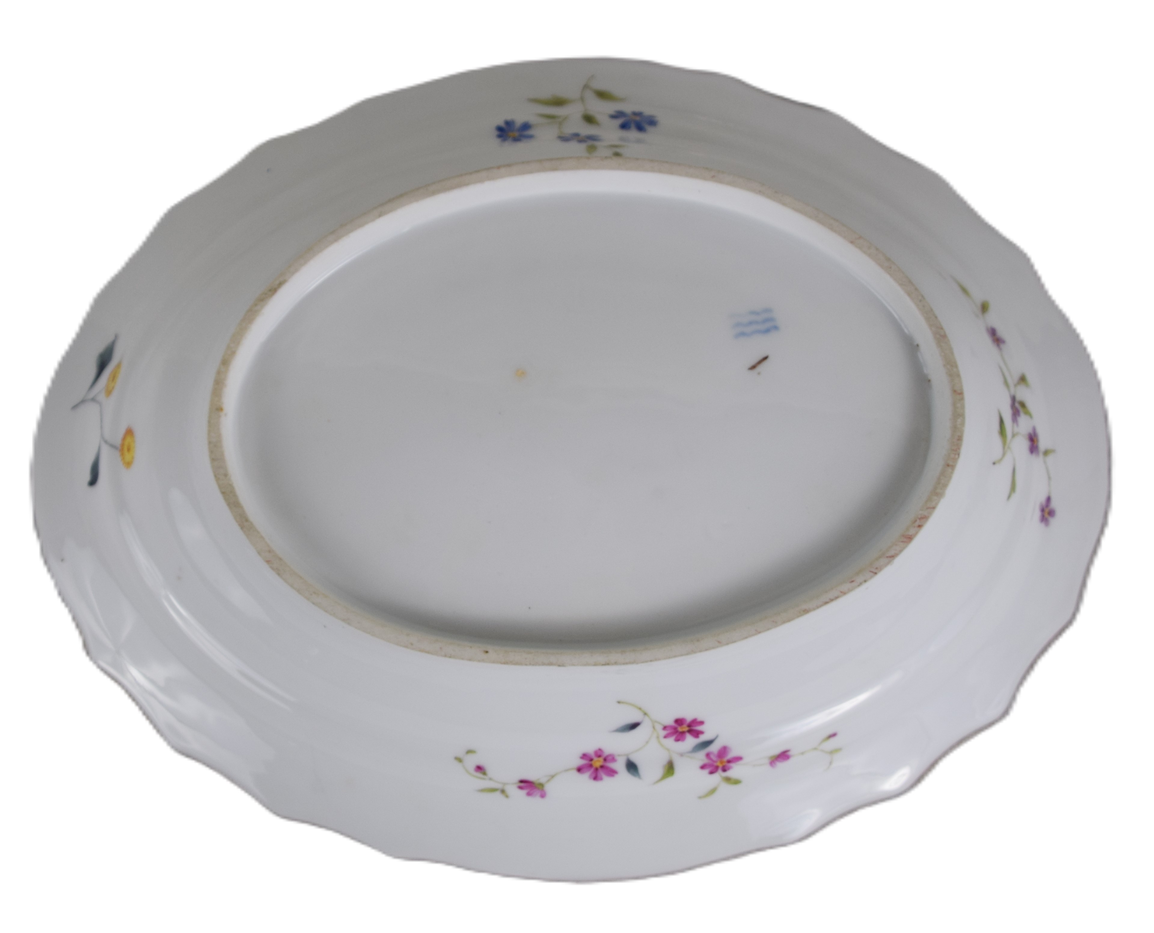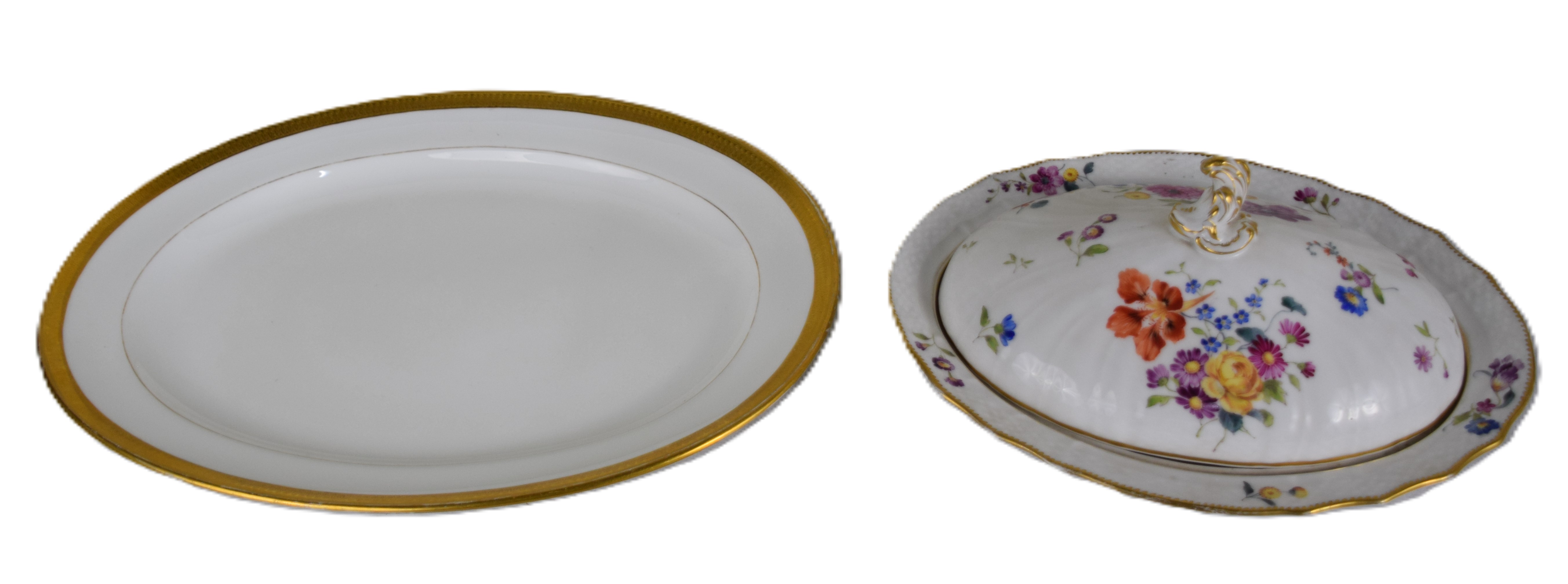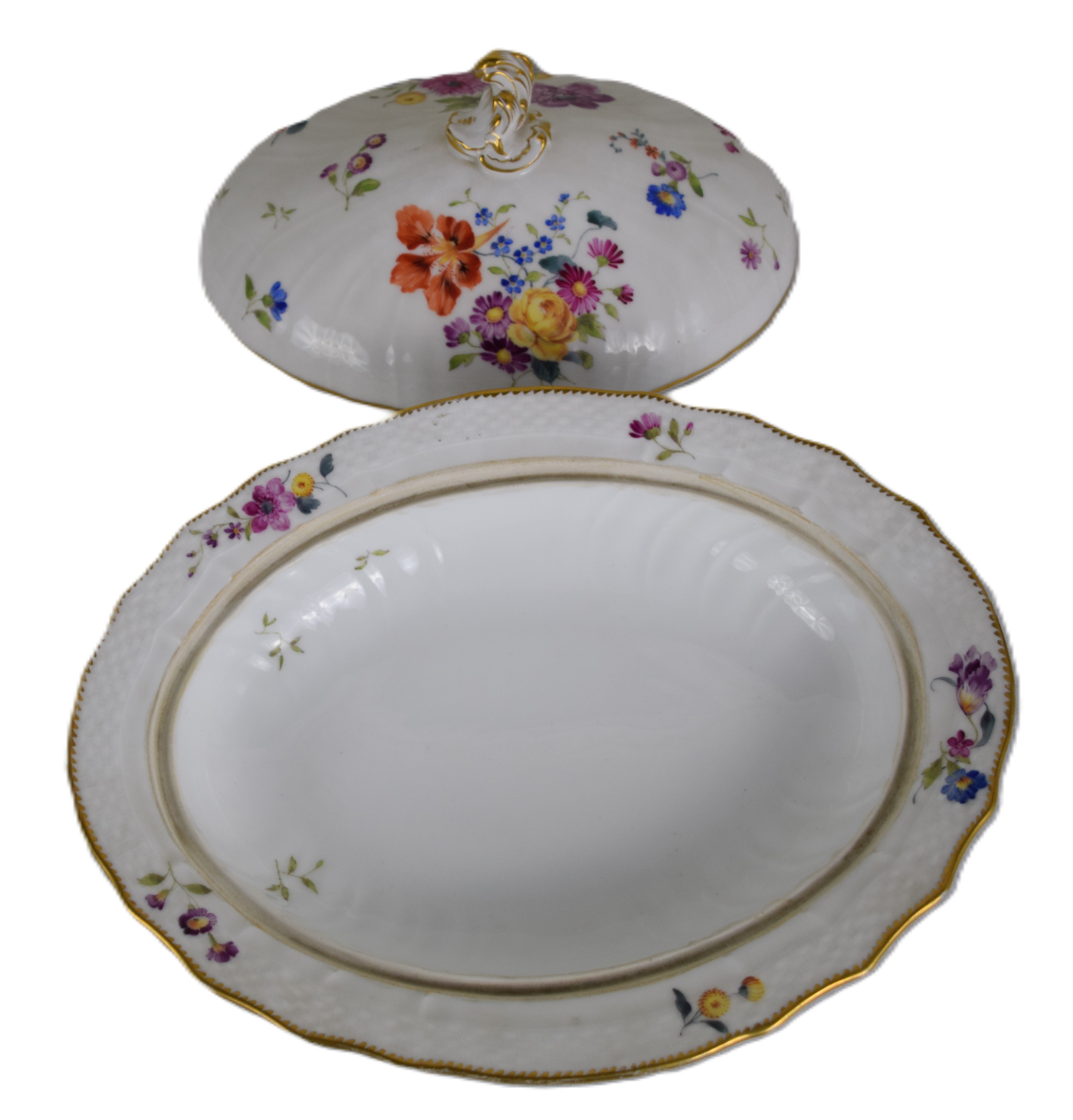 Royal Copenhagen covered tureen with floral designs, finial and a blue mark on base (13″ L x 7″ H) along with a shaped platter with gold rim edge (18″ L)