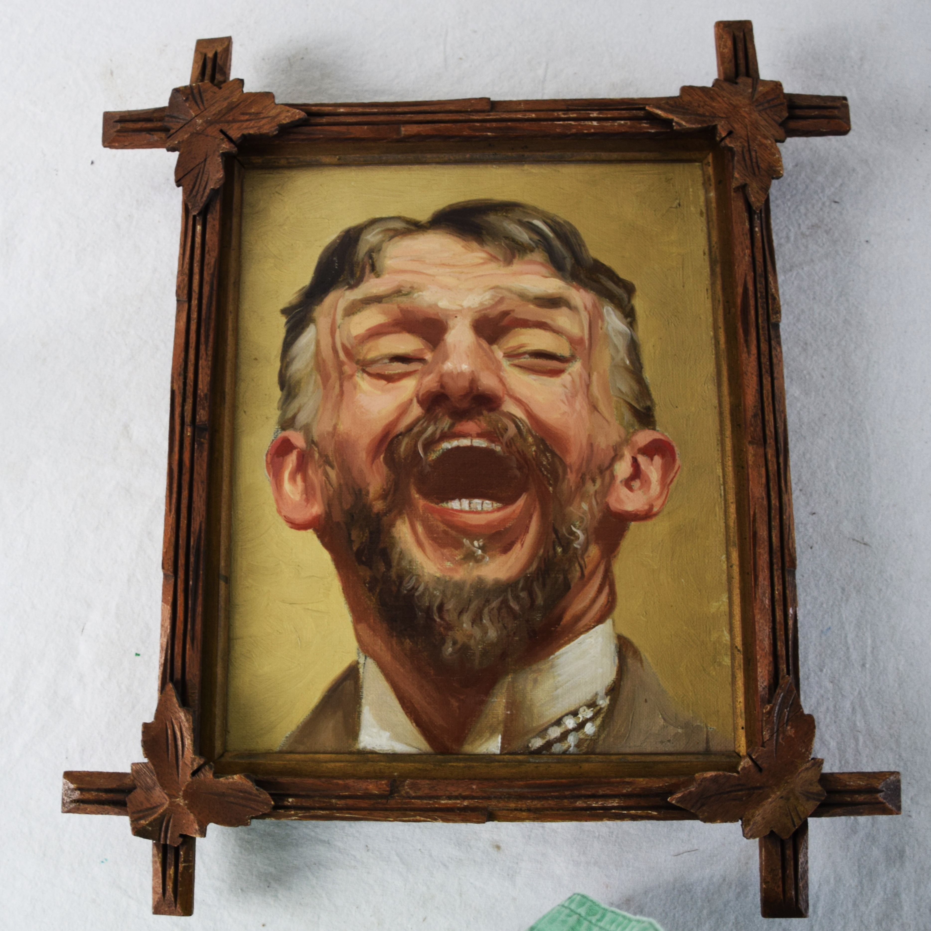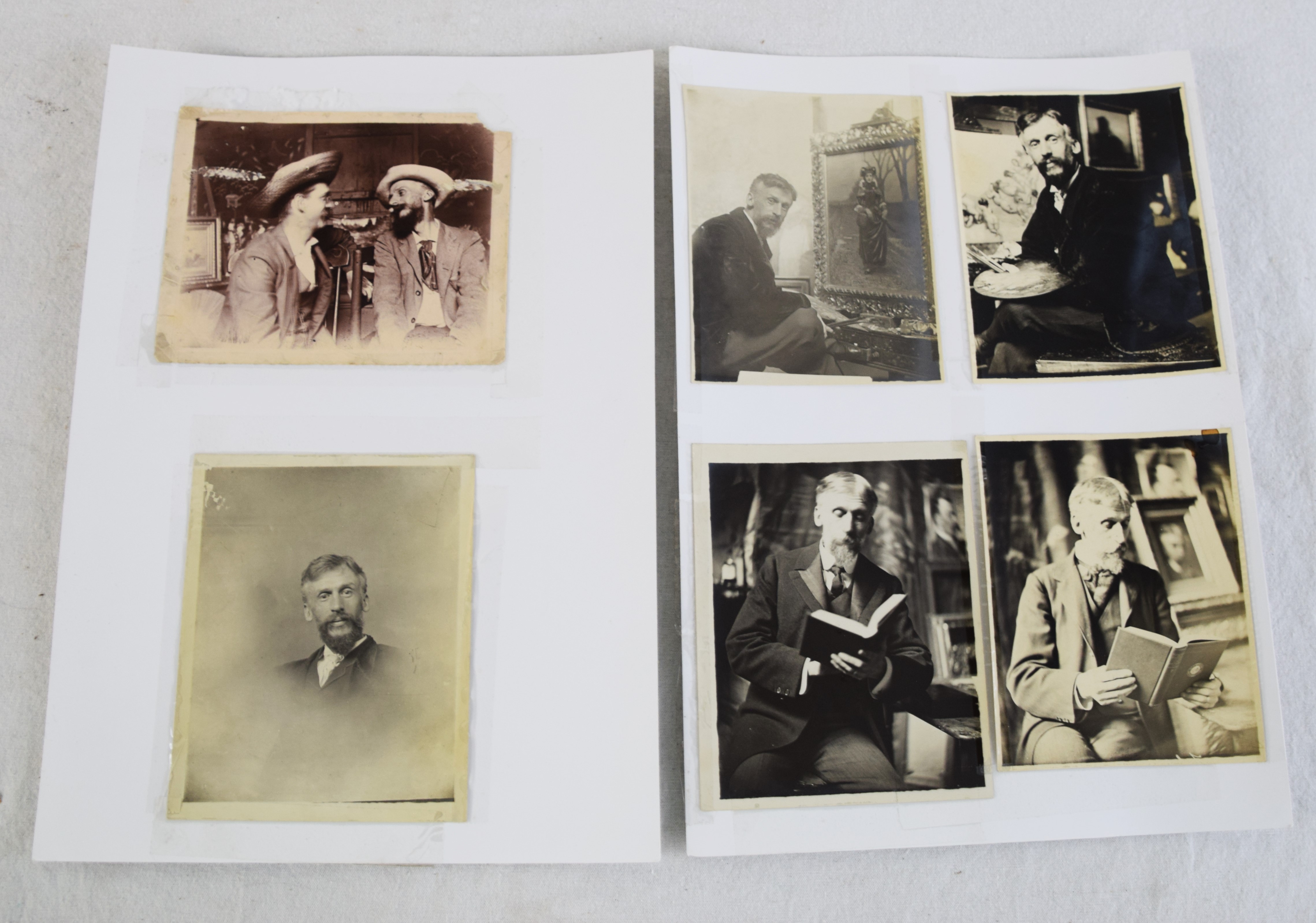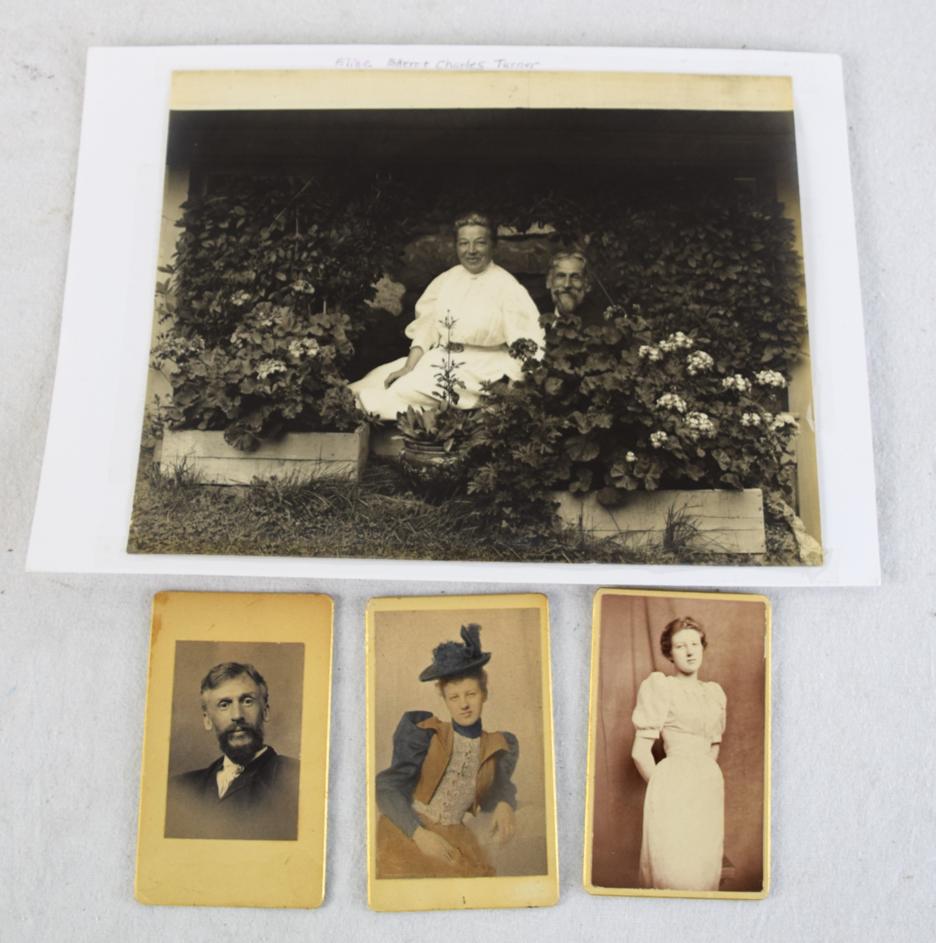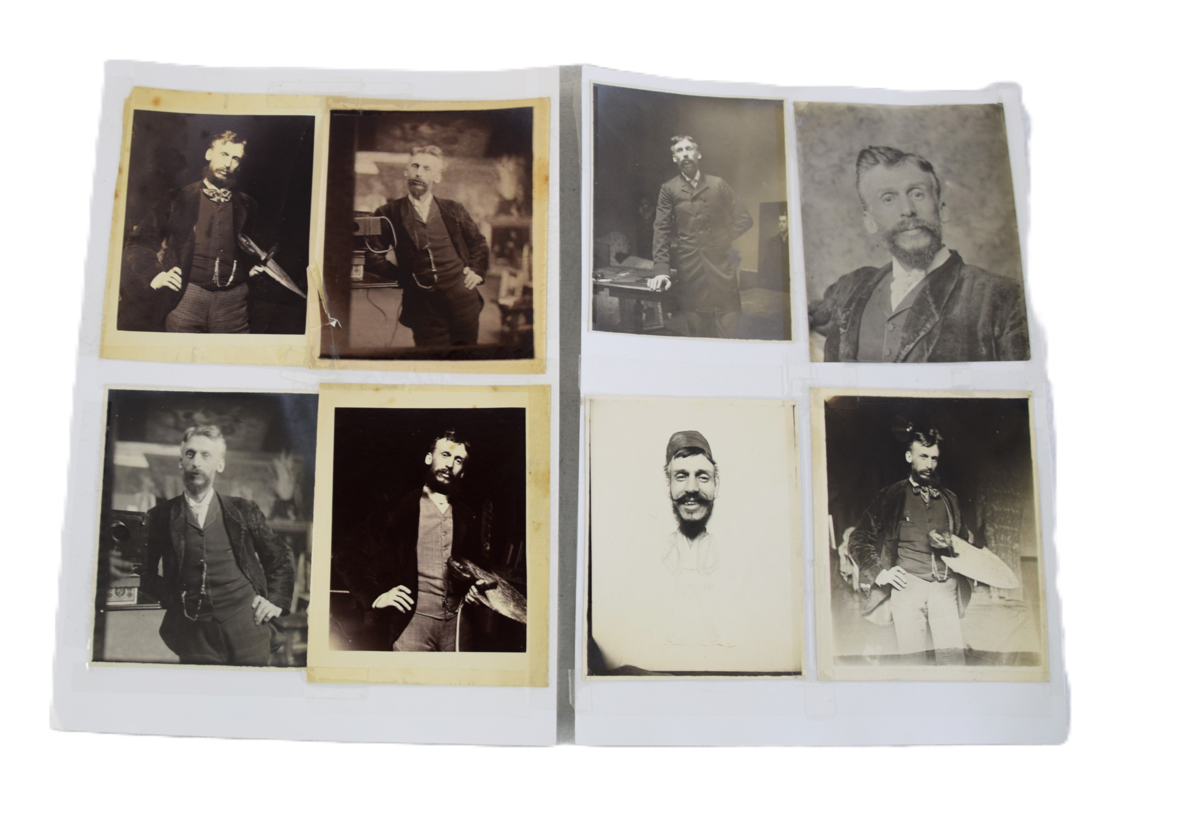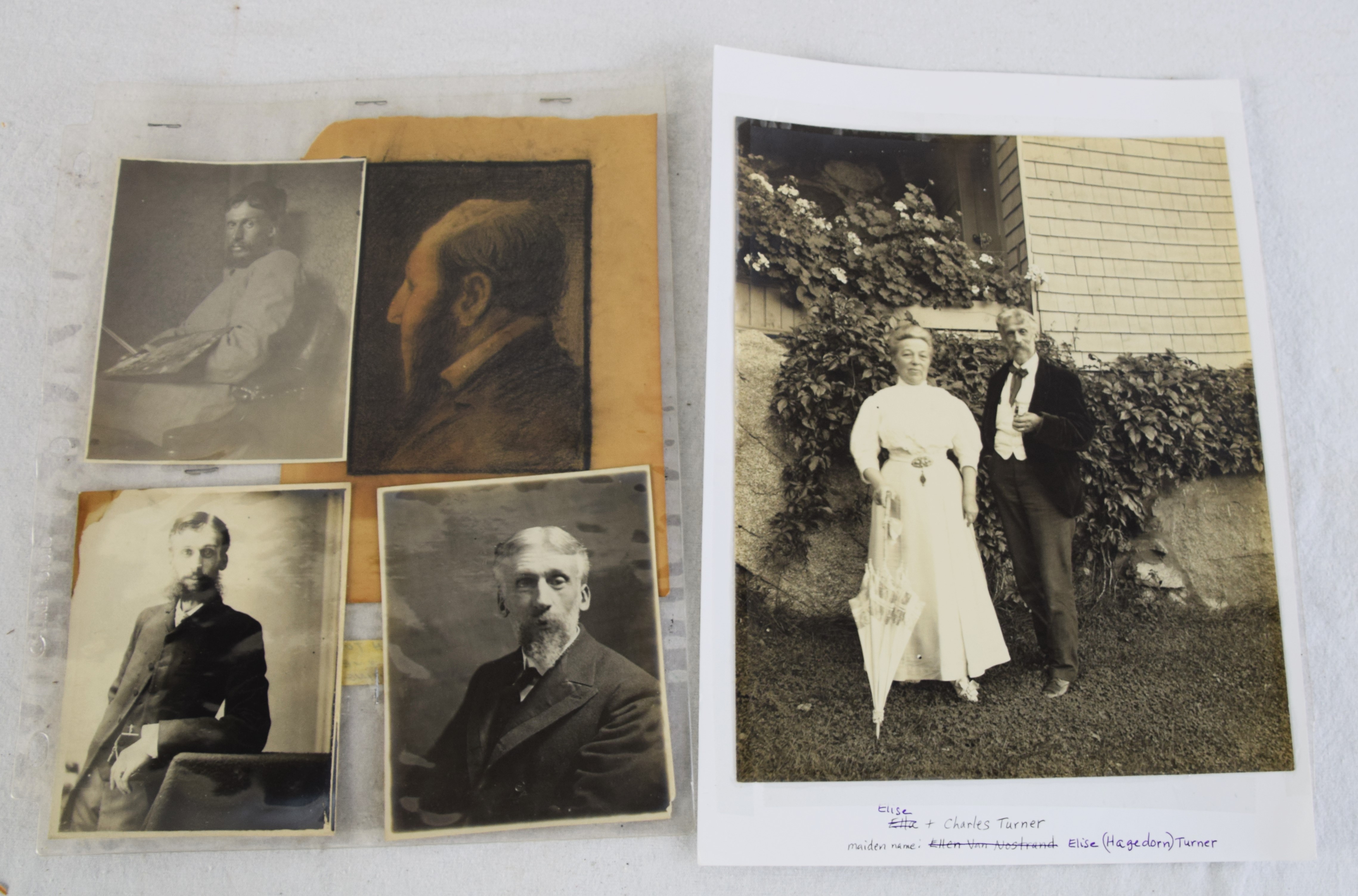 Two framed portraits of Civil War and Indian War Veteran, Charles Turner. One portrait is somewhat humorous with a fly on his chin with mouth wide-open. Charles became a well-known artist in Boston, studied in Europe, and painted landscapes, portraits (which these are two) illustrations, and genre scenes in oil and watercolors. He studied with Otto Grundman (1844-1890) at Boston Museum of Fine Arts School. Turner was a member of the Unity Art Club and the Boston Art Club where he became president. Accompanied with the portrait are several photos of him as an artist and photographer. Dimensions: 10″ x 8″