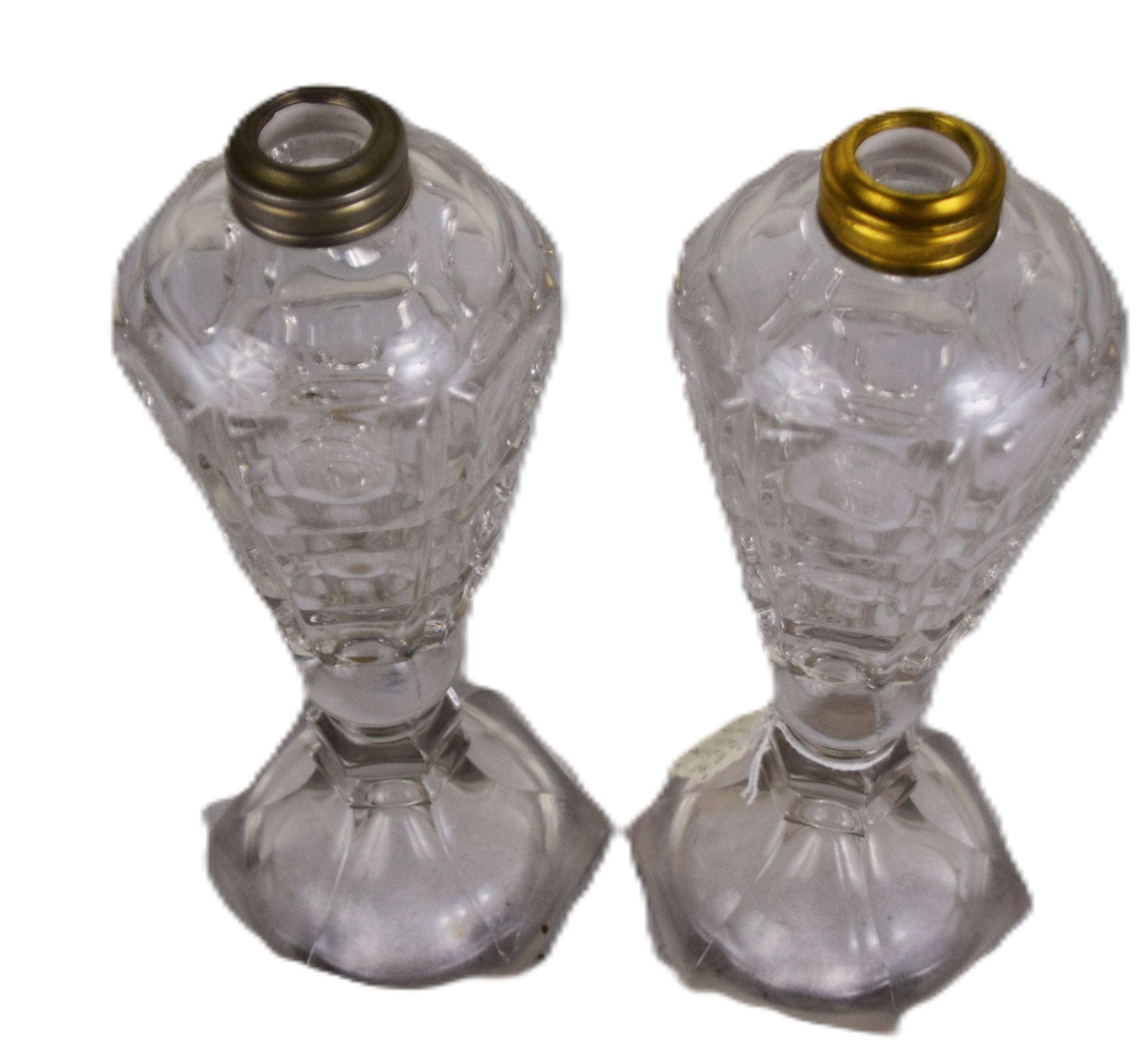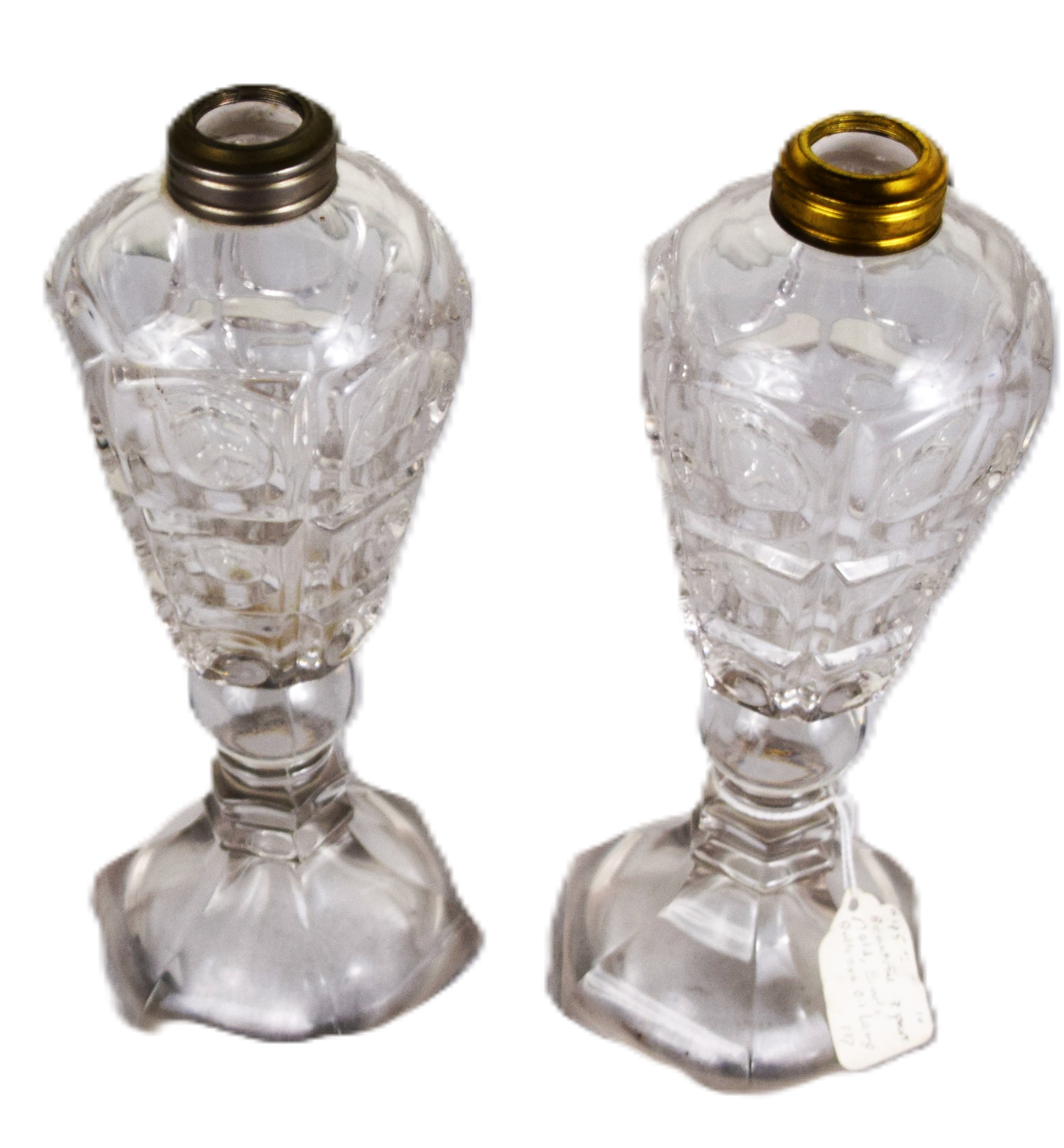 Pair of Whale oil lamps in a bulls-eye pattern, brass tops on shaped bases. Dimensions: 10″ H