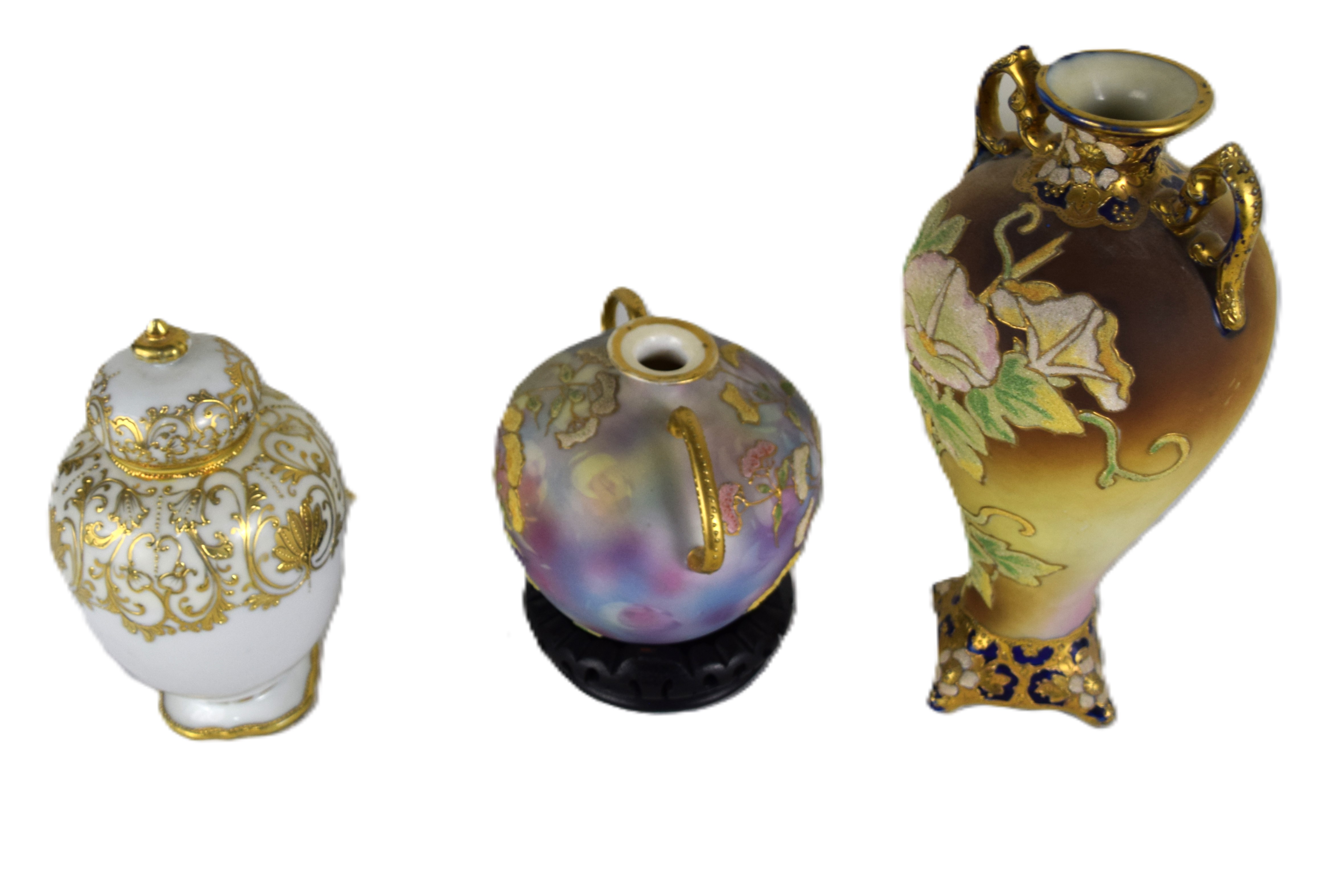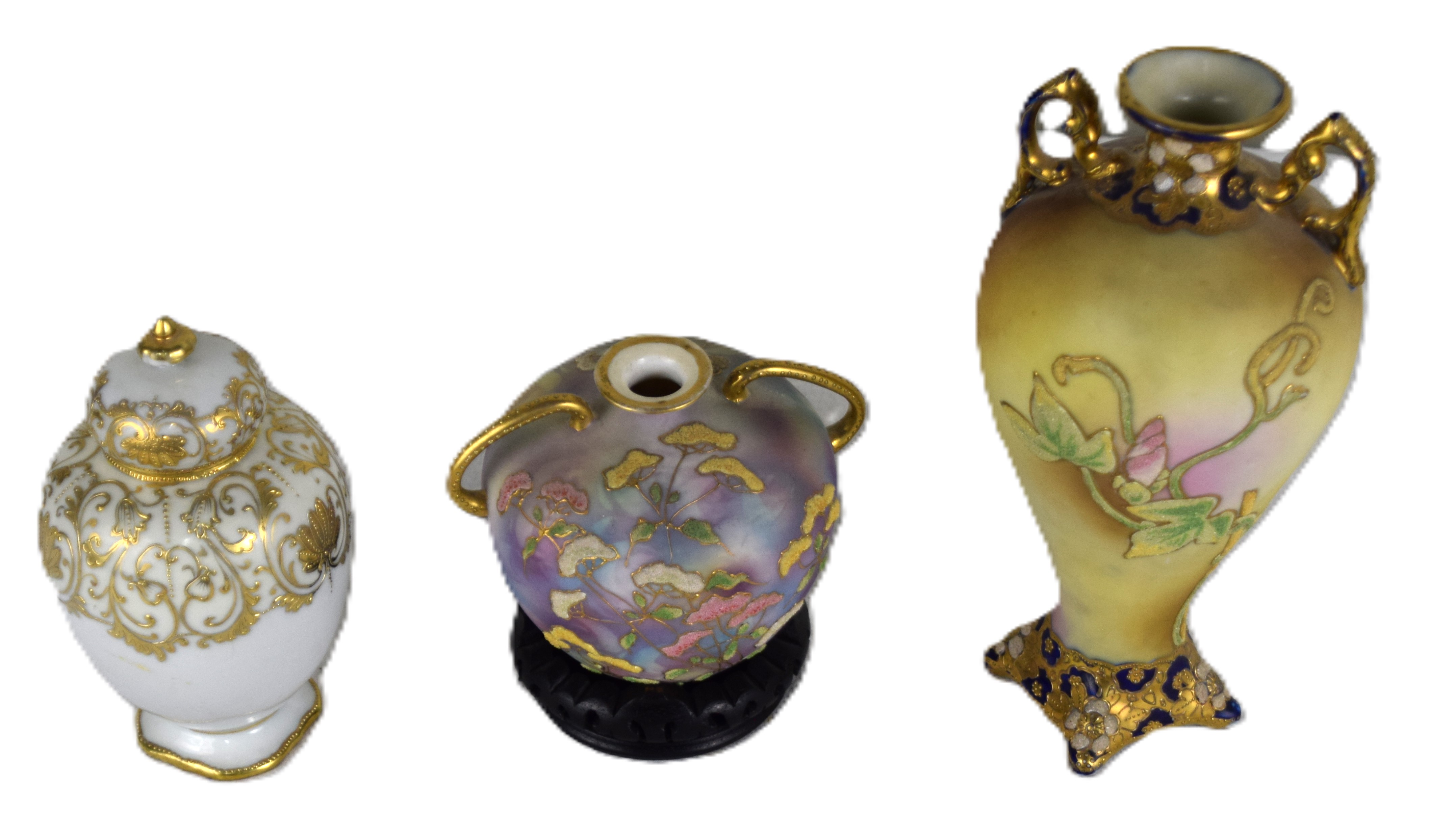 Three hand painted Nippon vases-gold and other decorations all marked on the bases, one with teakwood stand. Dimensions: 6″, 7″ and 10″ H