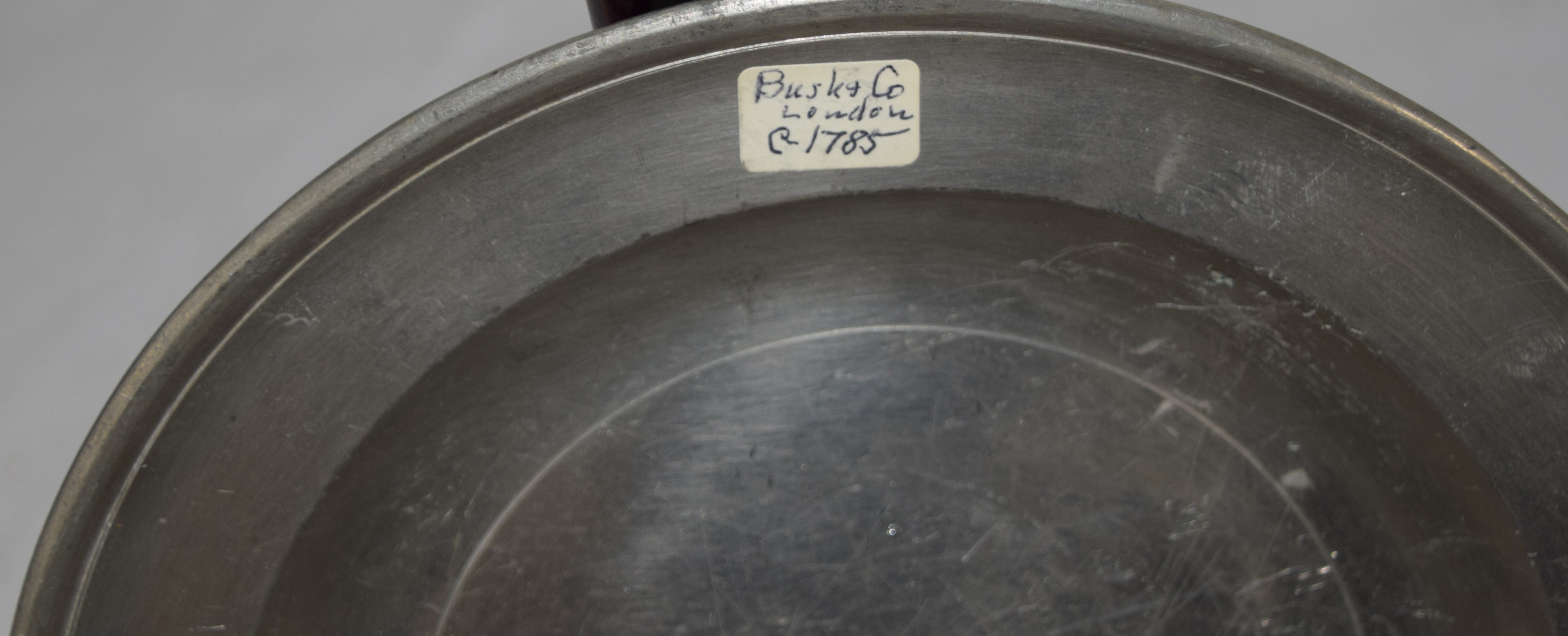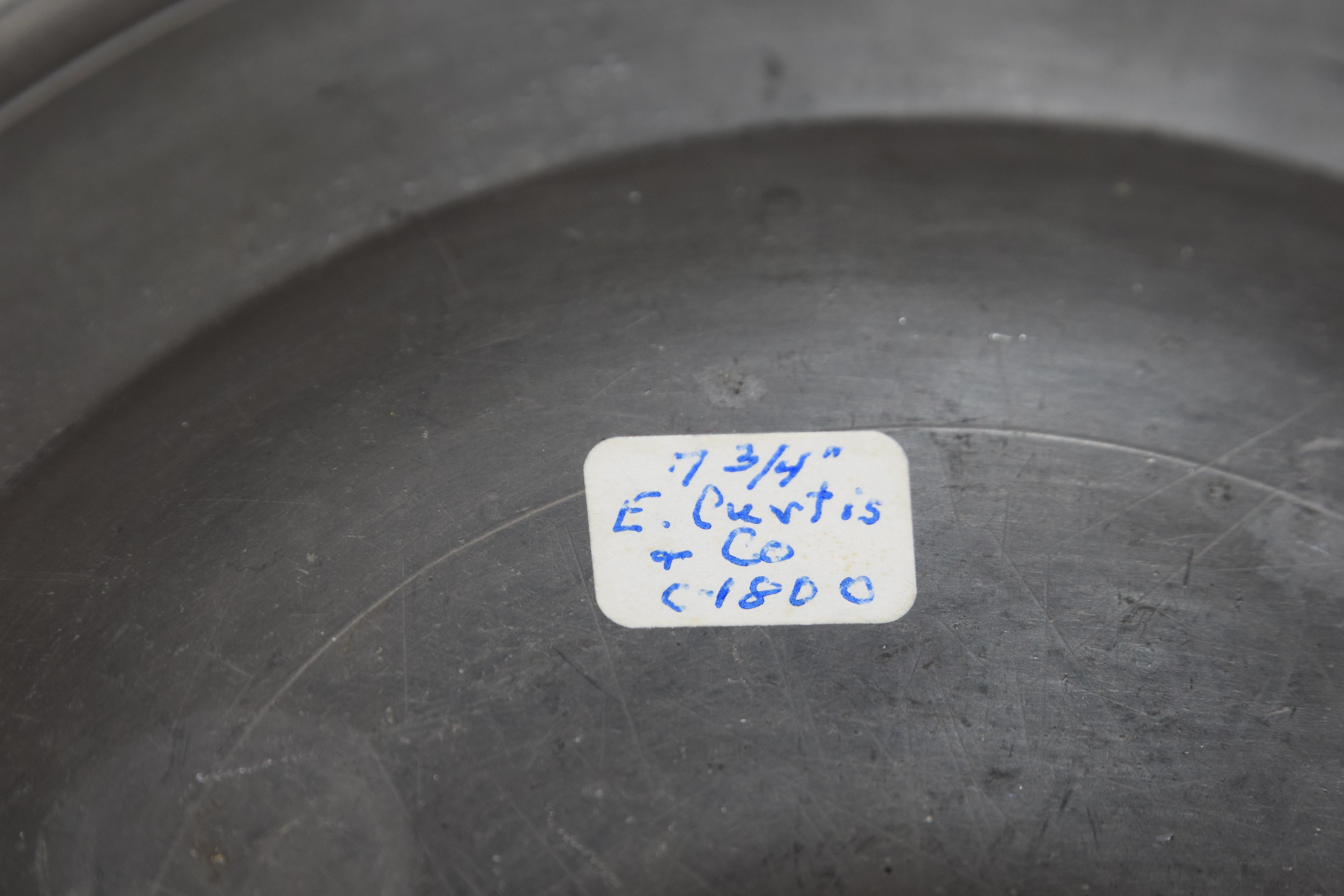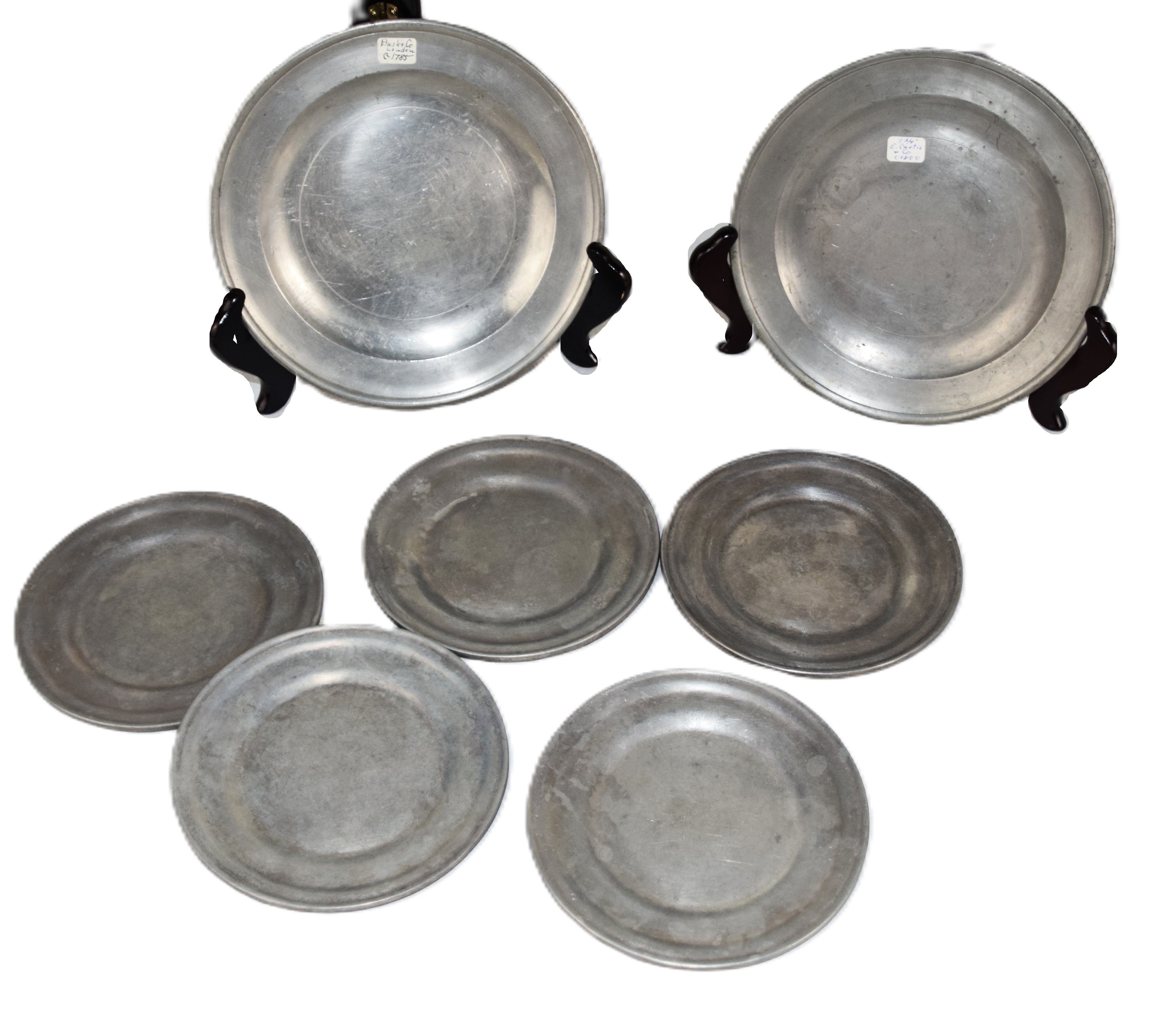 Seven piece pewter lot to include pewter plate, Bush & Co., 1785 (8″ Dia) and E. Curtice 1800 (8″ Dia) and five pewter plates (6″ Dia)