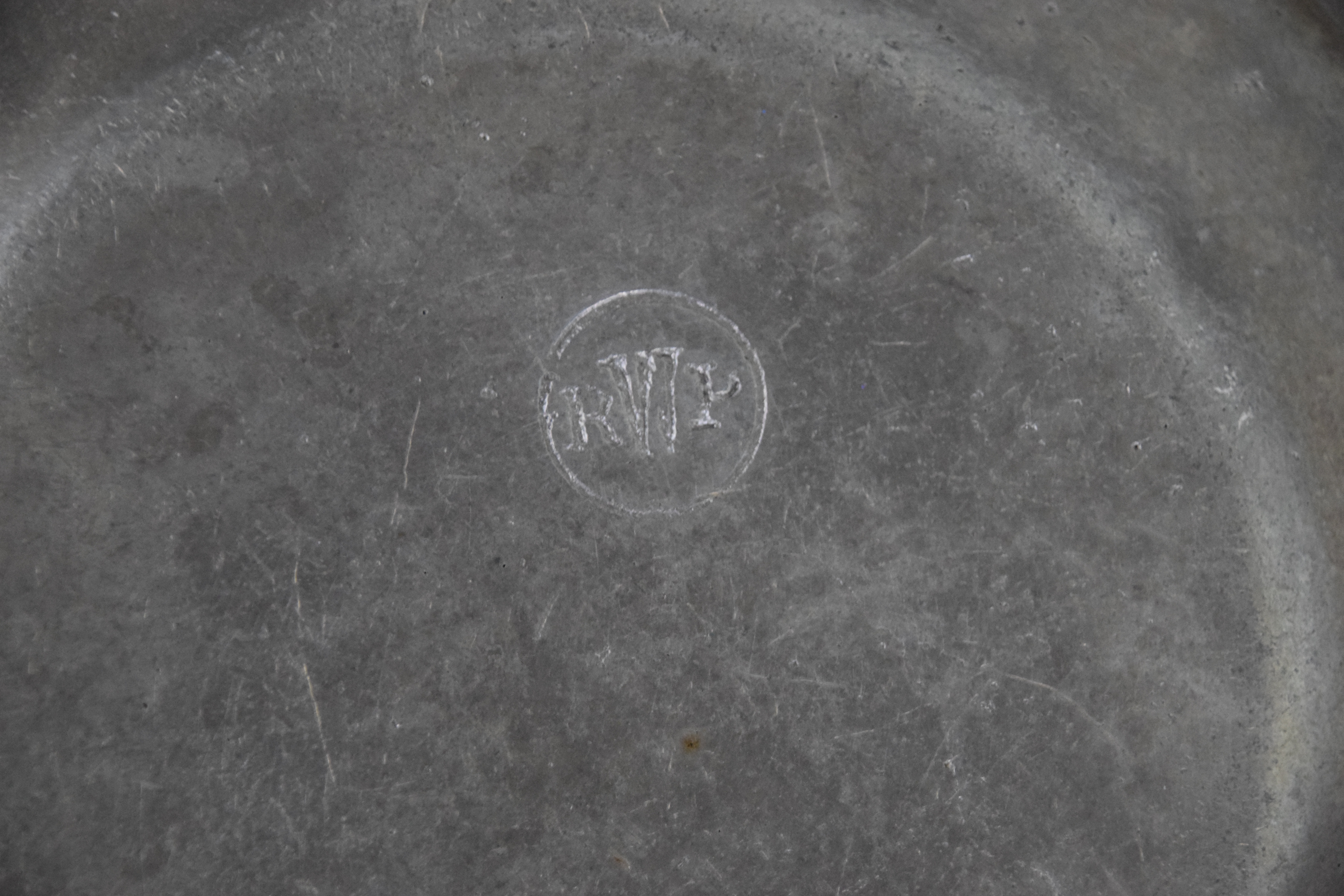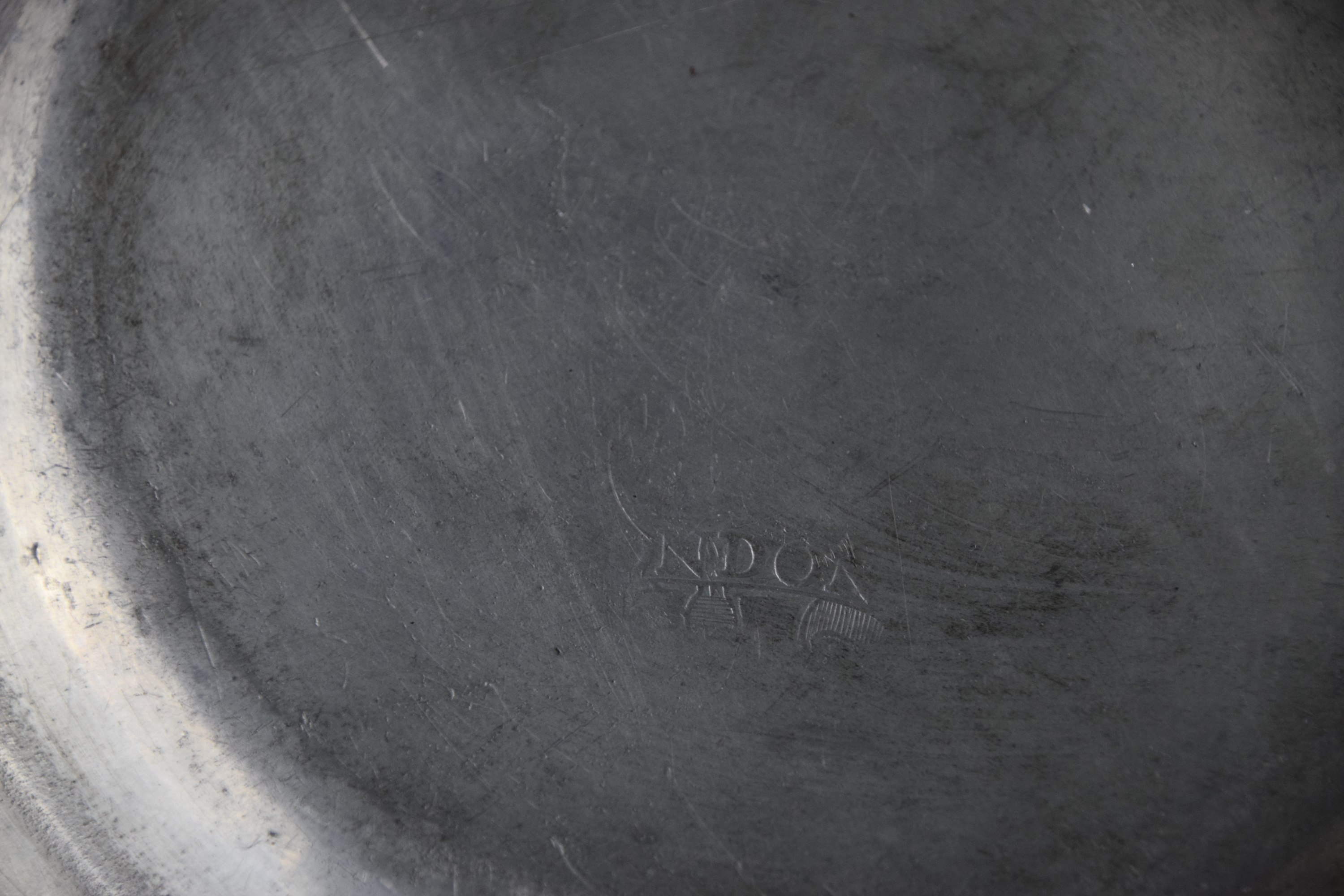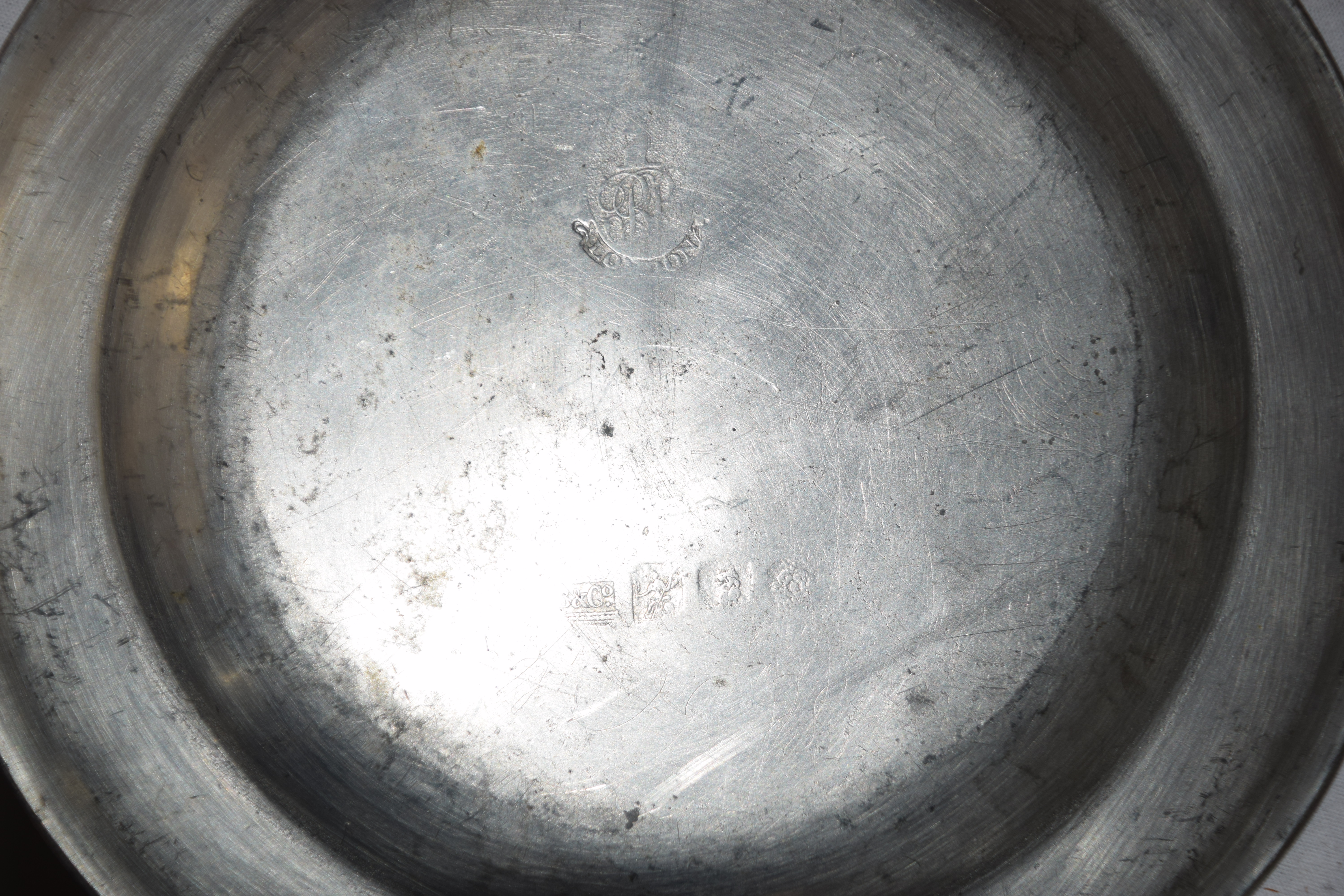 Seven piece pewter lot to include pewter plate, Bush & Co., 1785 (8″ Dia) and E. Curtice 1800 (8″ Dia) and five pewter plates (6″ Dia)