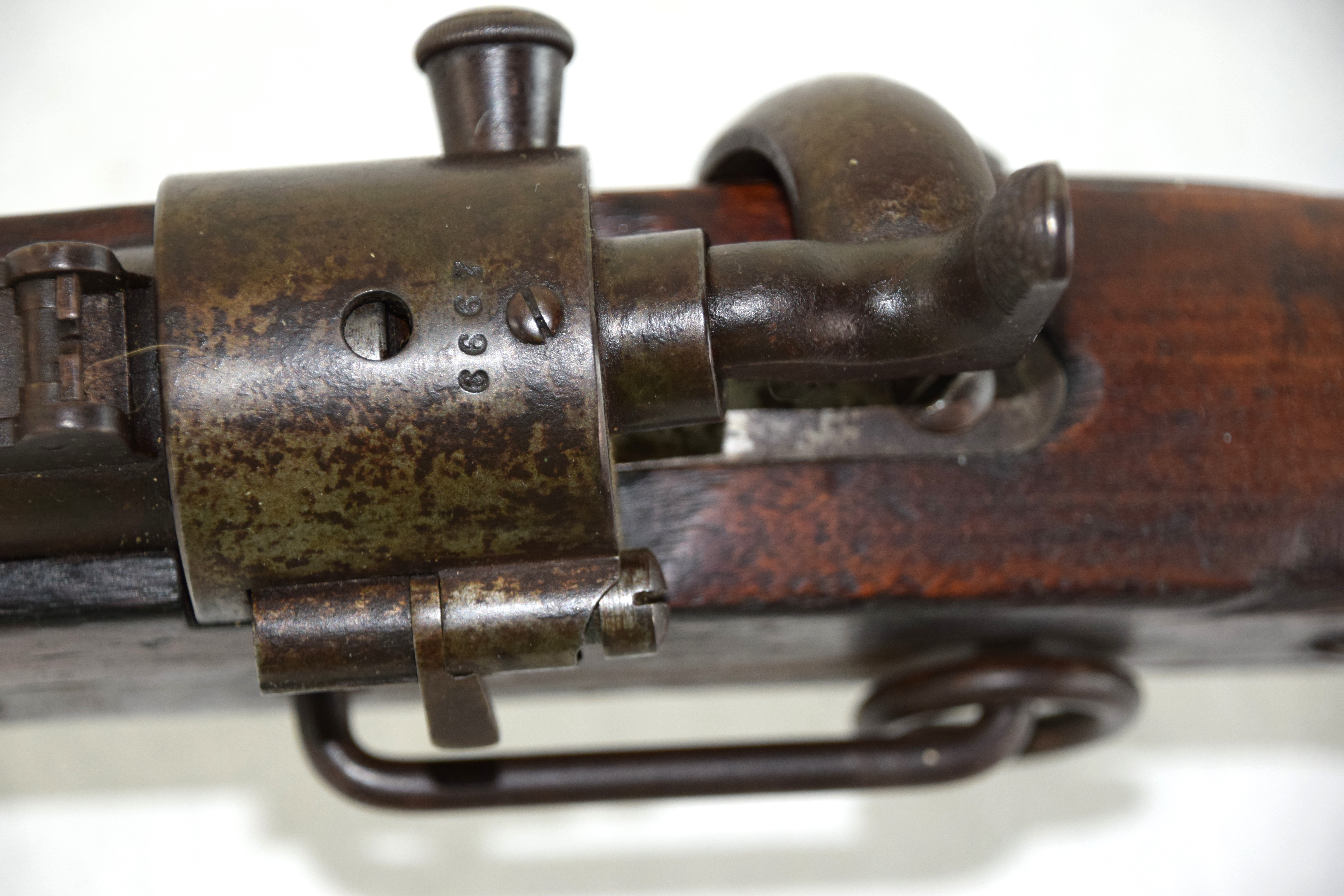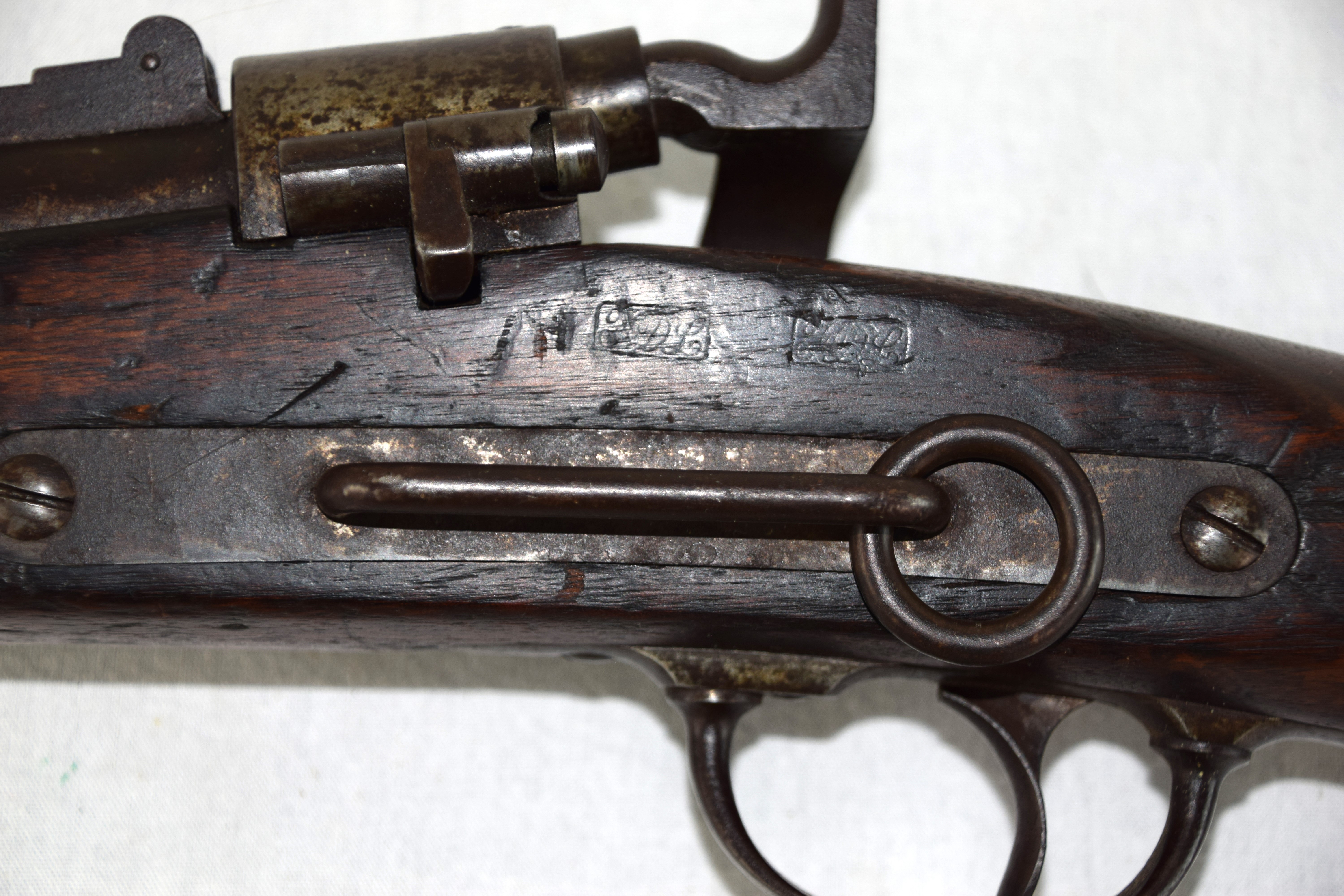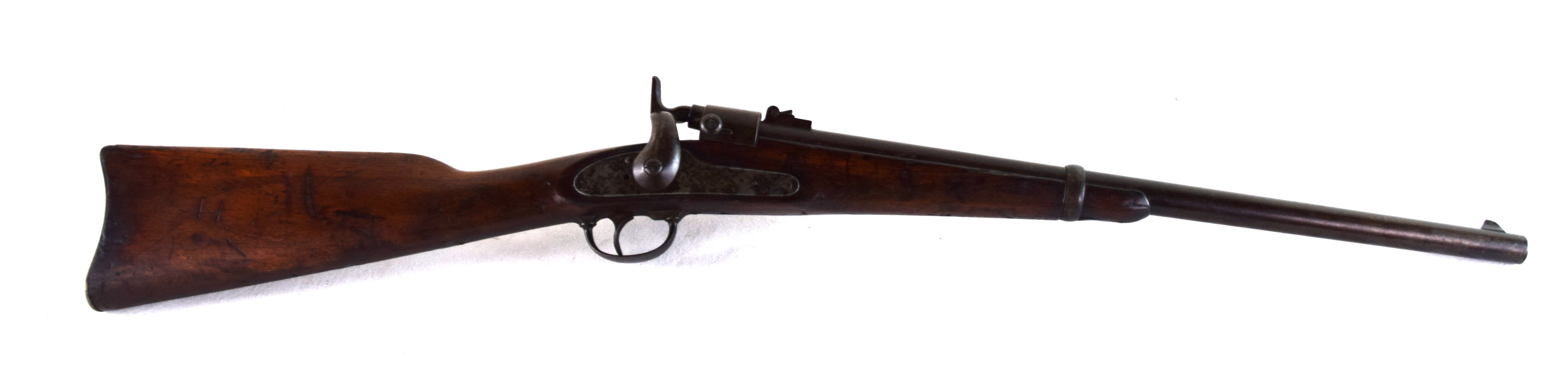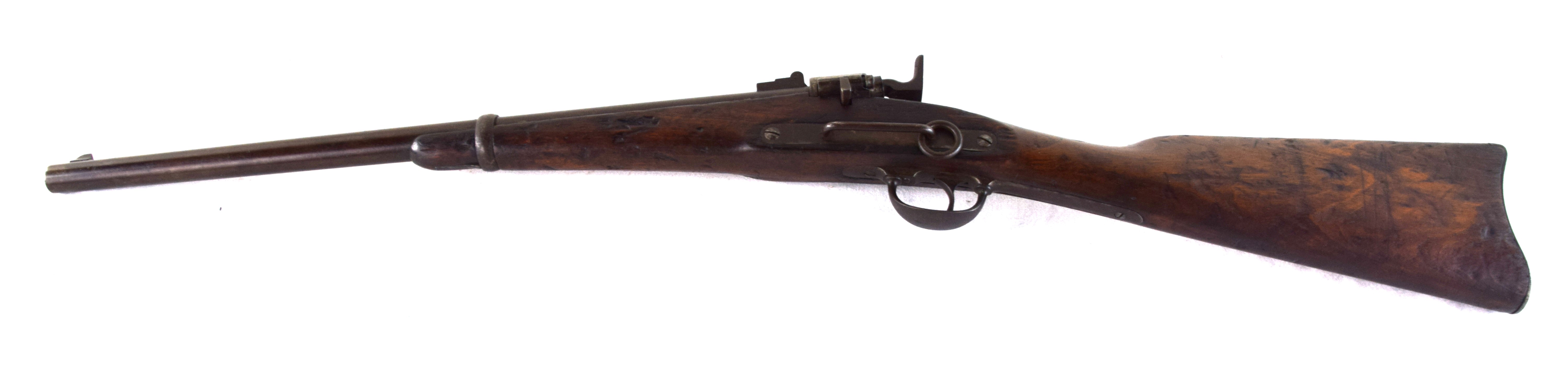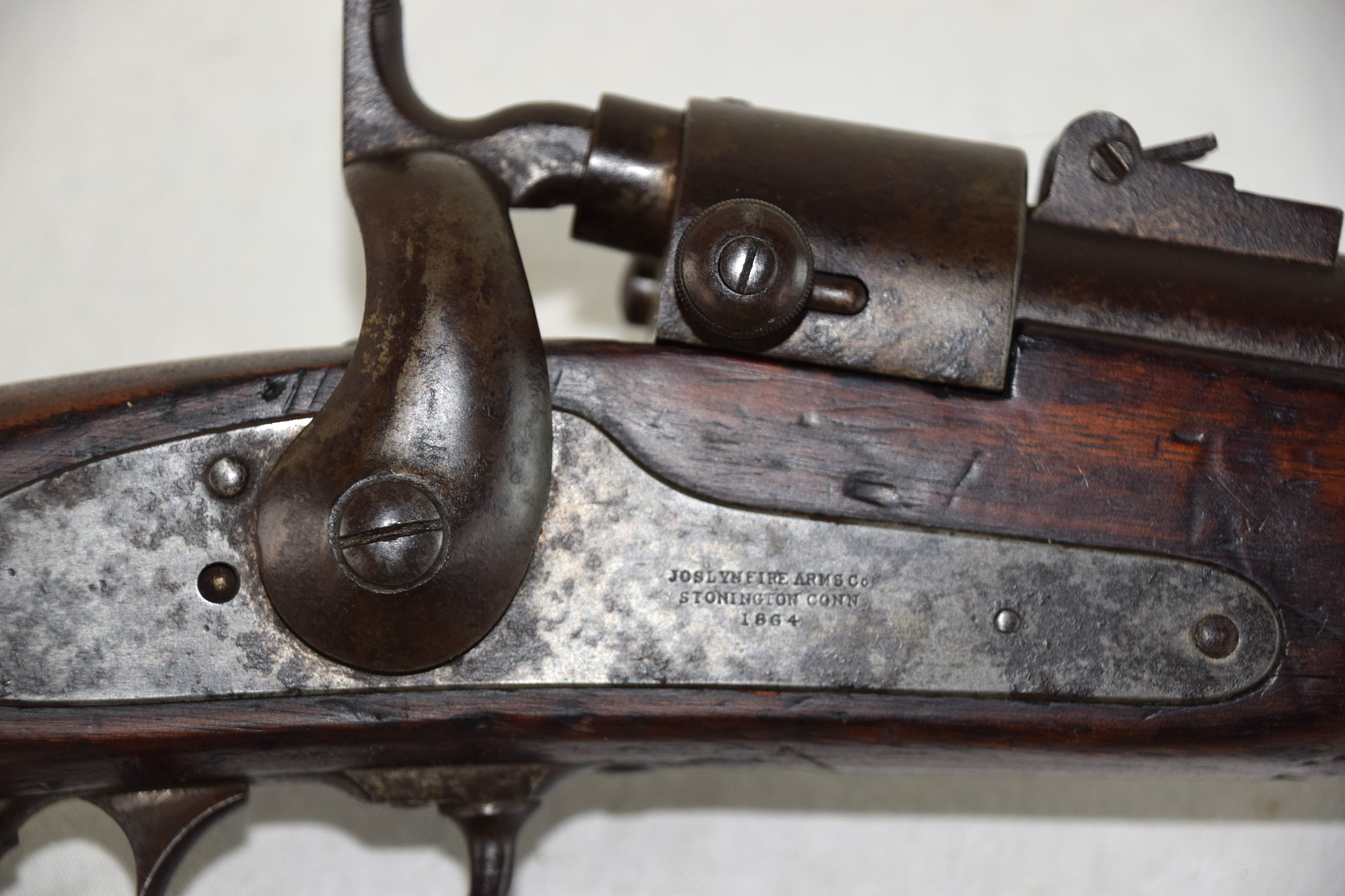 Joslyn Model 1864 Carbine, serial number 6667, 52 rim fire with a 22″ round barrel and single barrel band. Inspector stampings on left side of stock, lock markings-Joslyn Fire Arms Co/Stonington Conn/1864. Several Union calvary regiments were issued around 8000 government carbines. This carbine was most likely issued to the 19th NY.