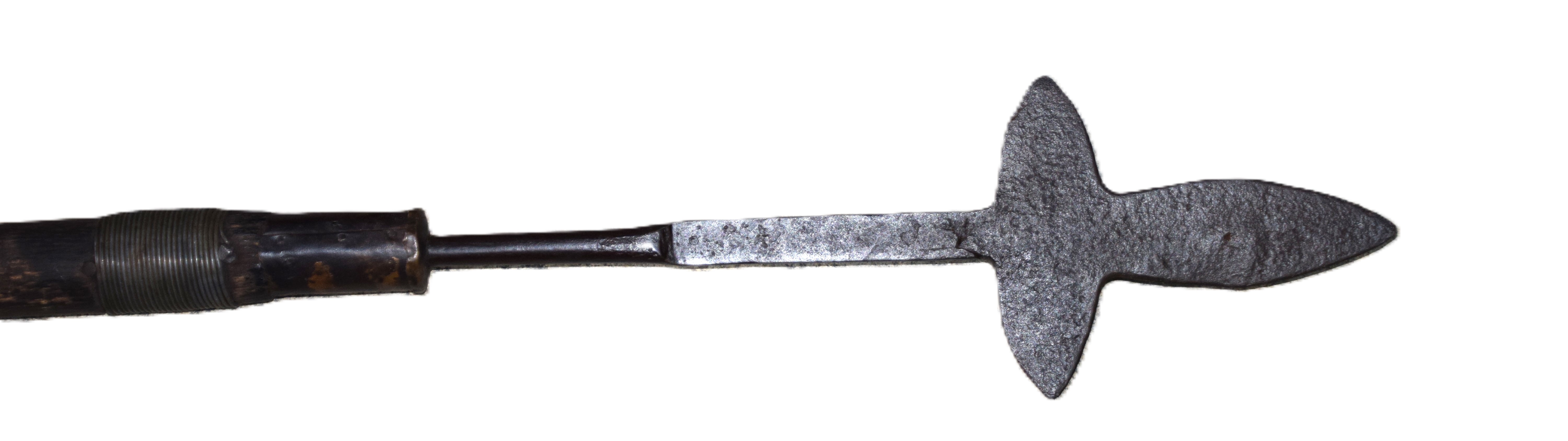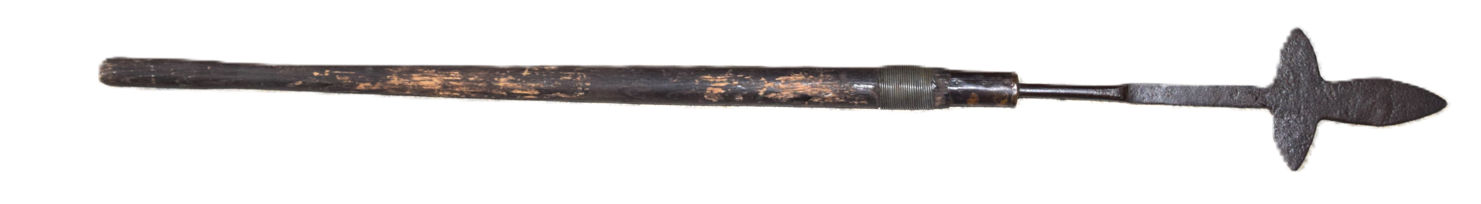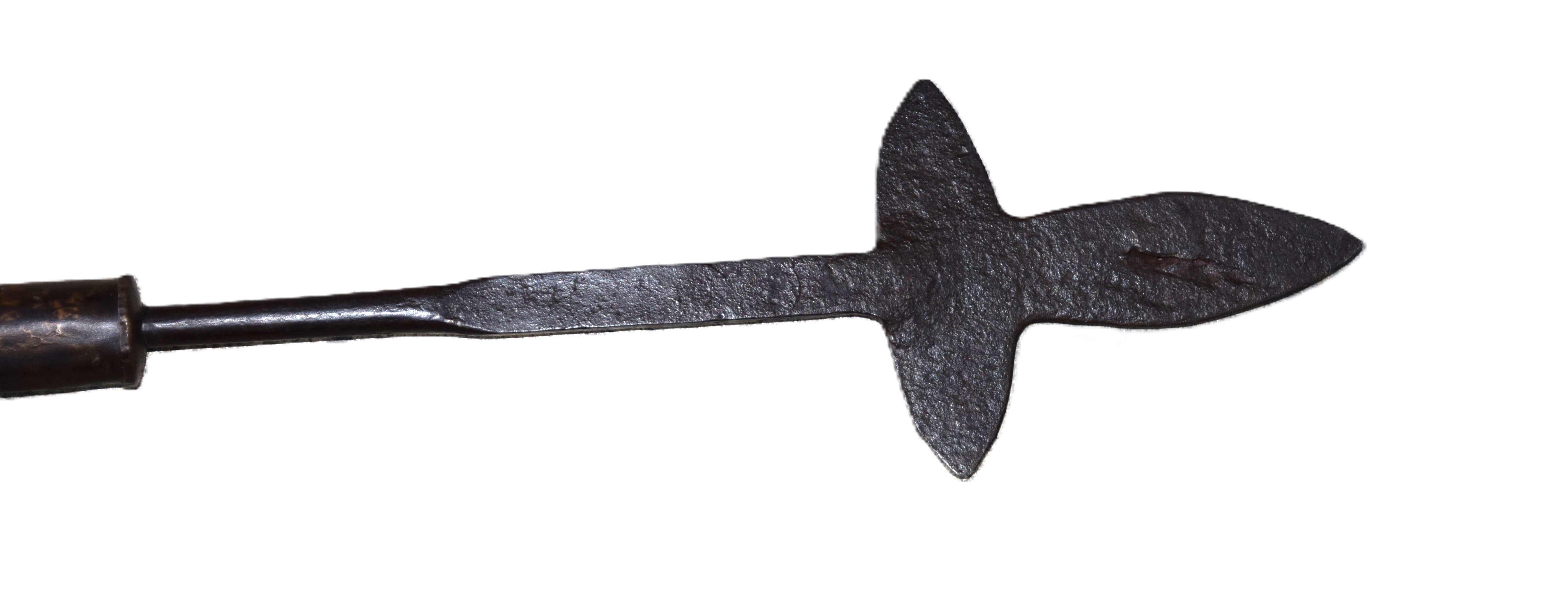 Primitive American spontoon for a militia NCO attached to a primitive haft. Dimensions: 16″ Spontoon; 55″ Overall