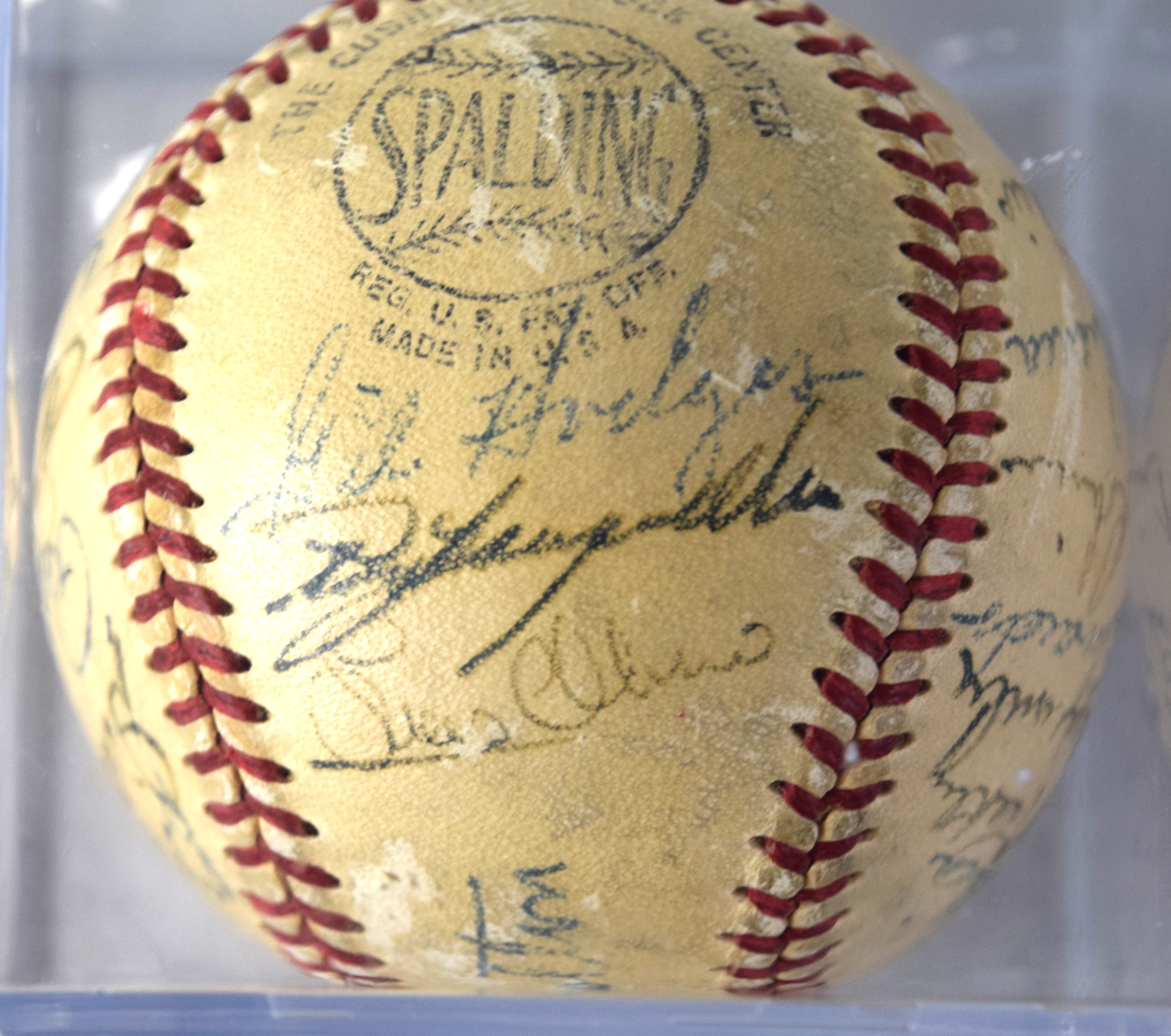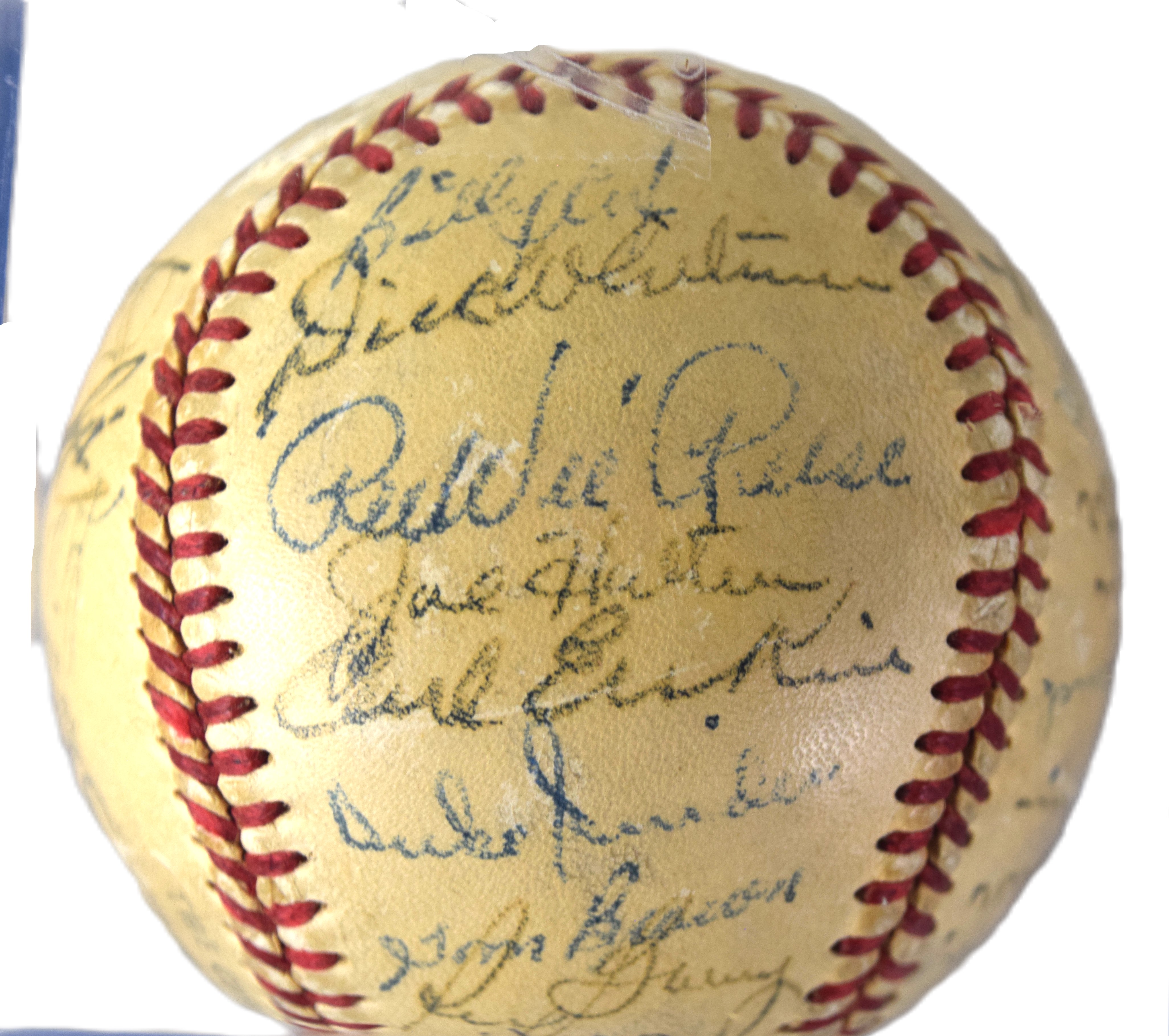 Jackie Robinson rookie 1947 team signed baseball including Duke Snider, Pee Wee Reese, Gil Hodges, Ralph Branca, Dixie Walker–a total of 27 signatures on a Spaulding Official National League baseball. This baseball was signed on opening day with both Kirby Higbee and Dixie Walker unwilling to play with Robinson. Additionally, Carl Erskine and Don Newcombe signed the ball who were minor league players who joined the Dodgers in 1948. On April 15, Jackie Robinson was the opening day first baseman for the Brooklyn Dodgers, becoming the first Black player in Major League Baseball. Robinson went on to bat .297, score 125 runs, steal 29 bases and win Major League Baseball’s inaugural Rookie of the Year award. The Dodgers won the National League title and went on to loose to the New York Yankees in the World Series.