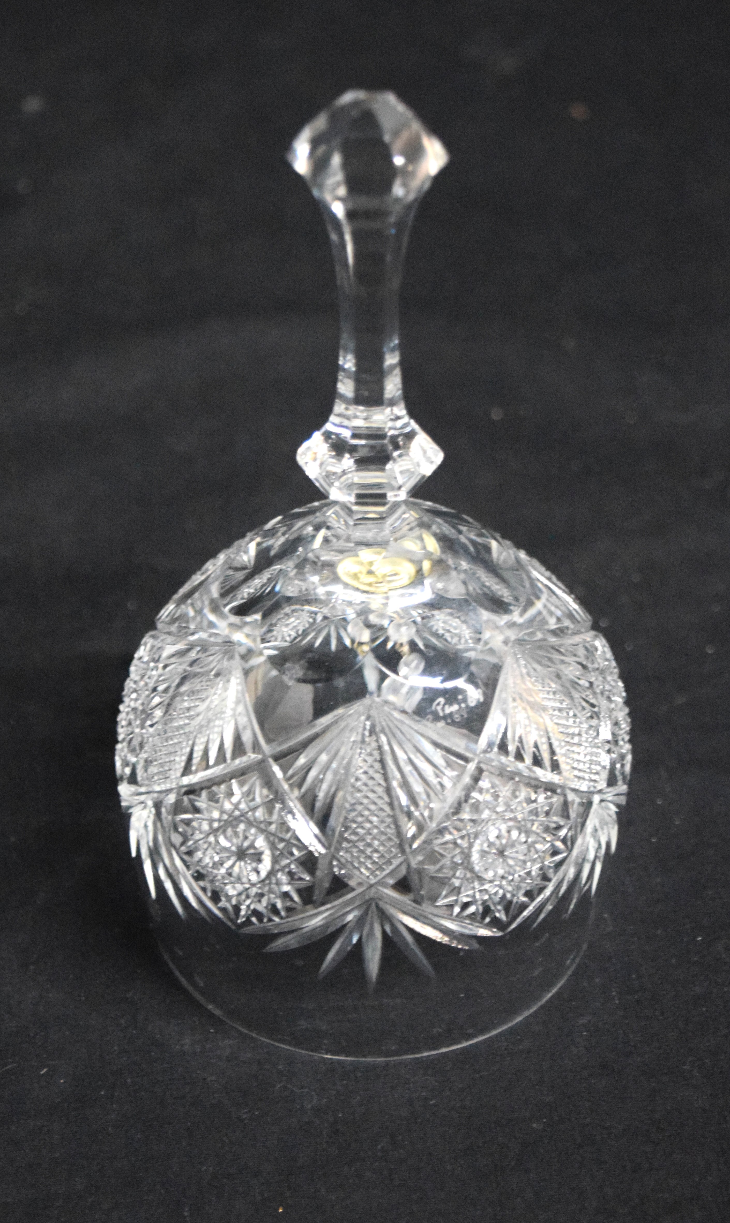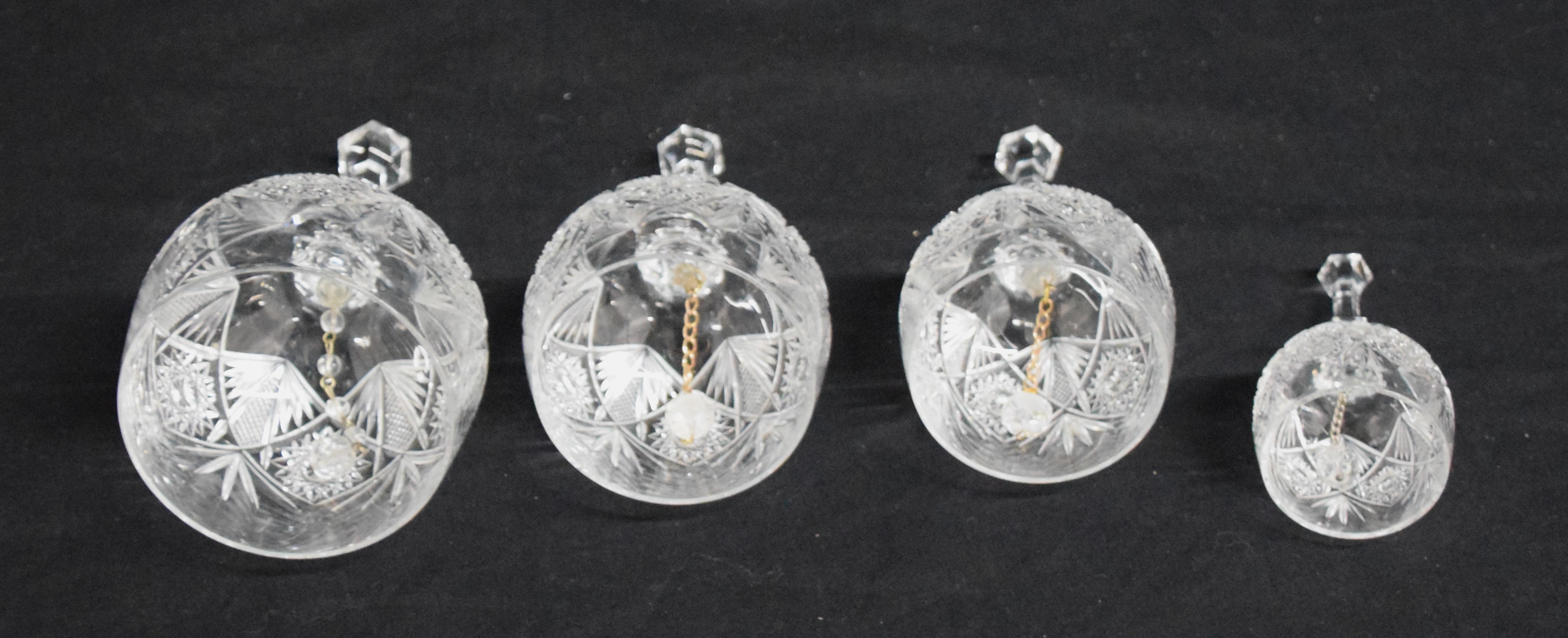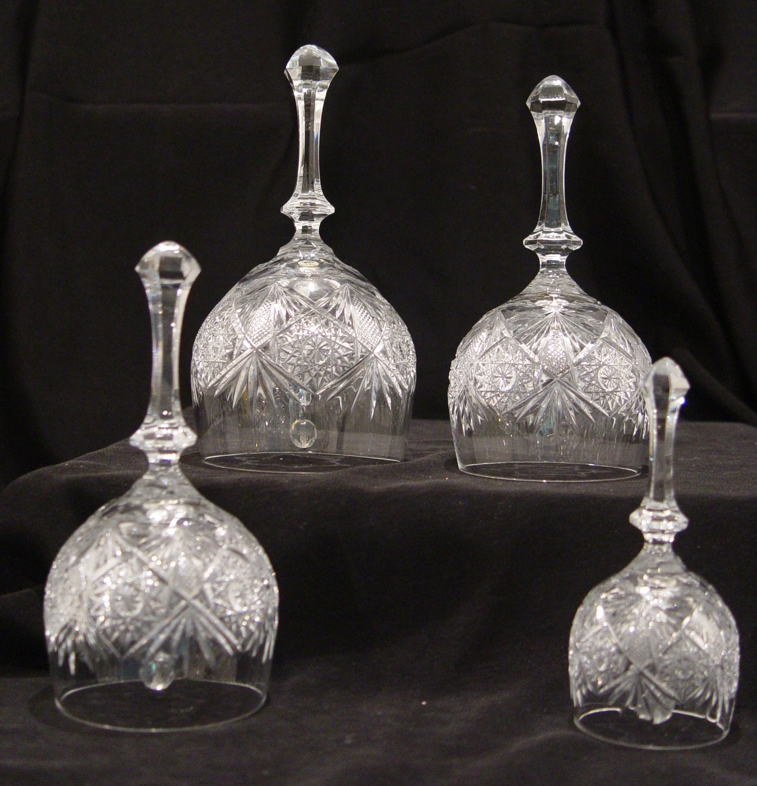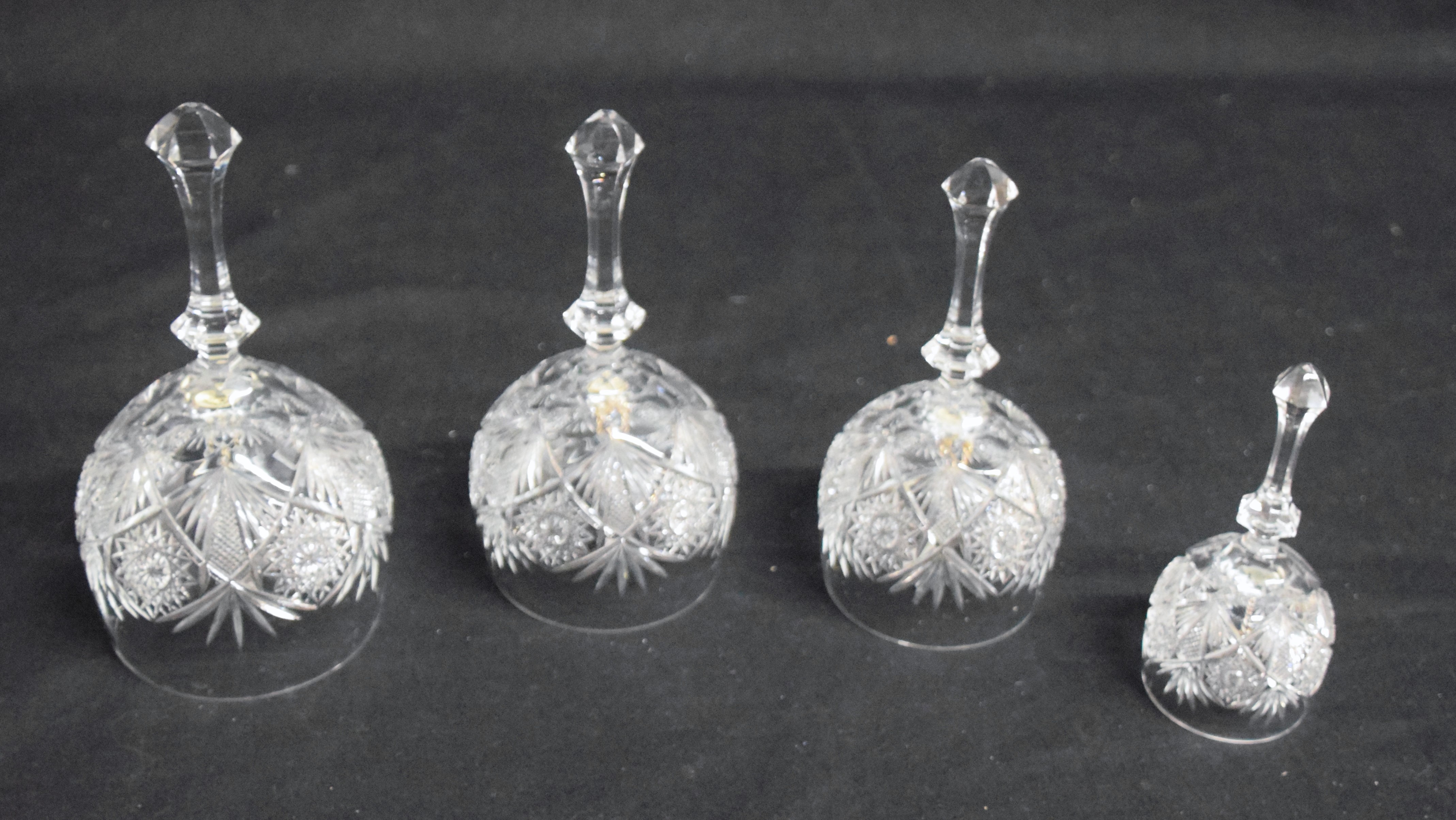 Four graduated set of unique hand cut crystal bells made from wine glasses of an elegant design. Pepi was the master crystal cutter from NH who sold to Presidents and Hollywood stars. Dimensions: 4.5″ to 7″ H