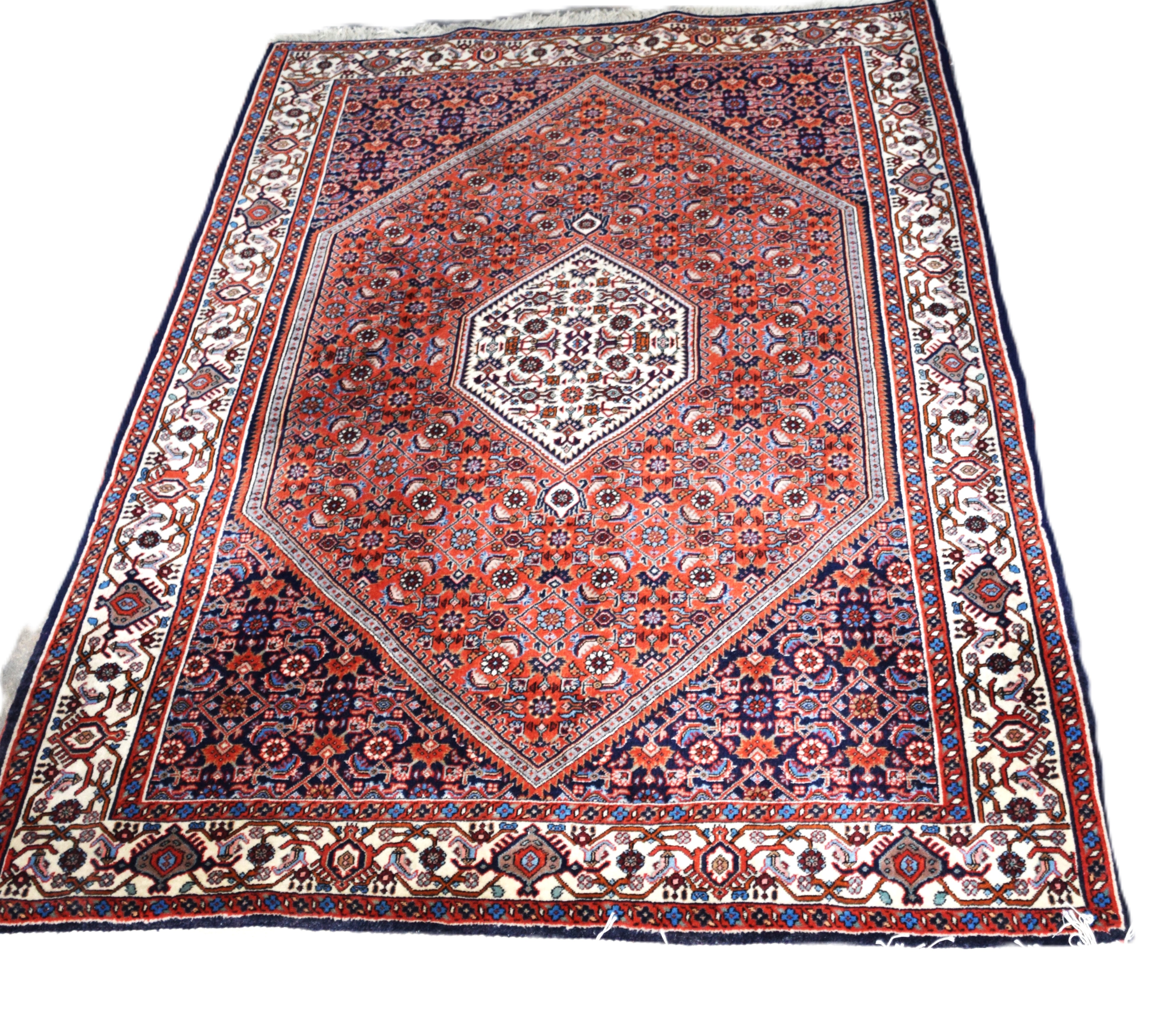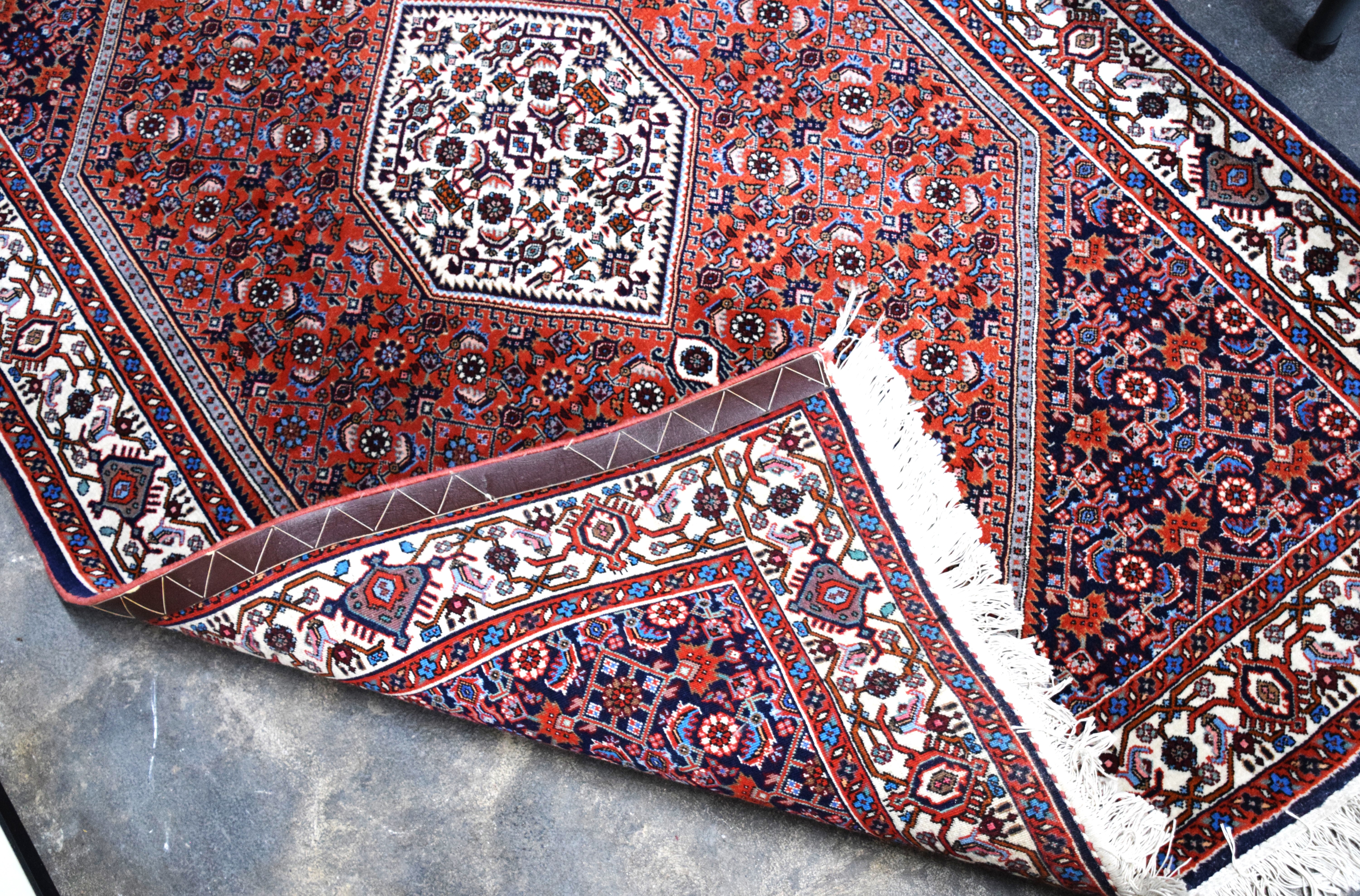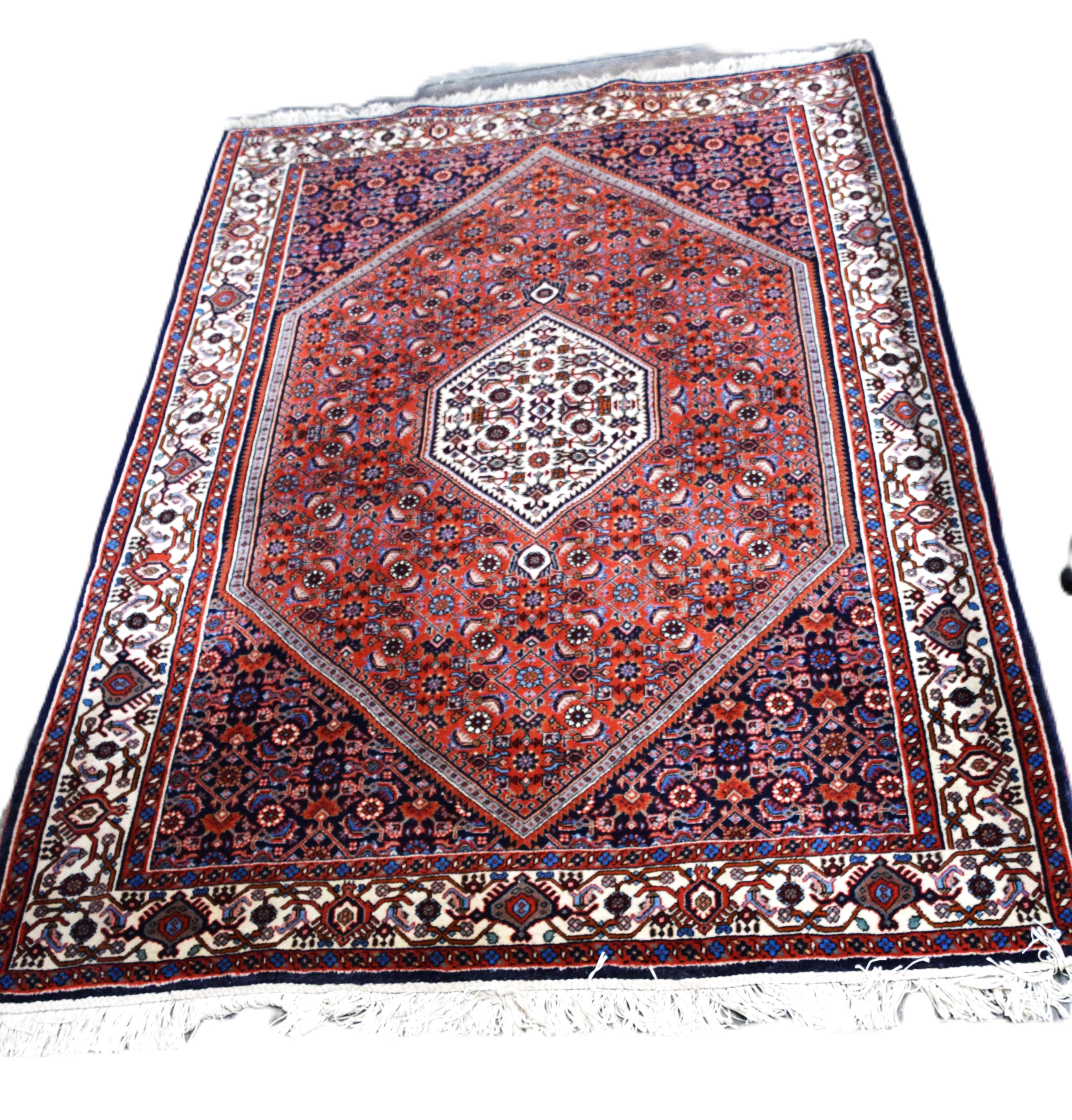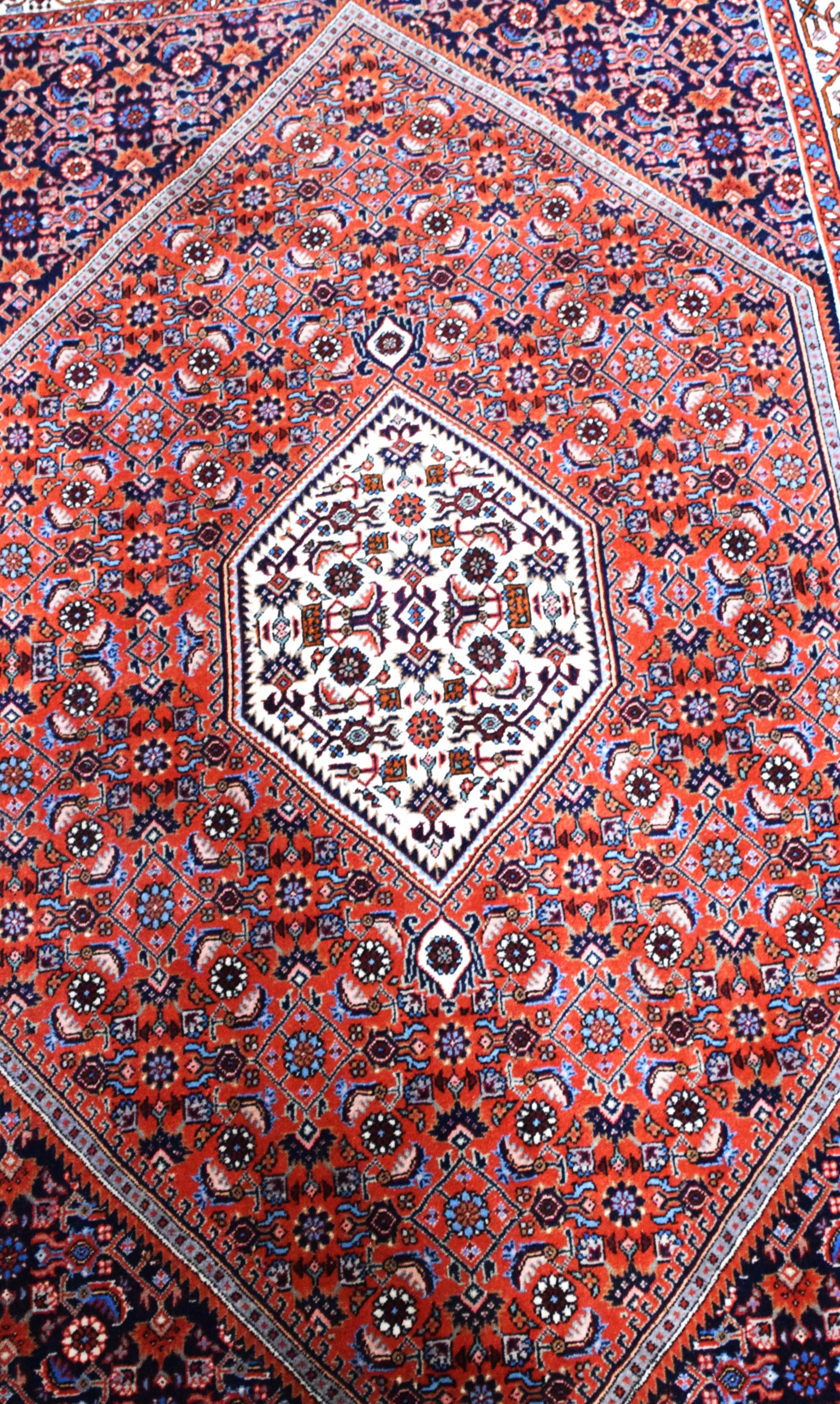 Very good oriental scatter rug with center medallion and an all over busy designs, multicolor of red, blue and ivory. From a New London NH Home. Dimensions: 3’11” x 8′