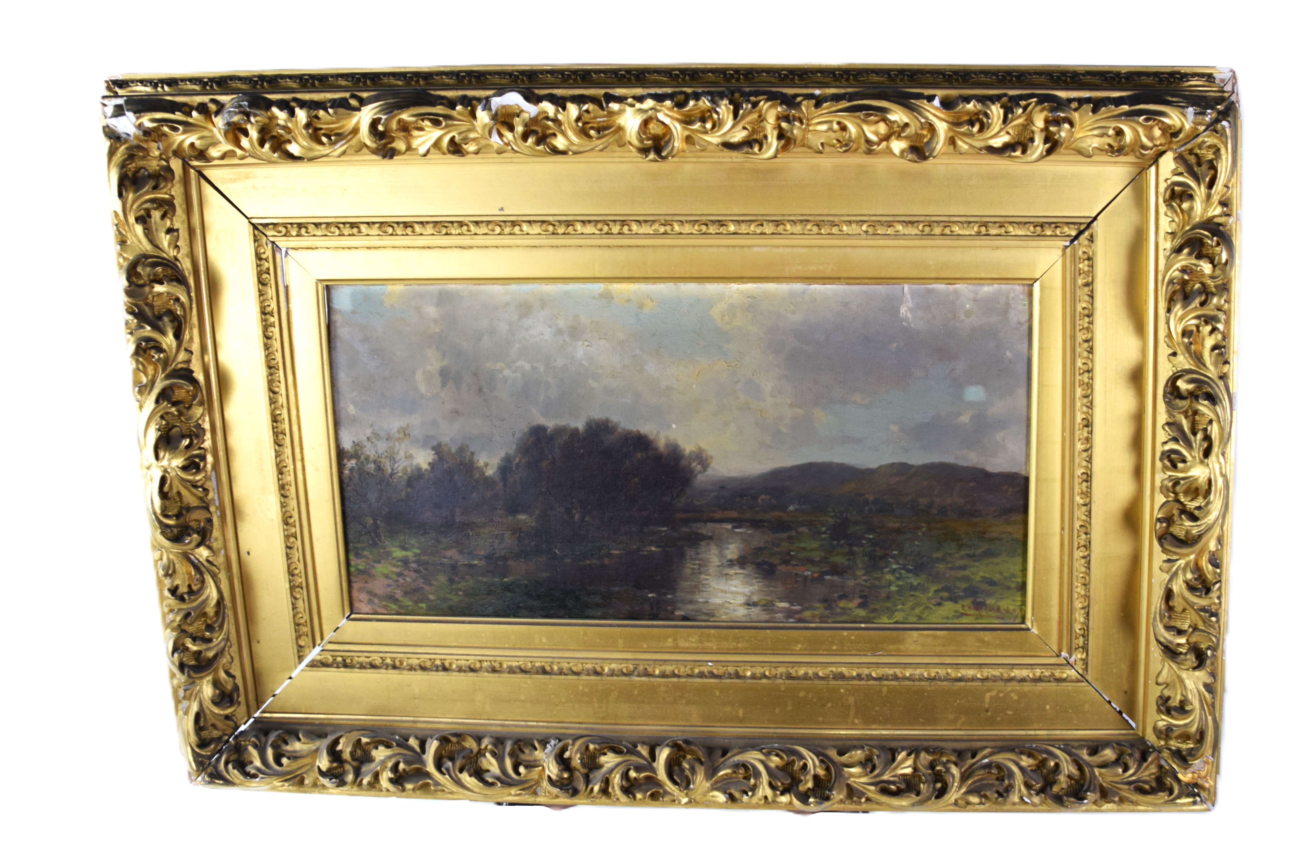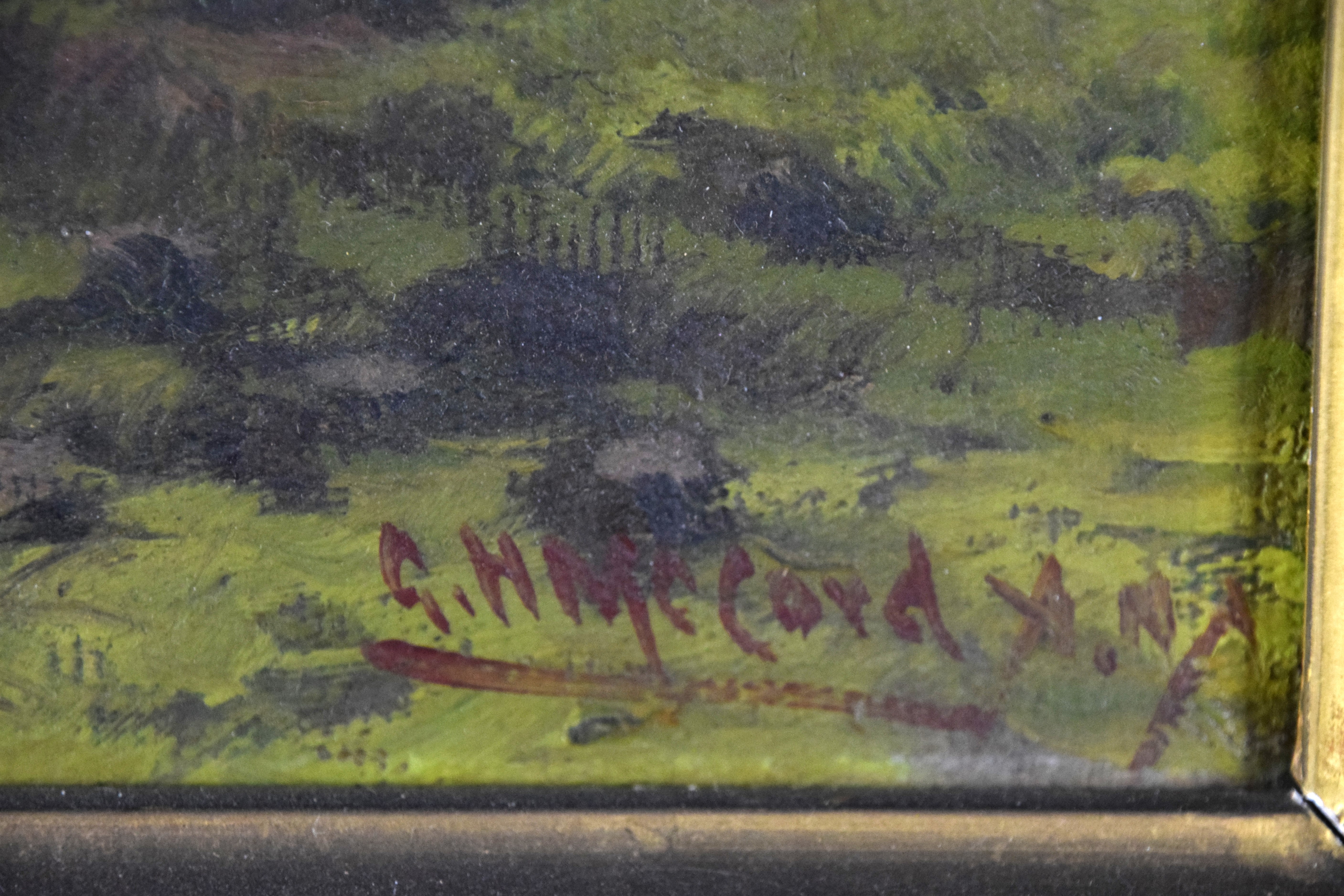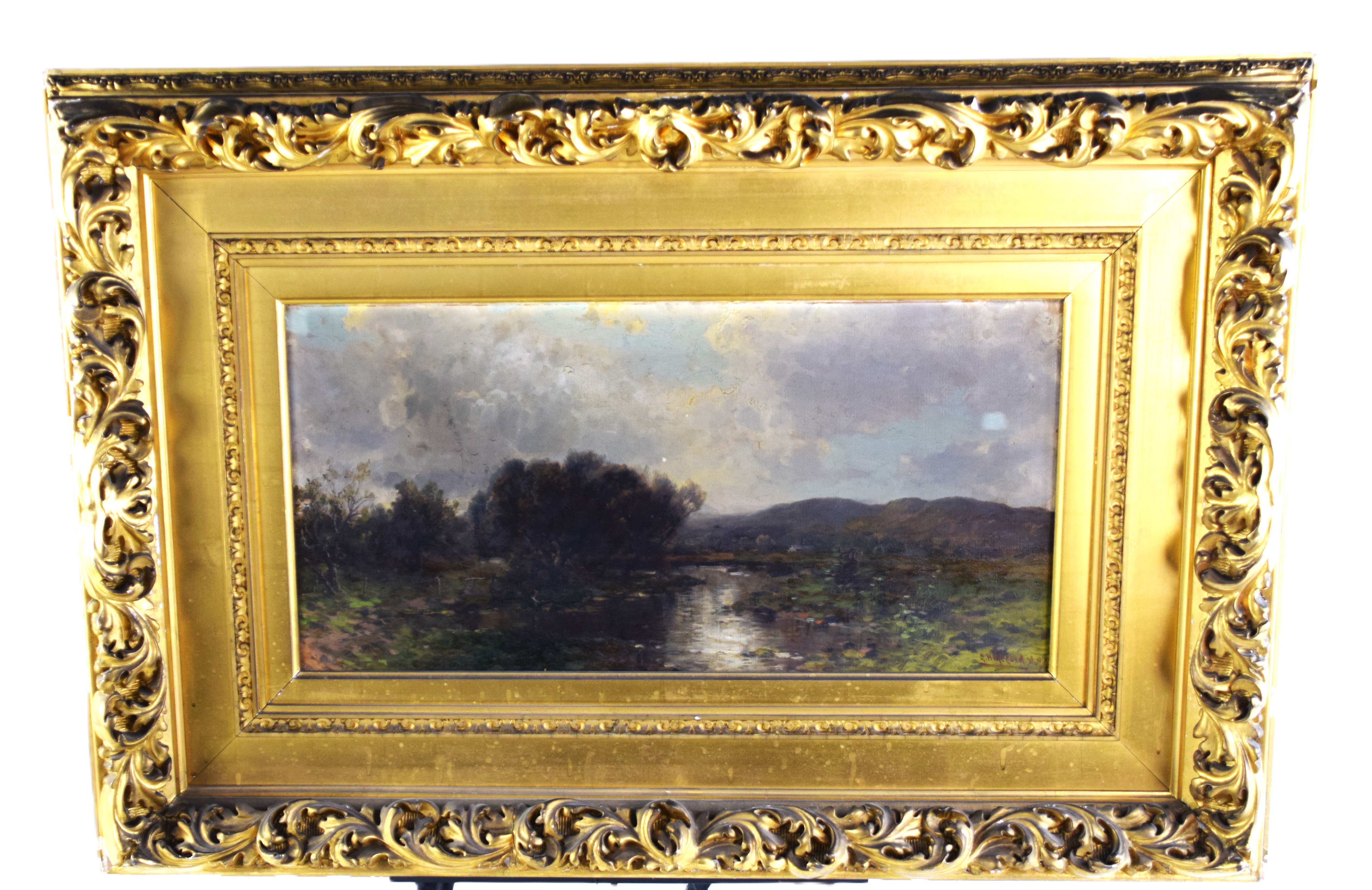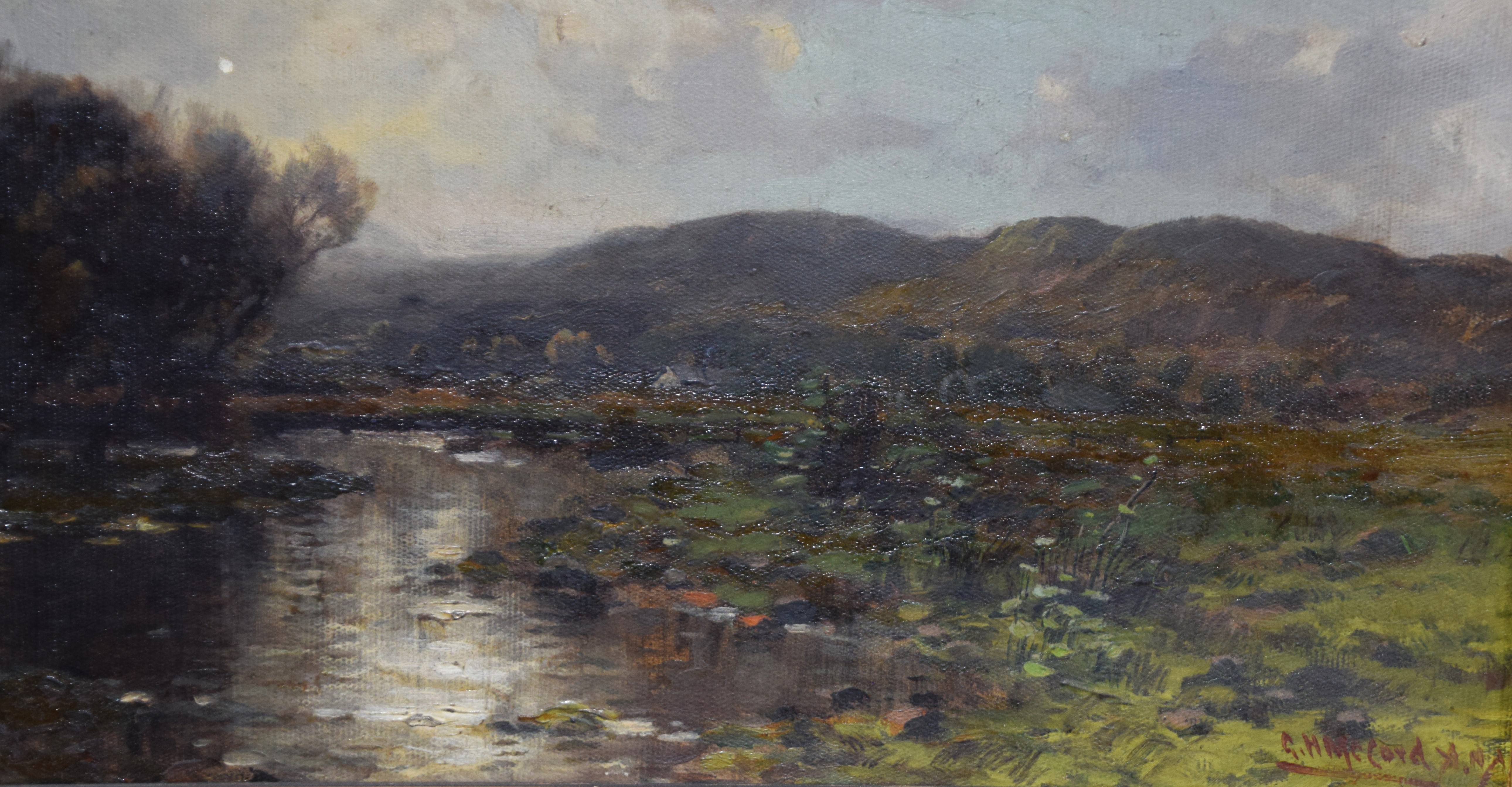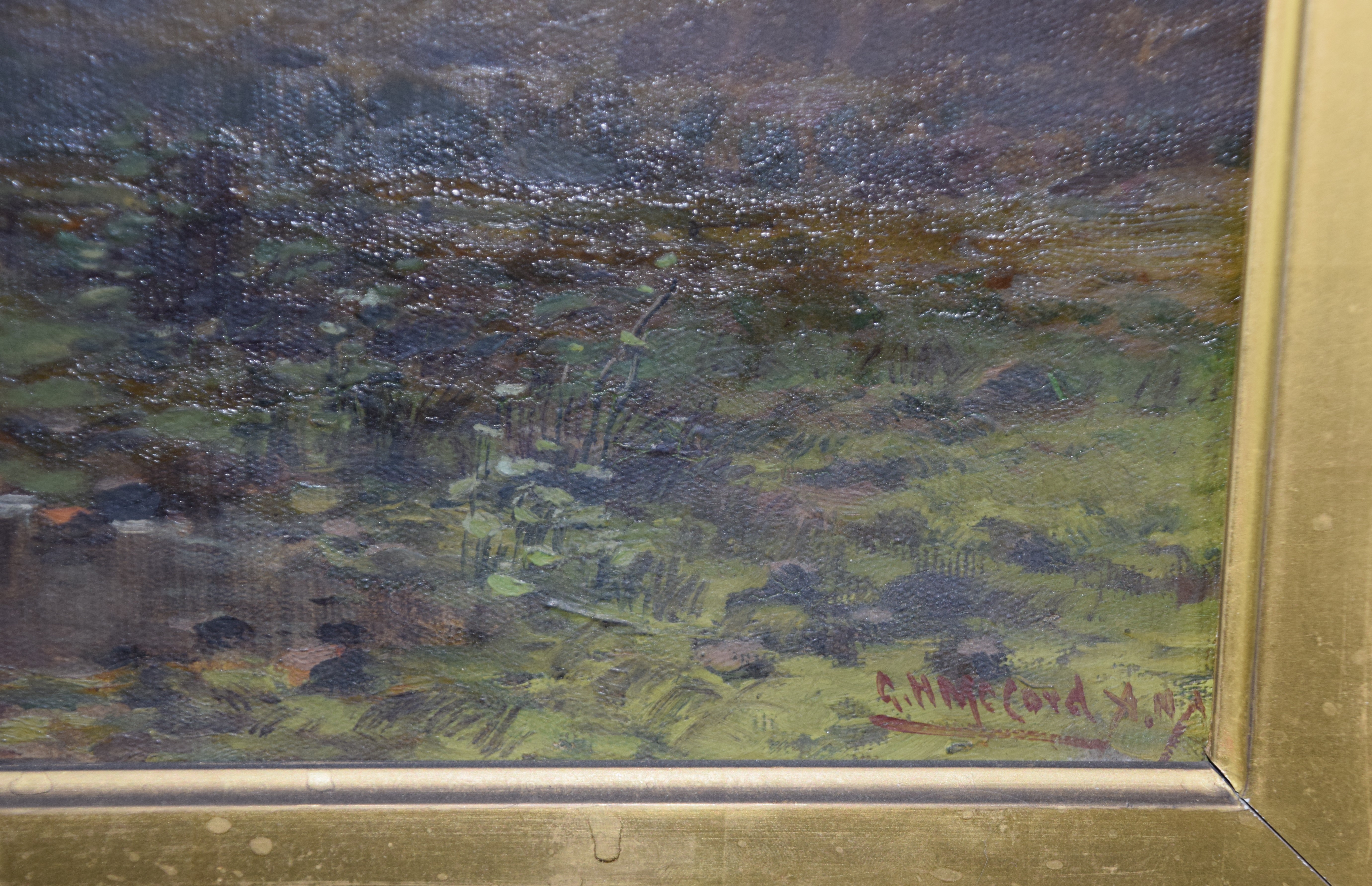 Framed and signed landscape oil on canvas painting with trees, stream and overcast sky. Signed lower right. George Herbert McCord (1848 – 1909) worked in New York and is known for atmospheric landscape and marine painting in oil and pastel. Provenance: Deaccessioned from Mount Holyoke College Museum. Dimensions: 12′ x 23" Image size, 26" x 37" Overall
