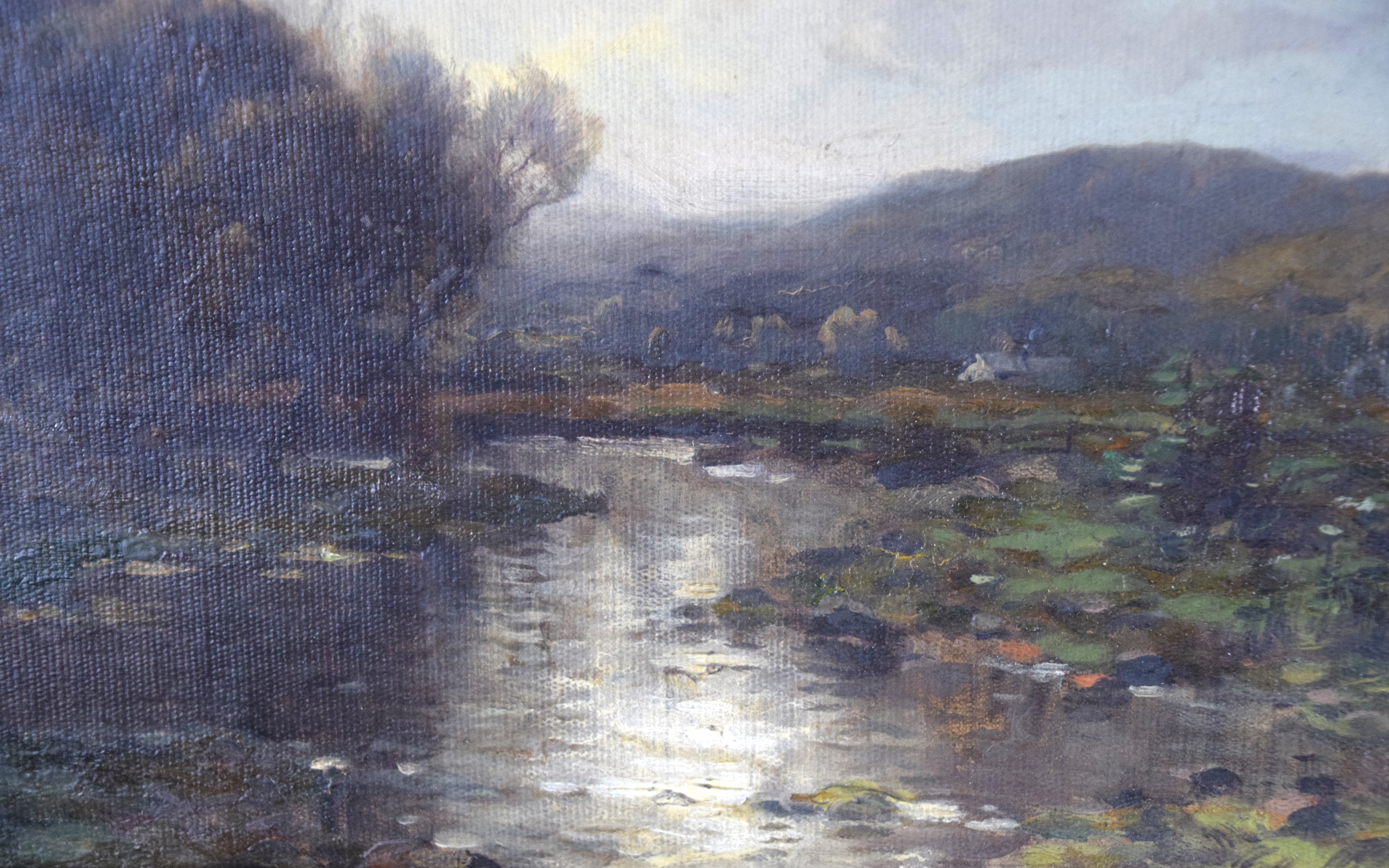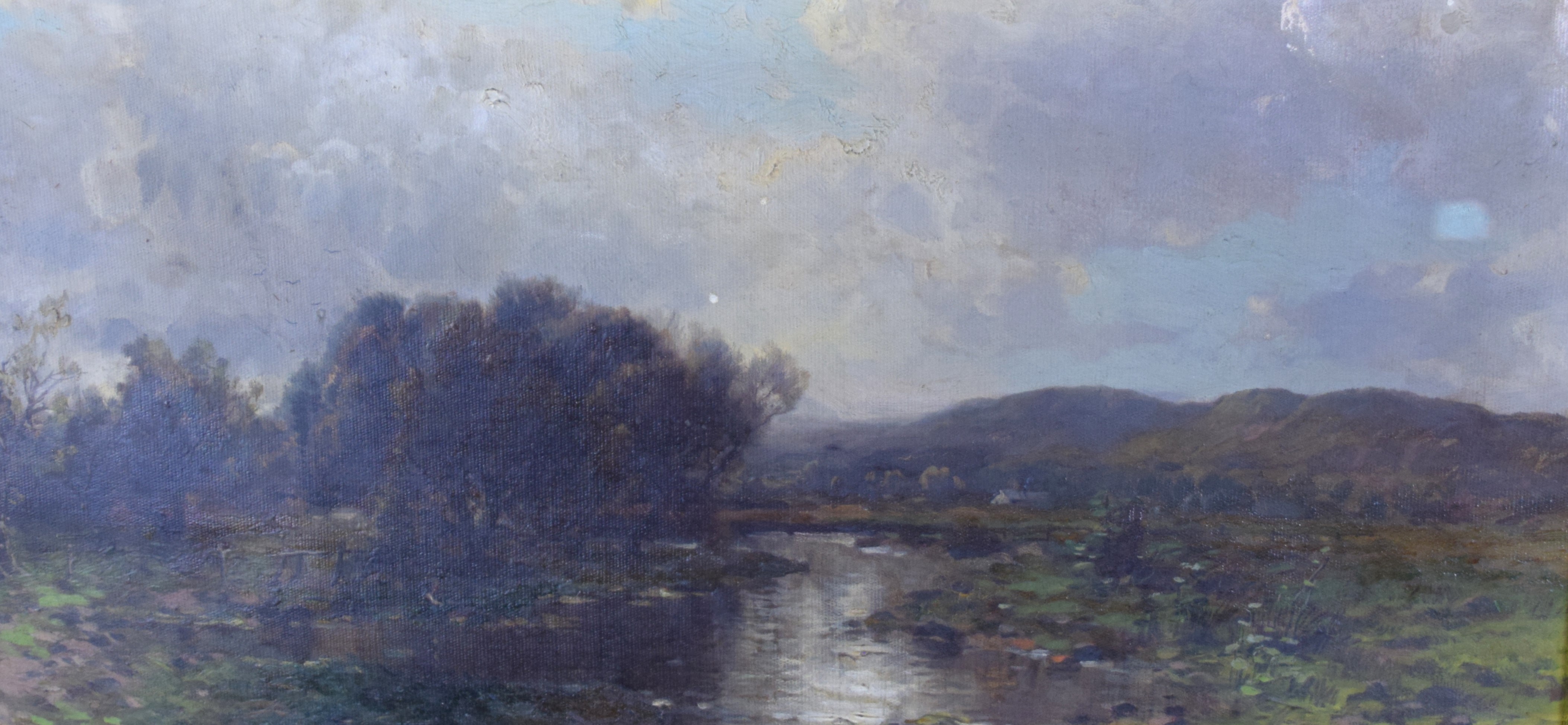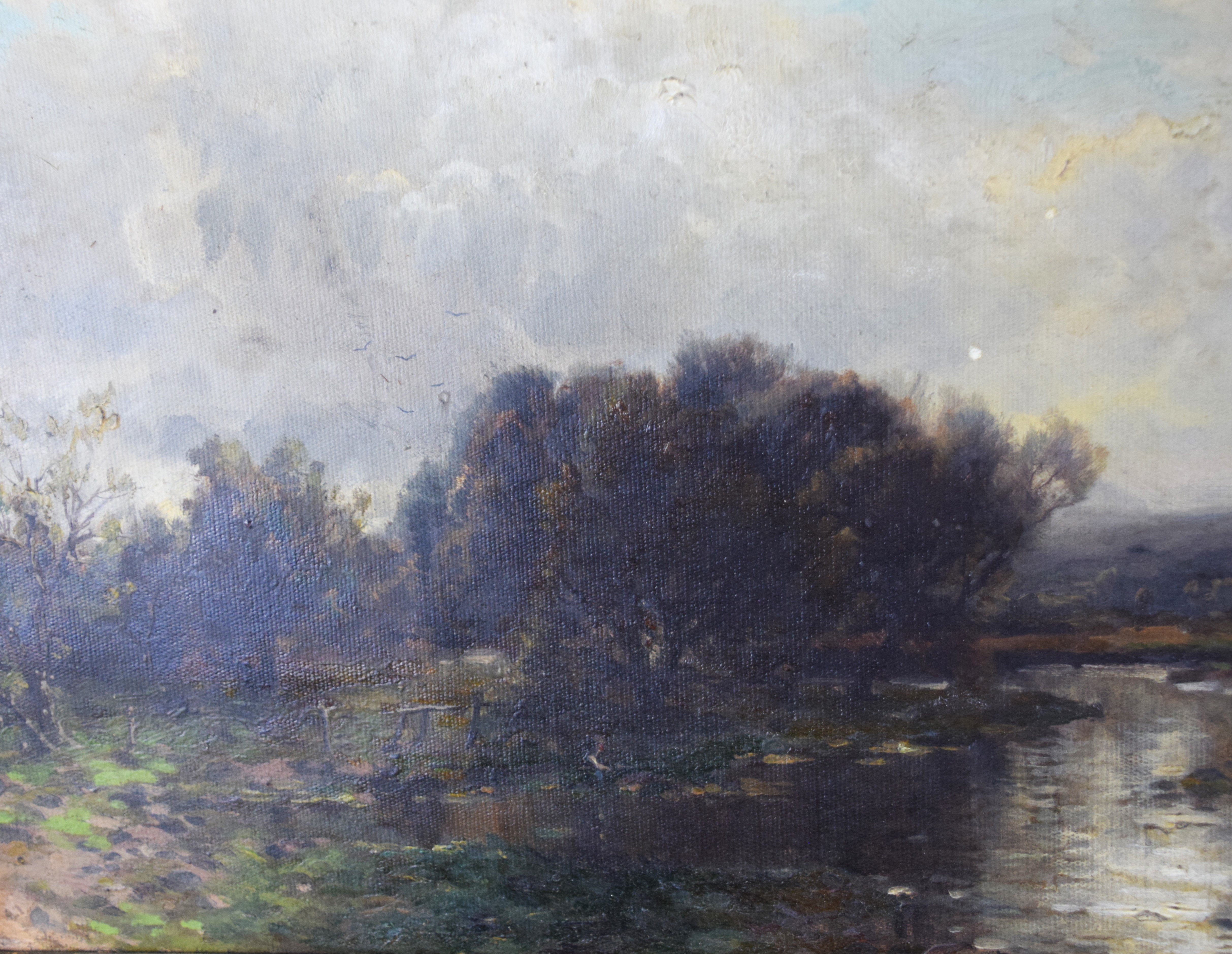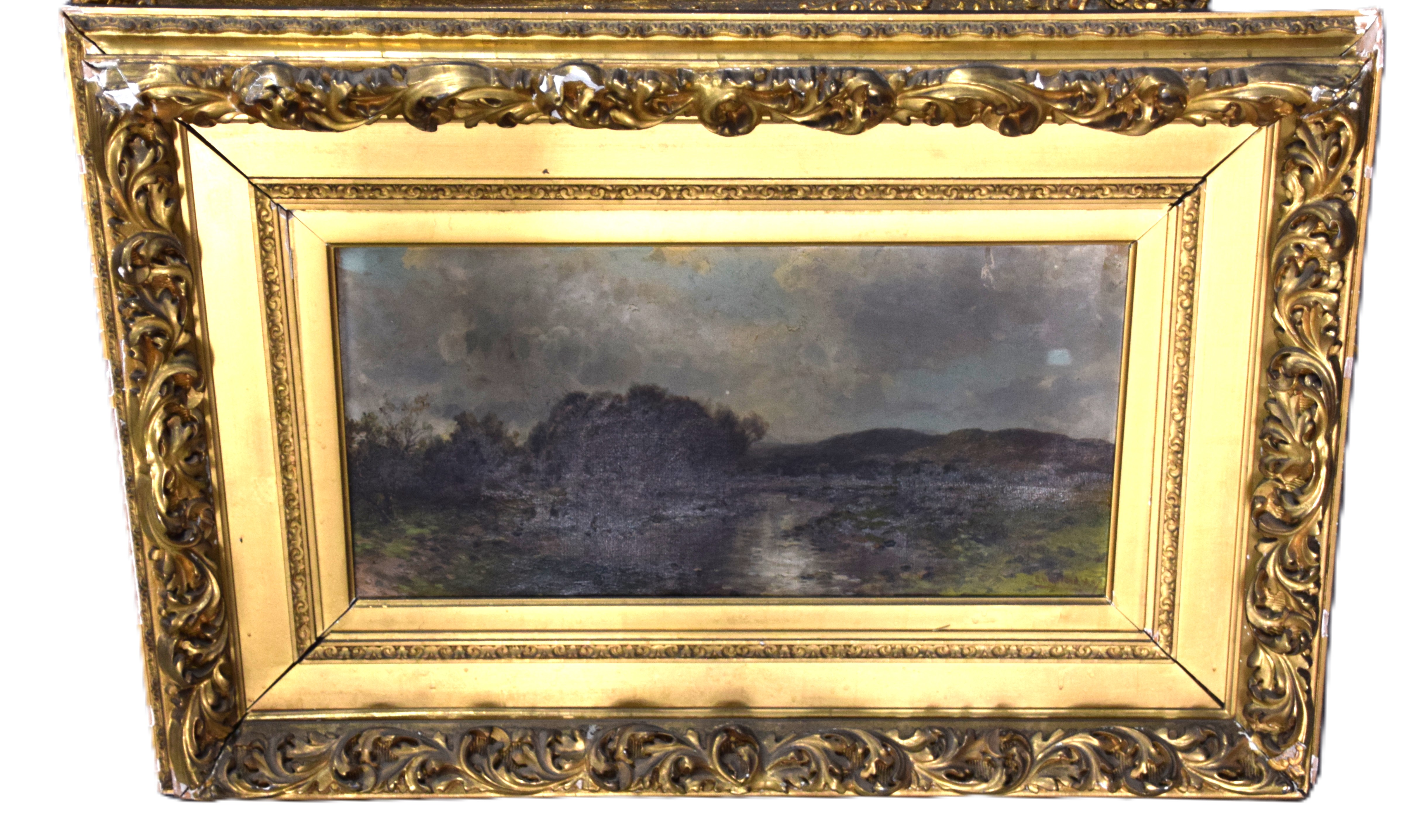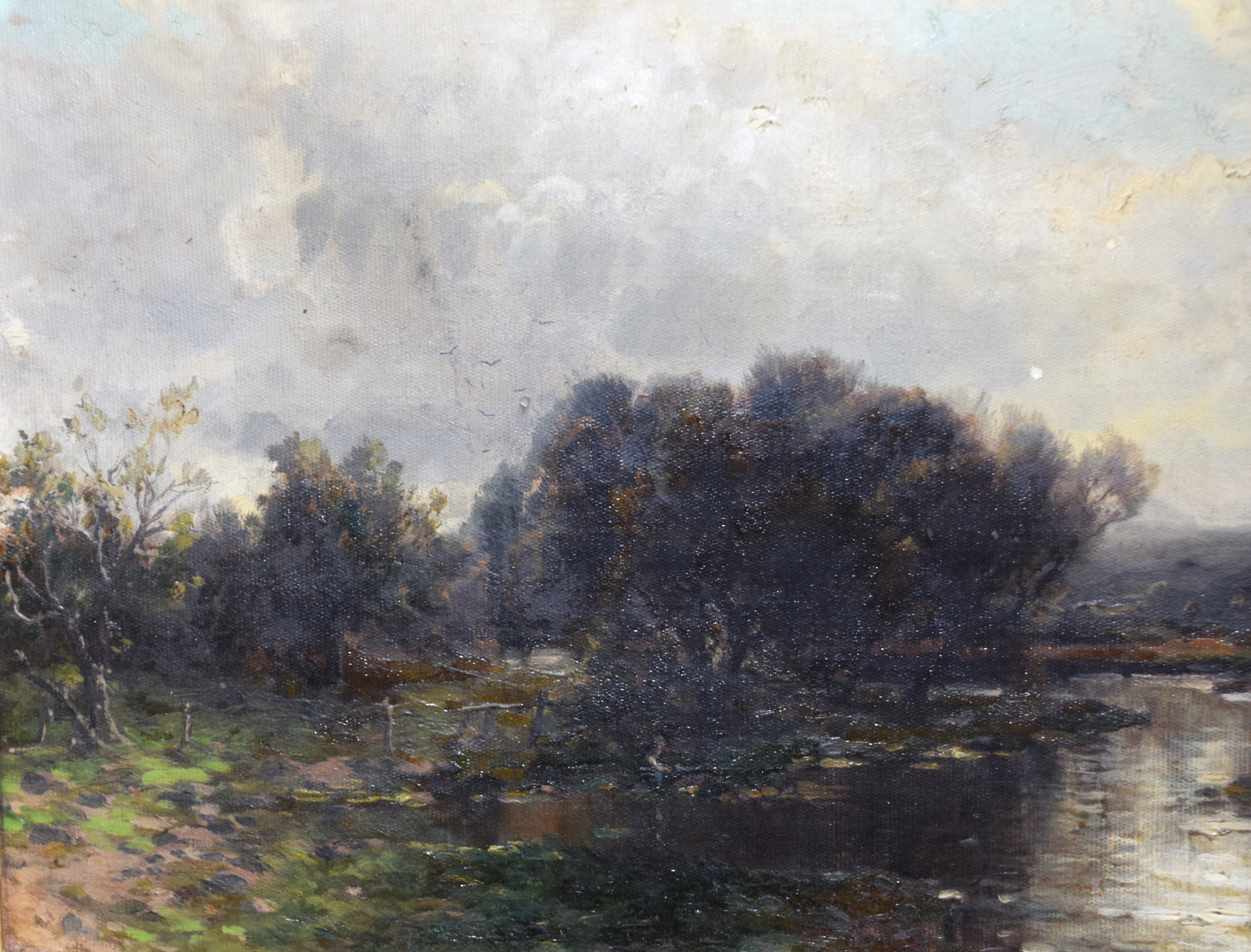 Framed and signed landscape oil on canvas painting with trees, stream and overcast sky. Signed lower right. George Herbert McCord (1848 – 1909) worked in New York and is known for atmospheric landscape and marine painting in oil and pastel. Provenance: Deaccessioned from Mount Holyoke College Museum. Dimensions: 12′ x 23" Image size, 26" x 37" Overall