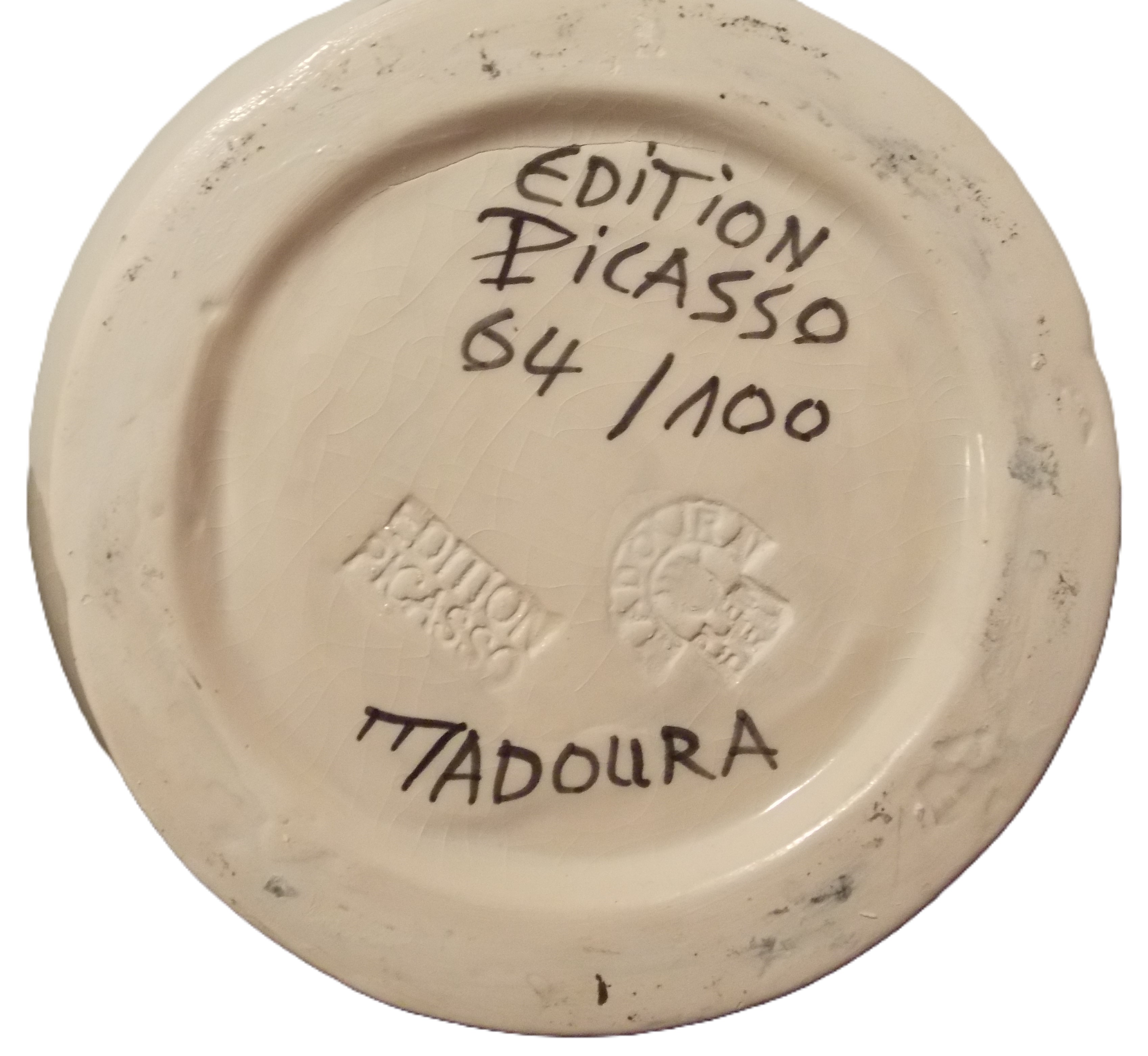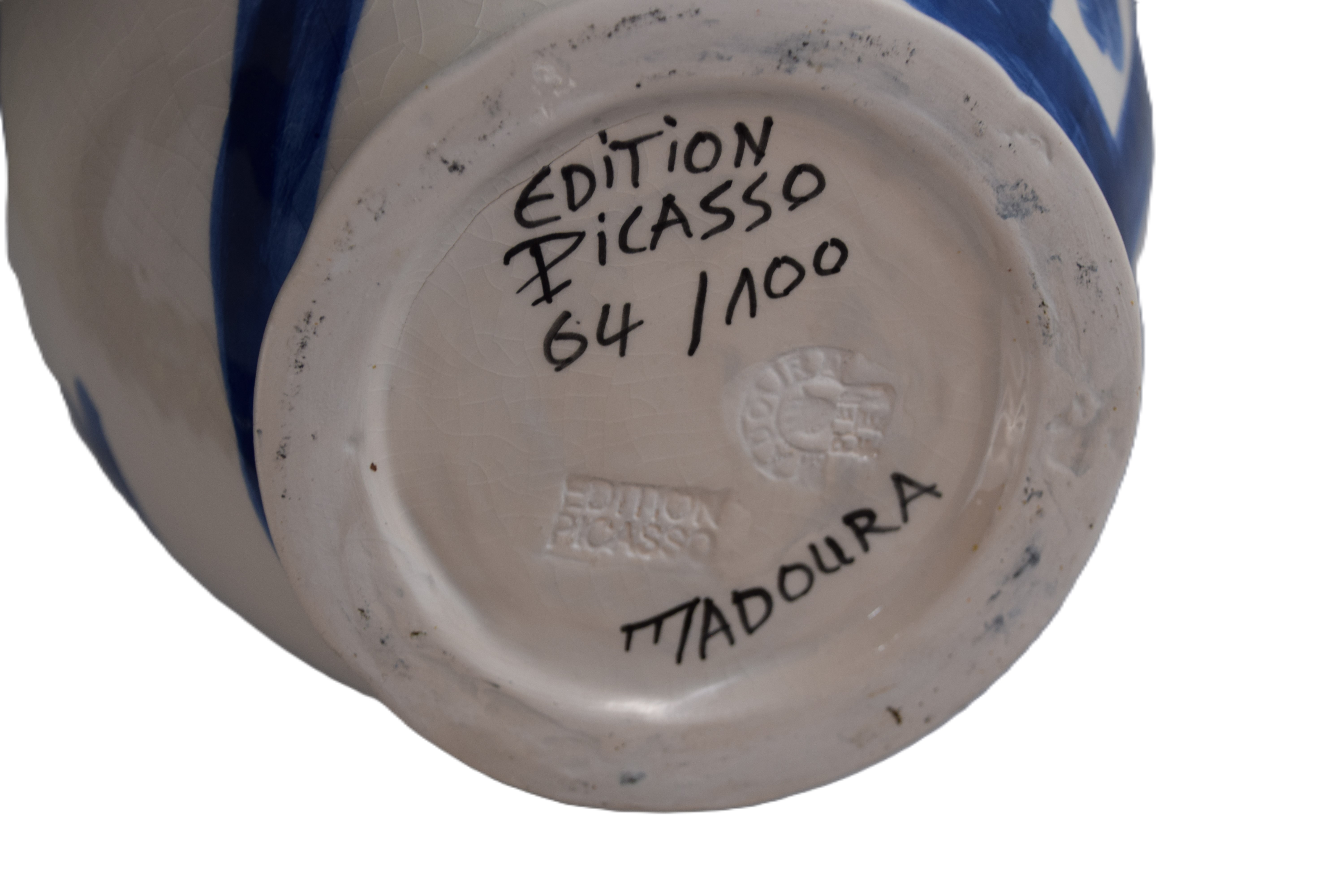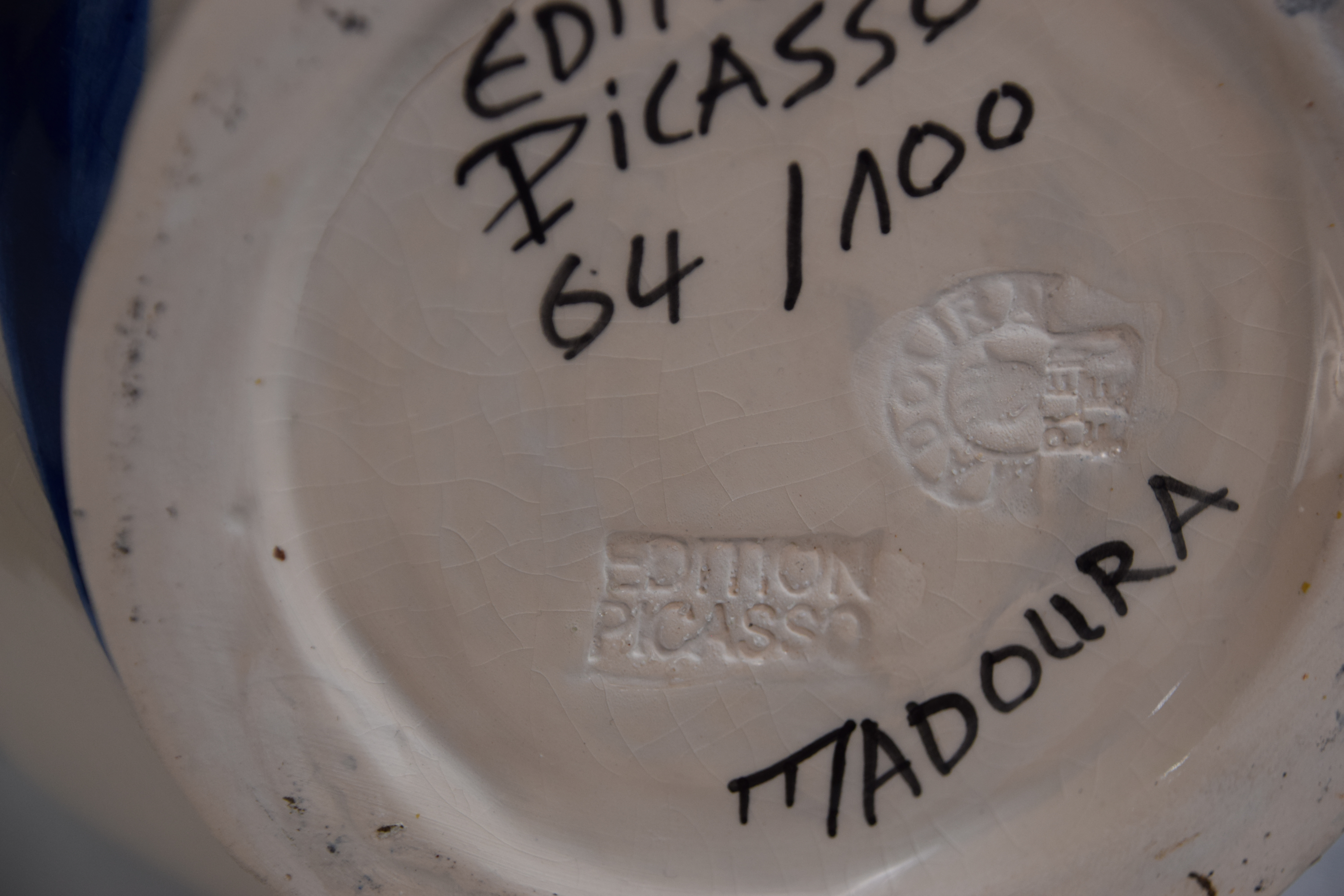 A Pablo Picasso ceramic/glace ice pitcher, number 64 of 100, circa 1950s from a private collector from France. Pablo Picasso (1881 – 1973) worked in Spain, and France and as a painter and printmaker he revolutionized western art. Dimensions: 11 3/4″ H