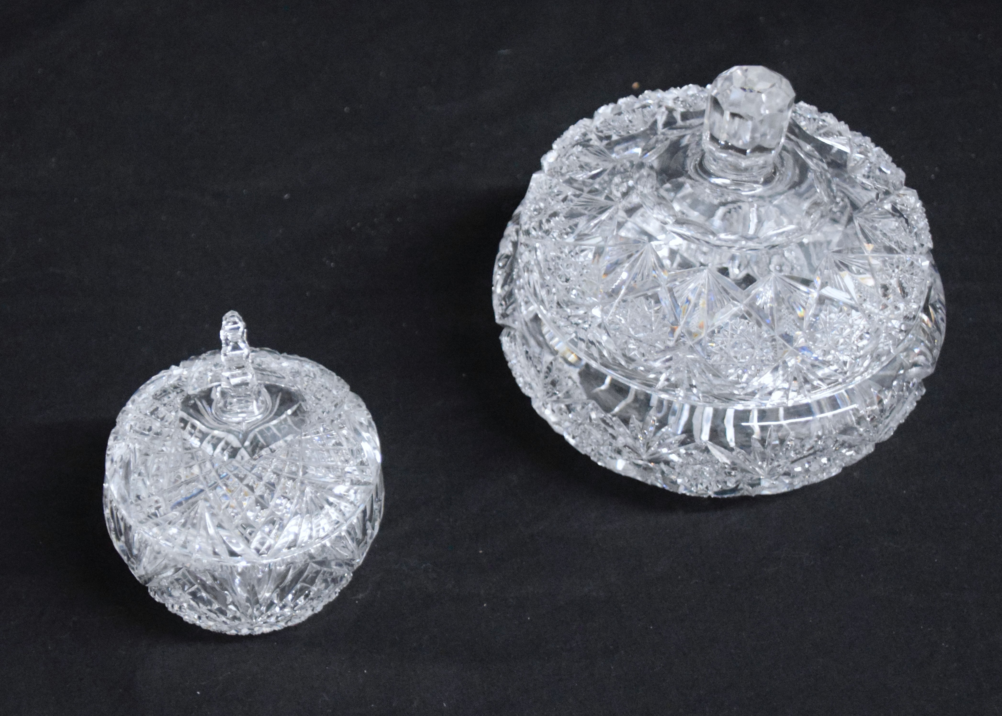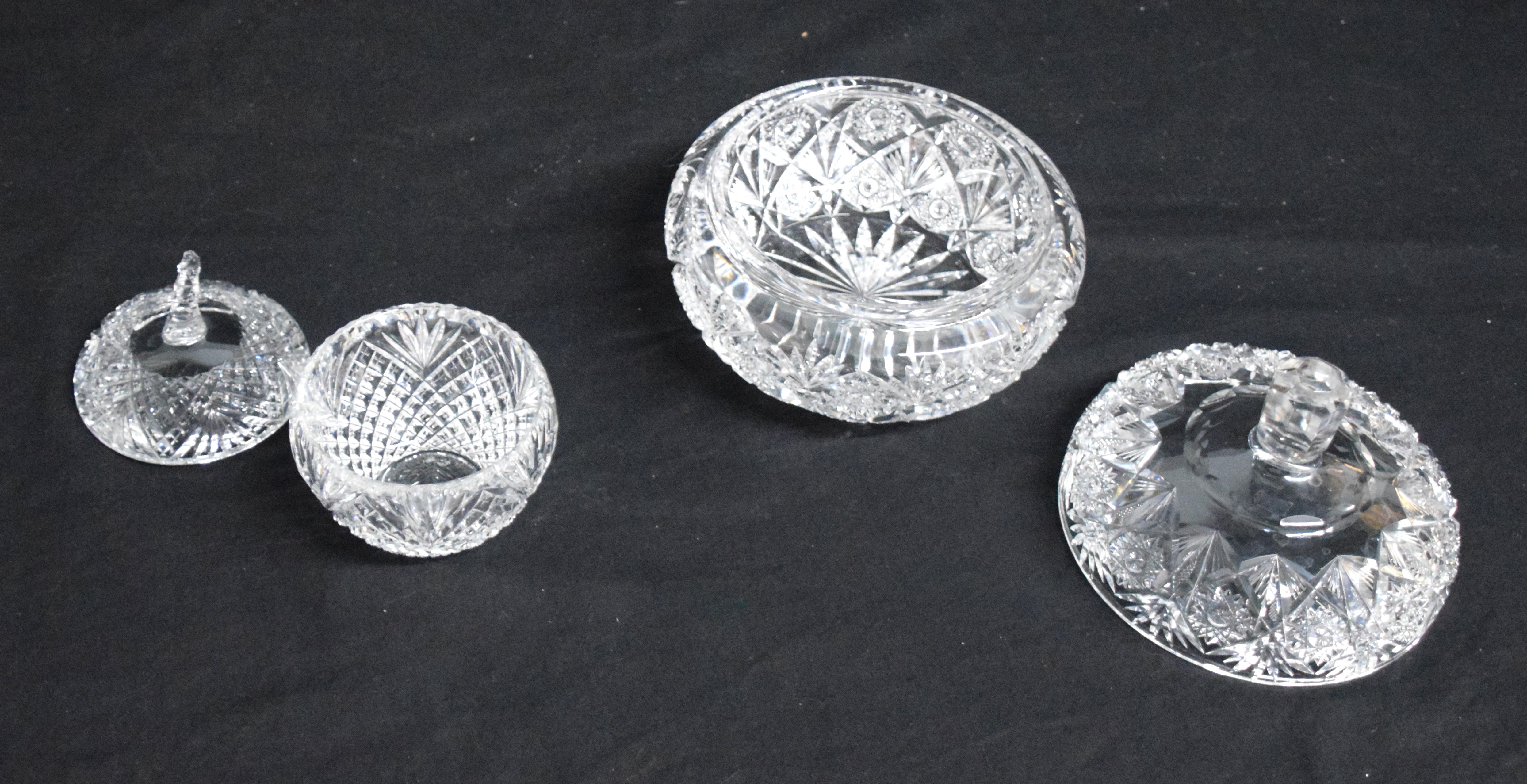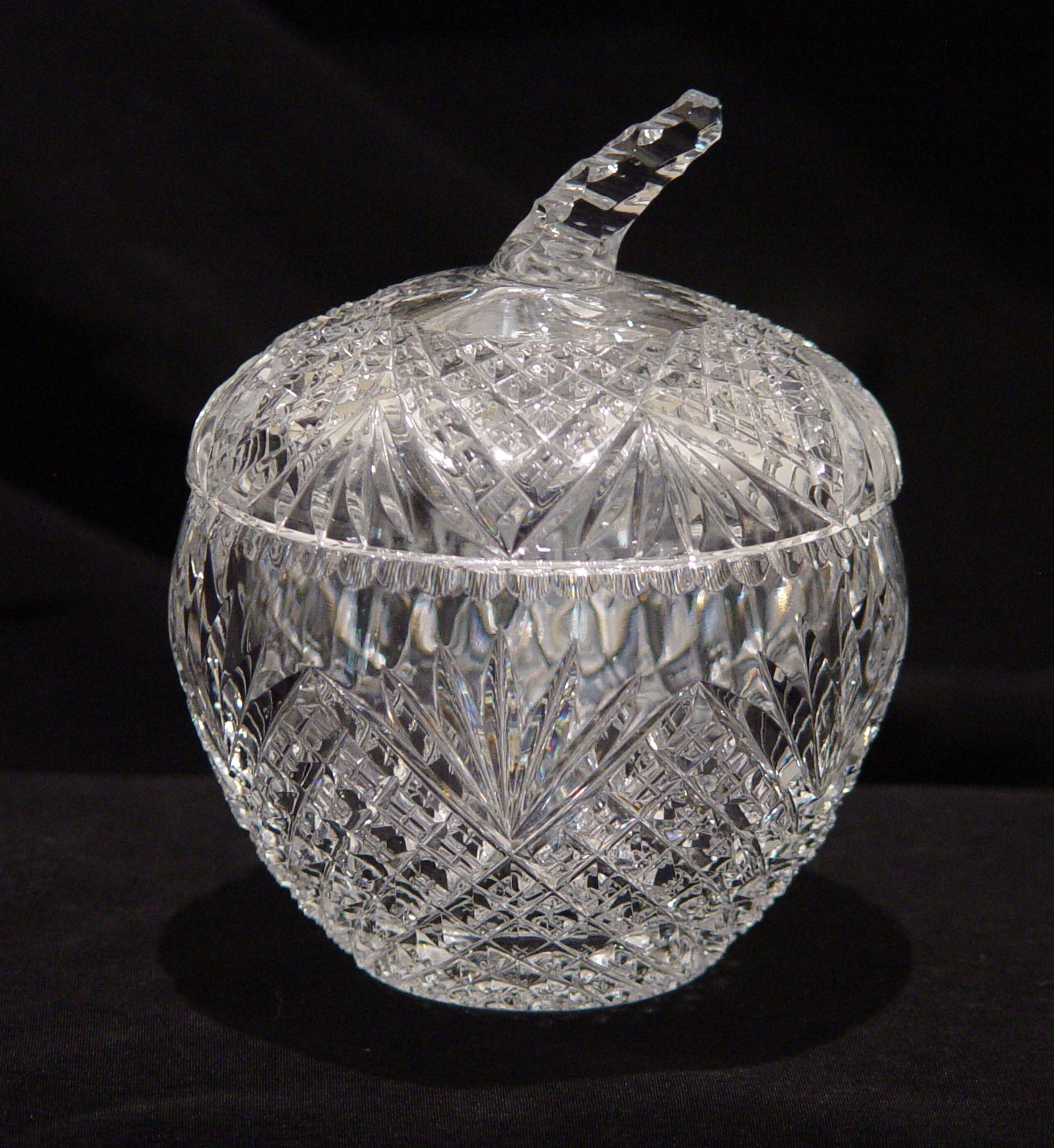 Two hand cut and signed crystal bowls with extremely fine and precise designs. The Pear bowl is signed “Pepi 1981″ on the cover and bowl. The other bowl is signed” Pepi 1987″ on the bottom. Pepi was the master crystal cutter from NH who sold to Presidents and Hollywood stars. Dimensions: 4.5″ H Pear Bowl, 6″ H of Covered Bowl
