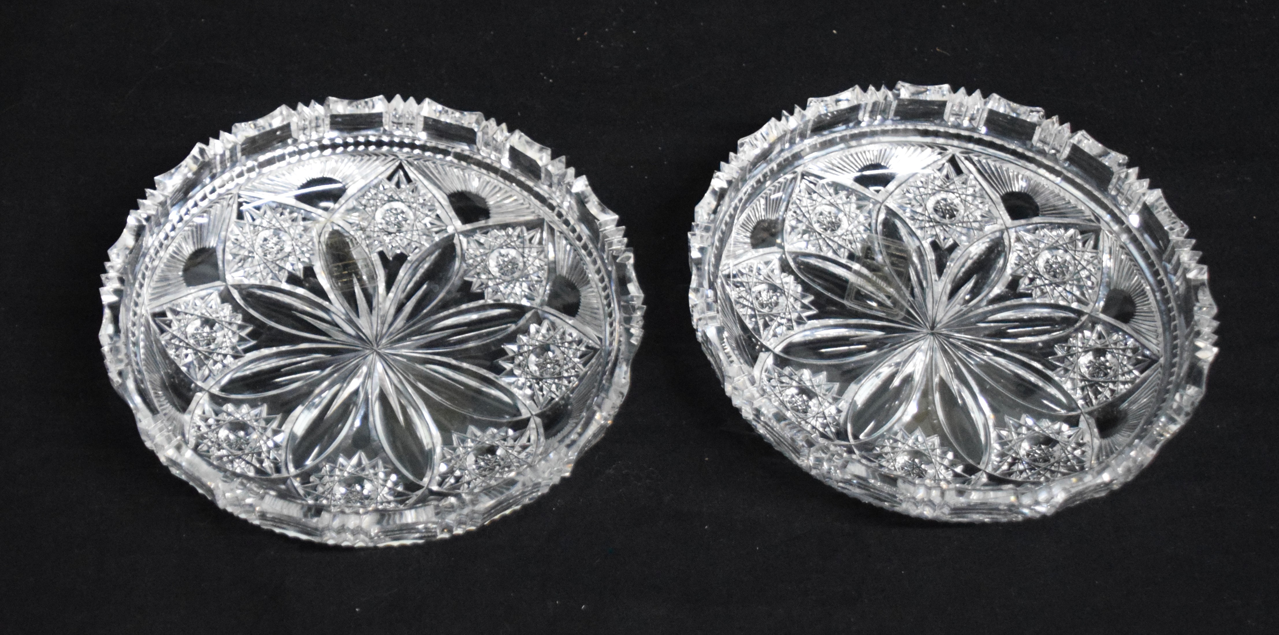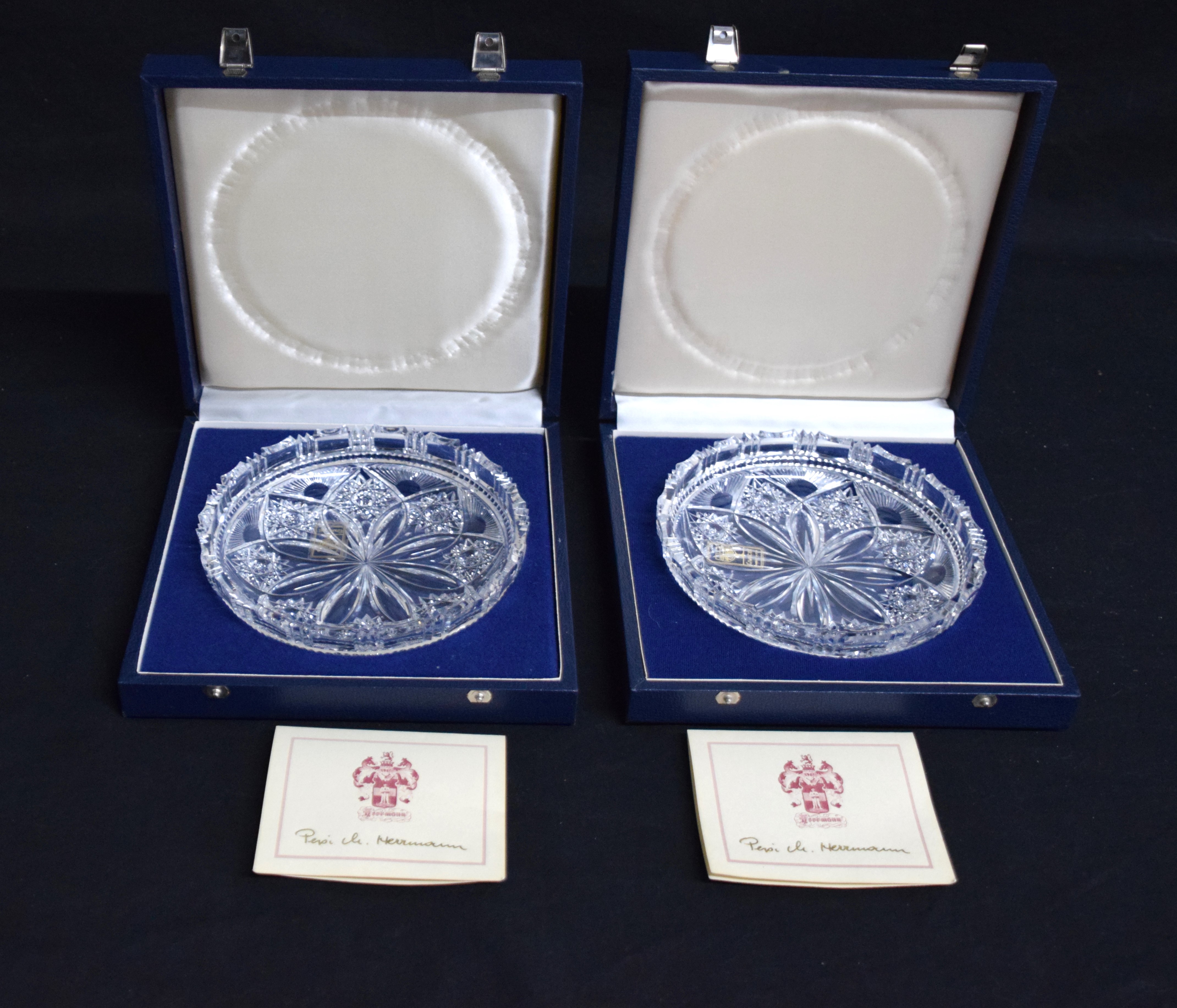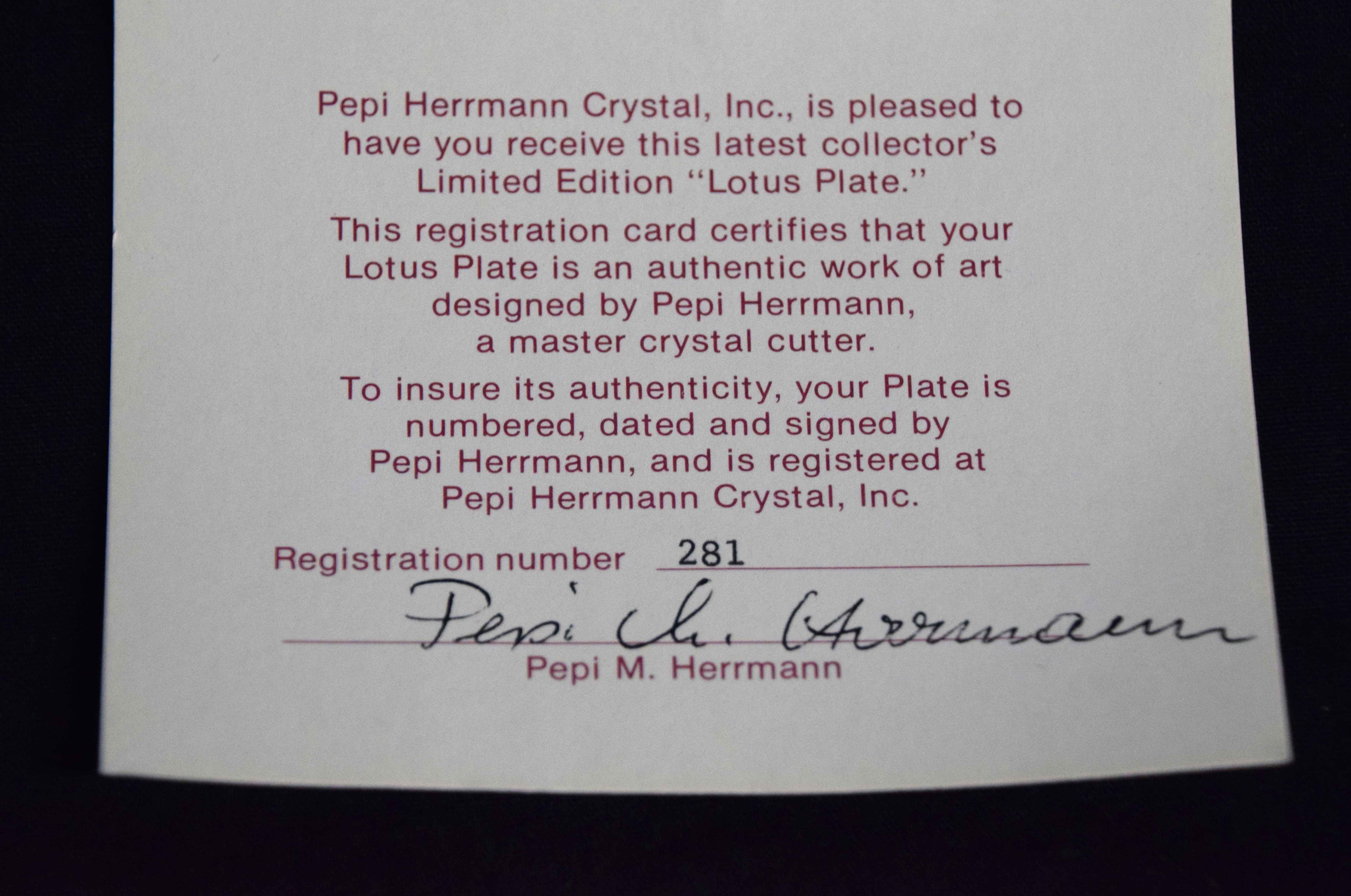 Encased and signed, hand cut crystal Lotus plates by Pepi Herrmann with certificates of authenticity (#281 and #542). Pepi was the master crystal cutter from NH who sold to Presidents and Hollywood stars. Dimensions: 6.25″ Diameter