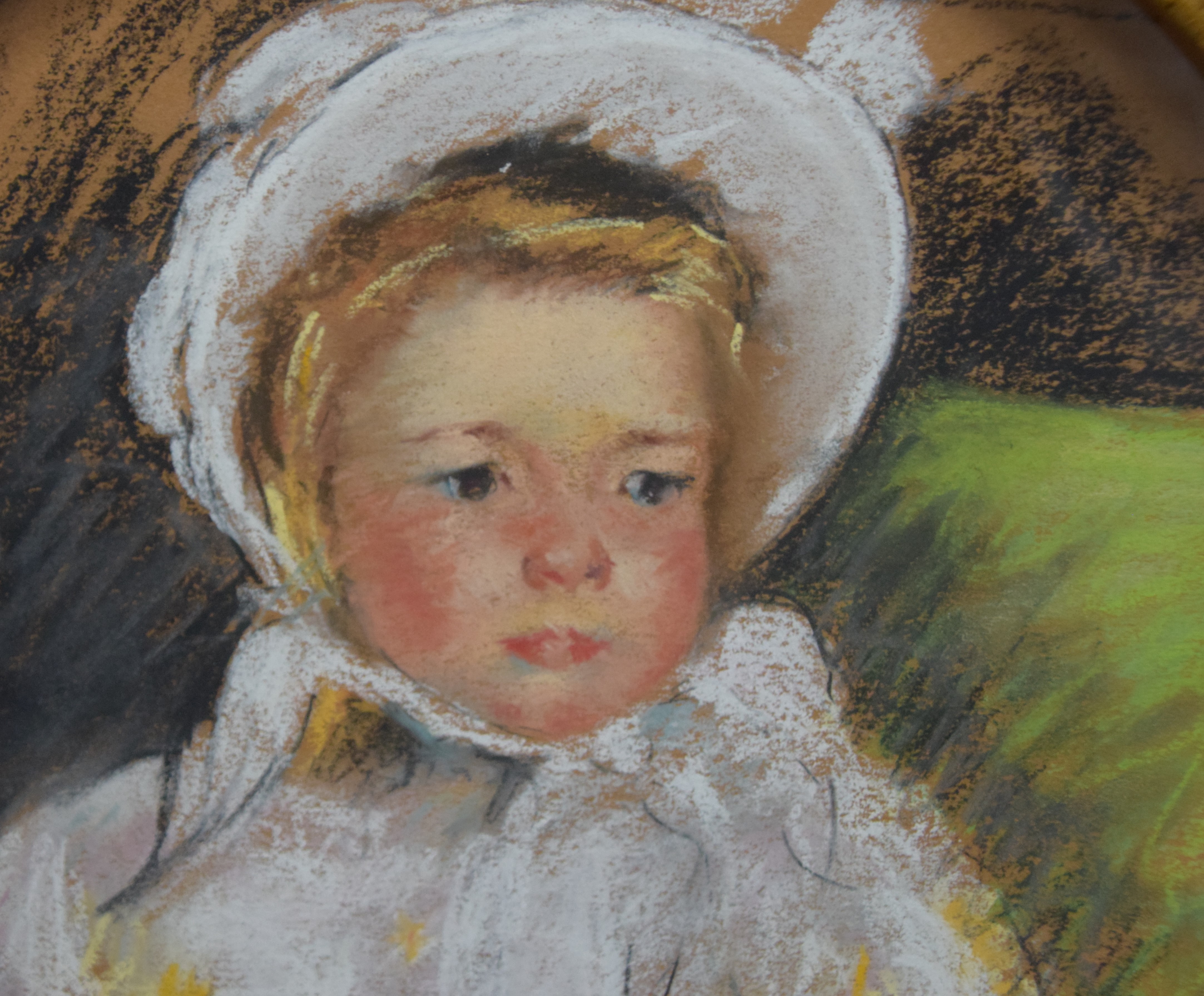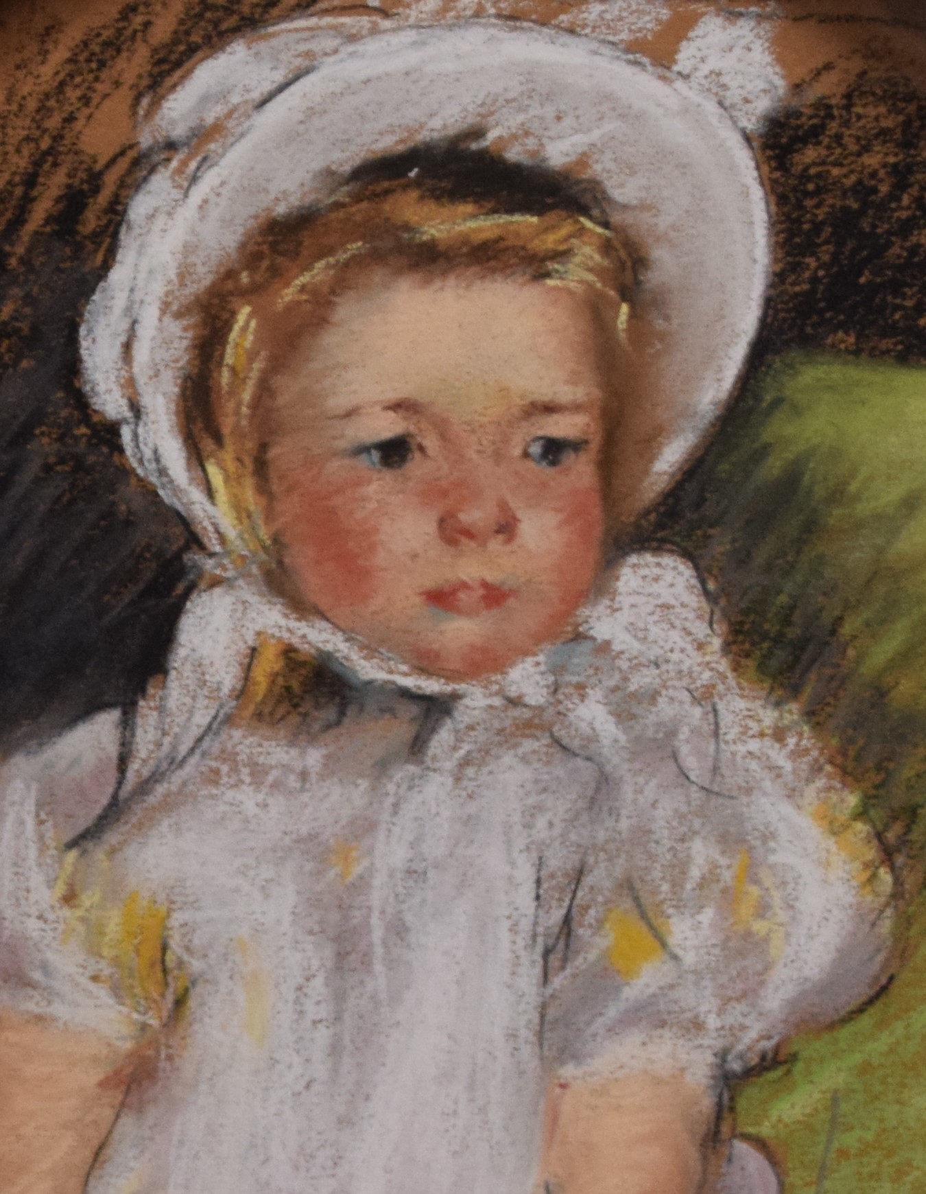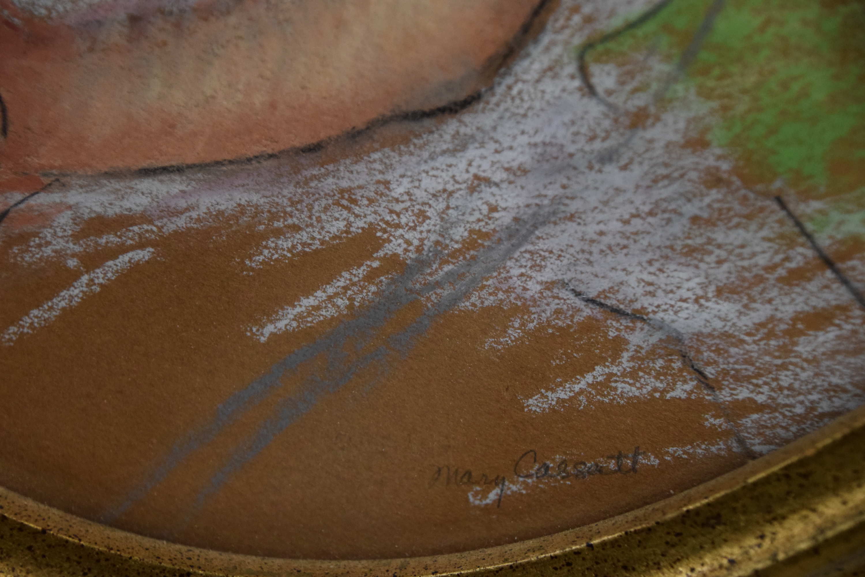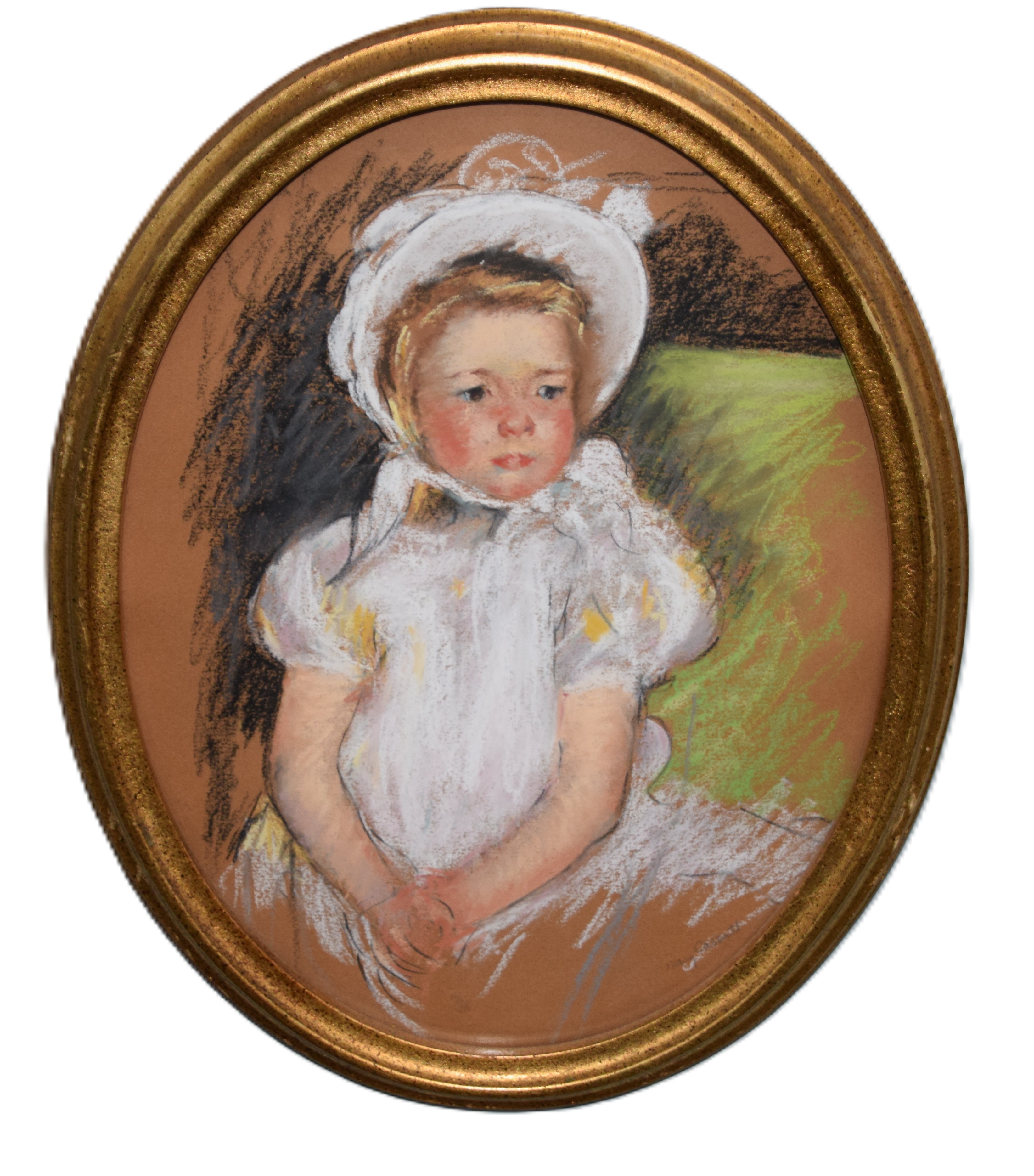 An oval framed pastel on brown paper of a young girl with white dress and hat. Signed Mary Cassatt on lower left. Impressionist painter Mary Cassatt (1844-1926) is best known for her mother and child compositions of which this is one. Dimensions: 13″ x 10.5″ Oval