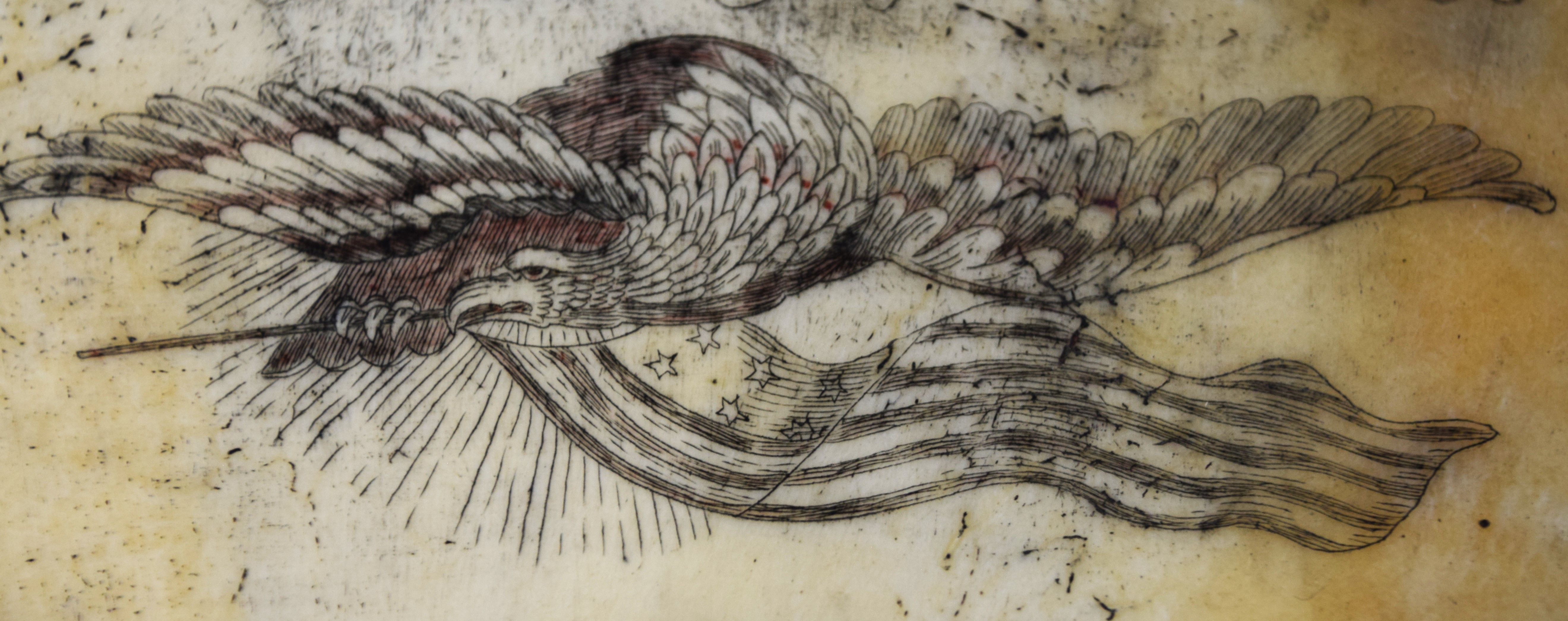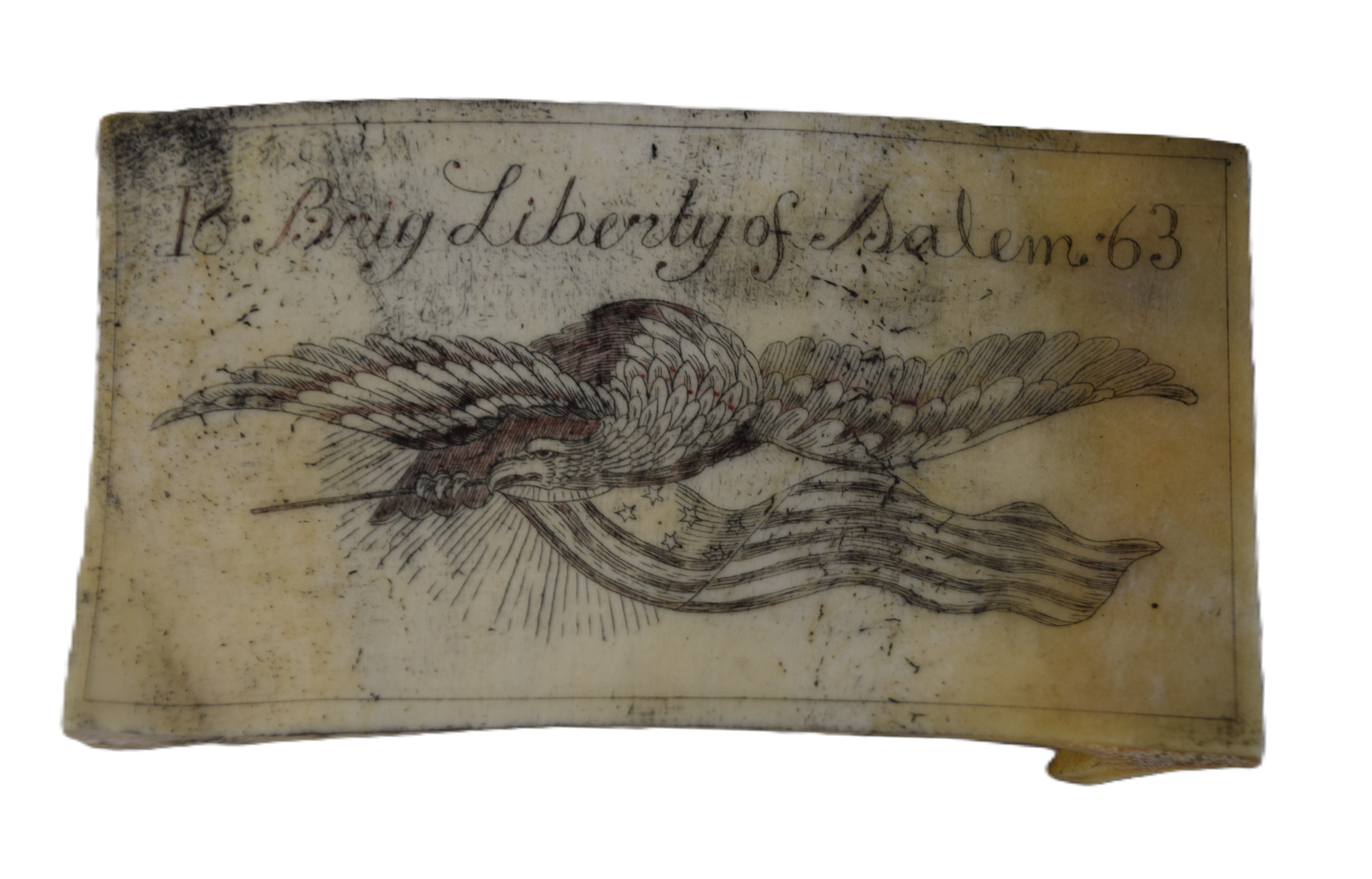 An 1863 Scrimshaw Eagle associated with the Brig Liberty from Salem Massachusetts. The Brig was most likely a privateer in the civil war, not a registered union ship. The piece almost looks like it was designed to be a belt buckle. Dimensions: 2.5″ H x 4.5″ L