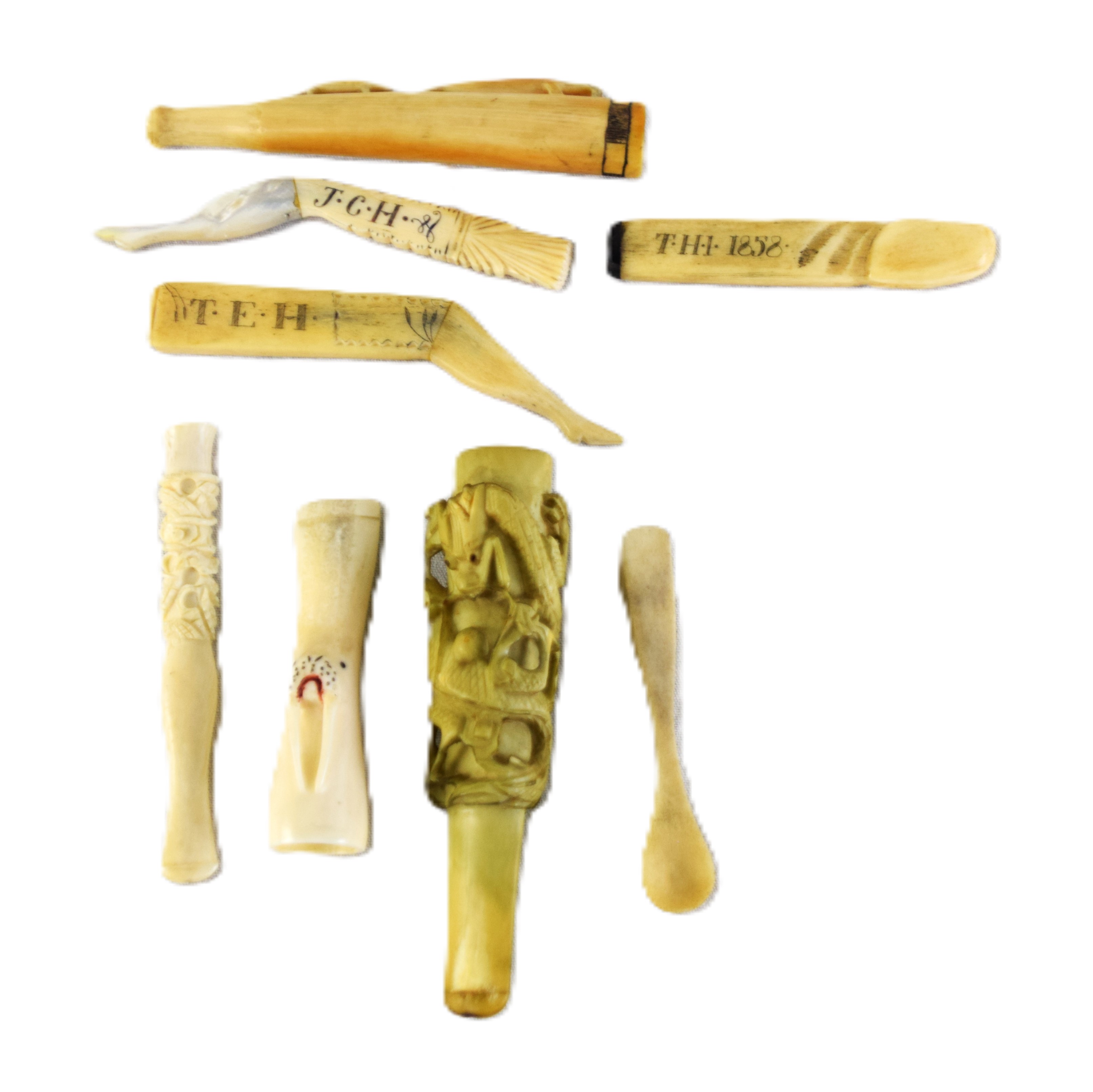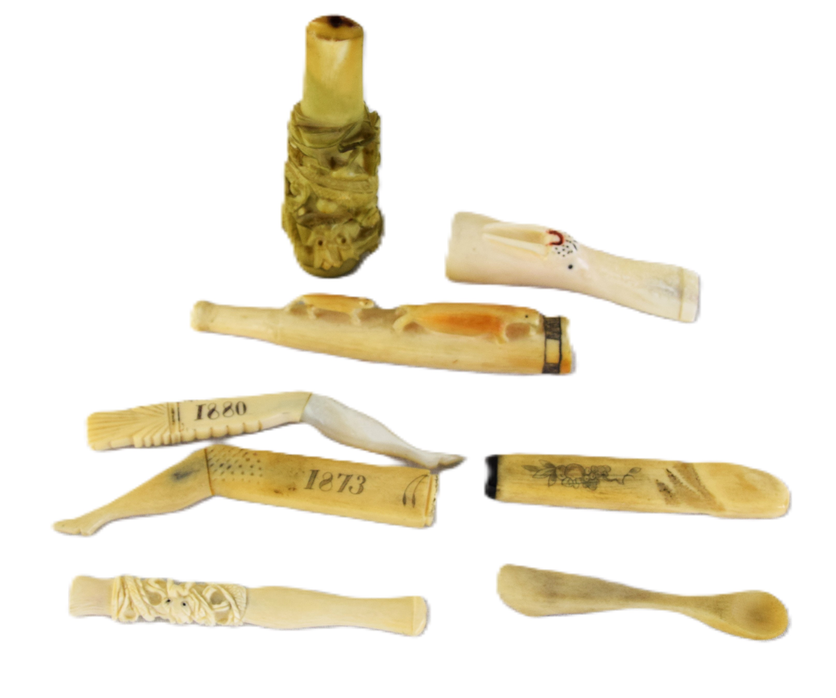 Circa 1850-1880s whalebone lot of seven smoking devices to include four cigarette/cigar holders and four other devices. Dimensions: 3″ to 4″ L