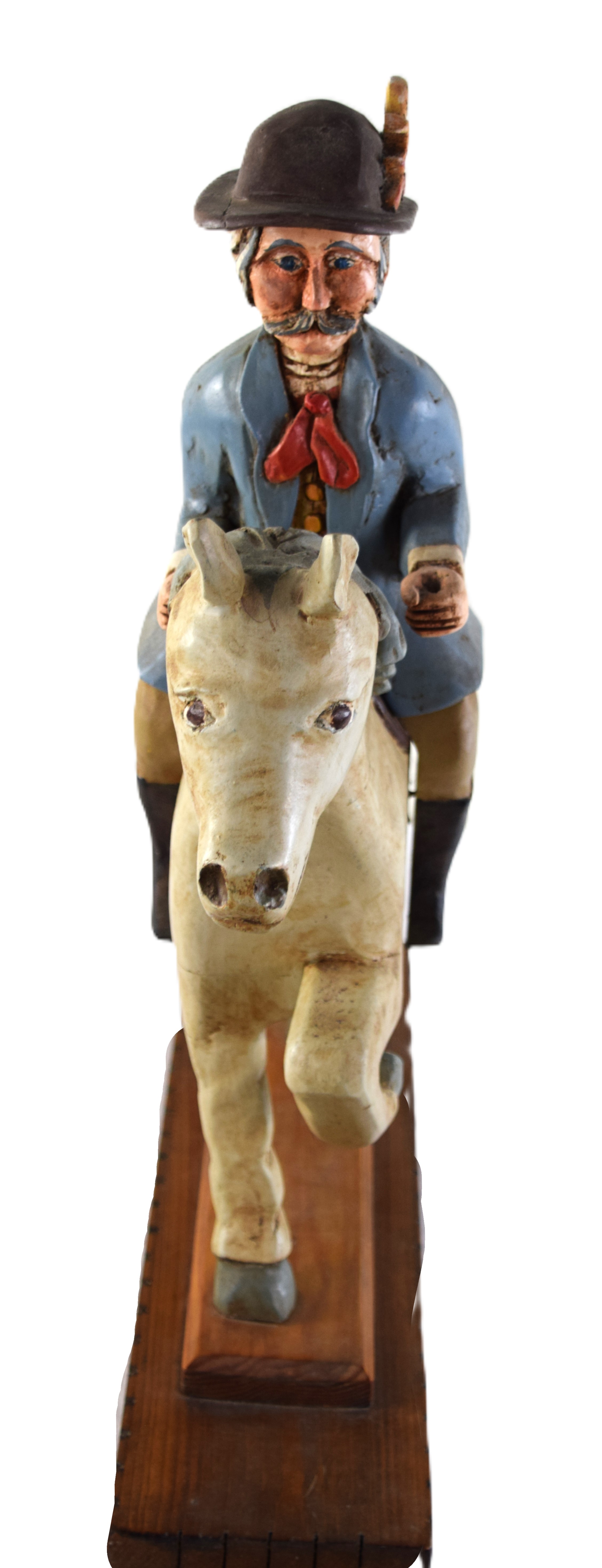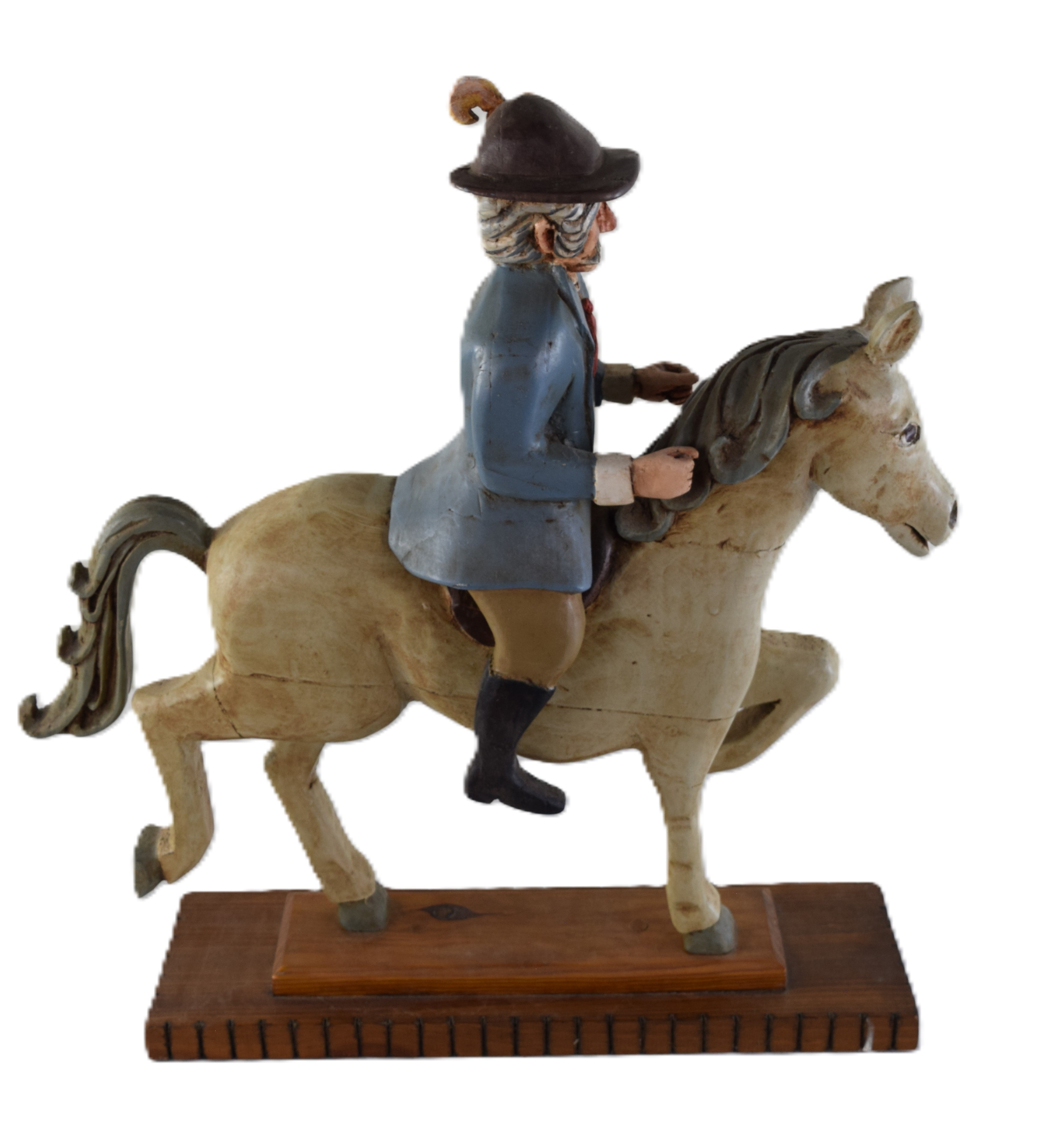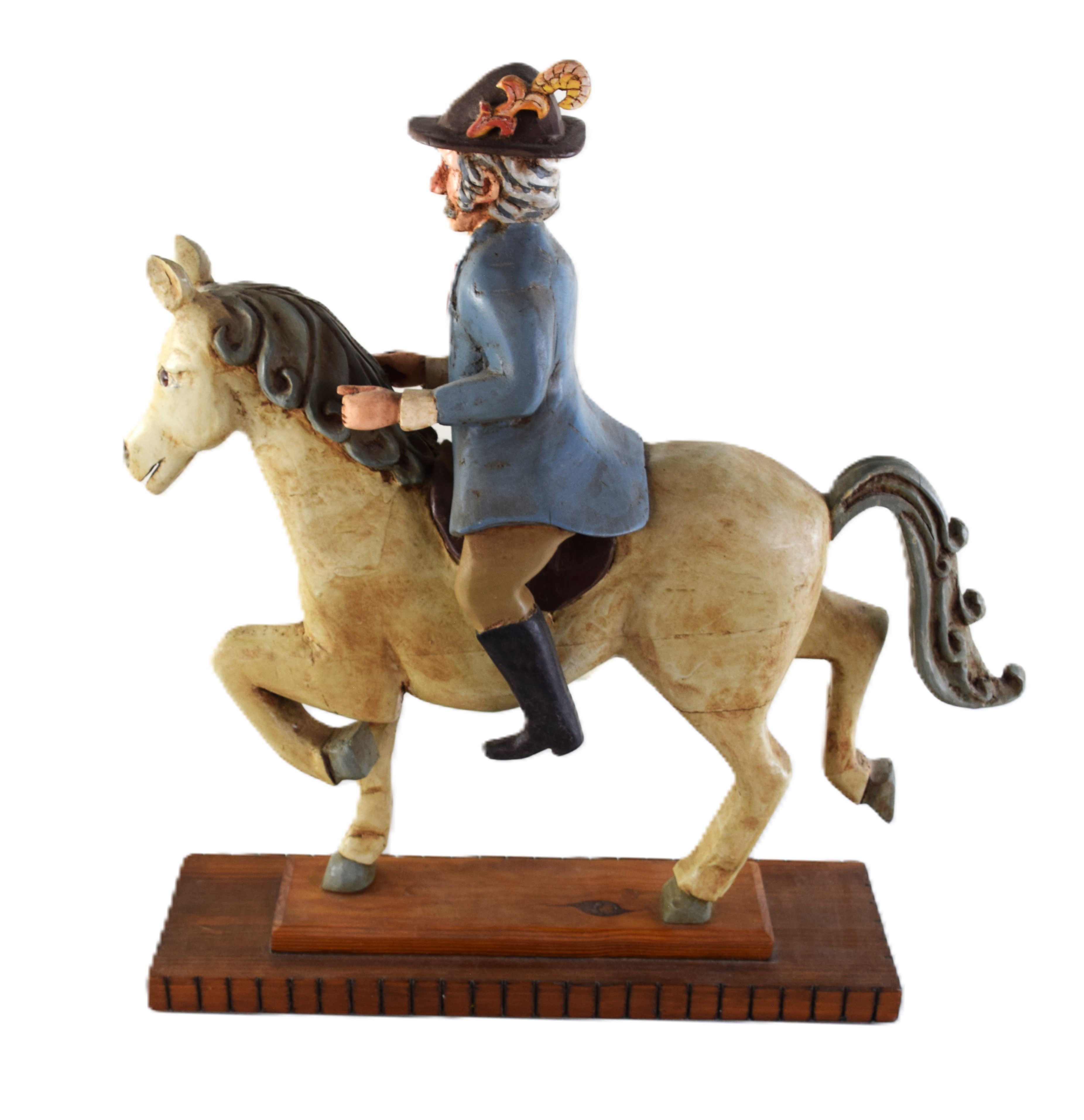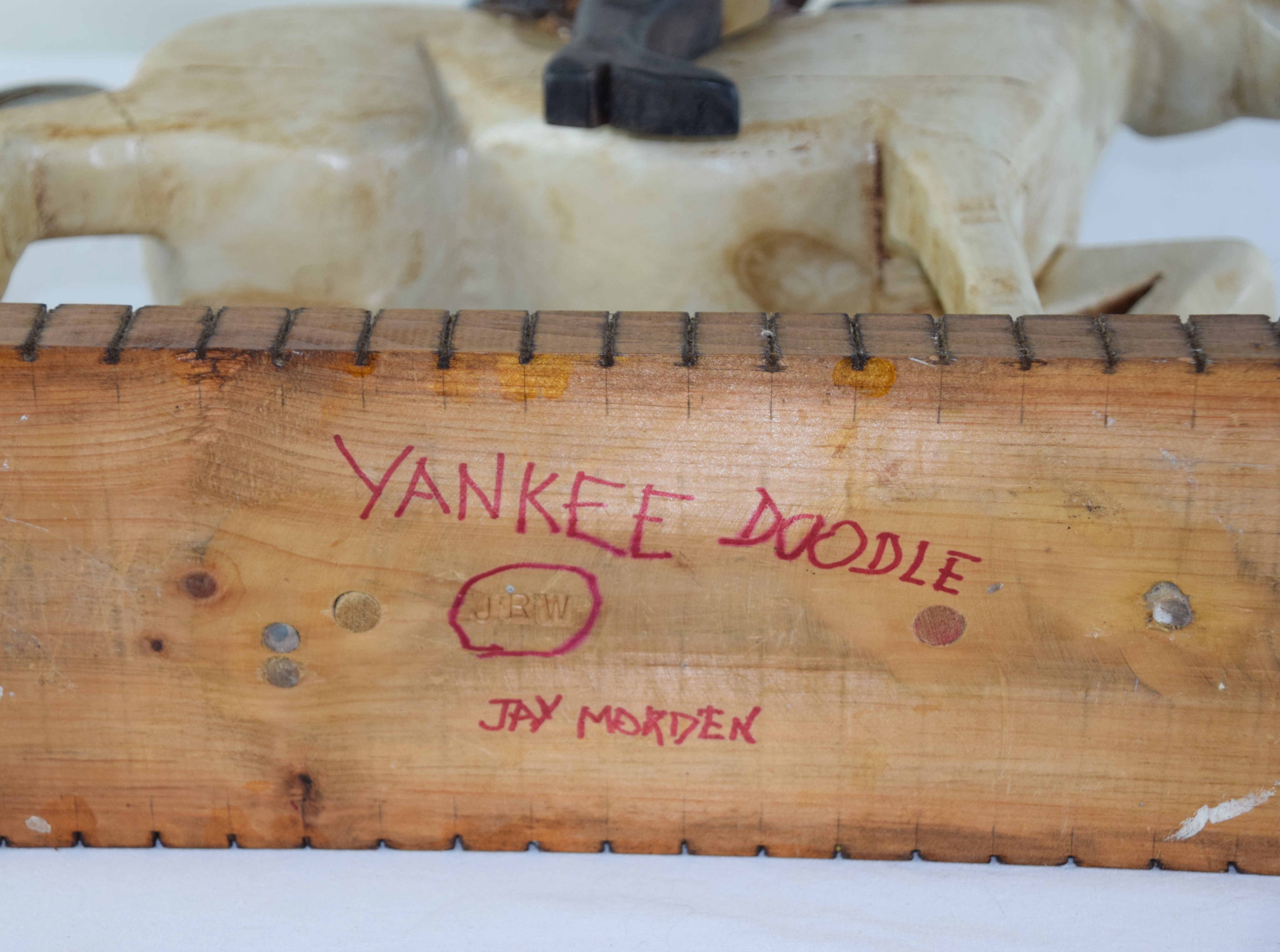 Mid 20th century Folk Art of a white horse with ridder wearing a long coat and hat on a wood base, crafted by John R. Walker of New Boston, NH and owned by J. Marden of New Boston. Labelled “Yankee Doodle”. Dimensions: 23″ H x 18.5″ L x 5.5″ Width