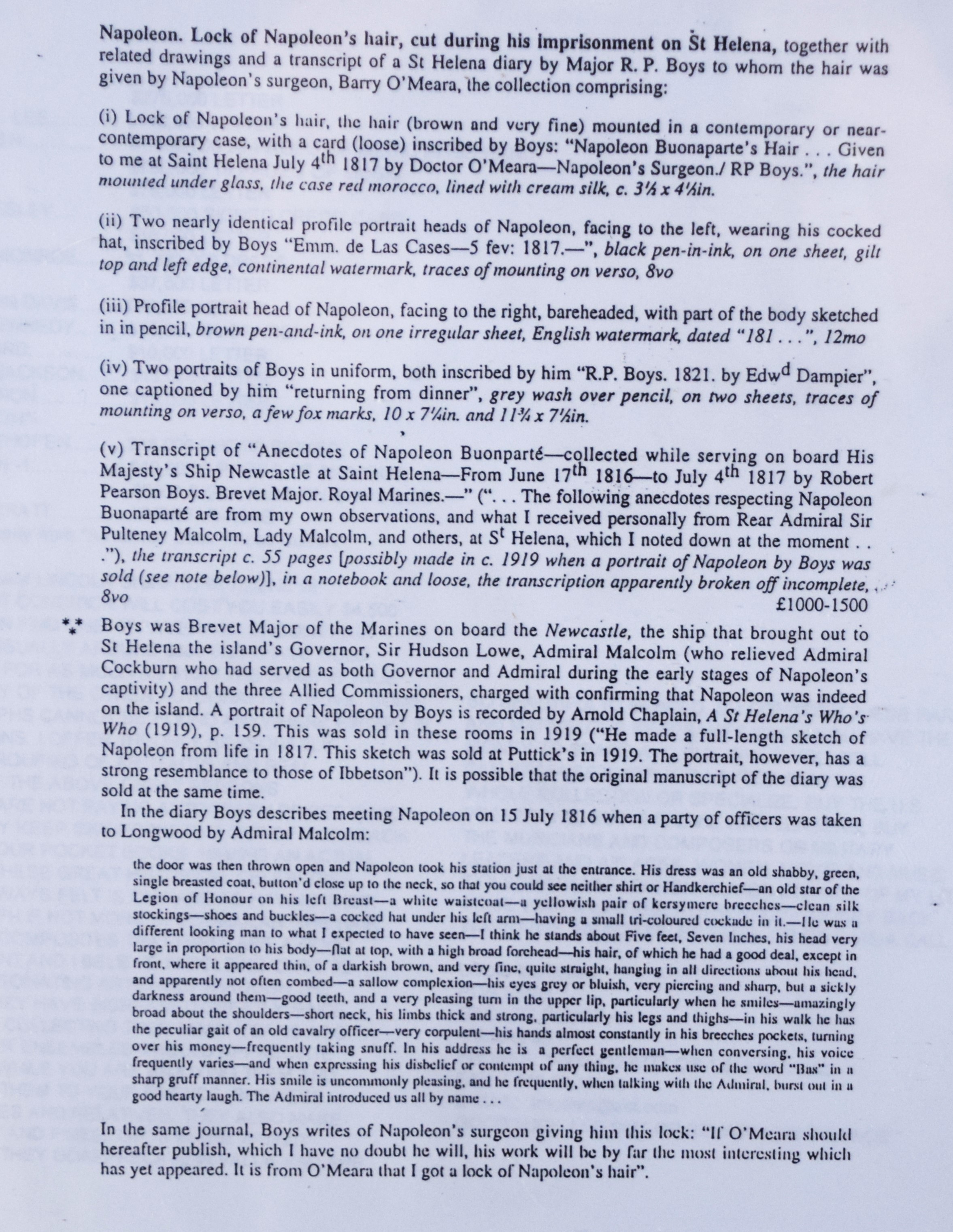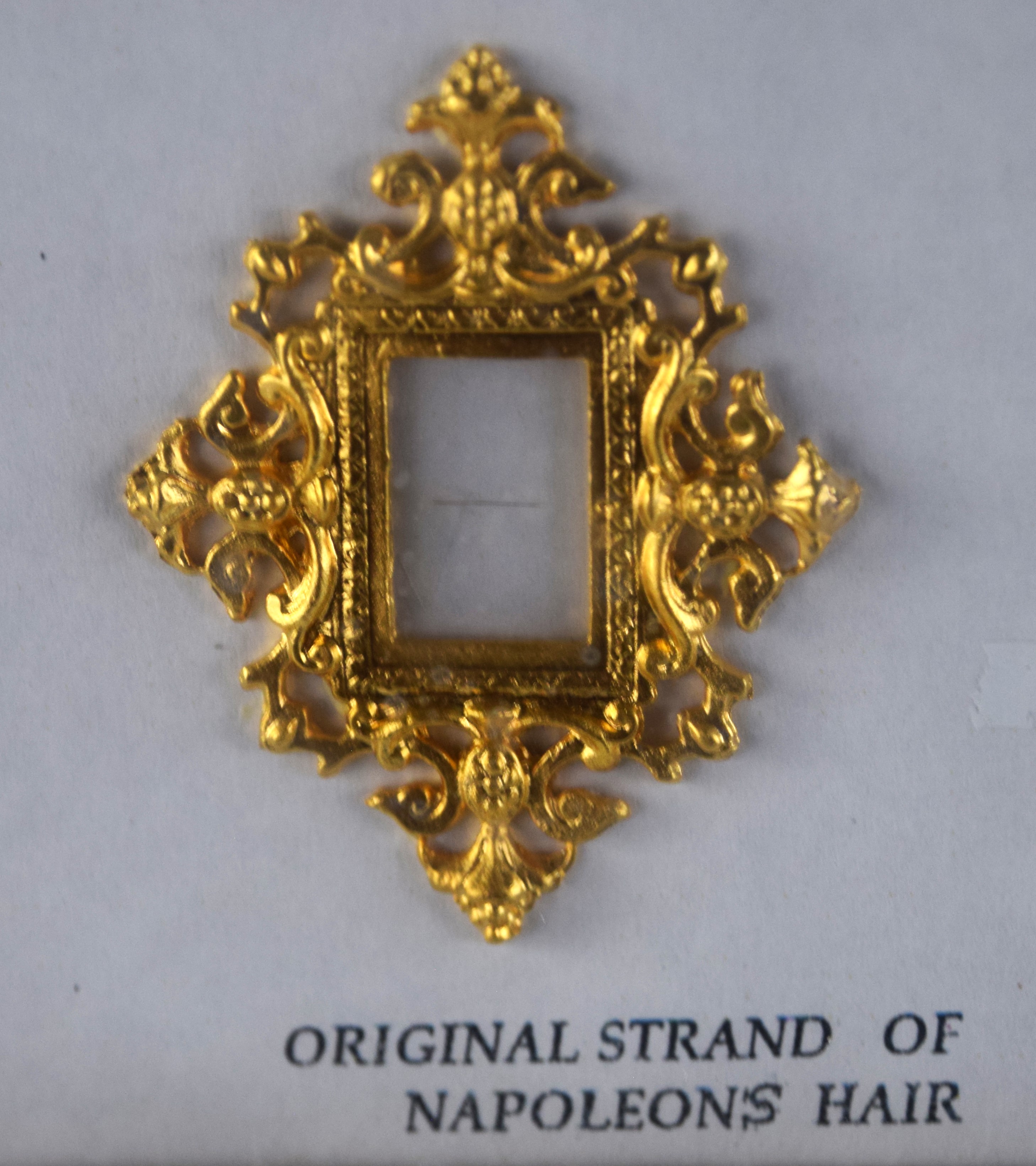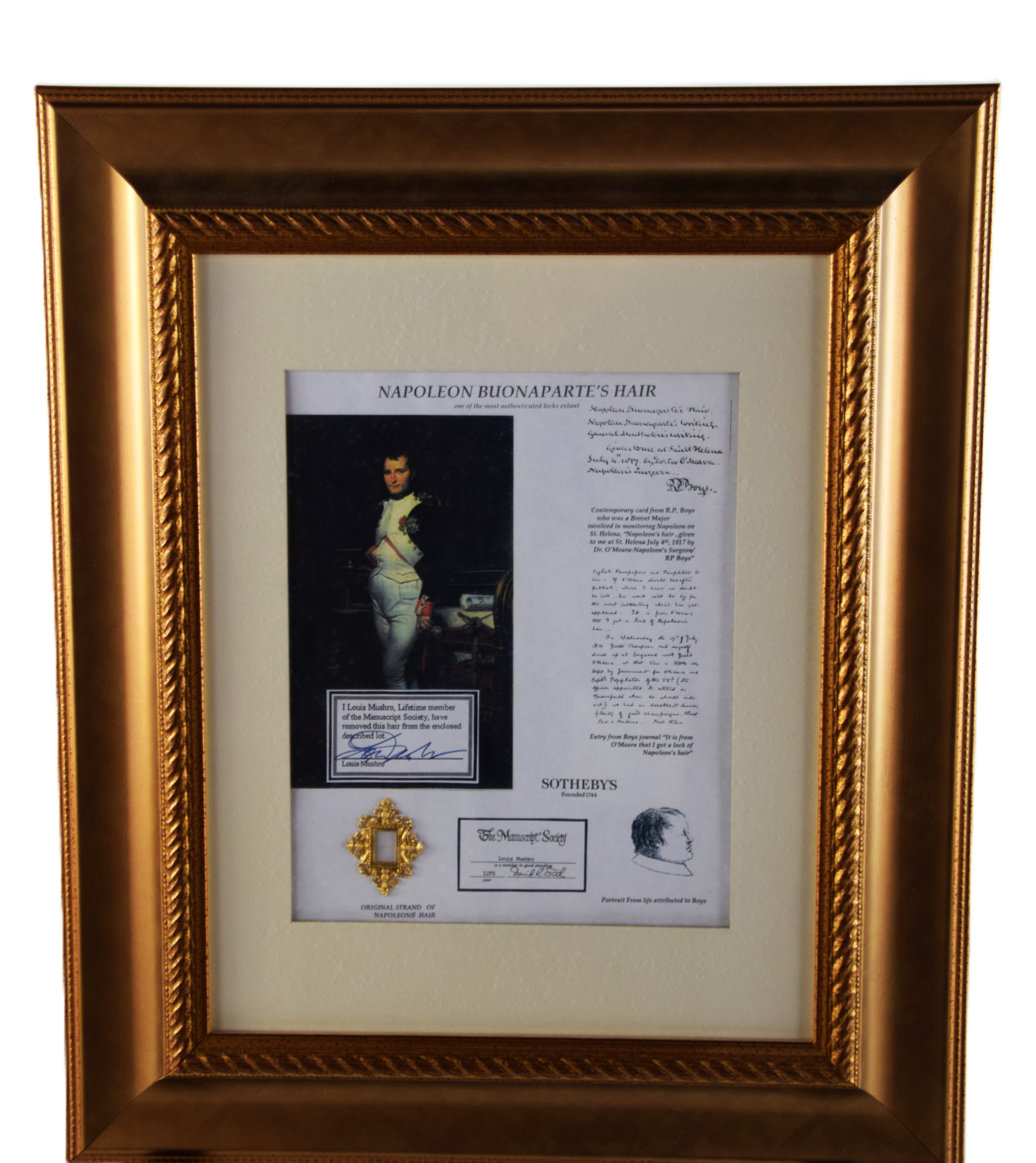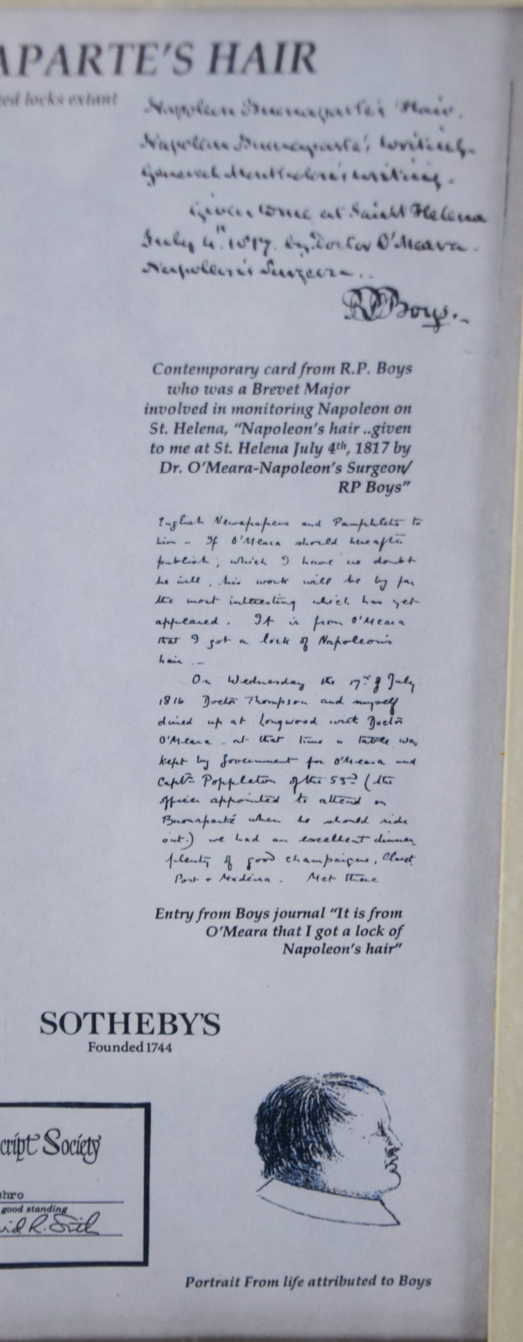 Framed Napoleon Bonaparte’s hair, cut during his imprisonment on St. Helena and given by Napoleon’s surgeon to British Major R. P. Boys, who was monitoring Napoleon at St. Helena. Dimensions: 9.5″ x 7.5″ Image size, 19″ x 16″ Overall