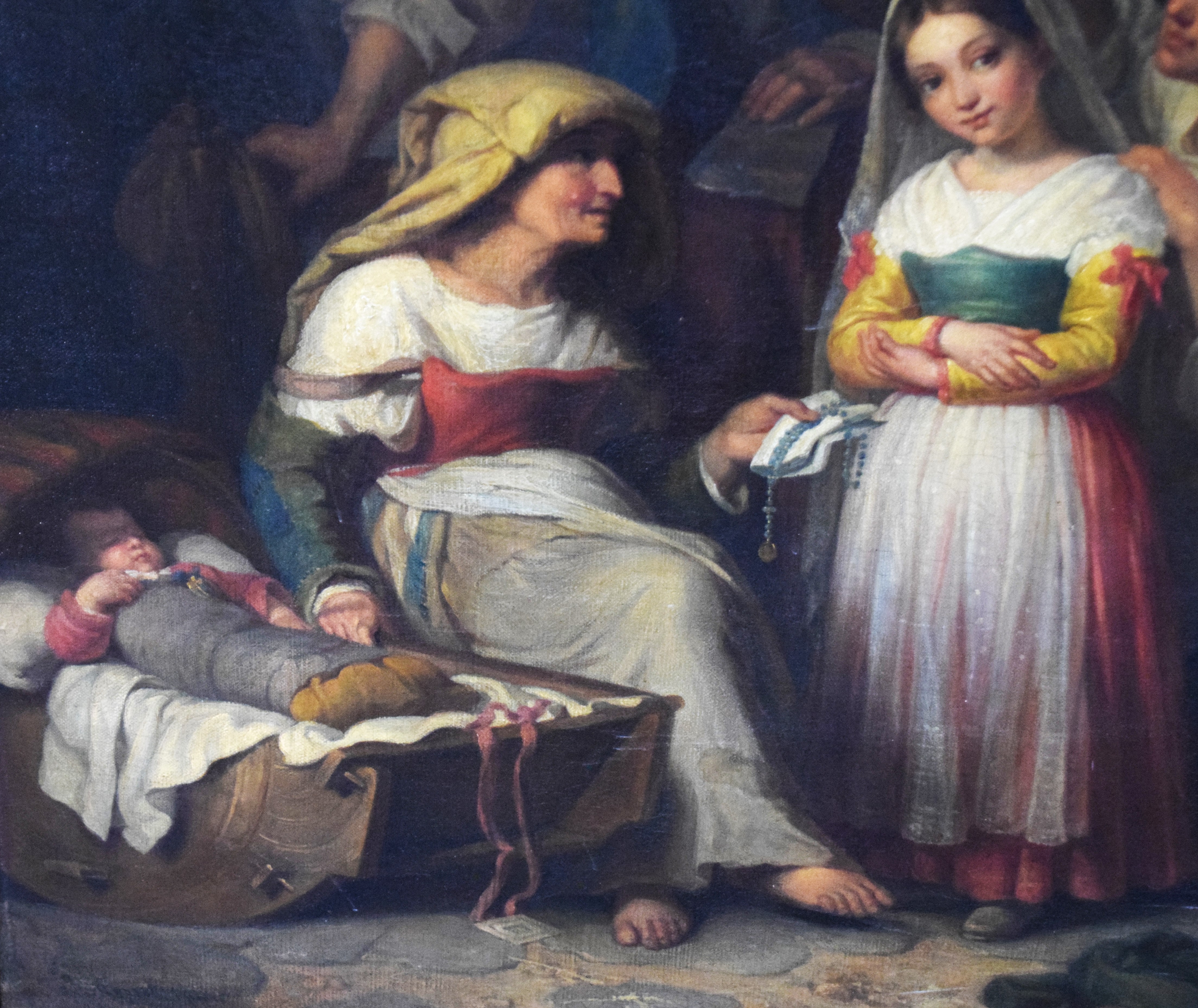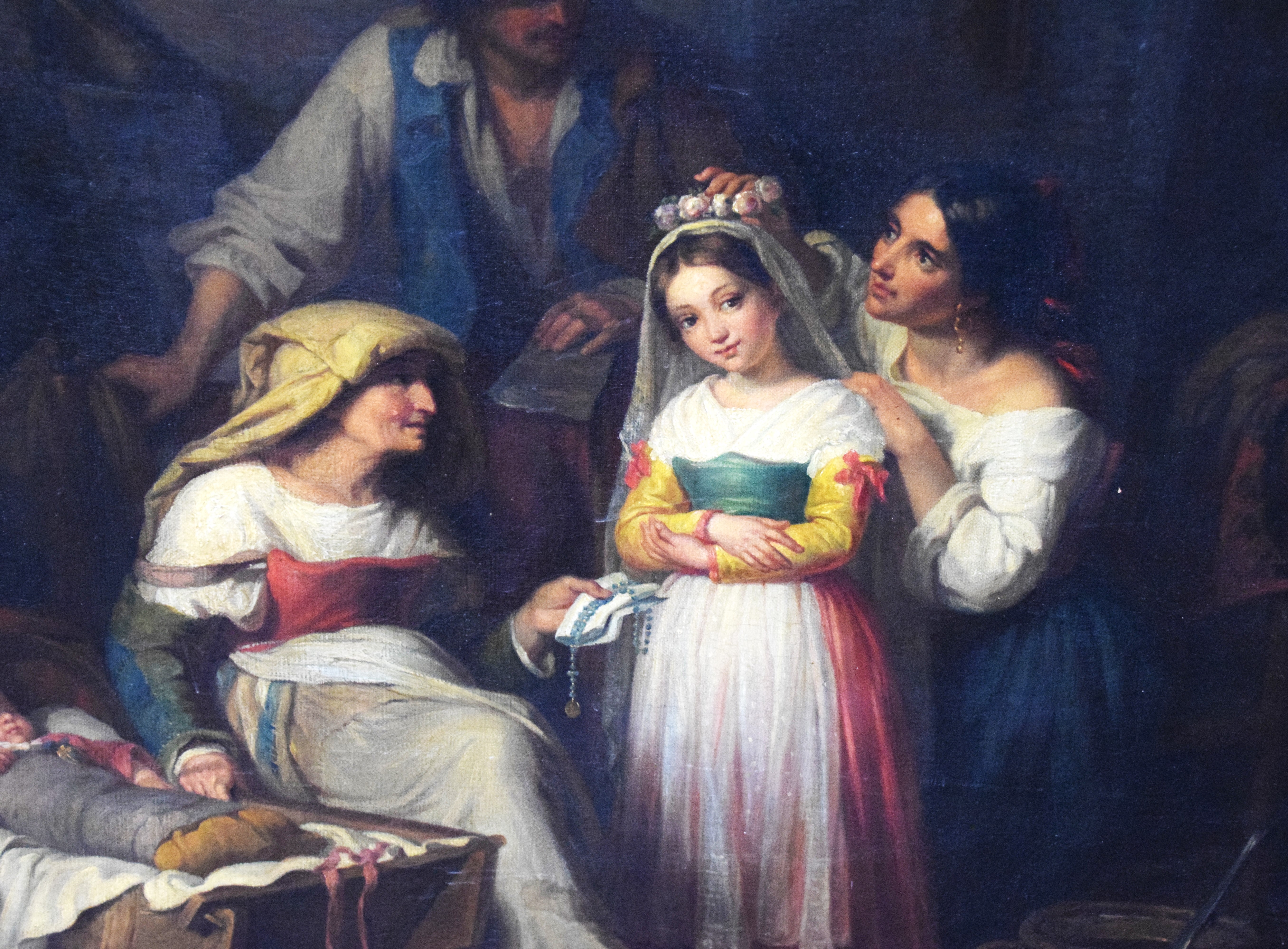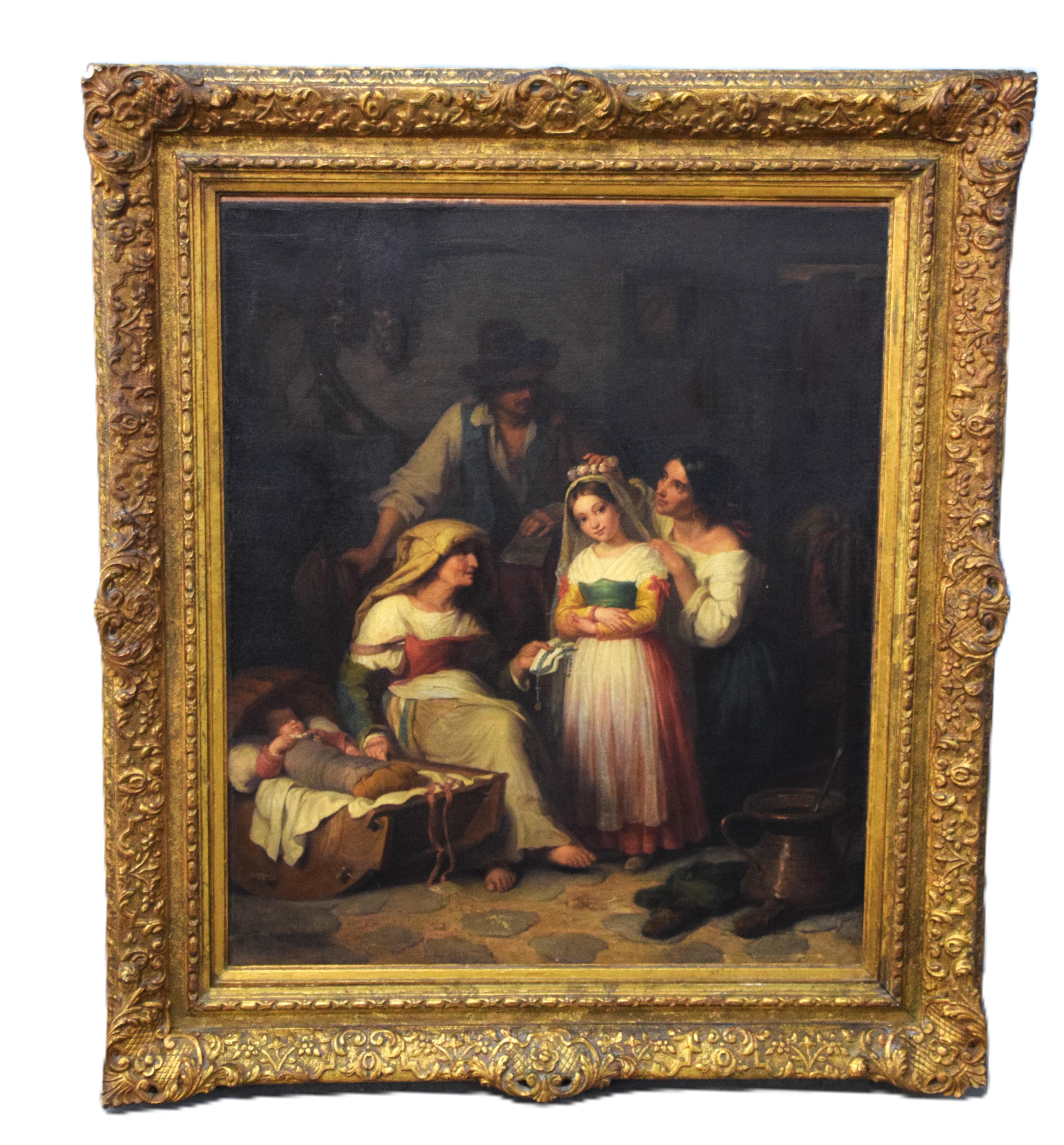 An oil on canvas of a family including a grandmother giving a rosary to a granddaughter together with a father, mother and baby in crib. Giuseppe Mazzolini (1806 – 1876) worked in Italy and is known for Portrait and Old Master copy painting. Dimensions: 30″ x 24″ Image size
