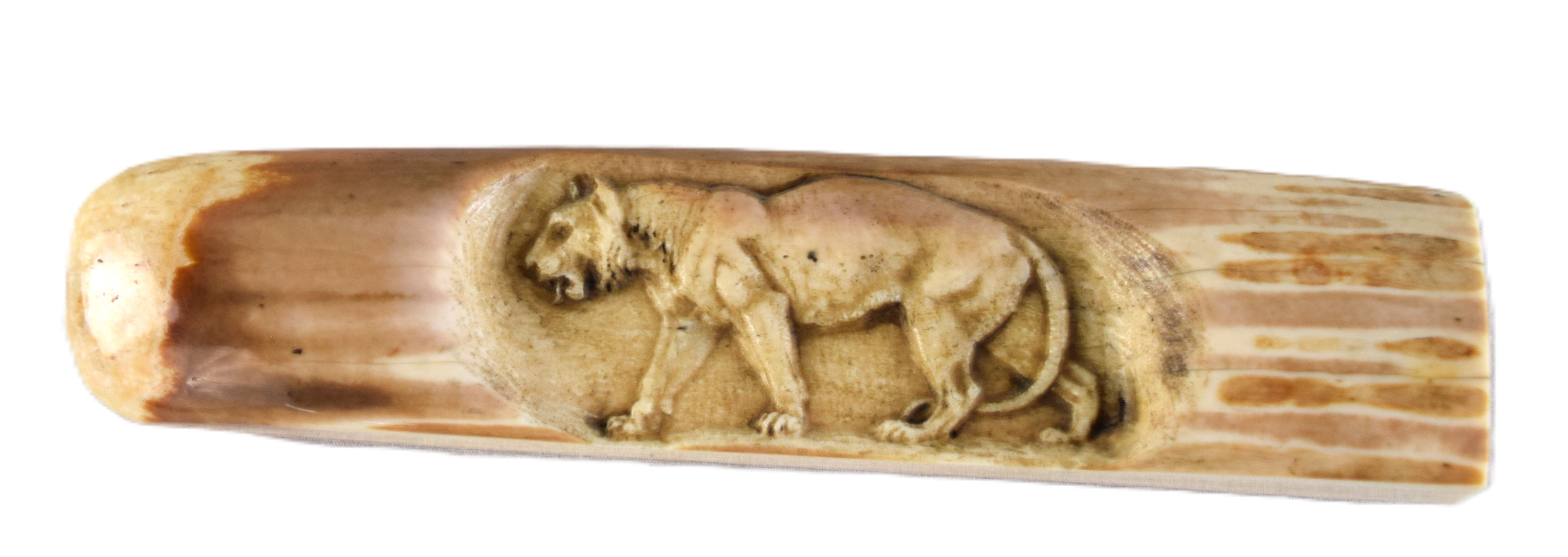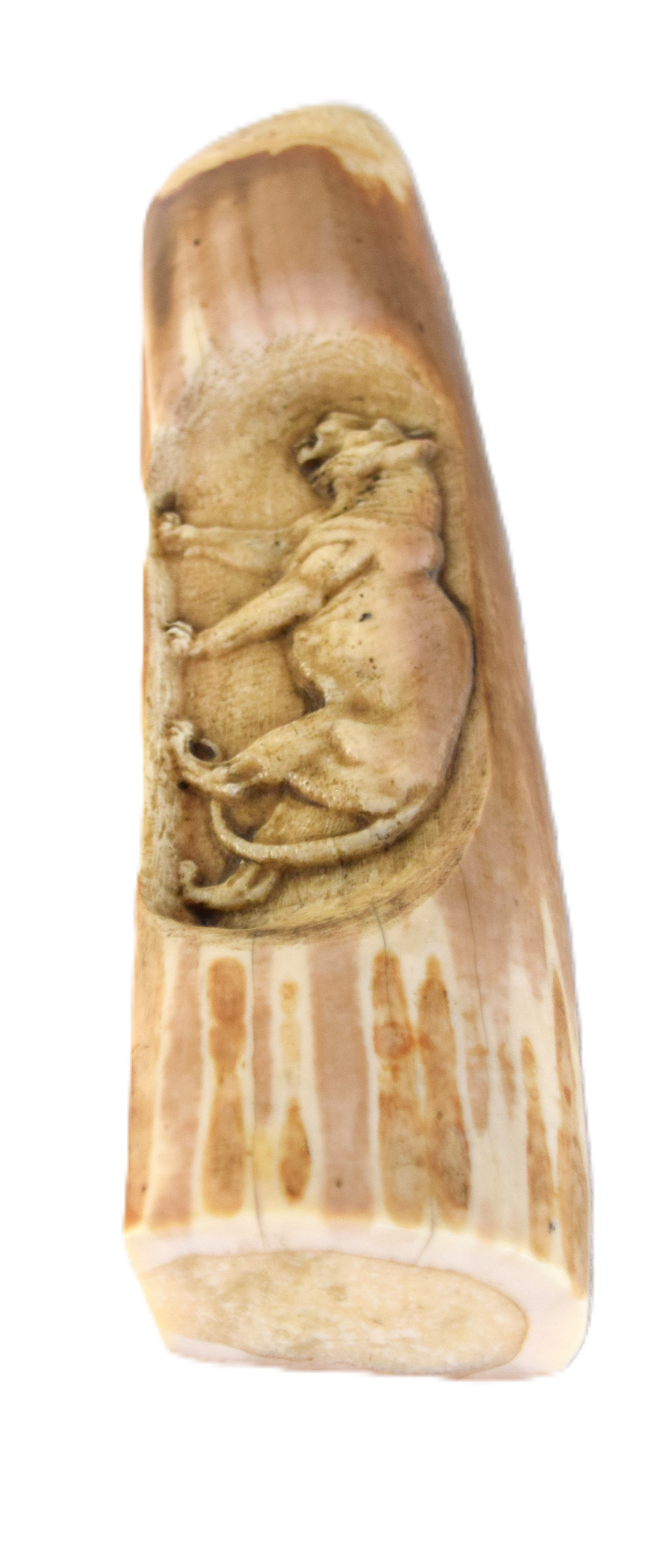 Petrified wood with a carved saber tooth tiger. Dimensions: 10.5″ L