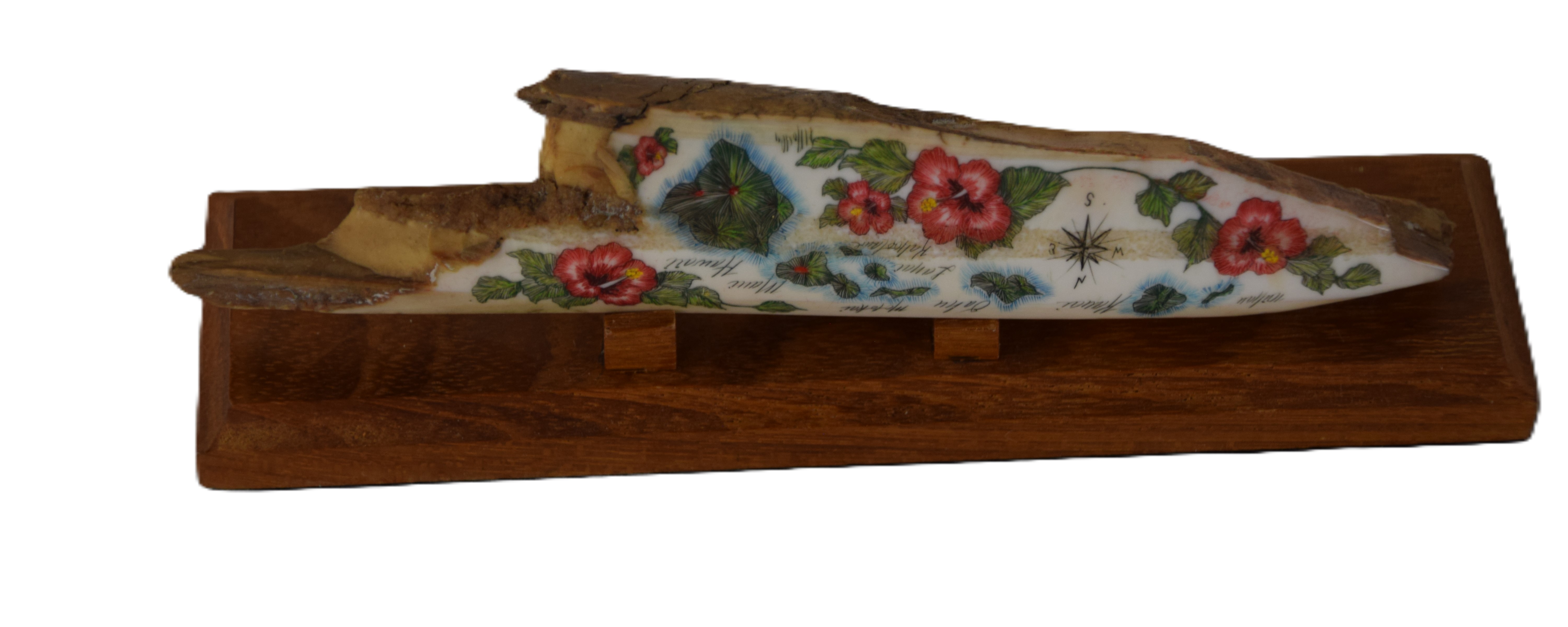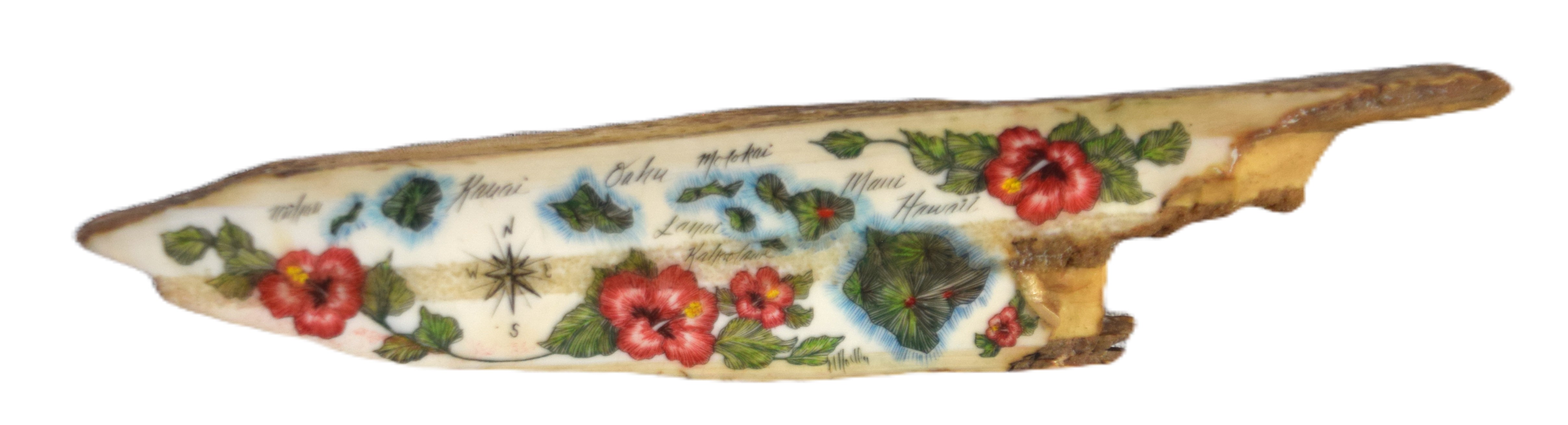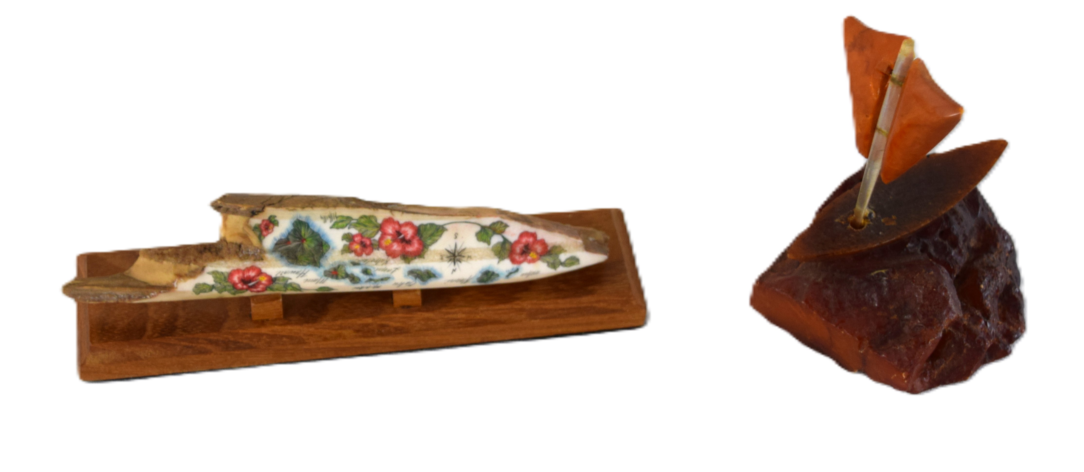 Rare walrus bone fragment with the state on Hawaii with all the Islands mapped along with rose decorations (5.5″ L). The amber is a sailboat with 2 amber sails and on an amber base (3.5″ H).