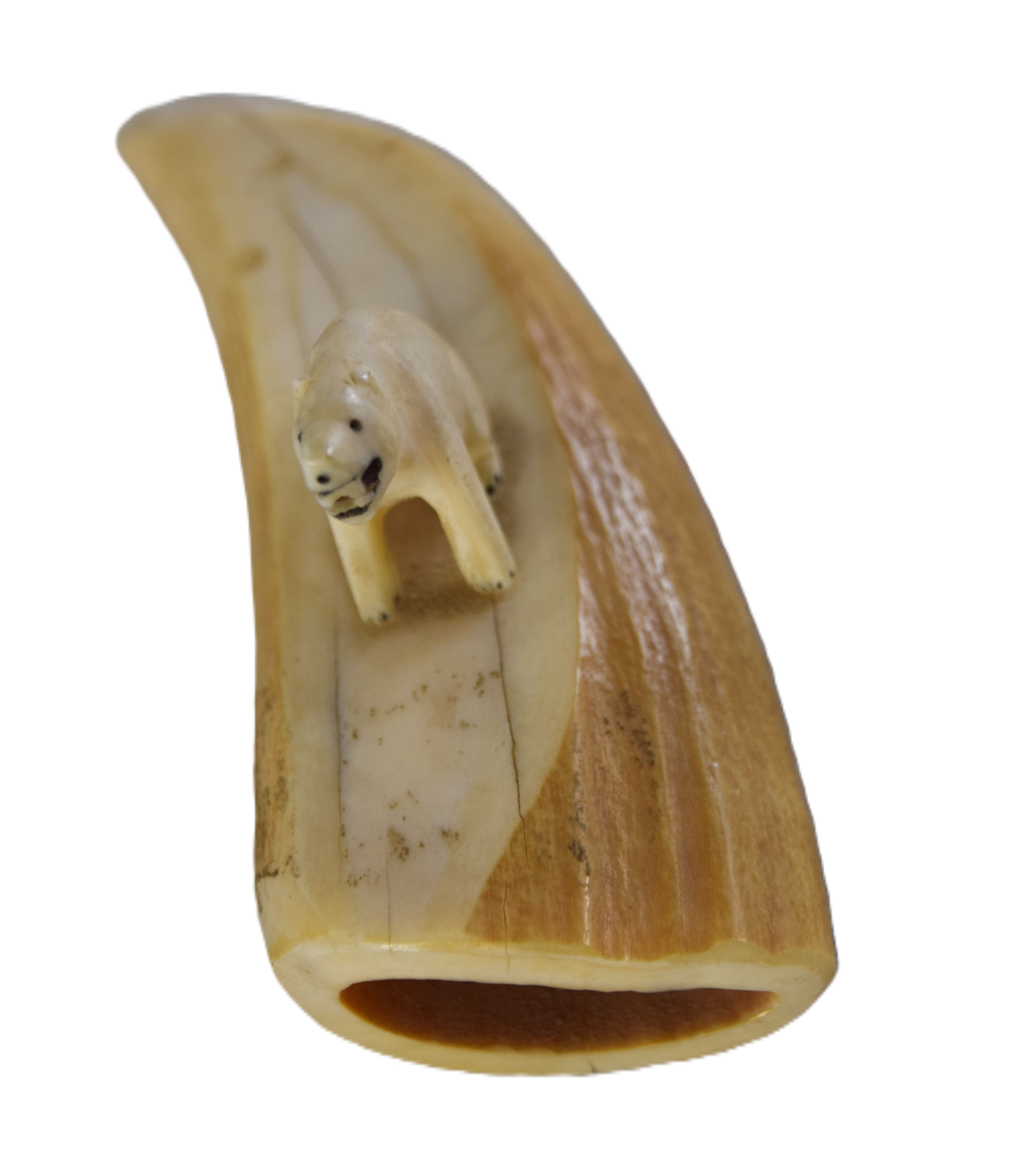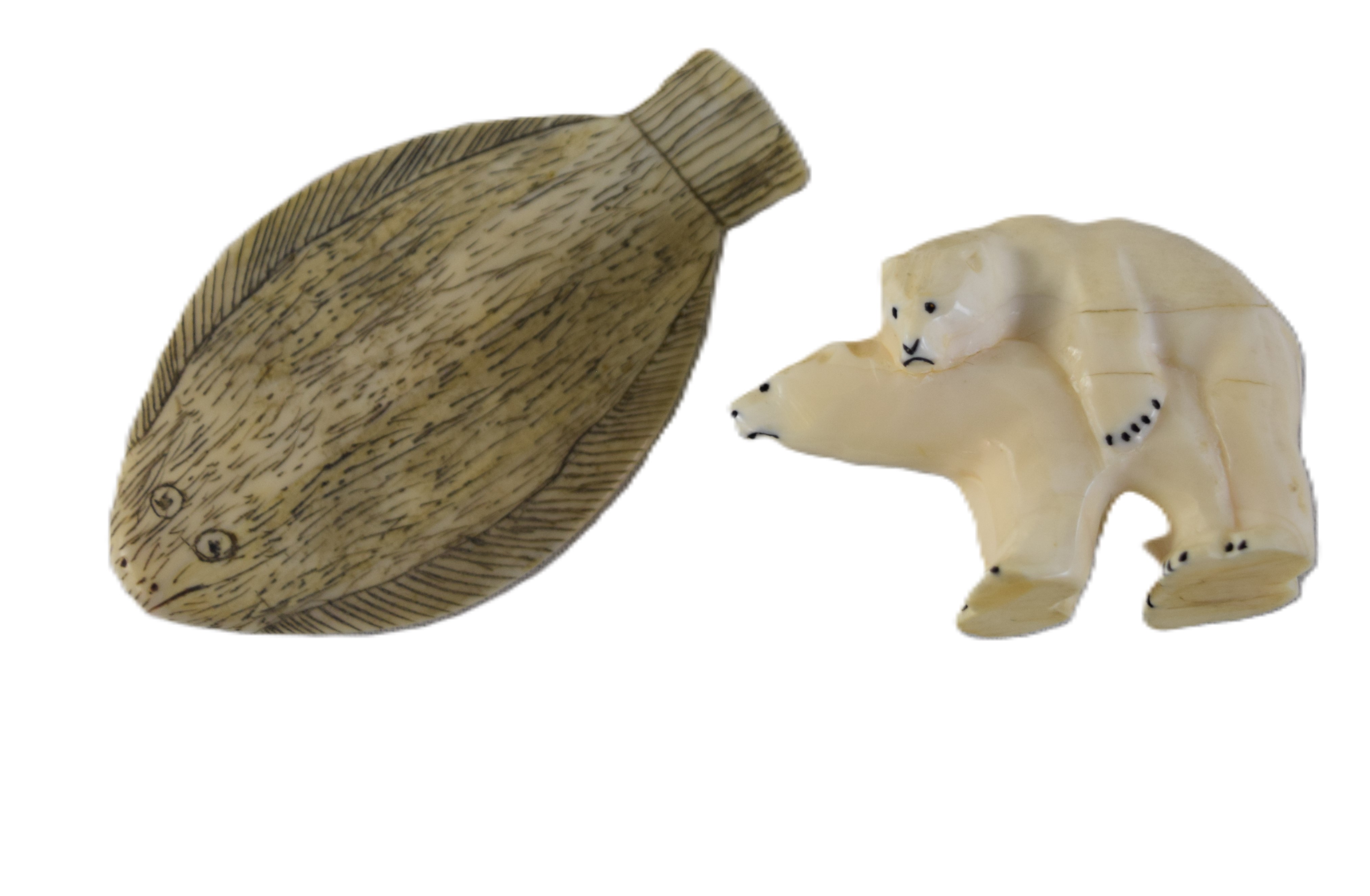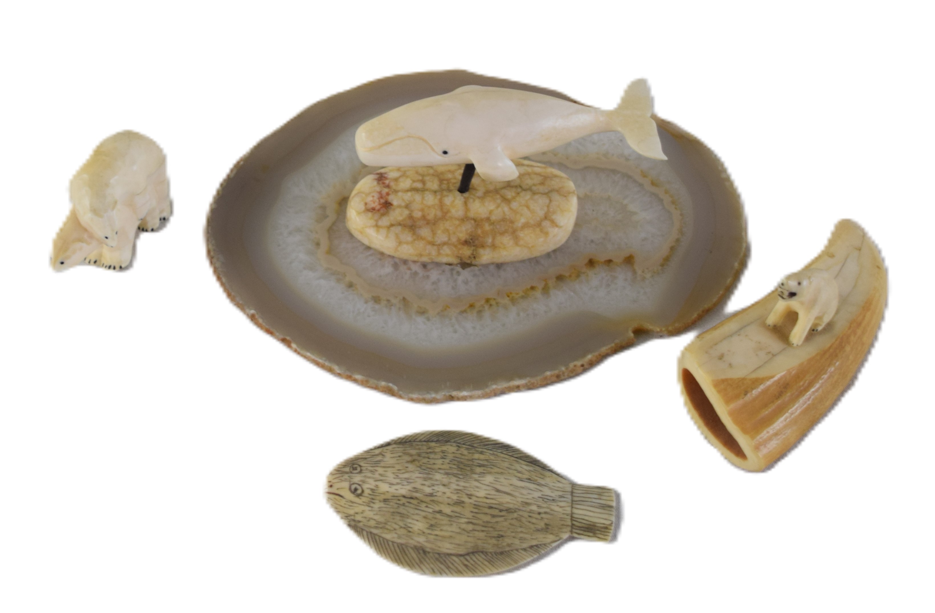 Four carved figures to include a polar bear on a tooth, a whale mounted on bone, a flounder and a polar bear accompanied by a stone platform. Dimensions: Range from 2.5″ to 4″ L