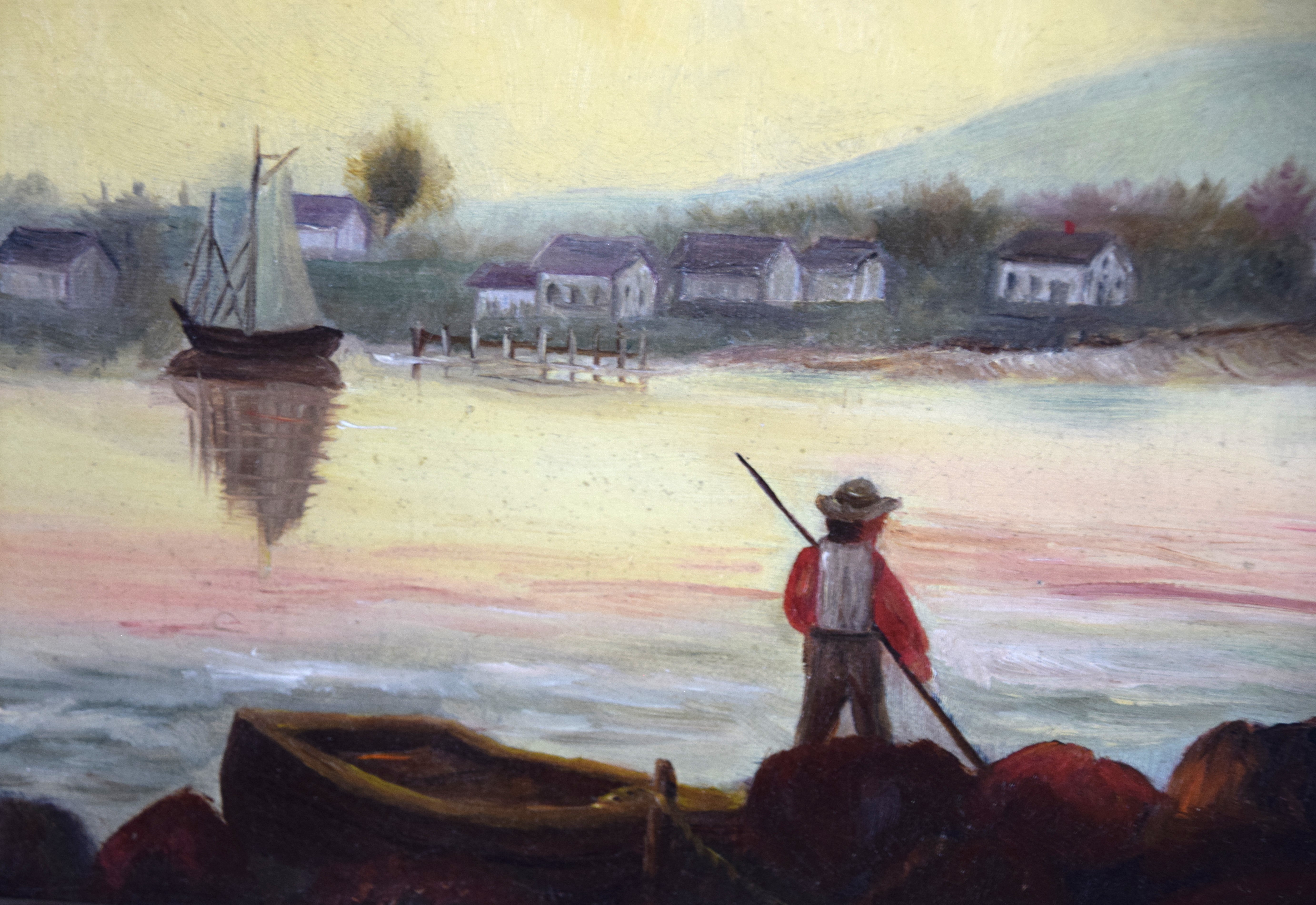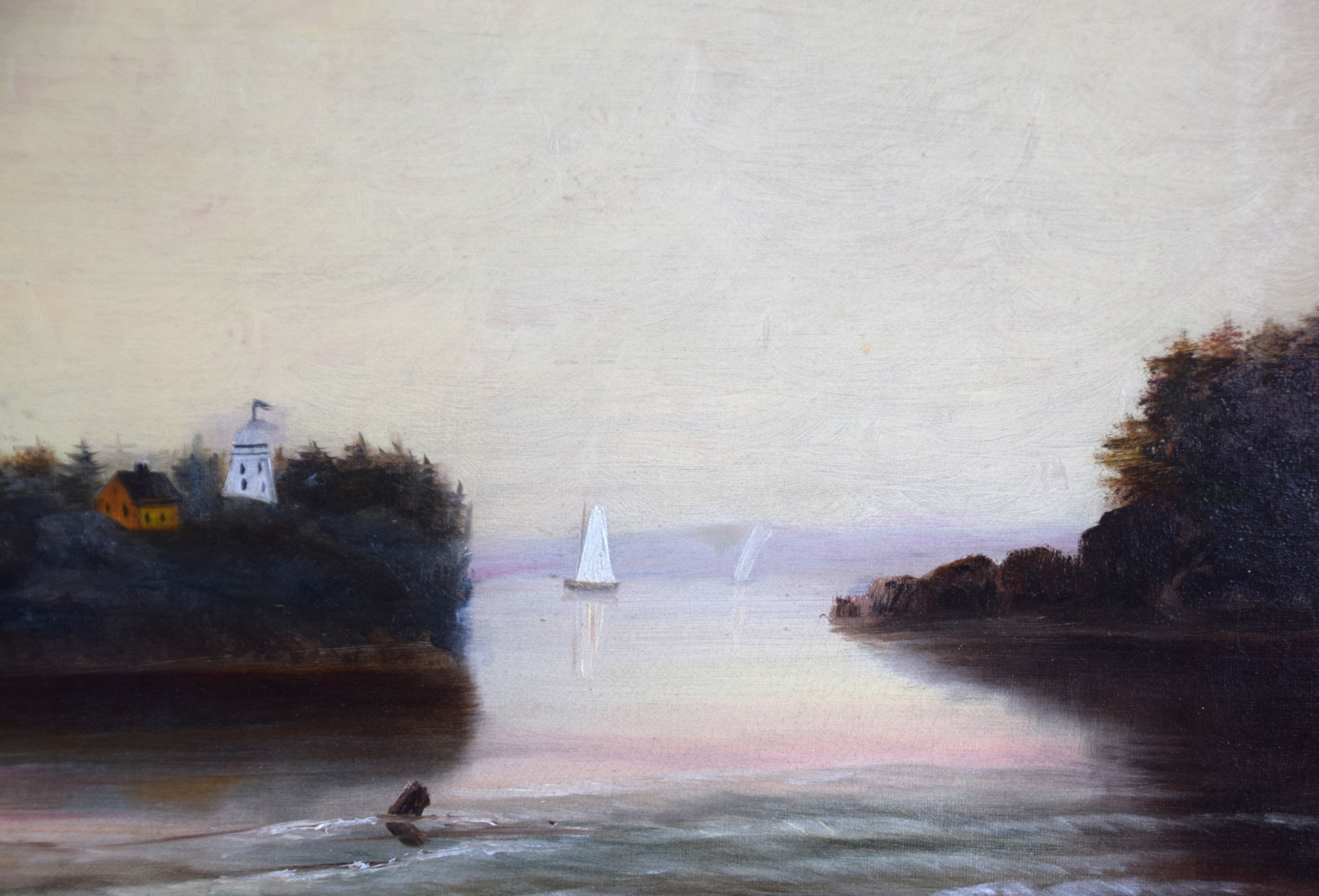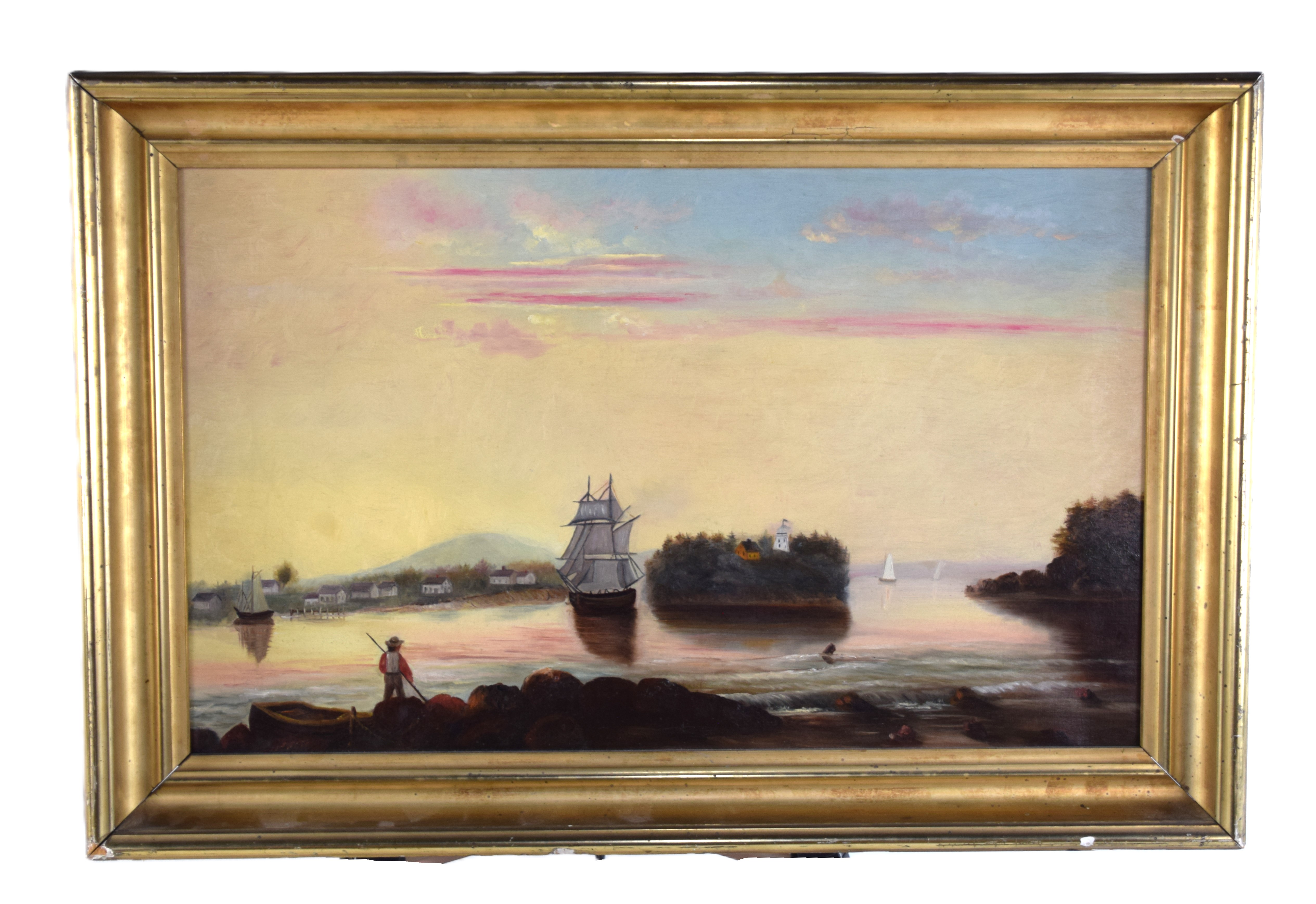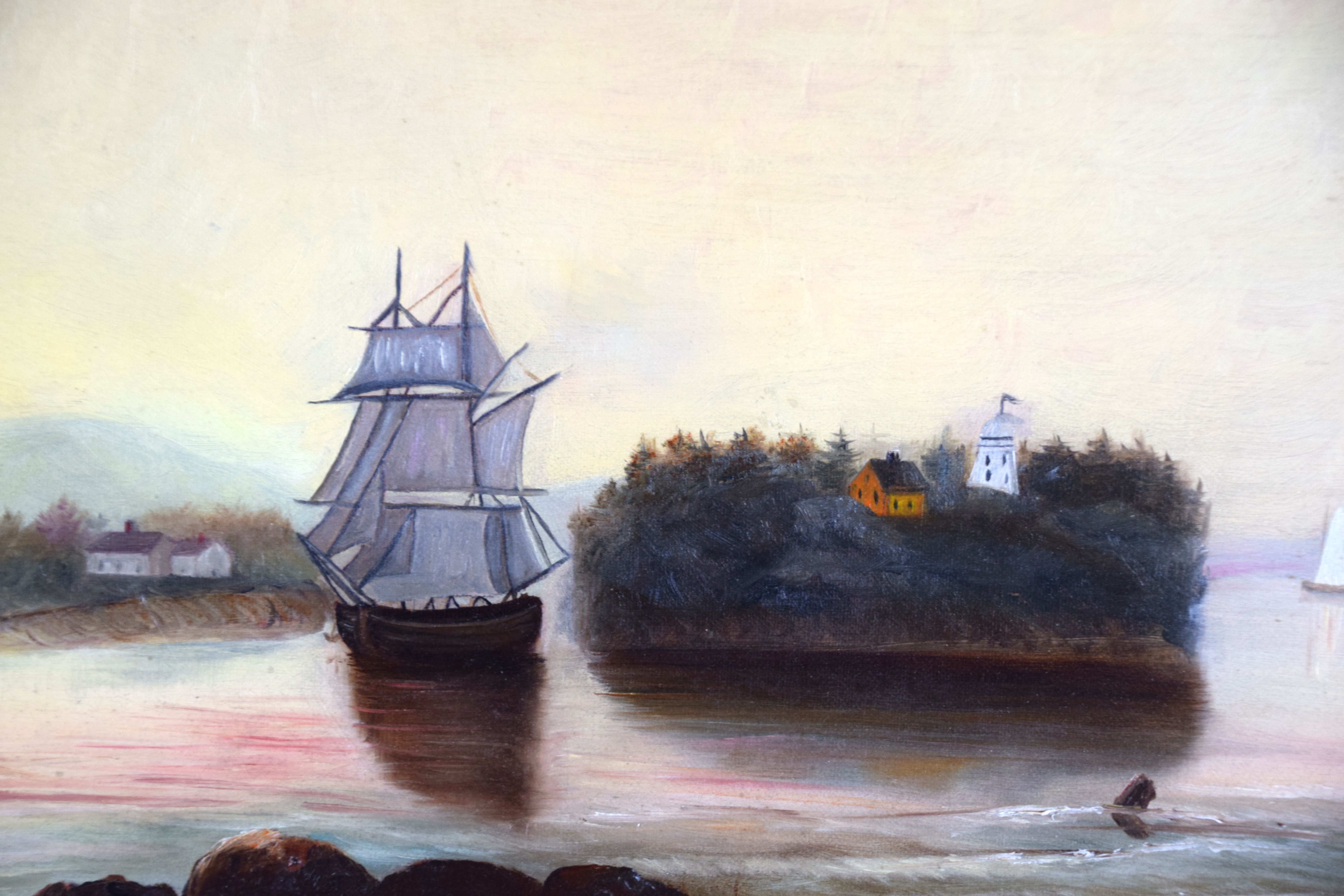 Framed oil on canvas seascape of Owl’s Head Maine in the style of Fitz Henry Lane. Most likely by artist Mary Mellen, a student of Fritz Henry Lane. Dimensions: 15.5″ x 25.5″ Image size