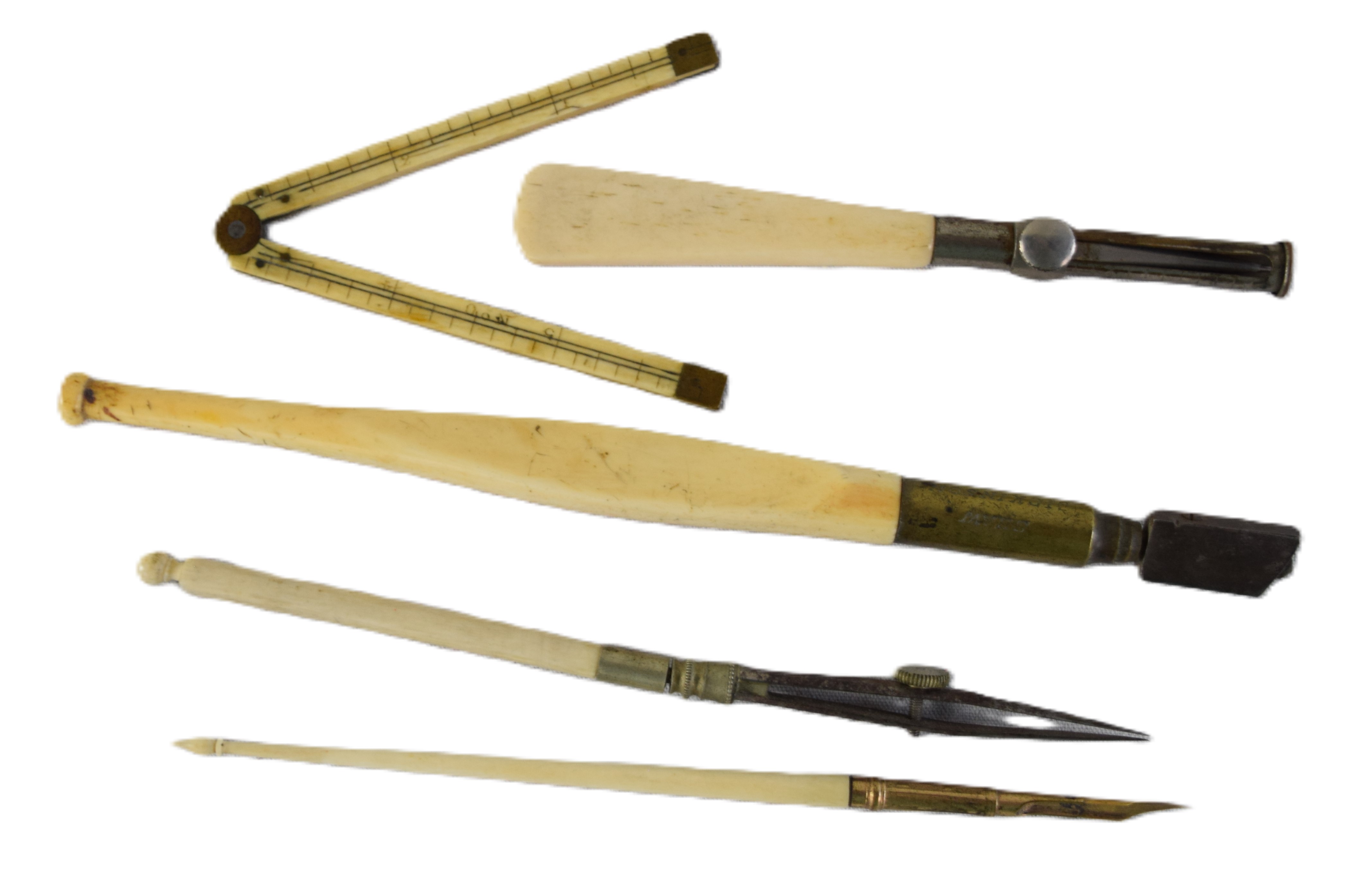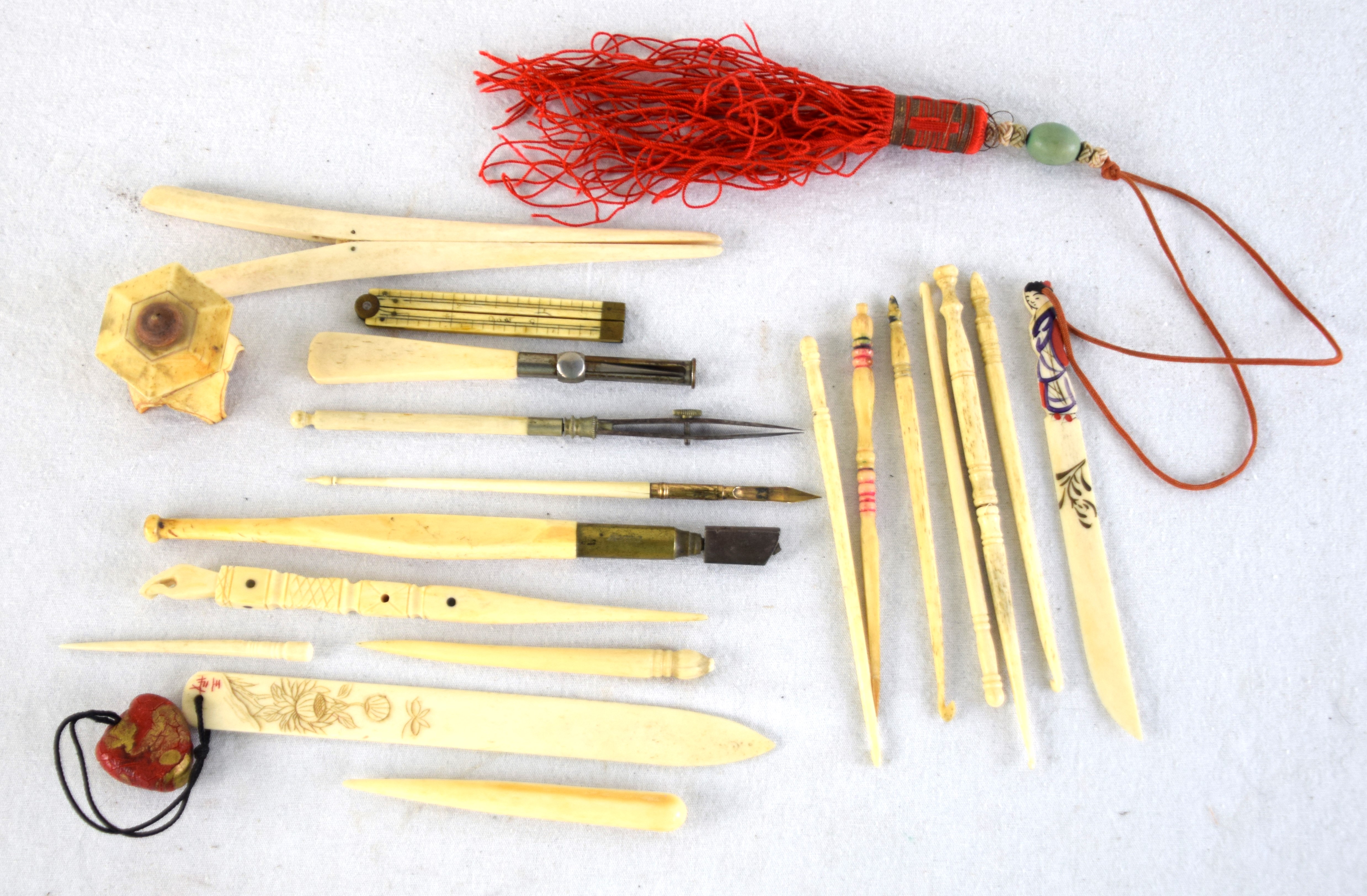 19 Piece whale bone lot to include small slide rule, 4 tools, 1 tweezer, 2 letter openers, 1 small pagoda, and 10 needle points some carved. Dimensions: 4″ to 7″