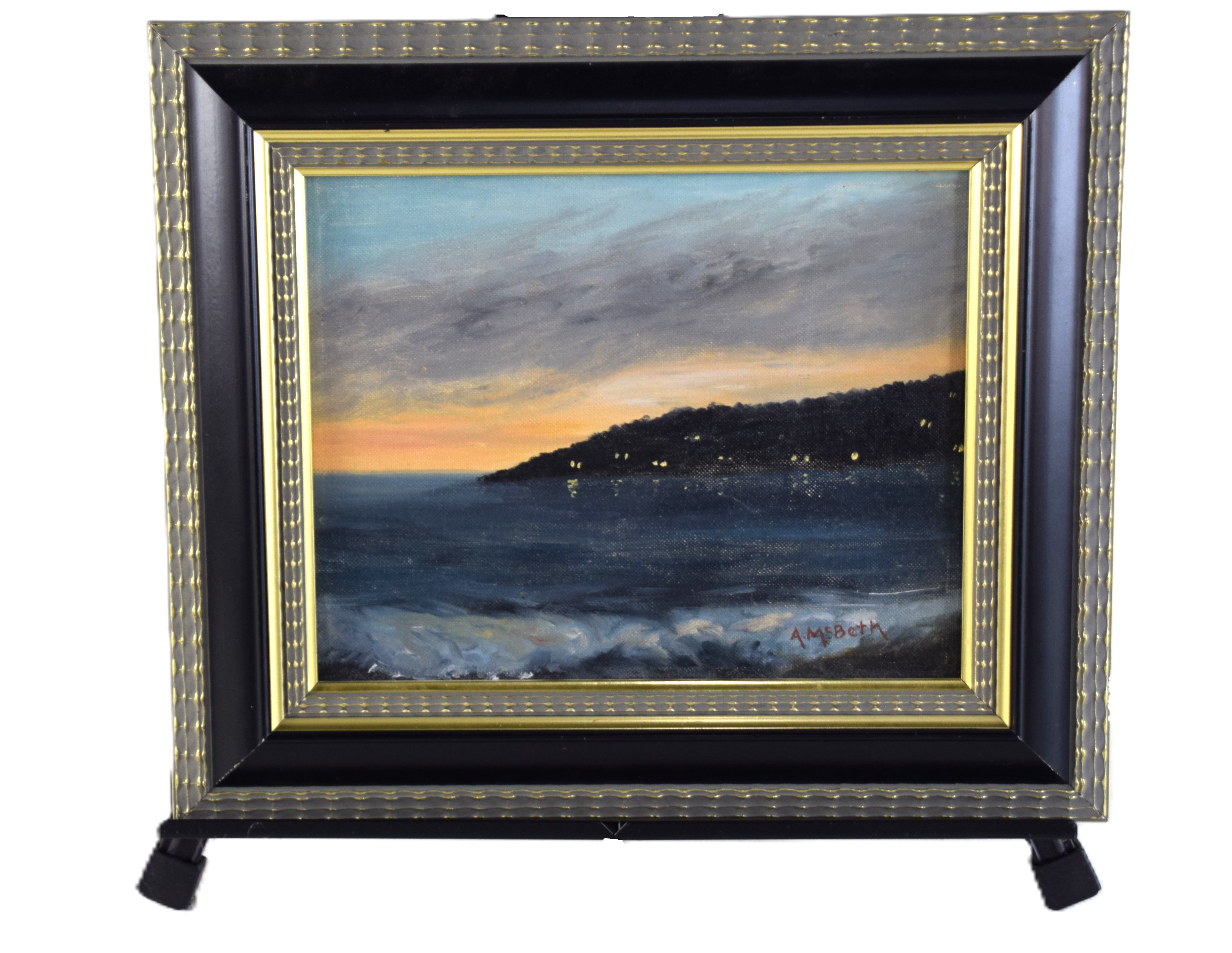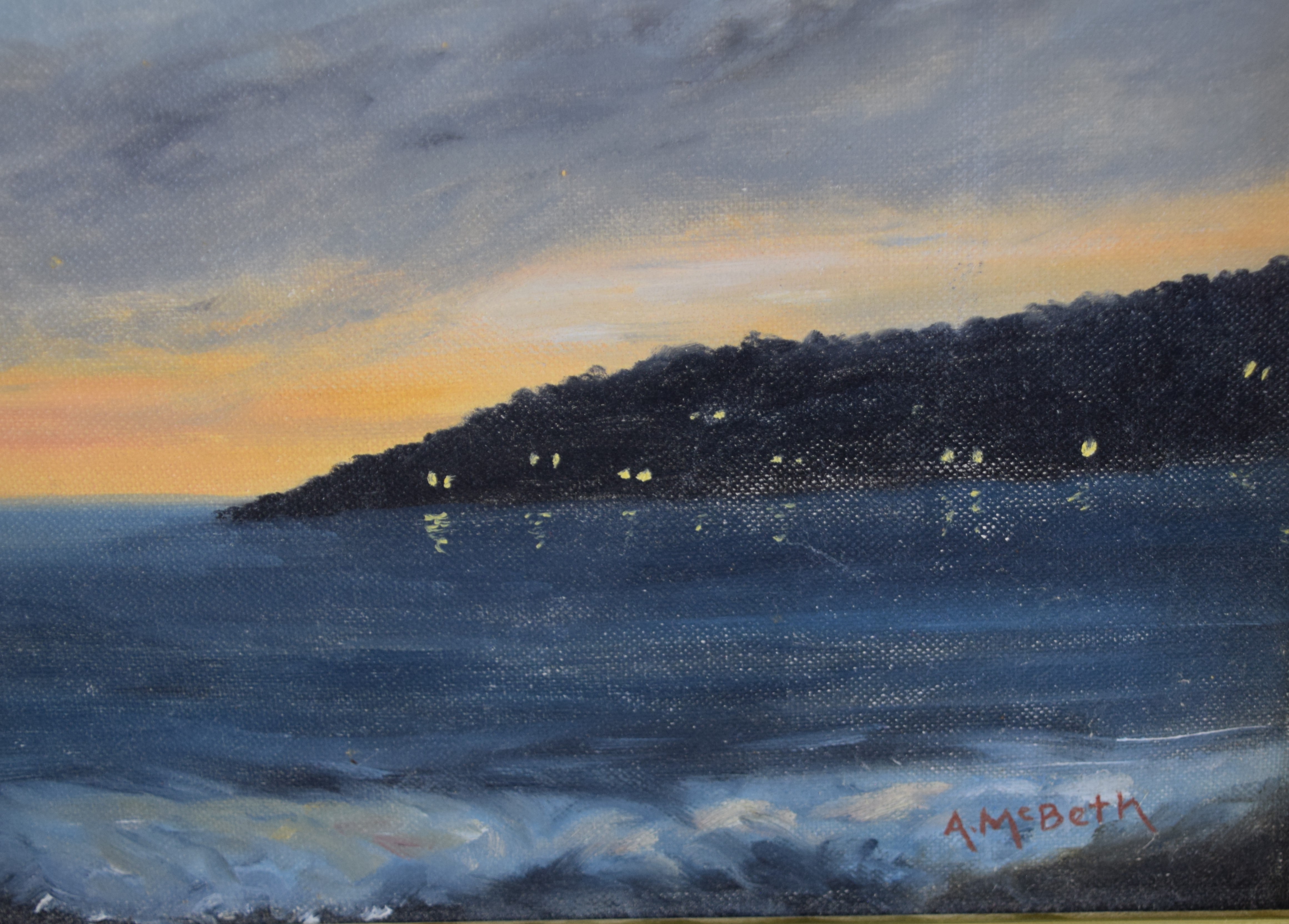 An oil on canvas of a seascape titled Menemsha Bight, Martha’s Vineyard. Albert McBeth (1930-2008) worked in Maine and Massachusetts is known for seascapes. Provenance: In the collection of the former director of Springfield Museums. Dimensions: 8″ x 9.5″ Image size
