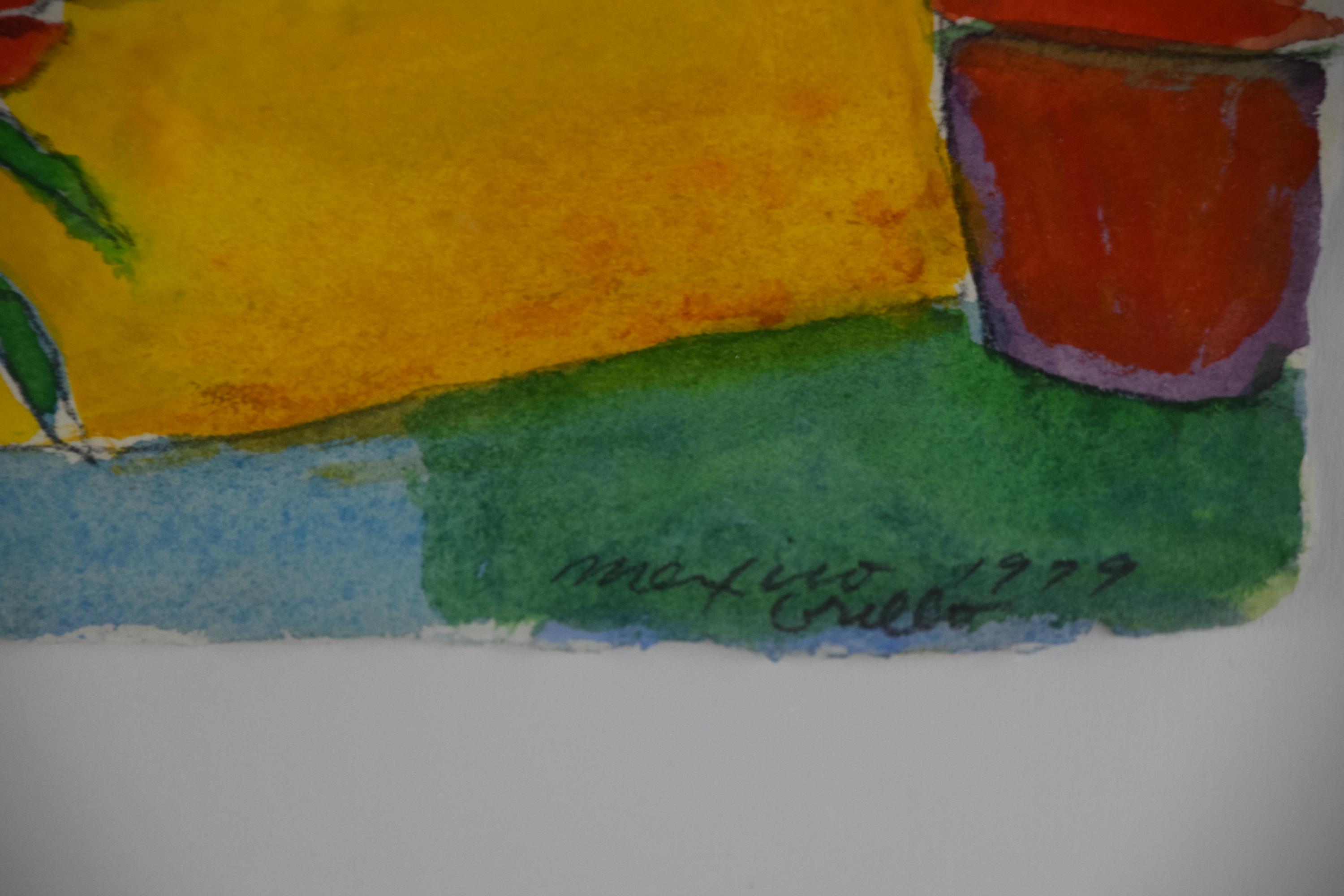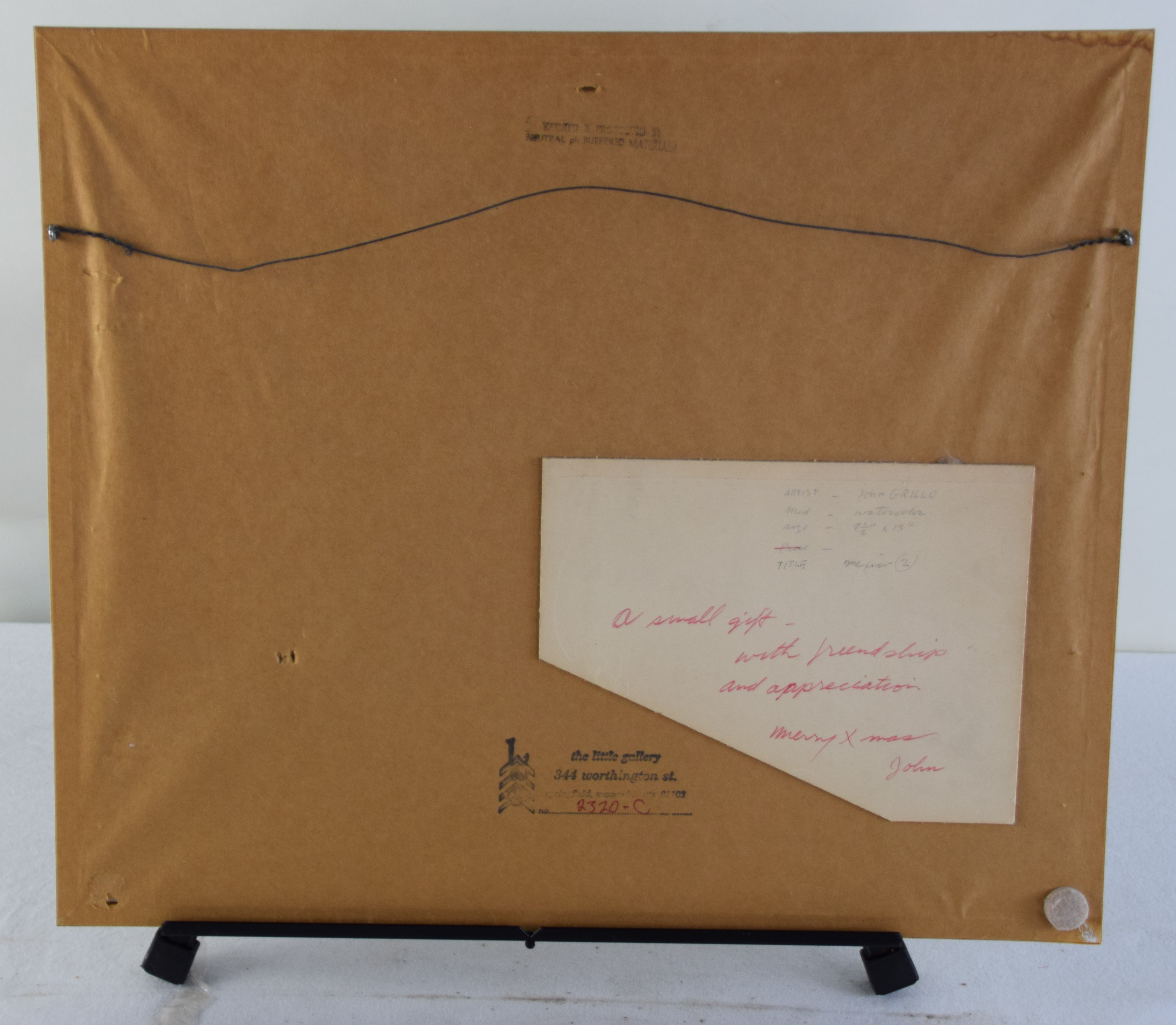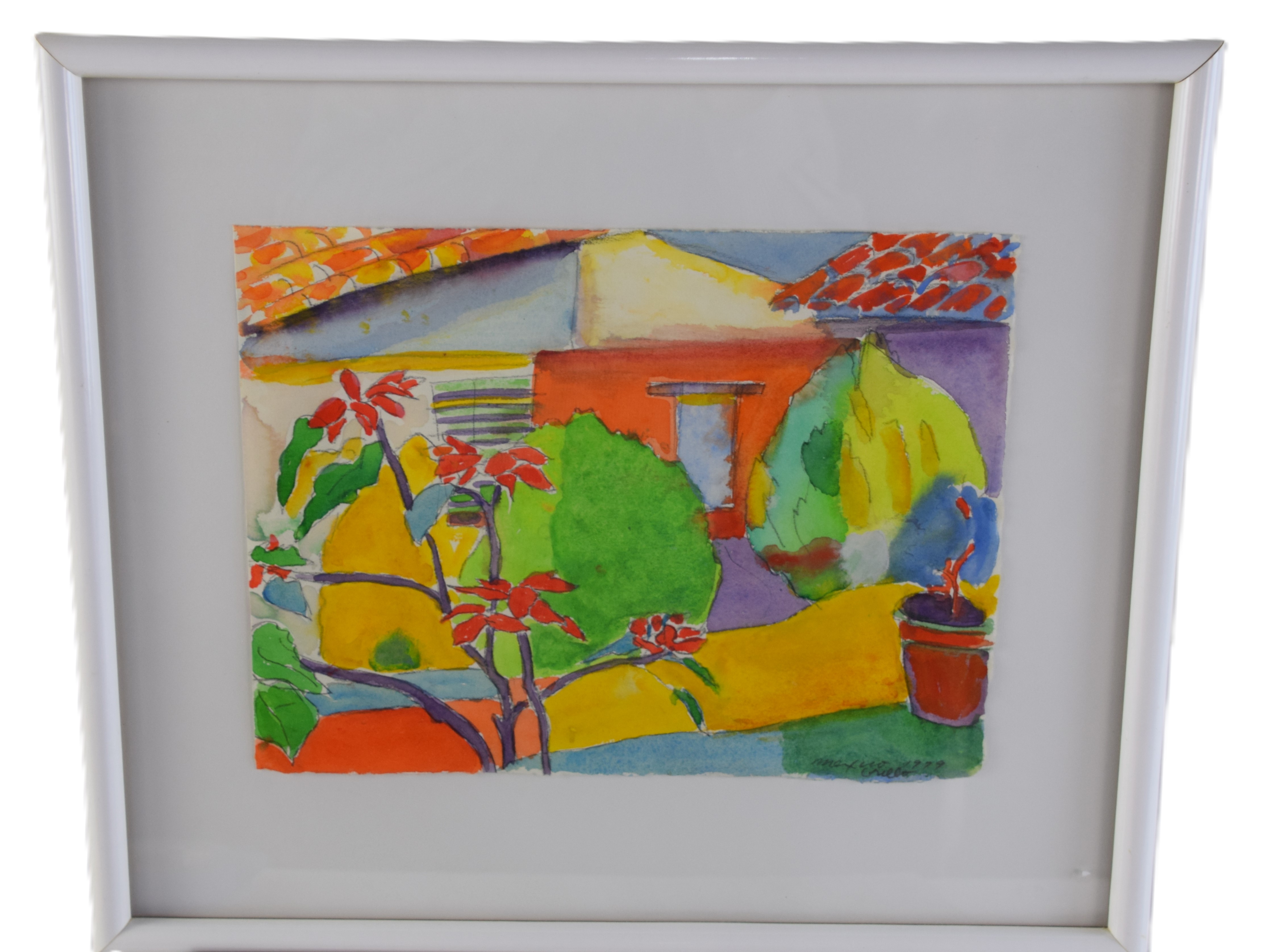 Abstract watercolor on paper of a colorful home with plants and a tile roof. John Grillo (1917 – 2014) worked in Massachusetts and is known for Abstract expressionist painting. Provenance: In the collection of the former director of Springfield Museums. Dimensions: 10′ x 13″