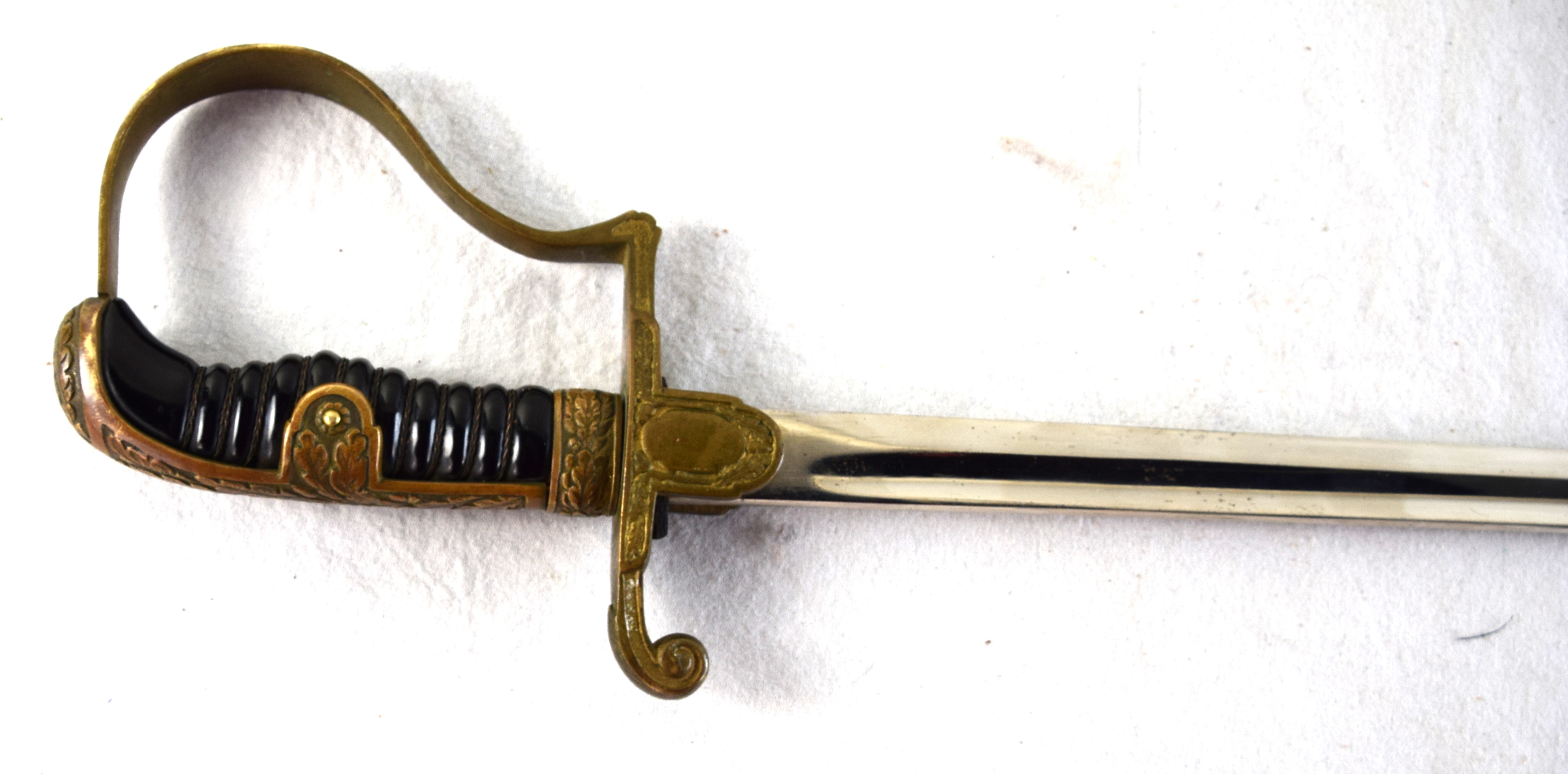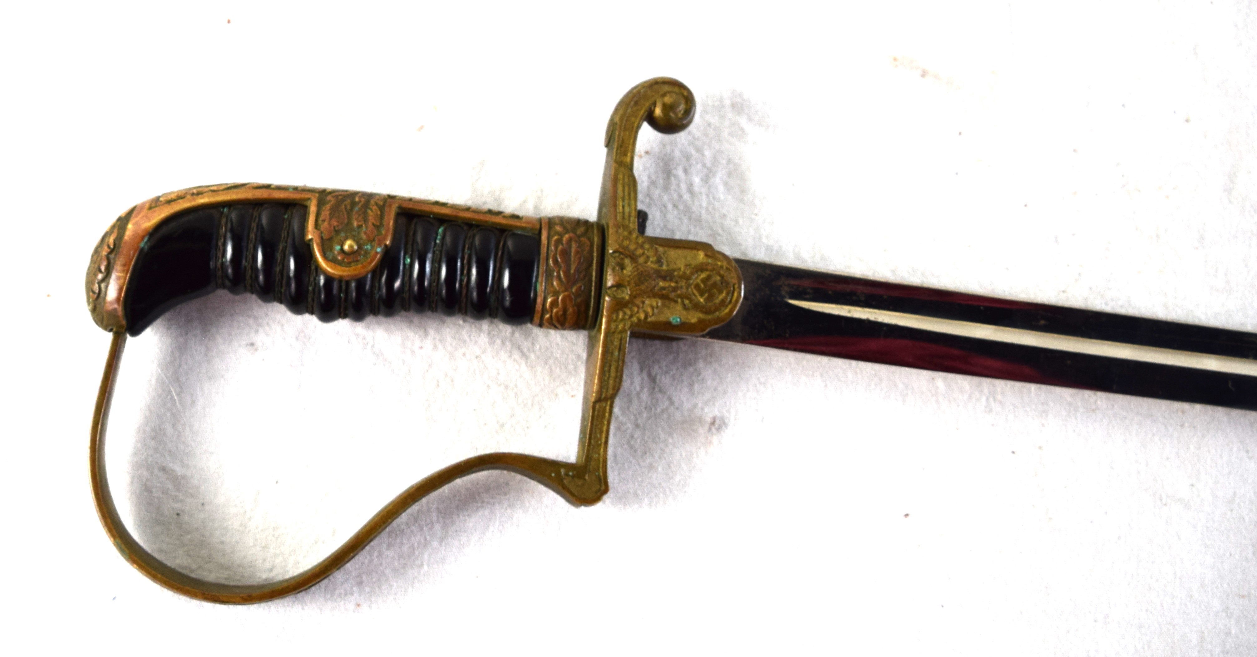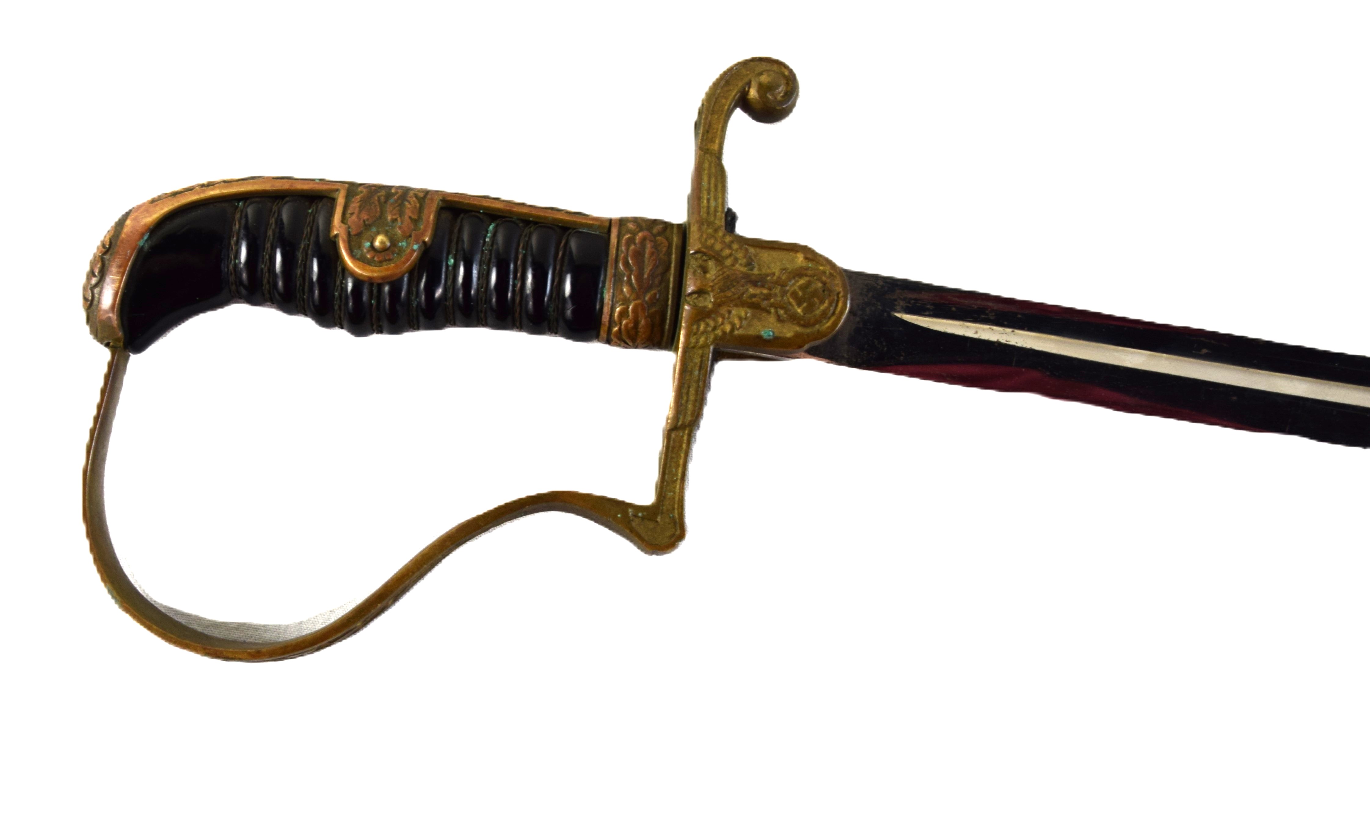German WW II dove head sword with scabbard made by Hermann Rath. Nickle plated blade, 30.5″ Length.