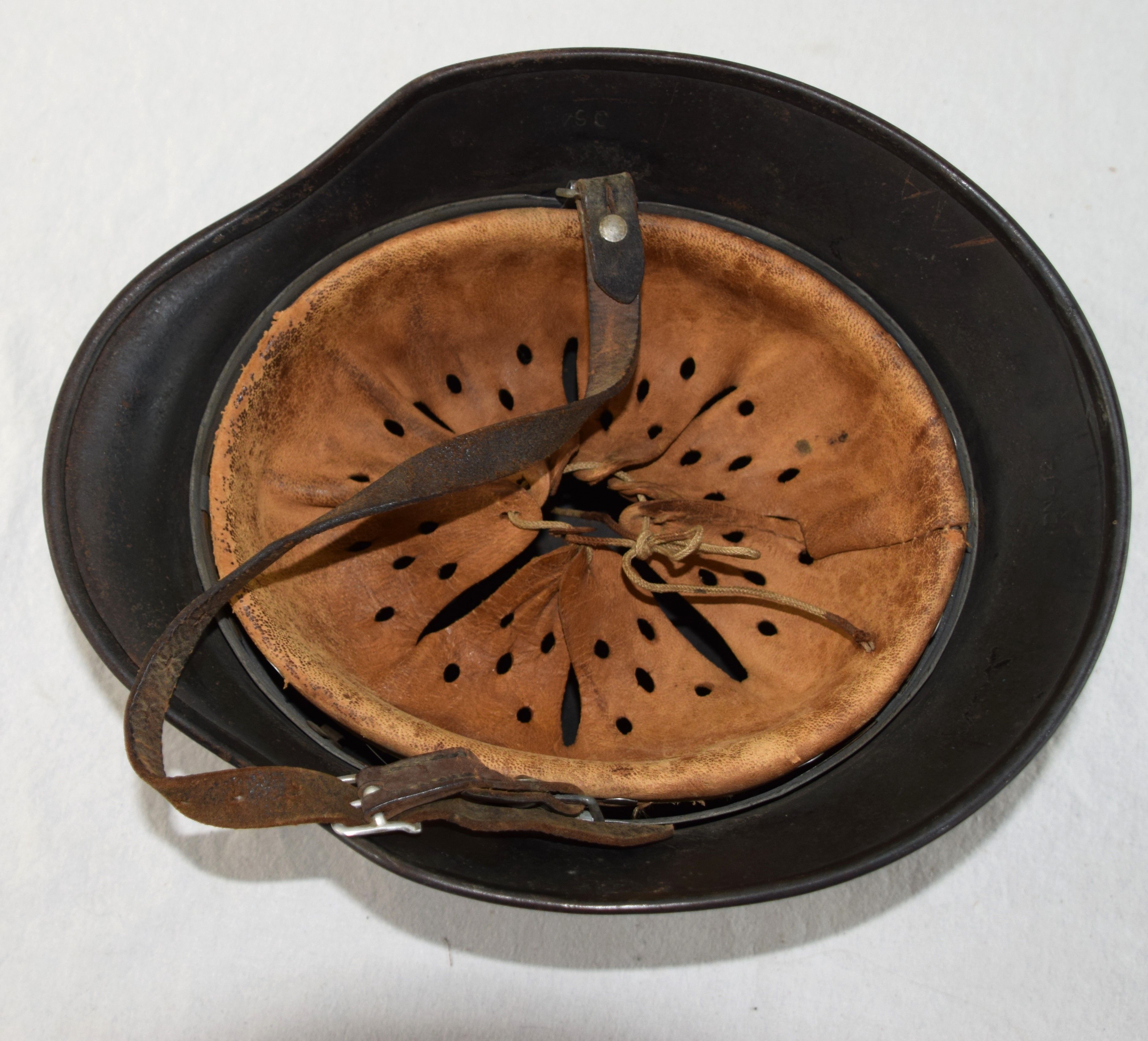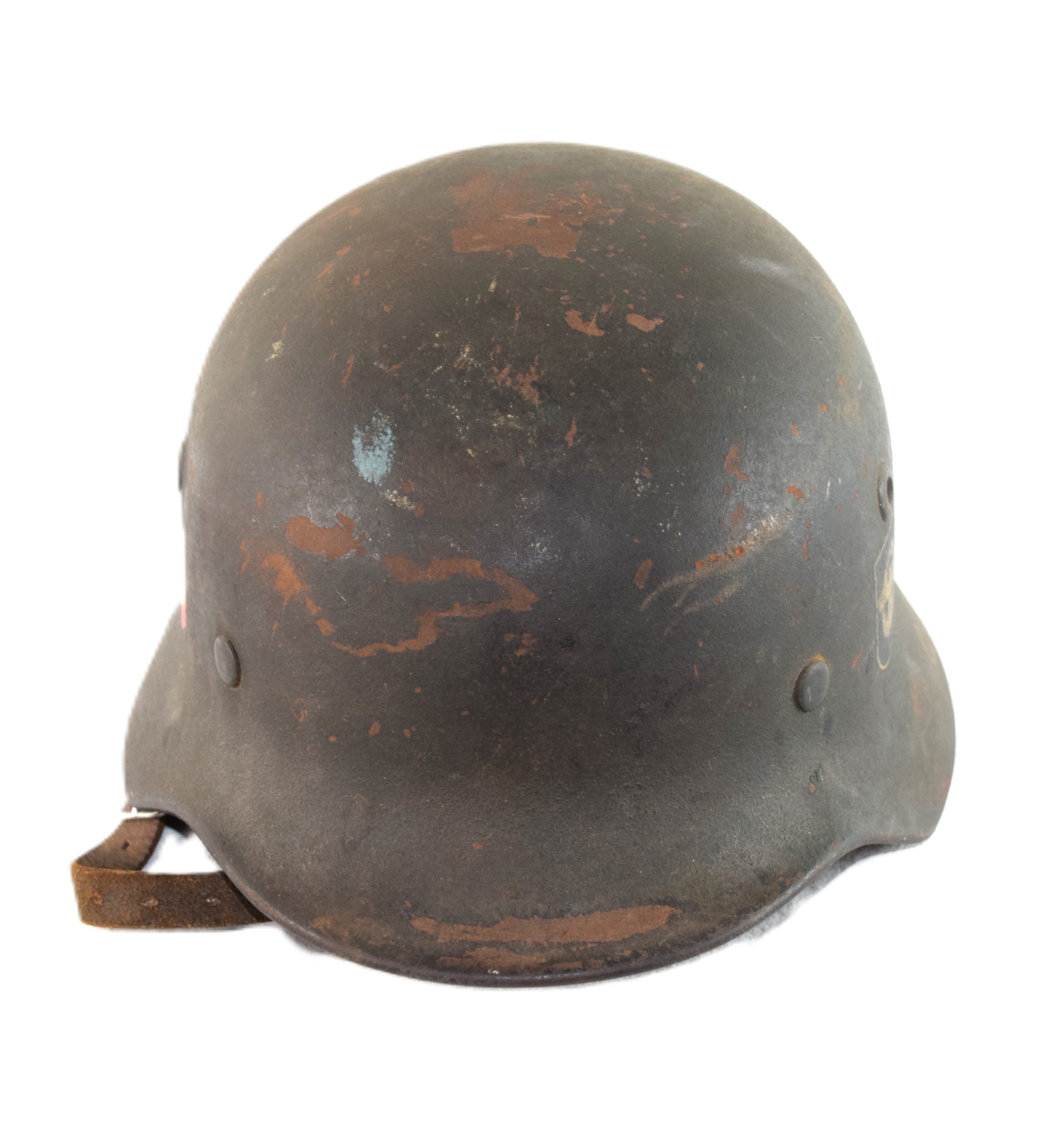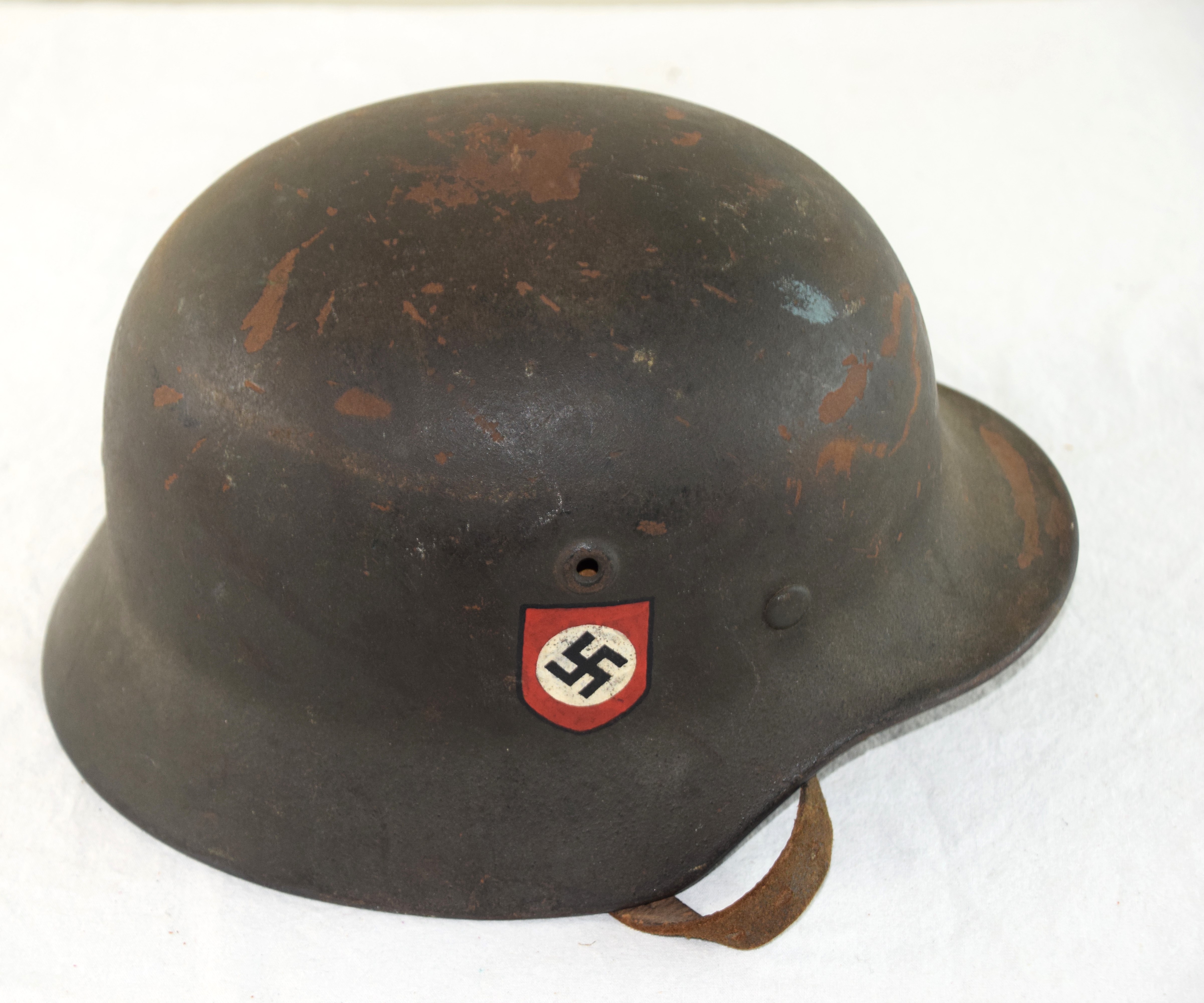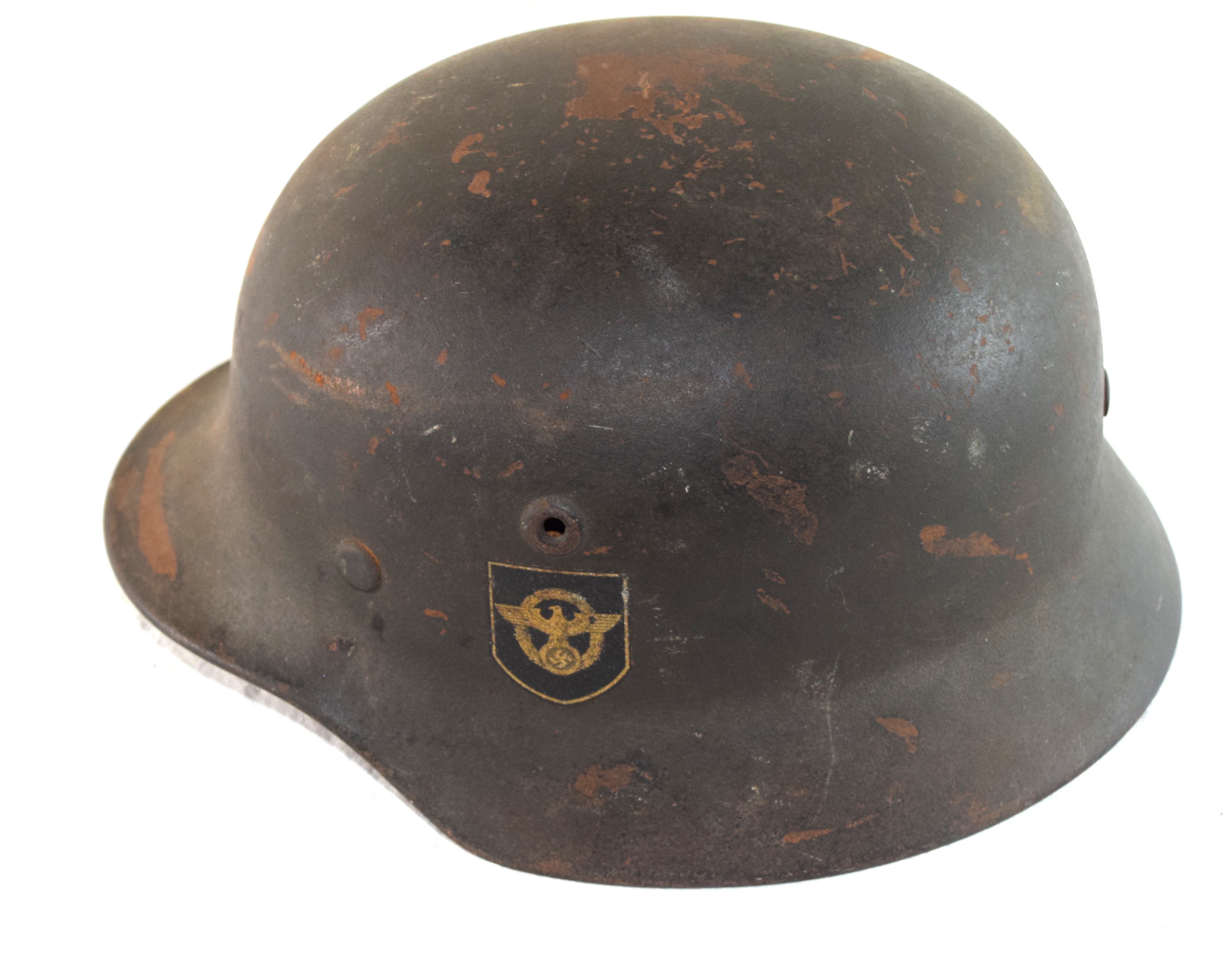 German police WWII helmet with double decal, complete with liner and chin strap. Fitted with its correct M.40 liner and zinc liner band with its nice toned to gold police non-bordered decal with the swastika border decal on the opposite side.