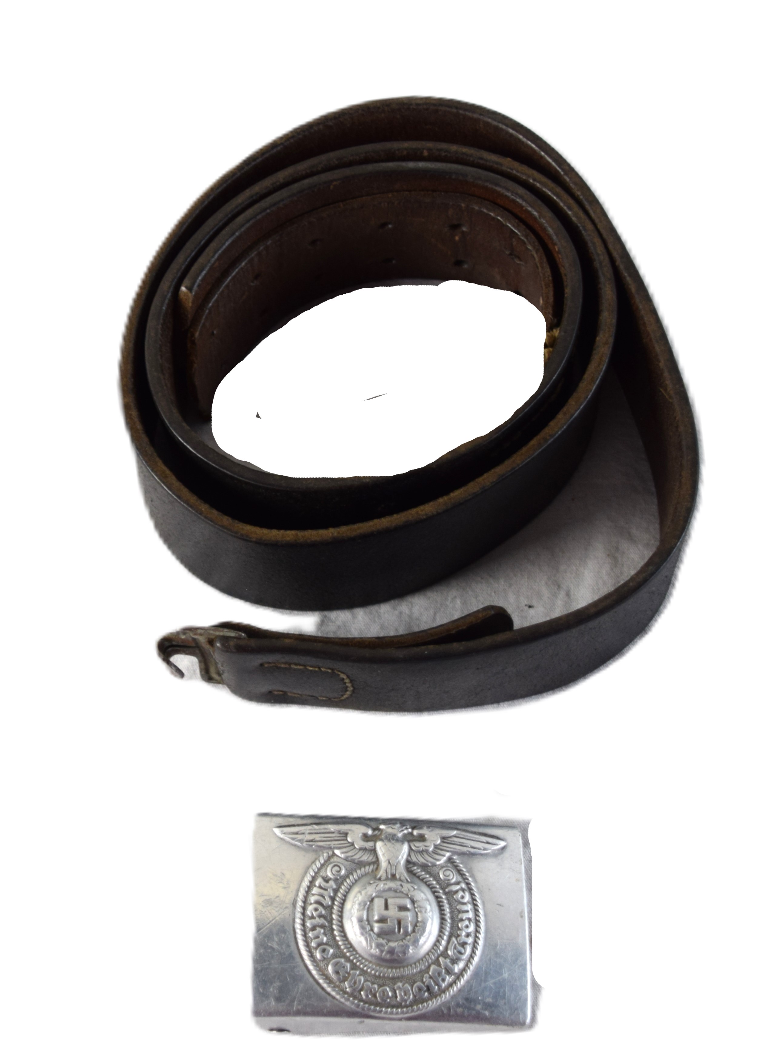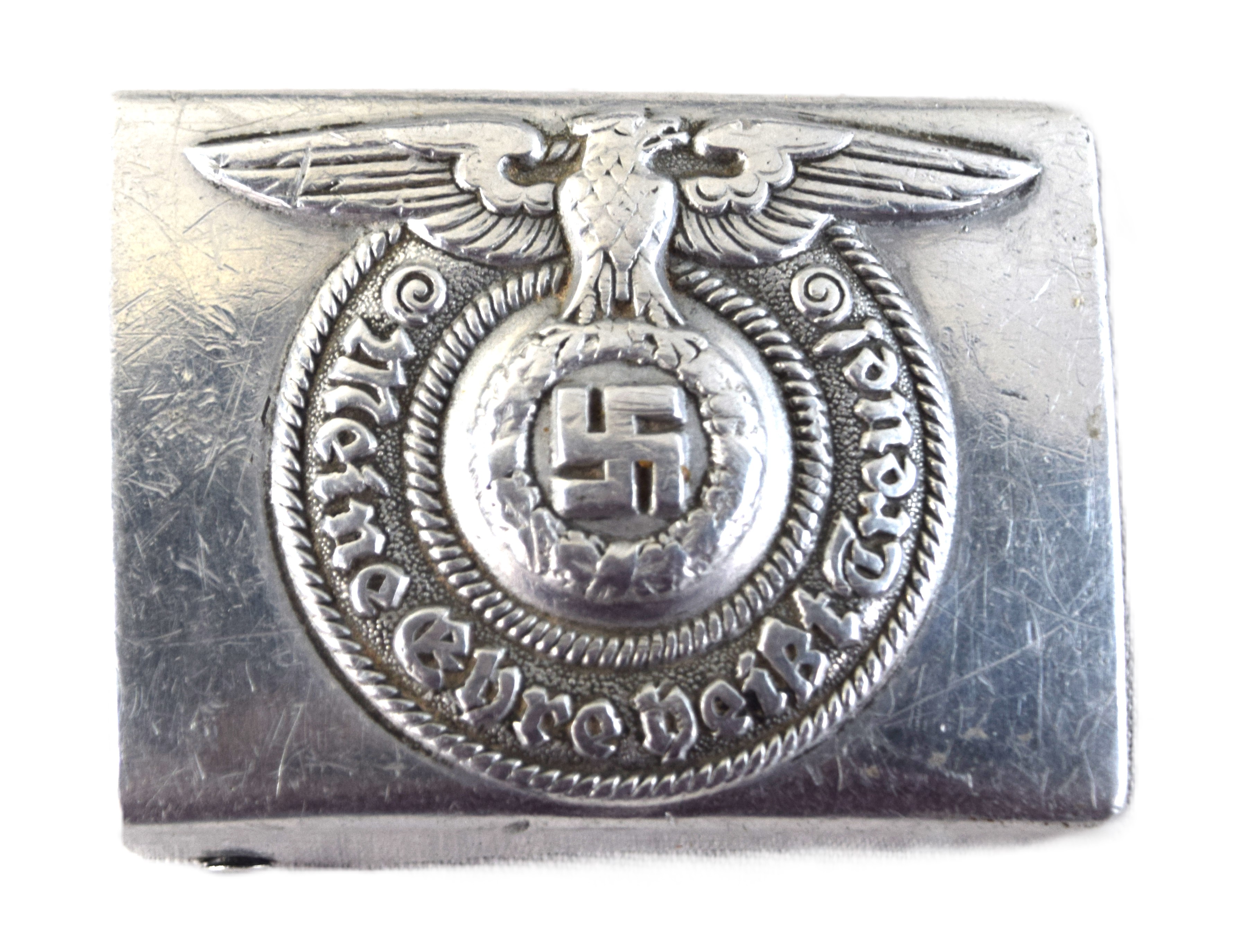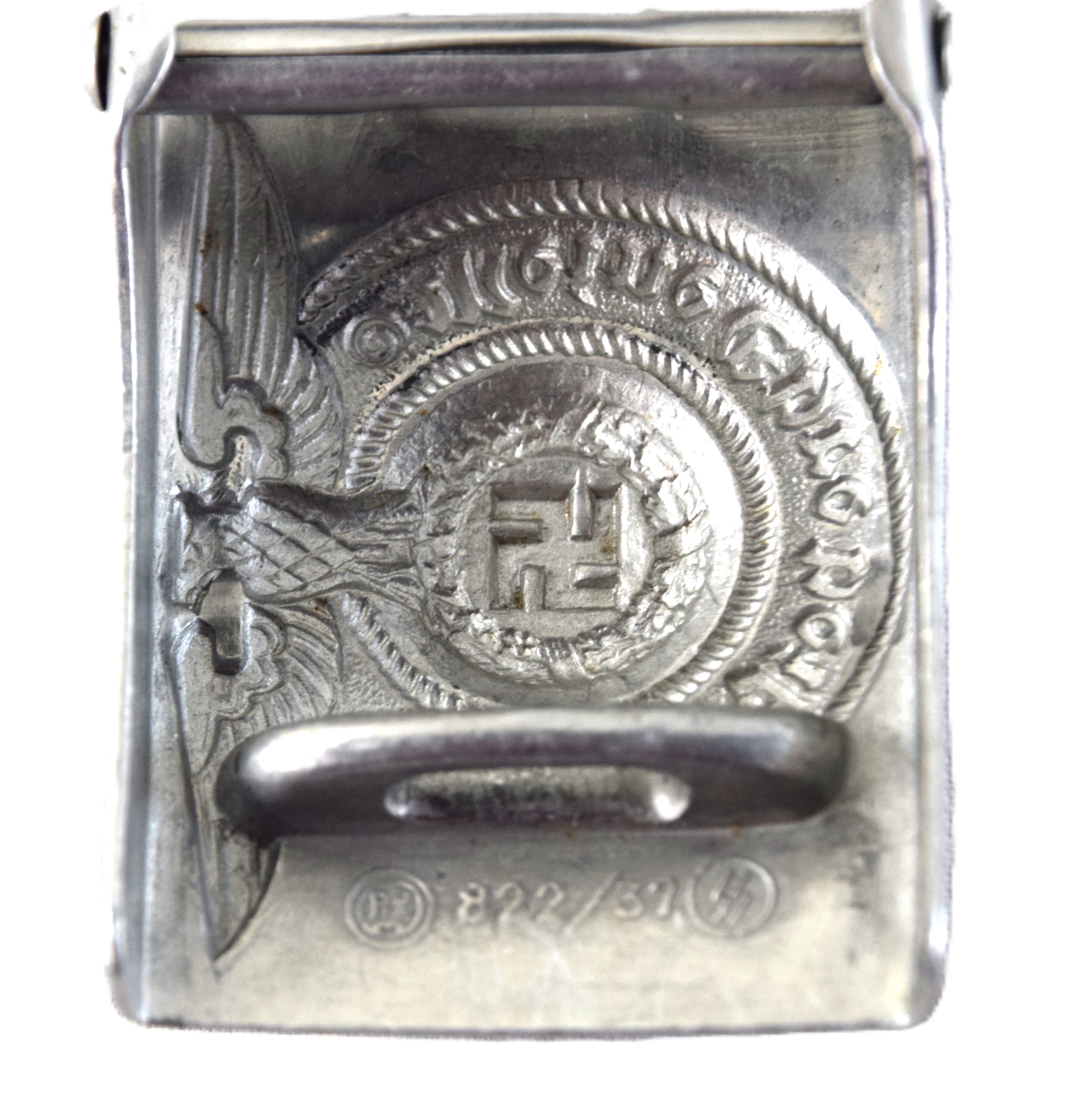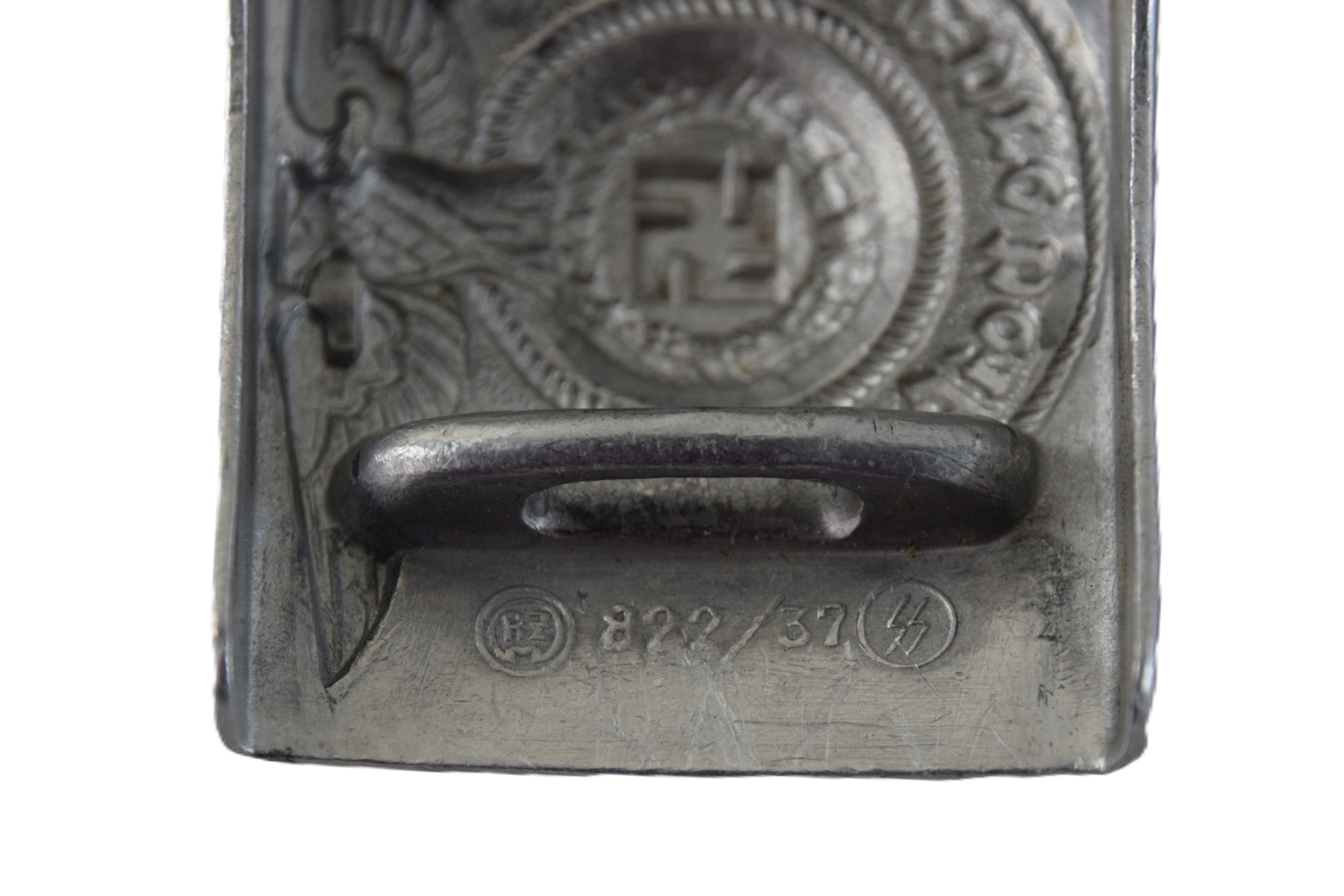 An original Waffen-SS EM/NCOs Belt Buckle RZM 822/37, die struck aluminum. The buckle is embossed with the SS National eagle clutching a wreathed eagle surrounded by the units motto ‘Meine Ehre heißt Treue!’ (My Honor is Loyalty). The reverse of the buckle is clearly stamped ‘RZM 822/38′ for Richard Sieper & Söhne’ from Lüdenscheid with thick lettering making it a type 2 variant.