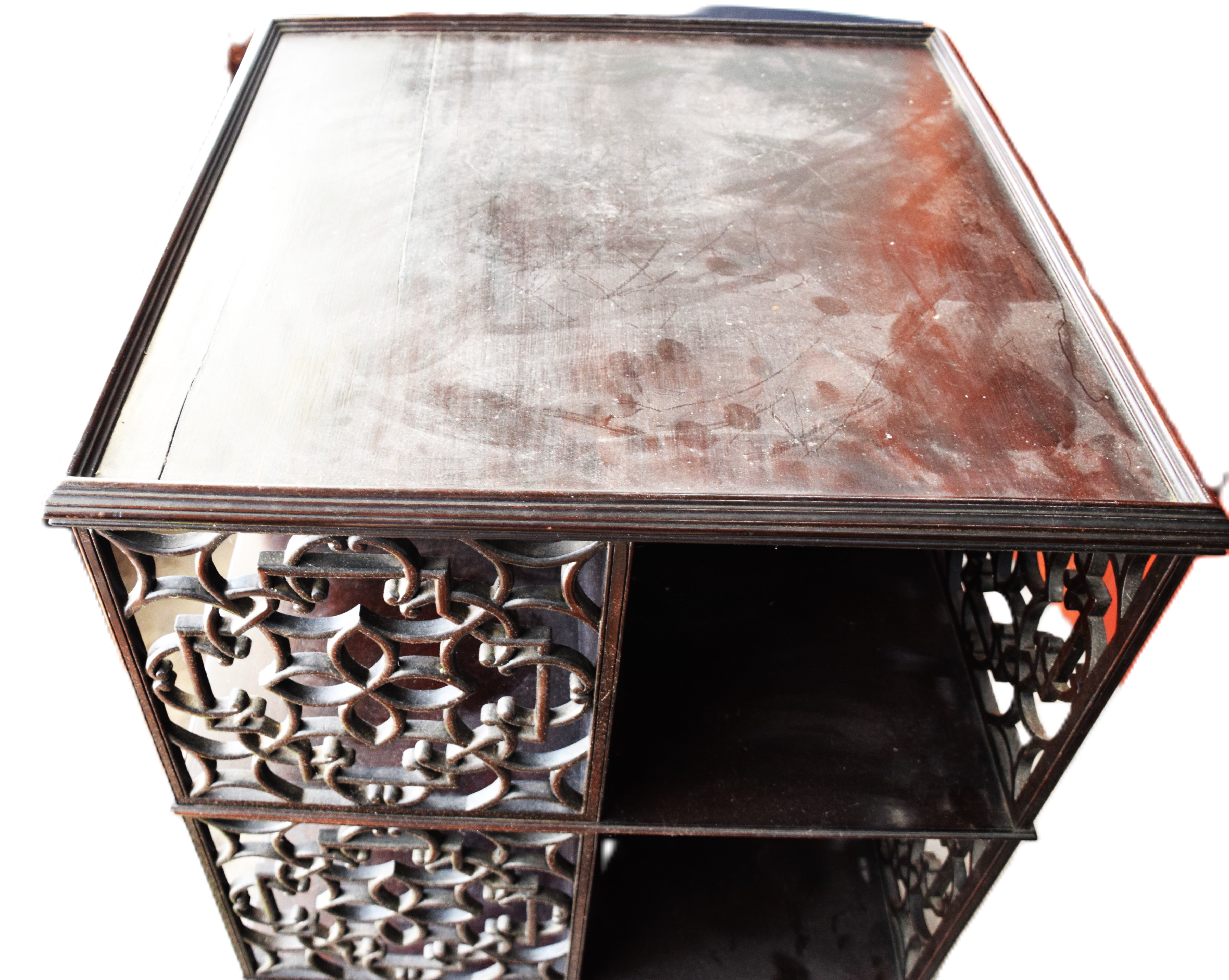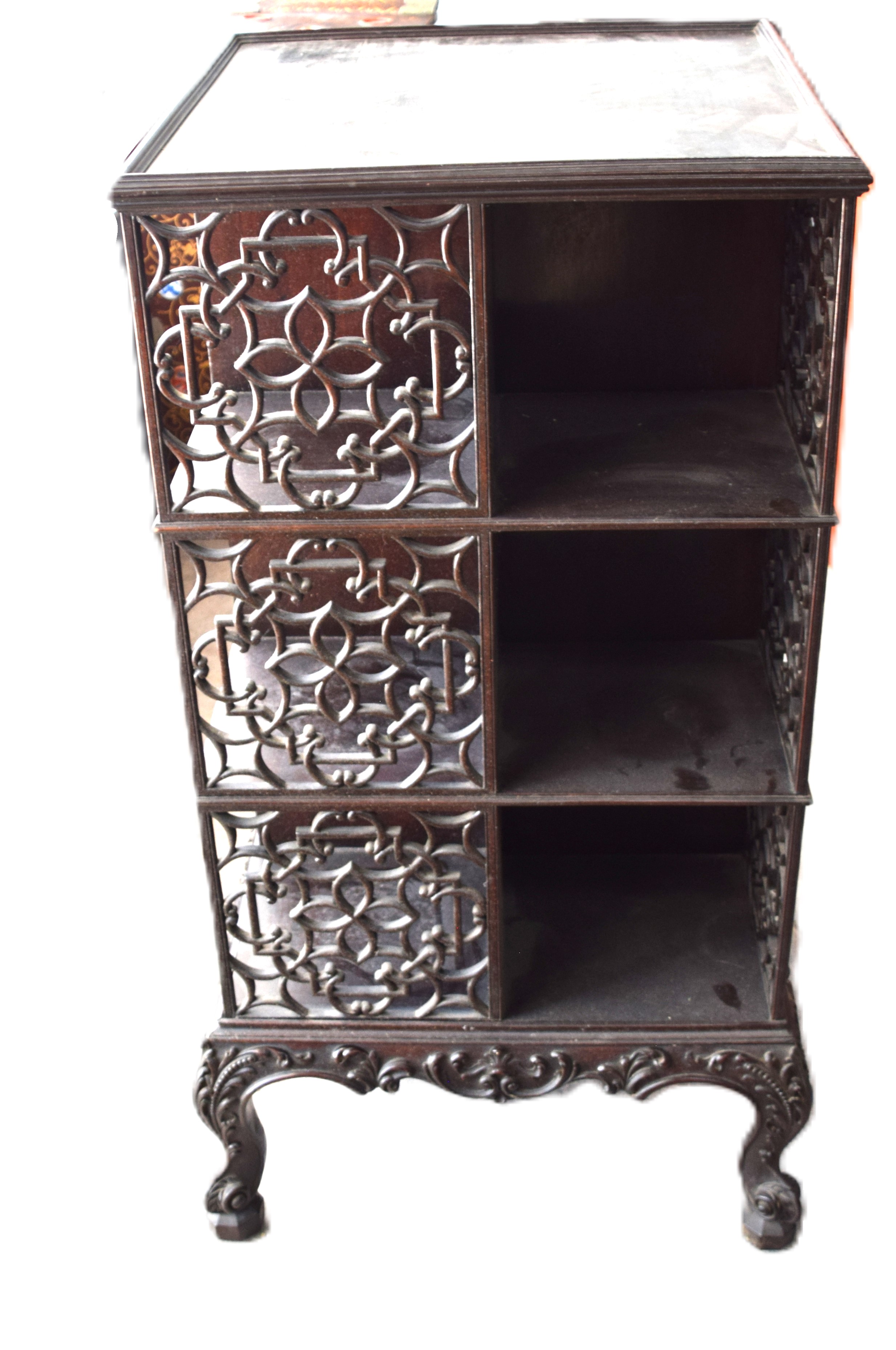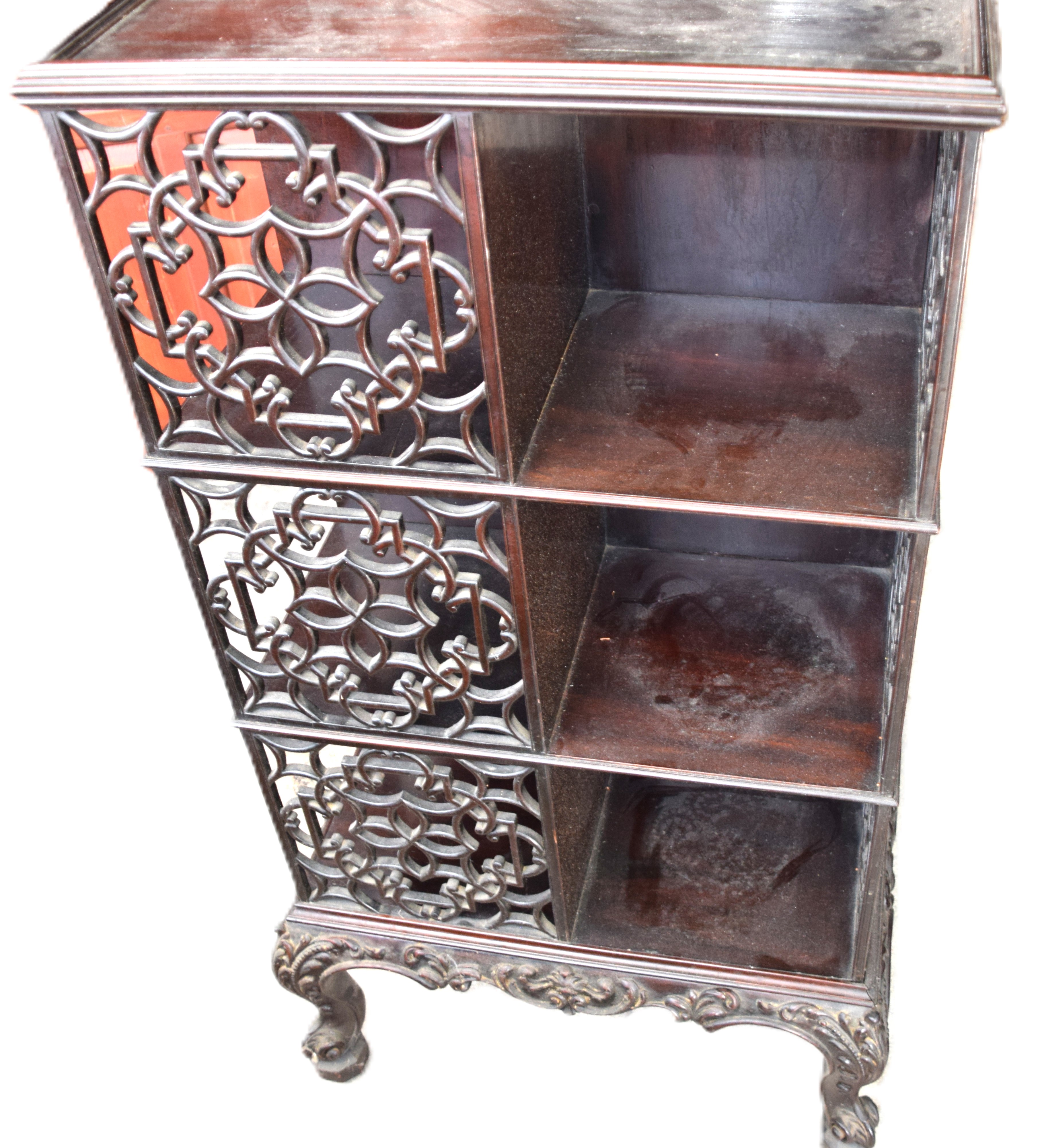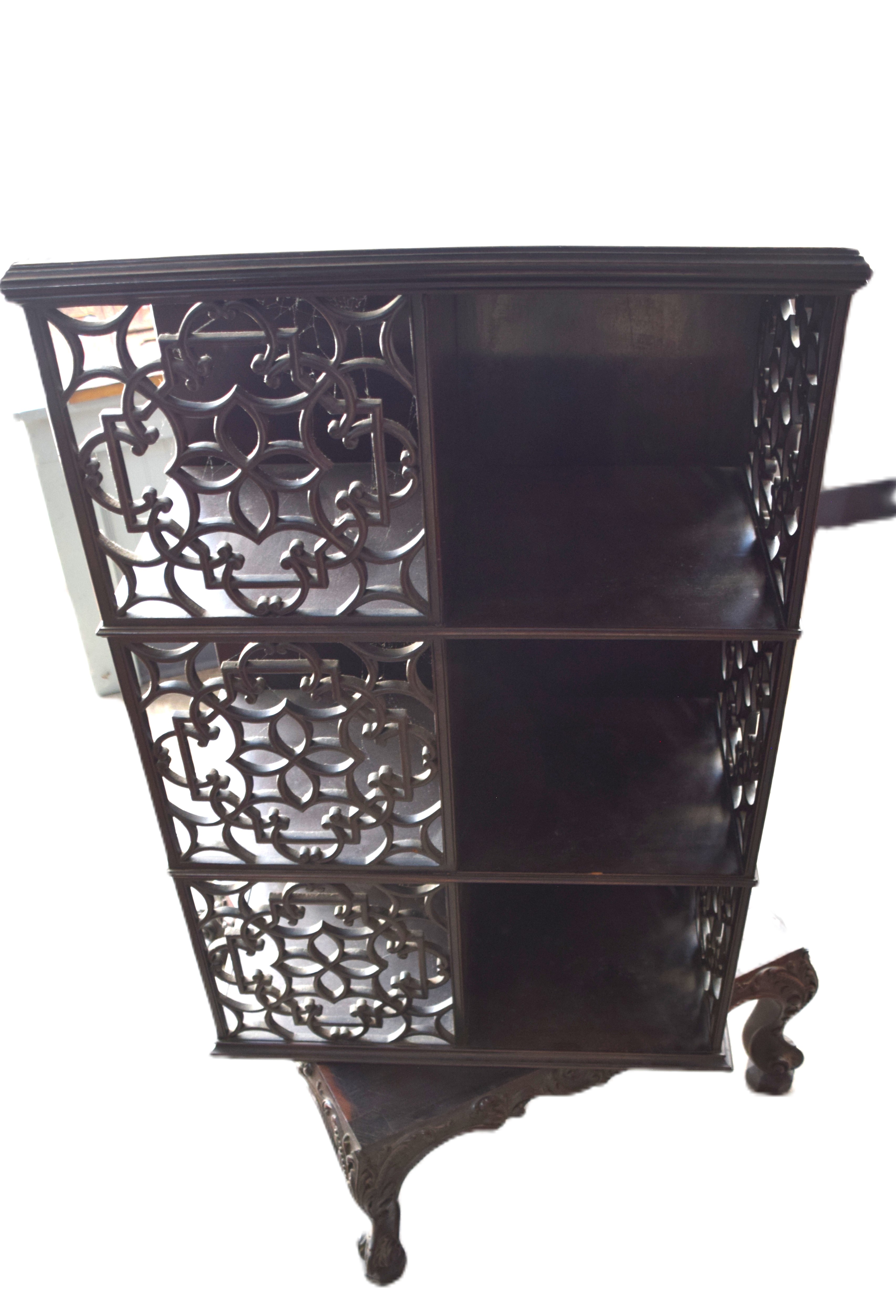 Elaborate carved oriental teakwood bookcase with carvings throughout, carved apron on carved feet. Dimensions: 44″ H x 22″ W x22″ D