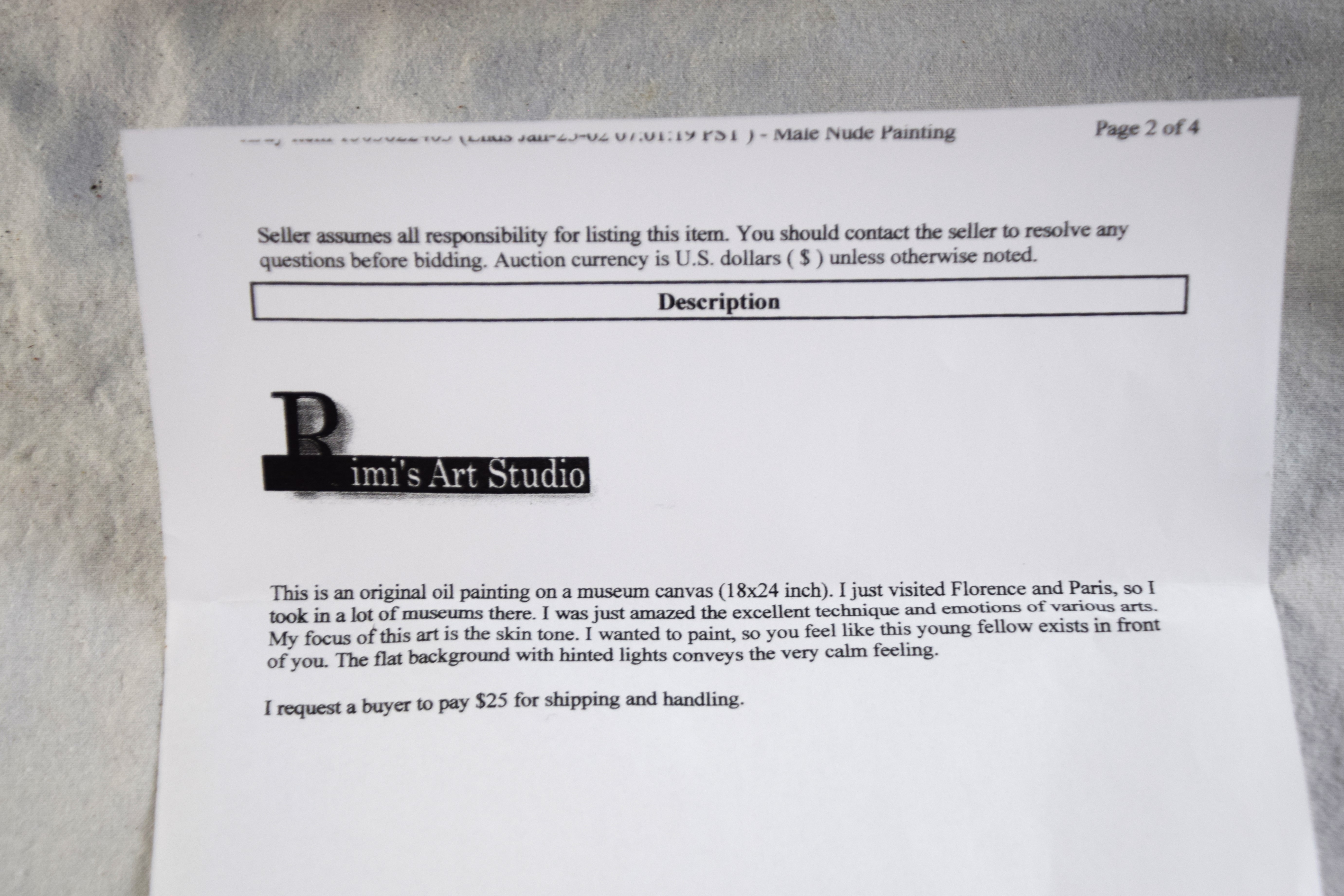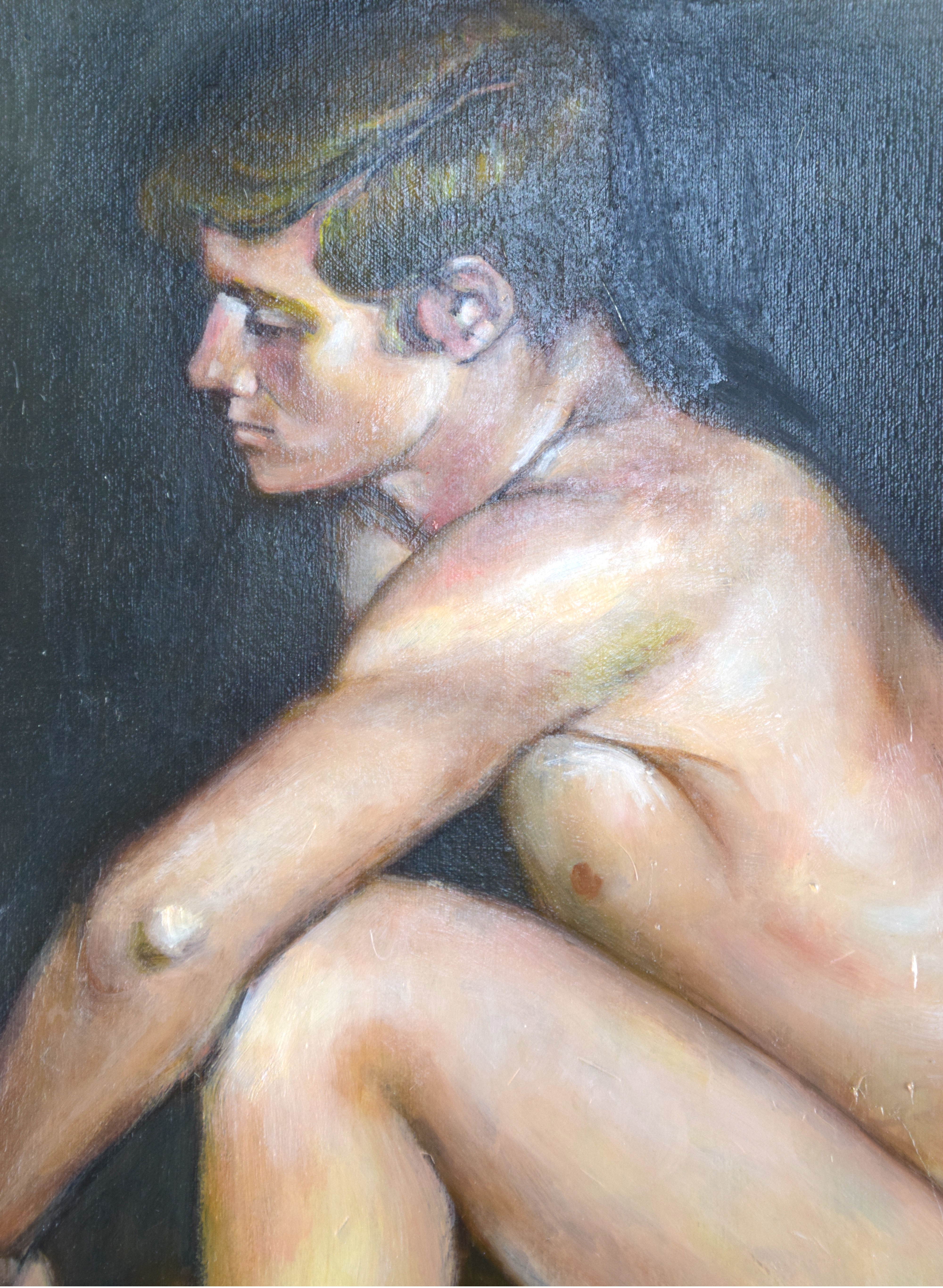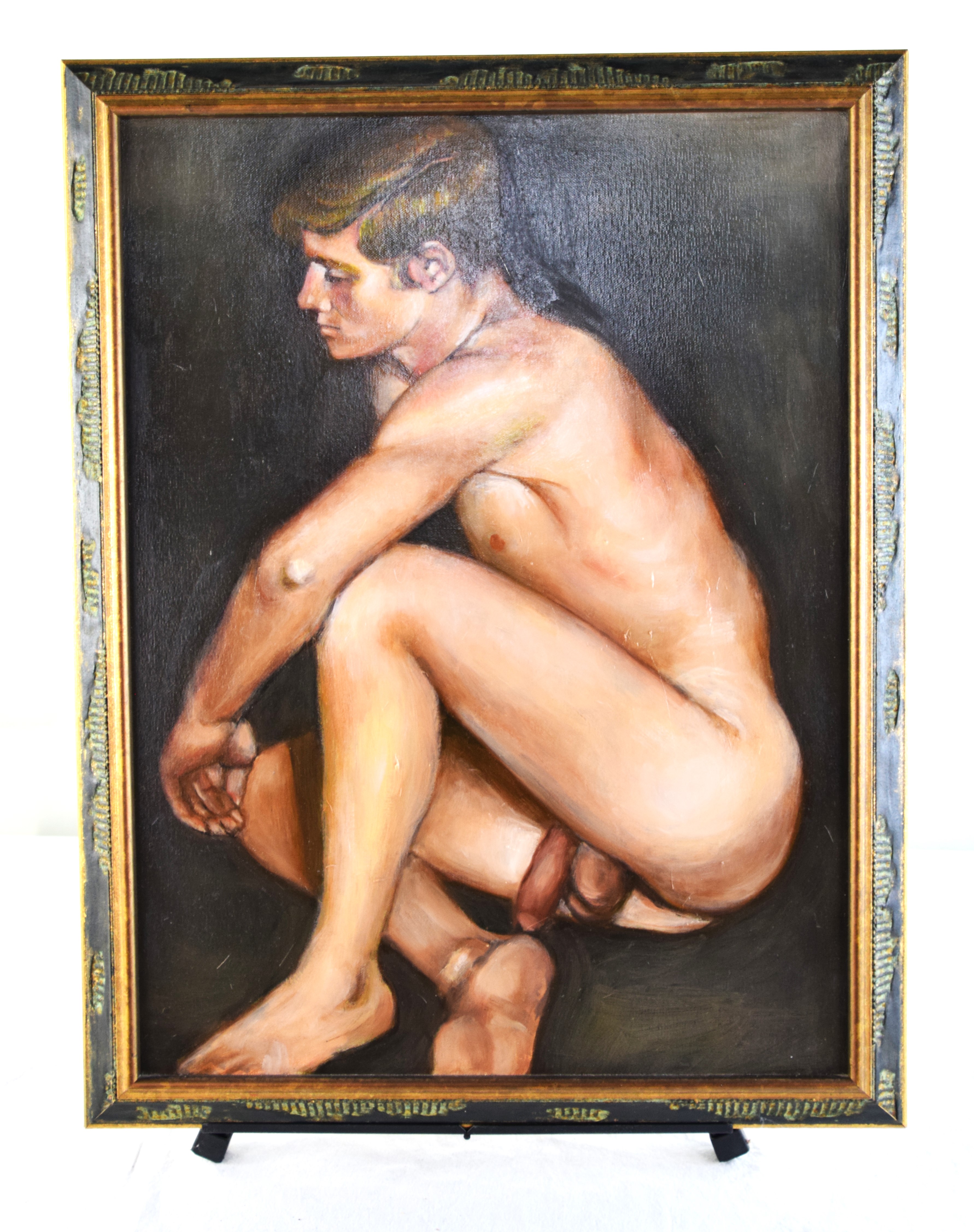 A framed oil on canvas of a male nude by California artist Rimi Yang (1962). Dimensions: 24″ x 18″