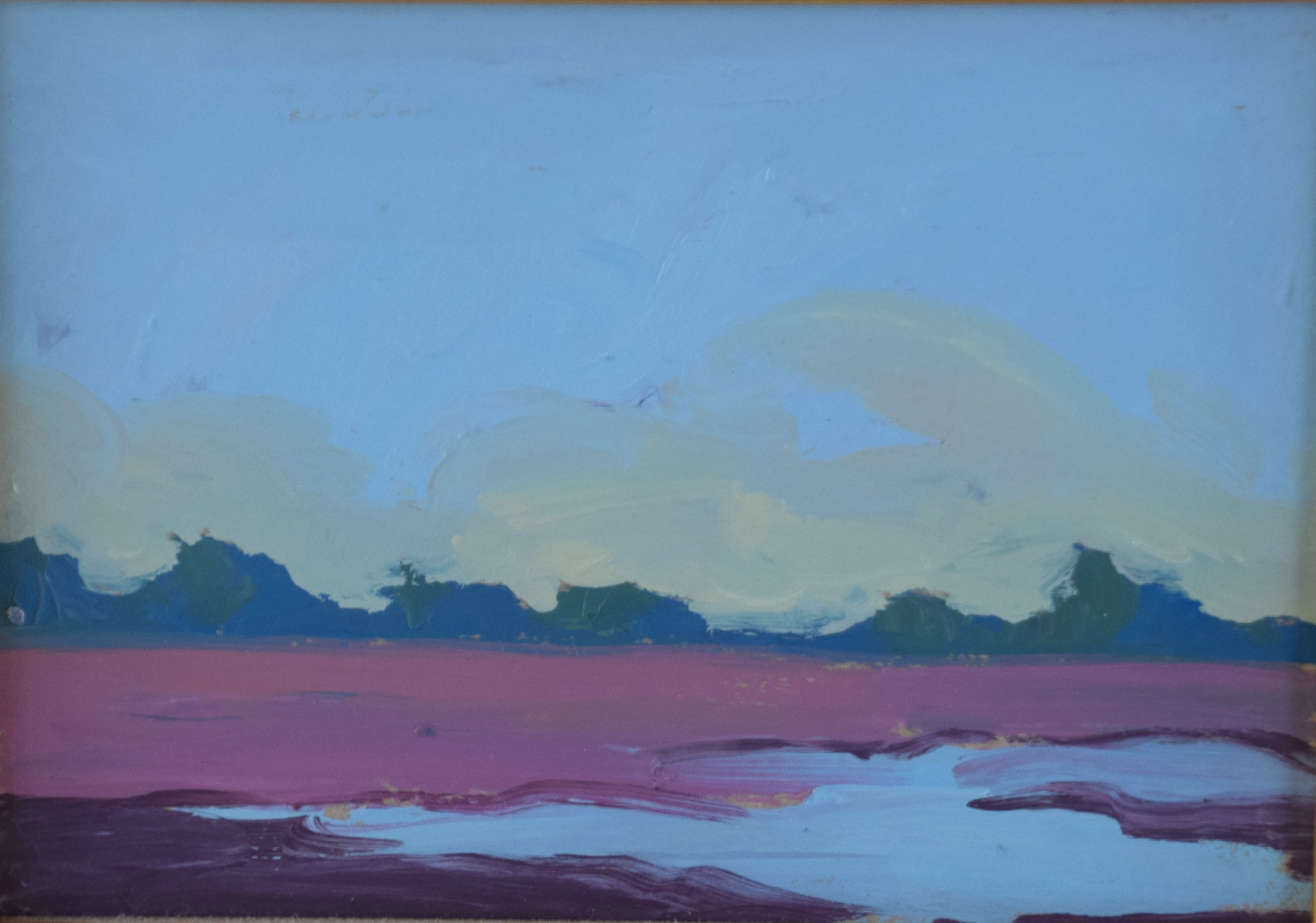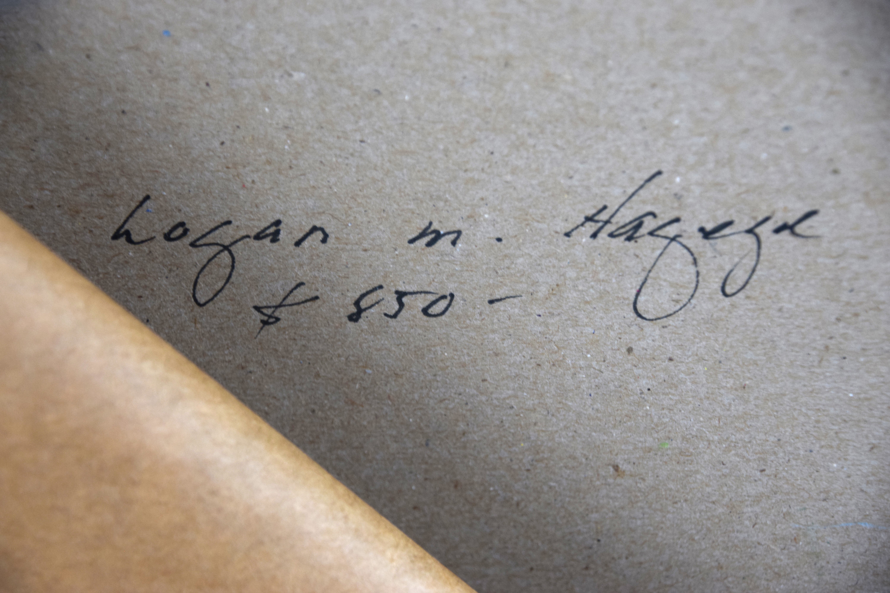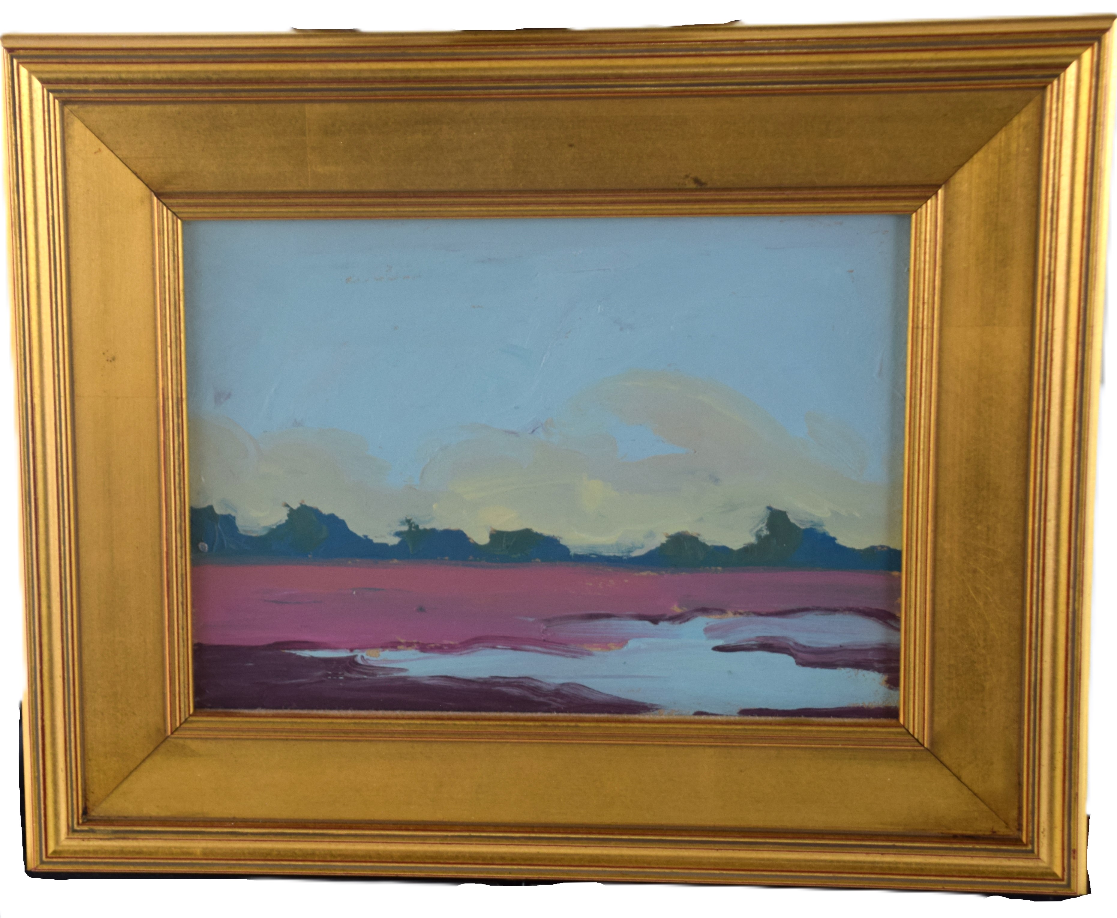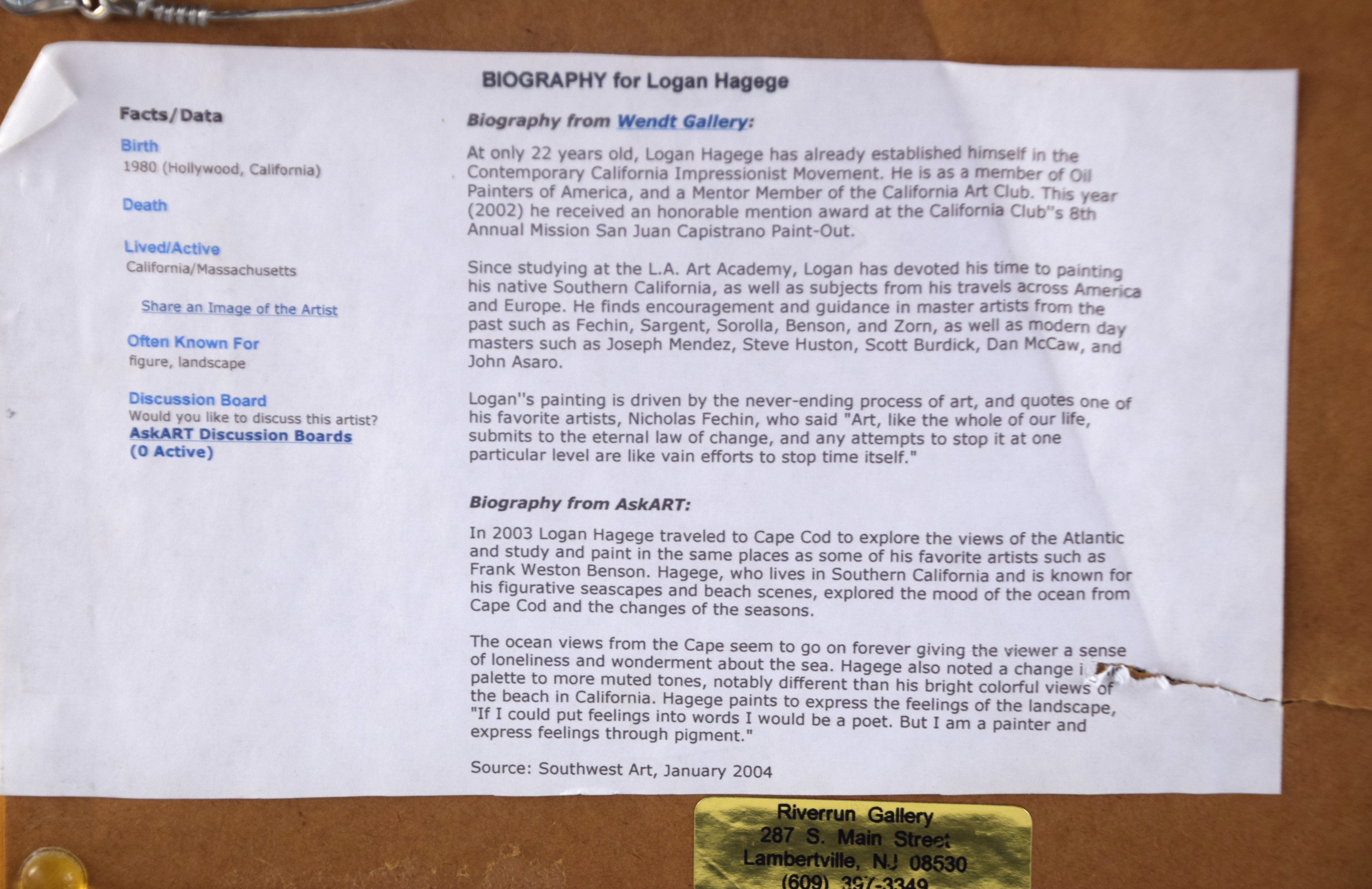 Framed oil on board impressionist landscape by Logan Hagege, signed on back. Logan Maxwell Hagege (Born 1980) works in California and Arizona and is known for Indian figures and landscape painting. Logan has frequently visited Cape Cod and this landscape probably reflects such a visit. Dimensions: 5 3/4″ x 8″ Image size