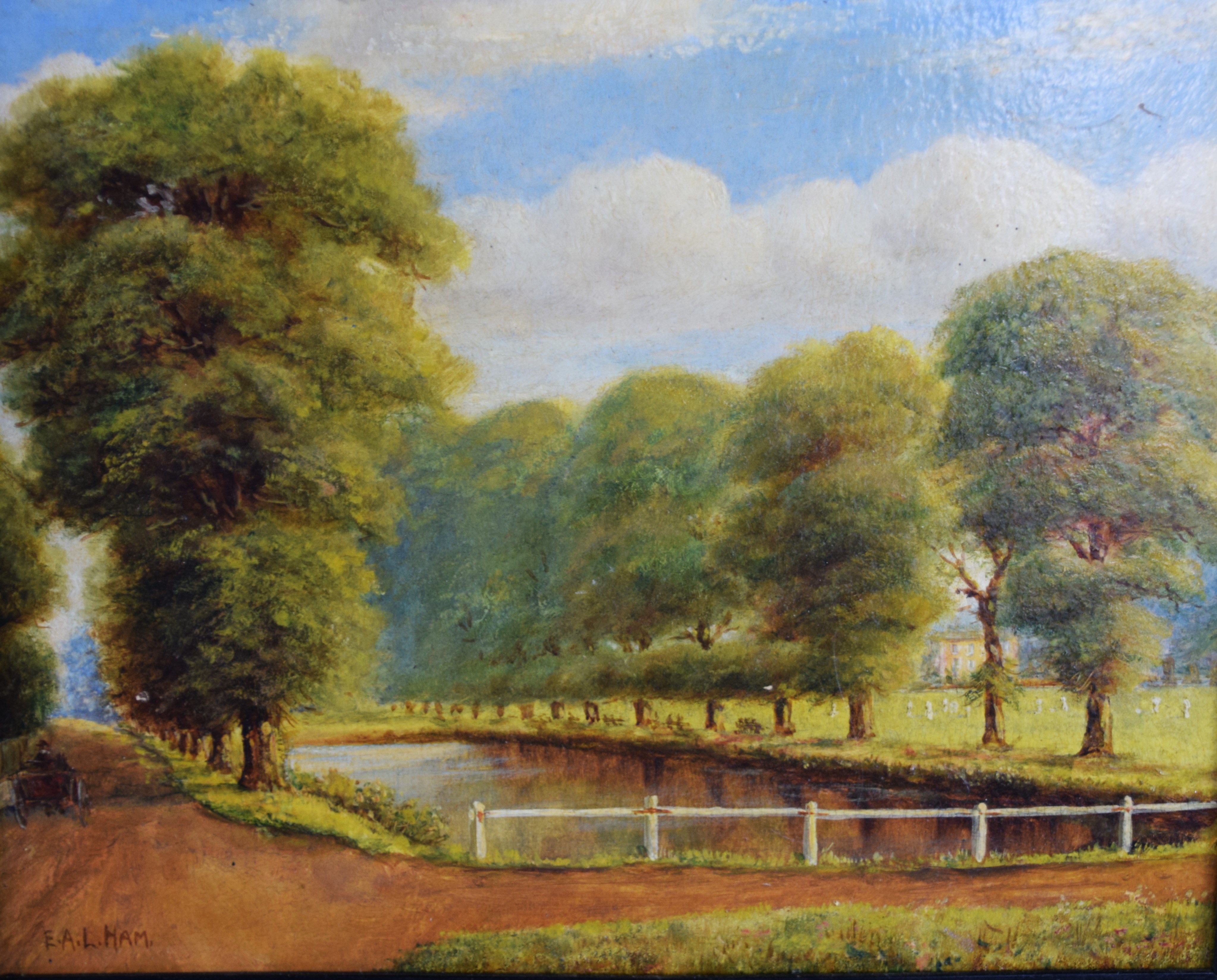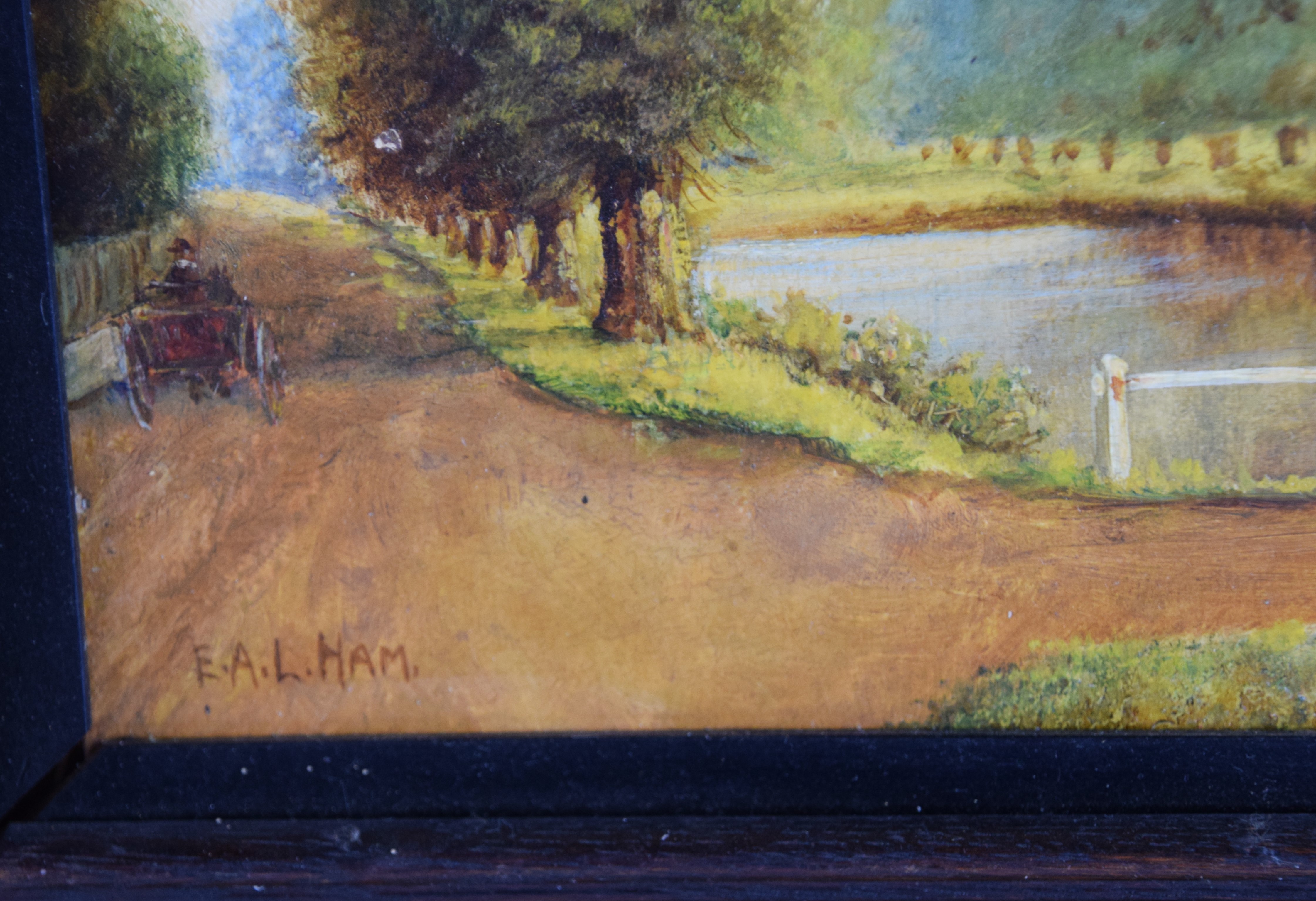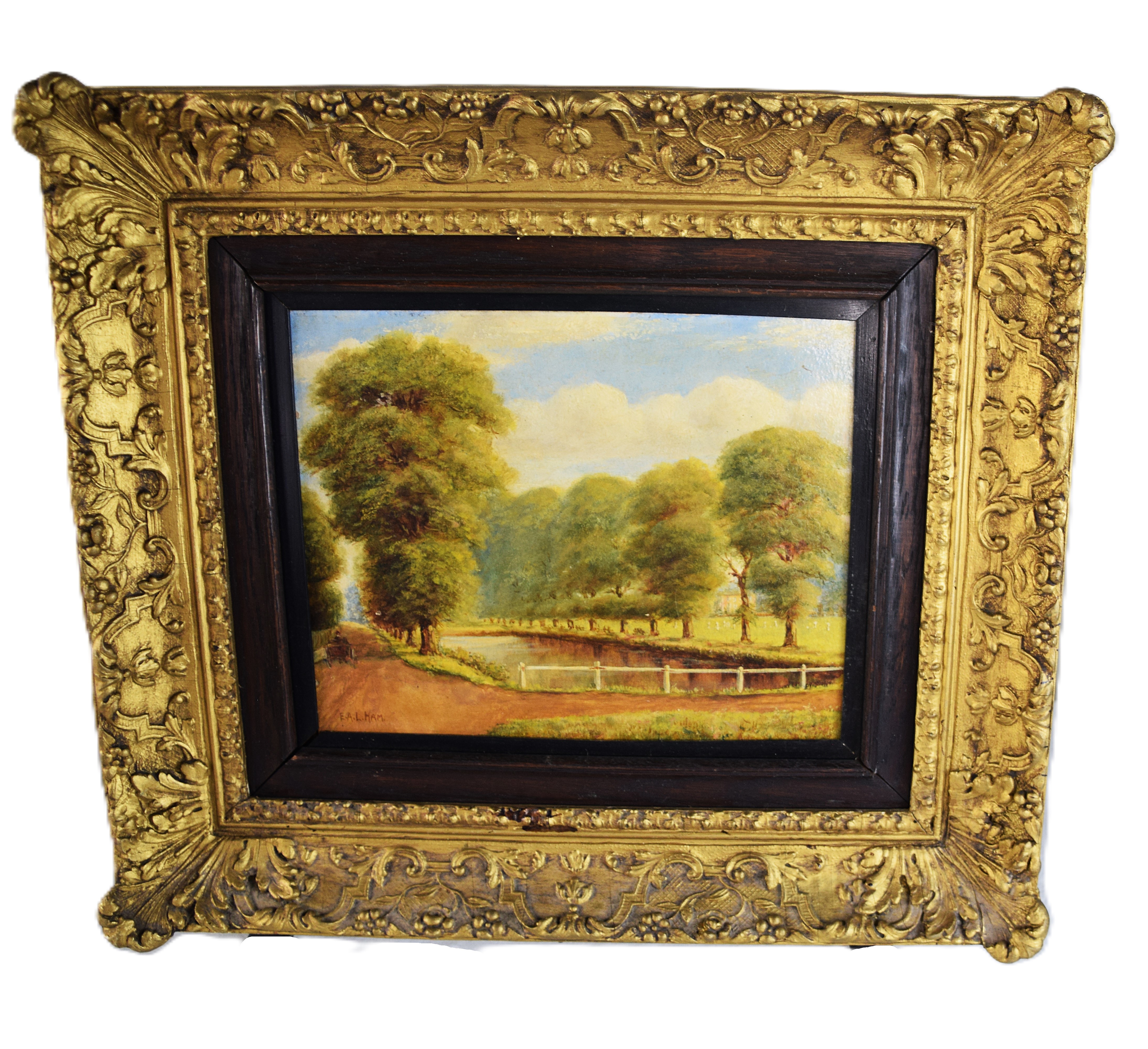 Framed and signed oil on canvas landscape with pond and dirt road in Massachusetts, painted in 1895. Elmer L. Ham (1884 – 1978) worked in Massachusetts and is known for landscapes and still life paintings. Dimensions (8.5″ x 11.5″ Image size