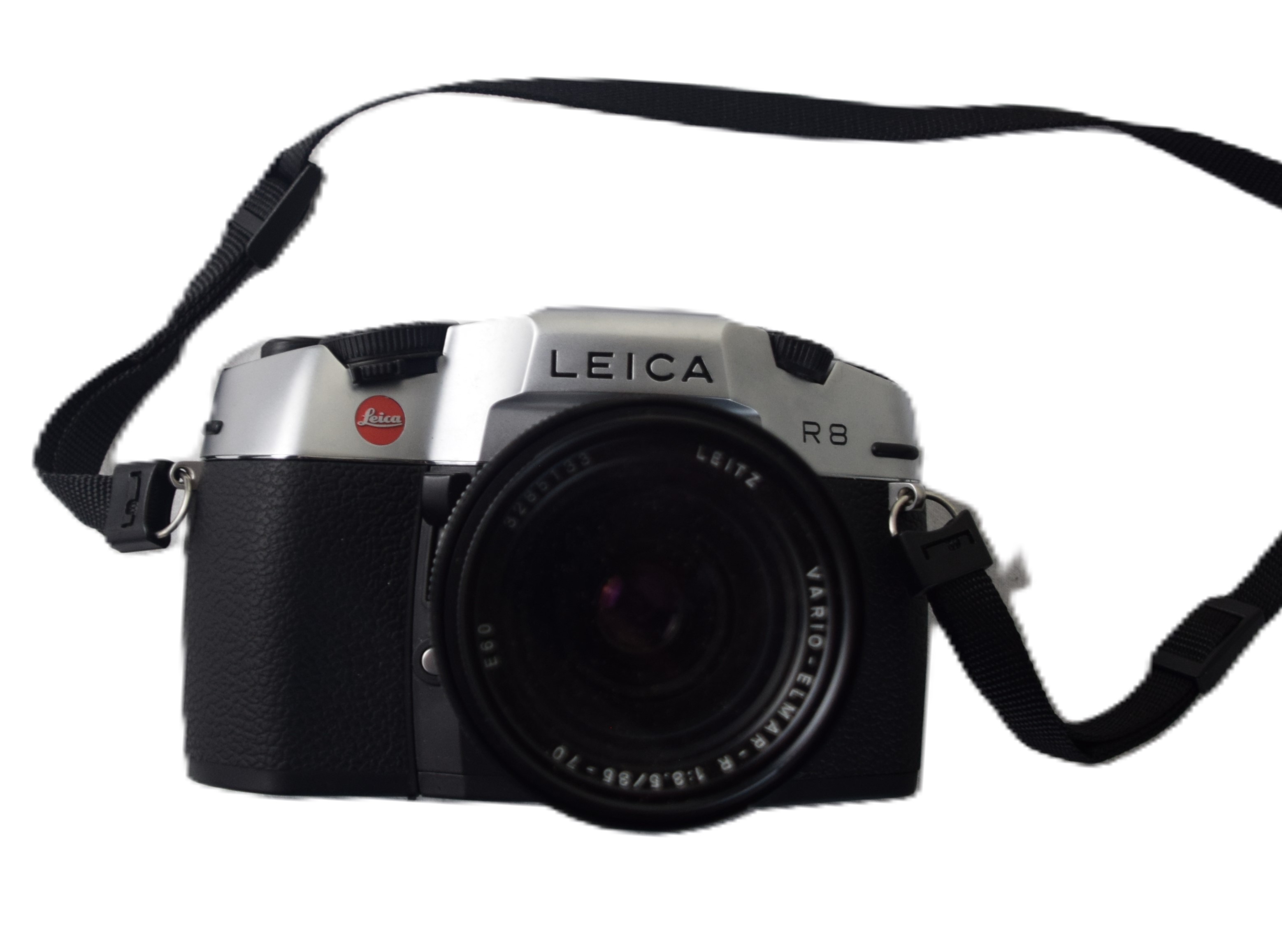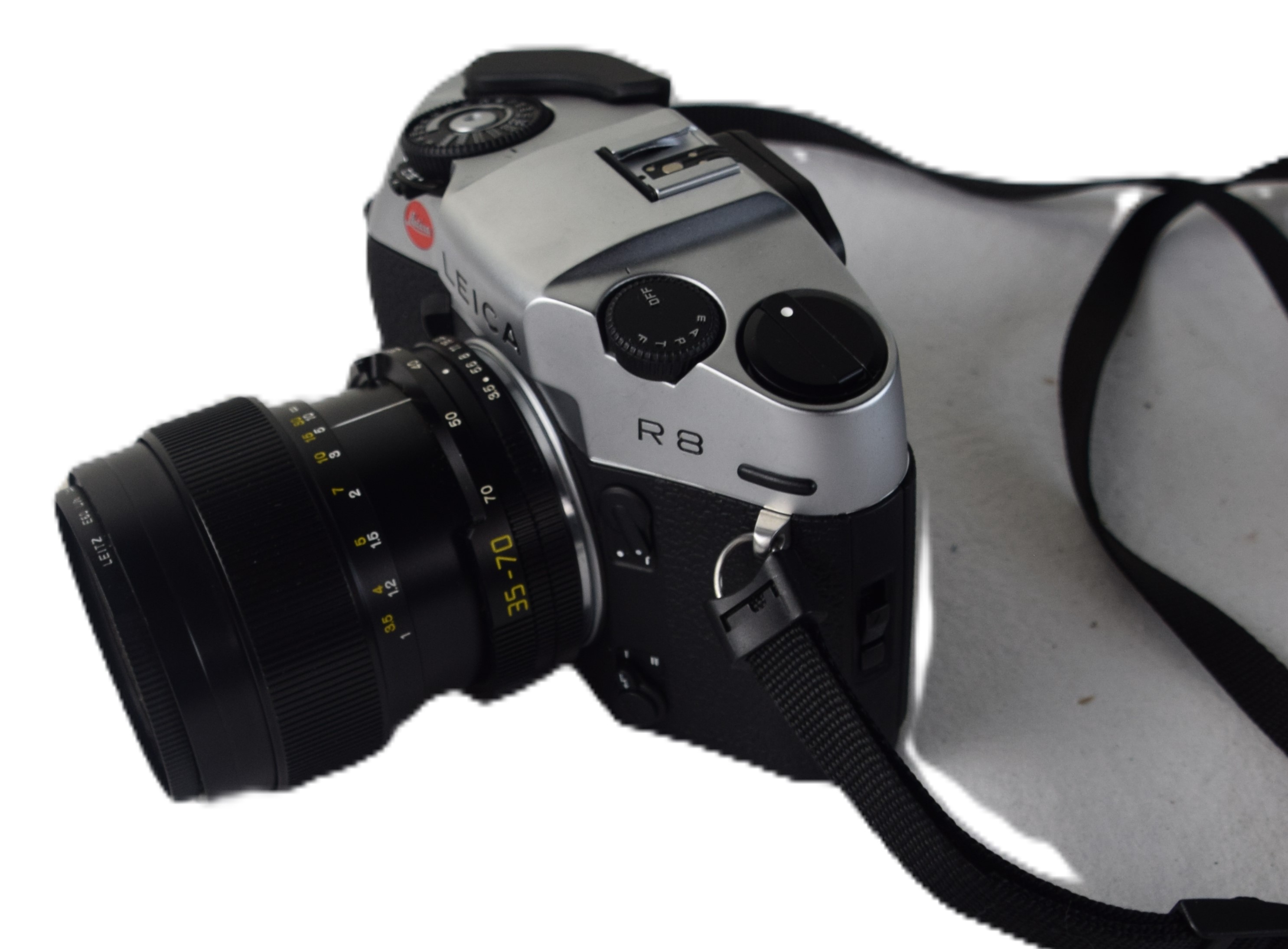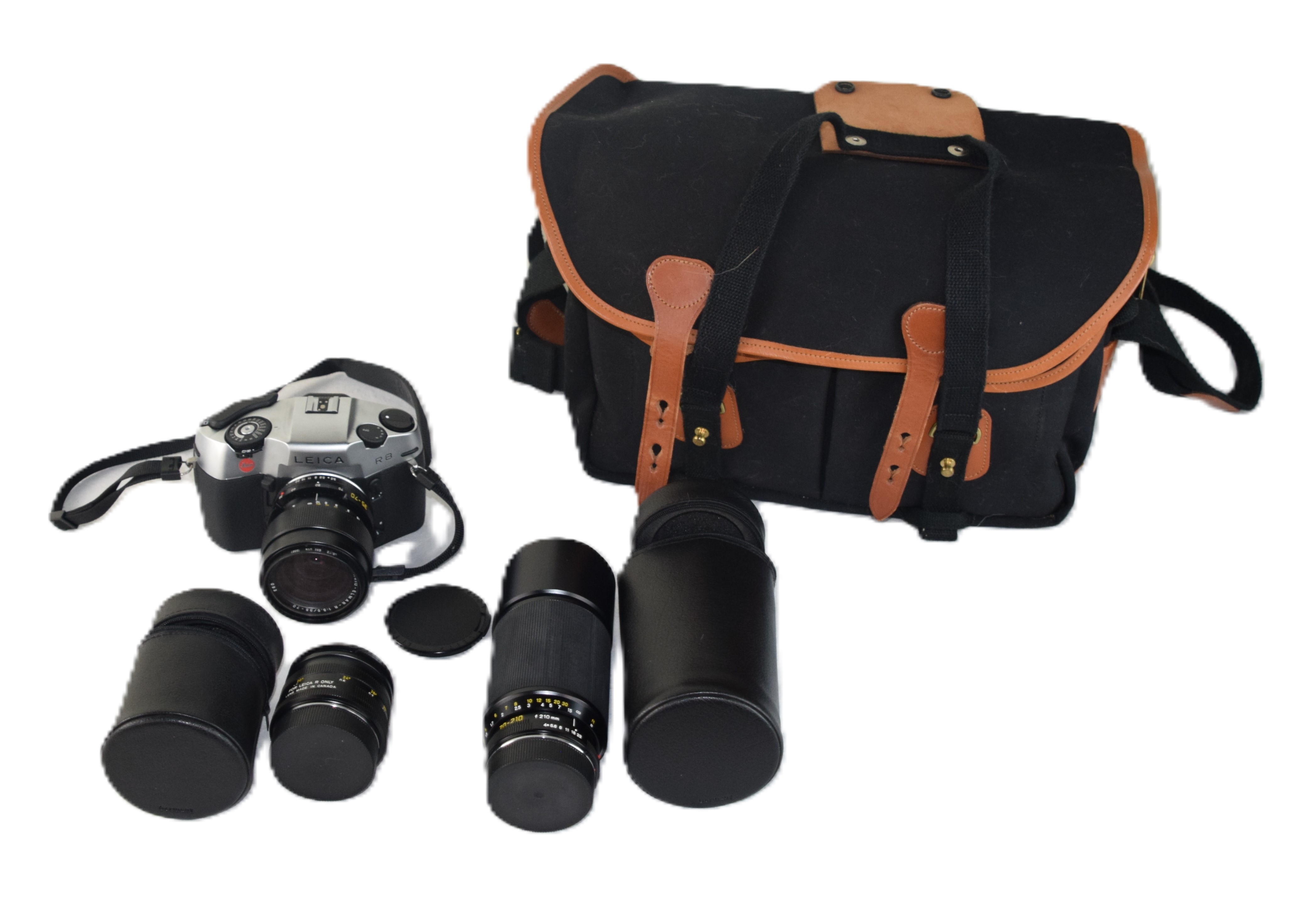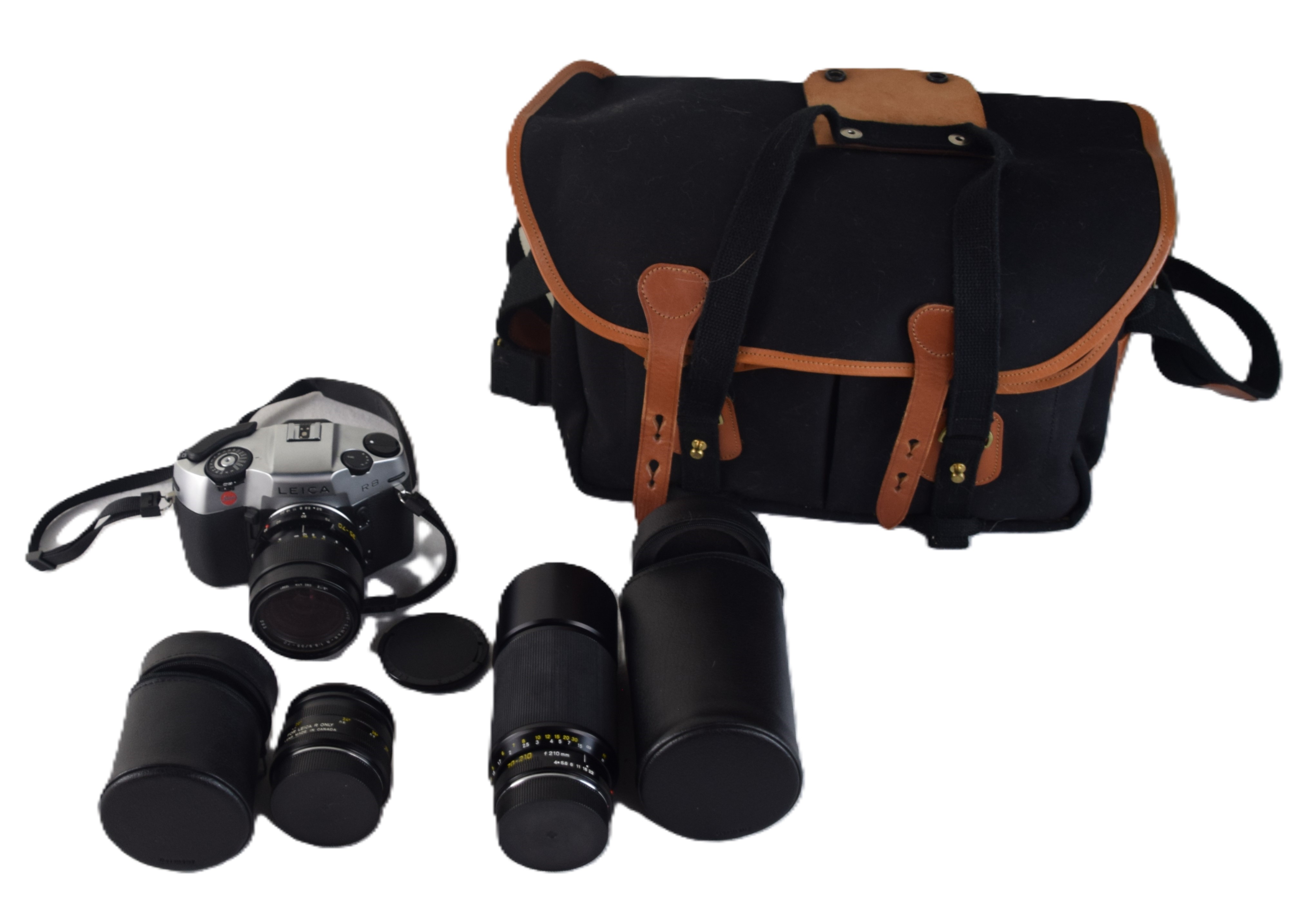 Leica R8 camera together with two other lenses in leather cases along with a camera case.