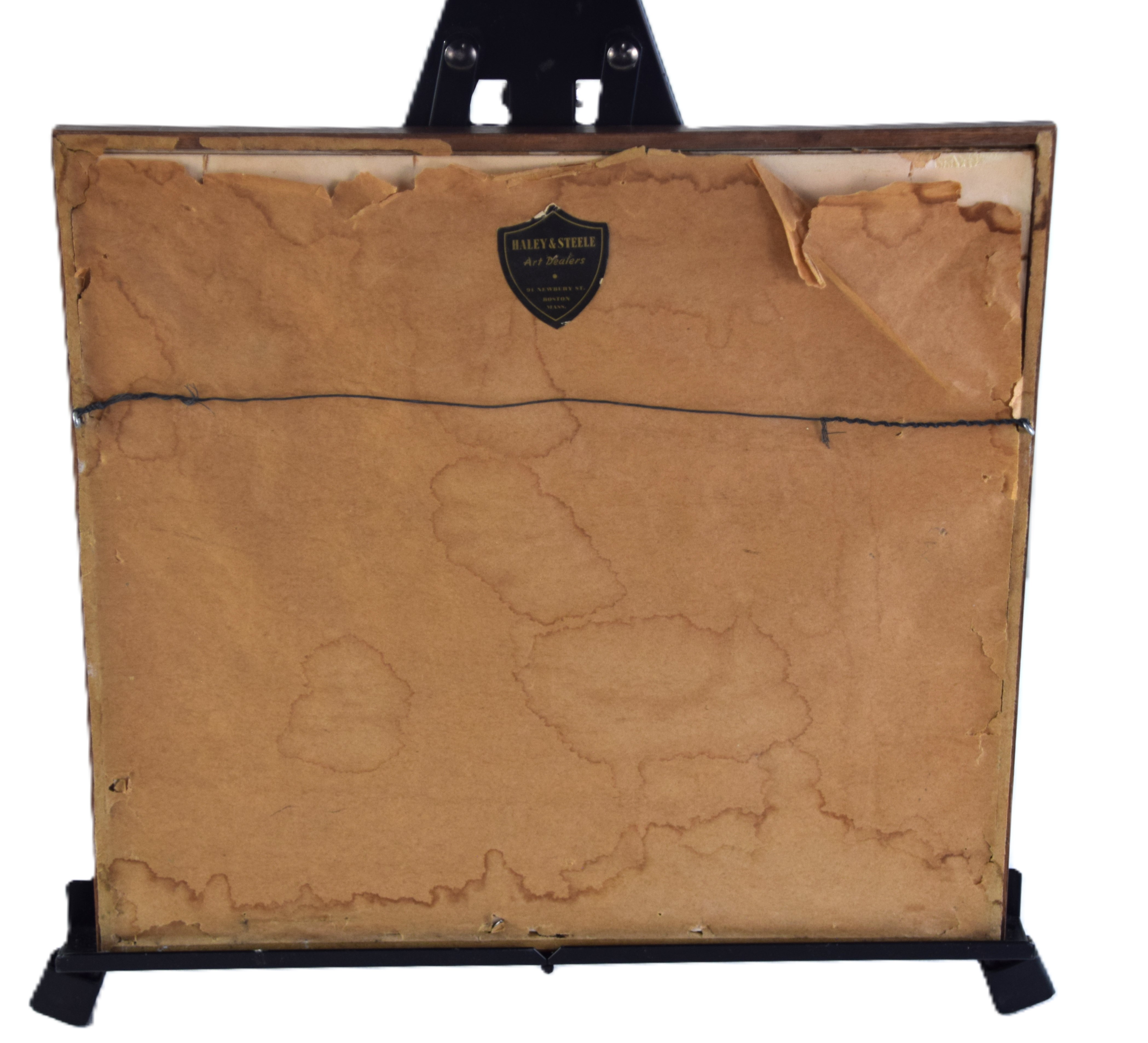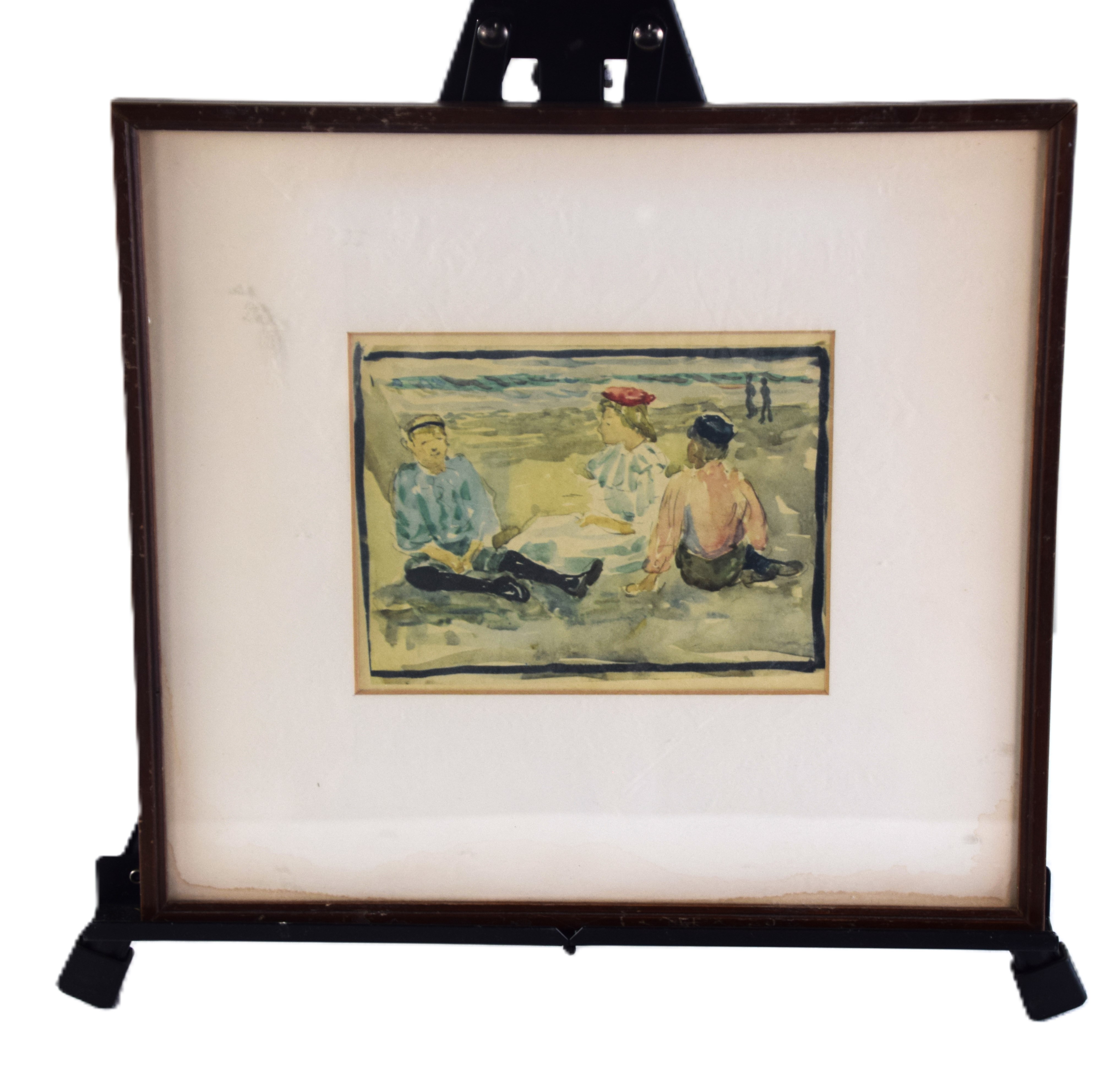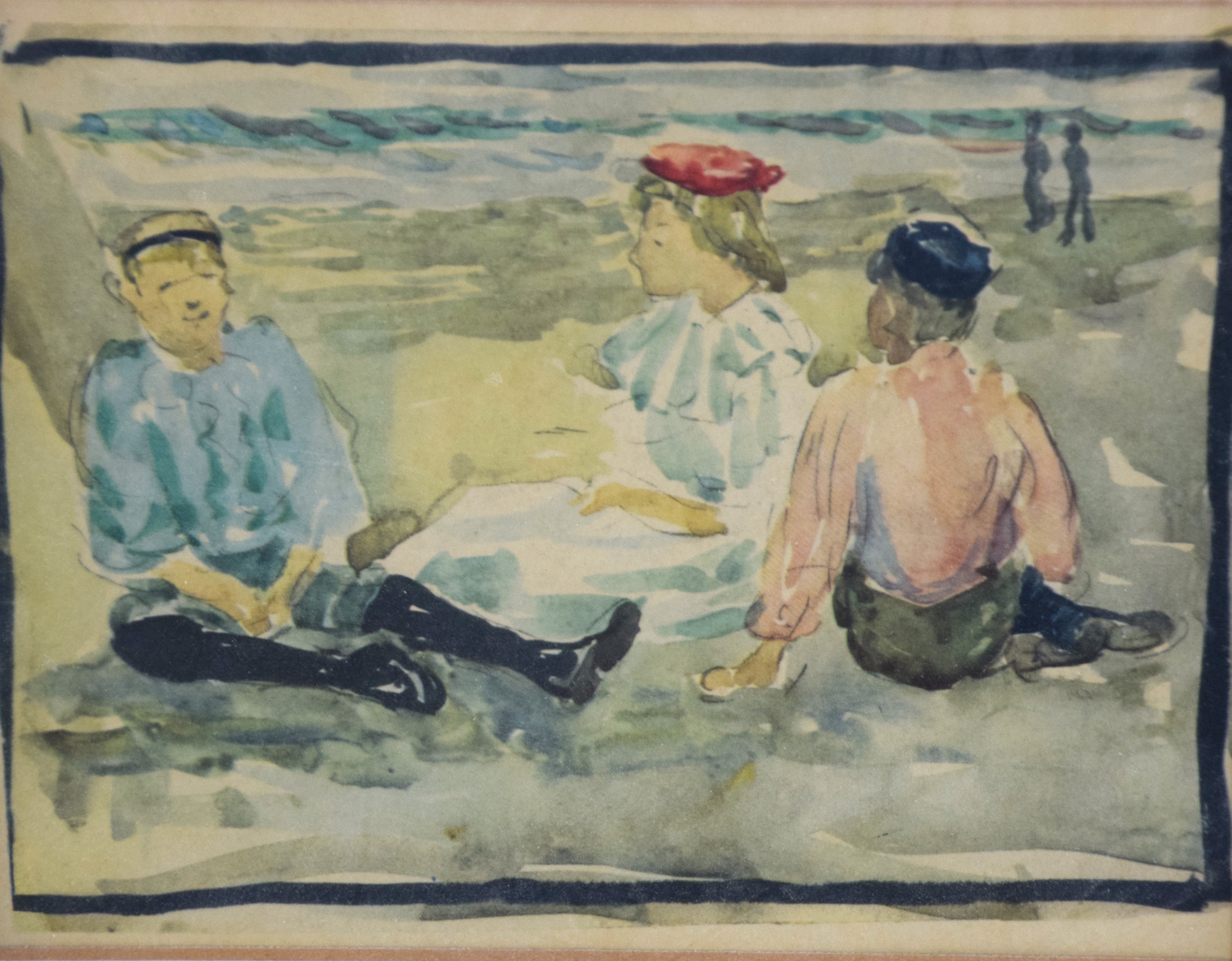 Framed watercolor of a beach scene with three children. Attributed to Maurice Brazil Pendergast (1858-1924) became a leading name in modernist American art and is known for his depictions of urban leisure-class people enjoying themselves in idyll landscapes and beach scenes. Dimensions: 5″ x 6.5″