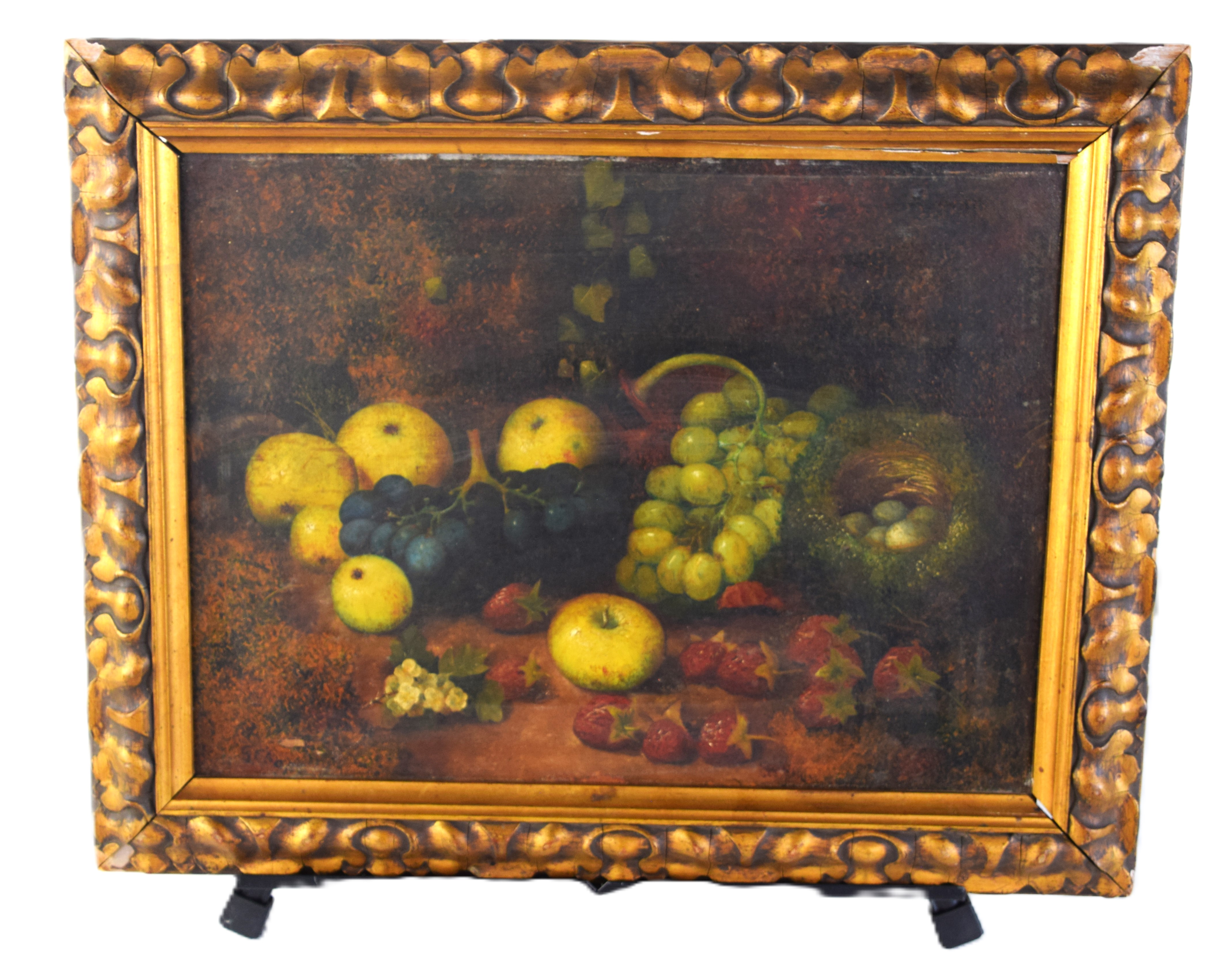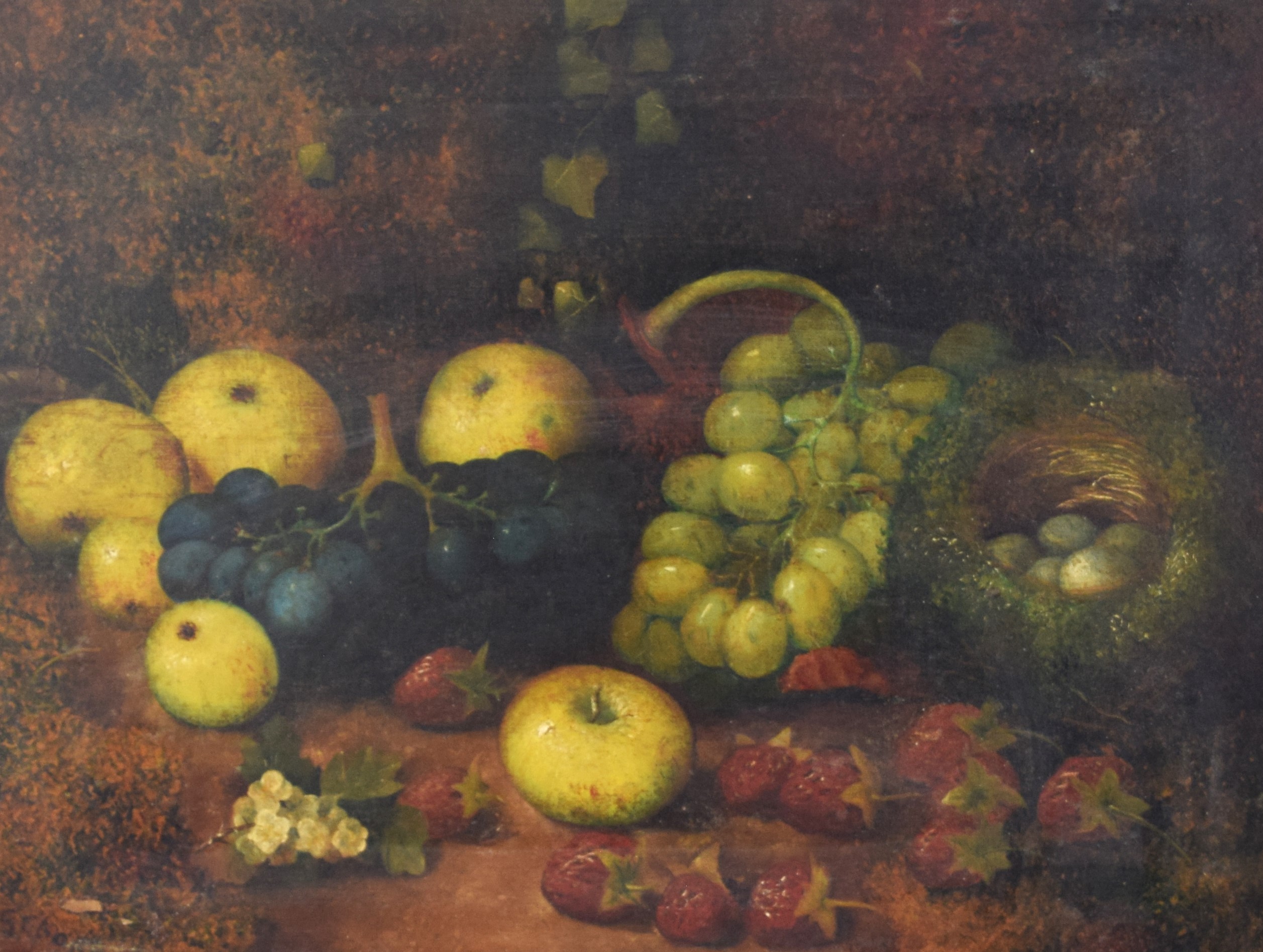 Framed 19th century still life with grapes and apples, probably English. Dimensions: 12″ x 15″ Image size