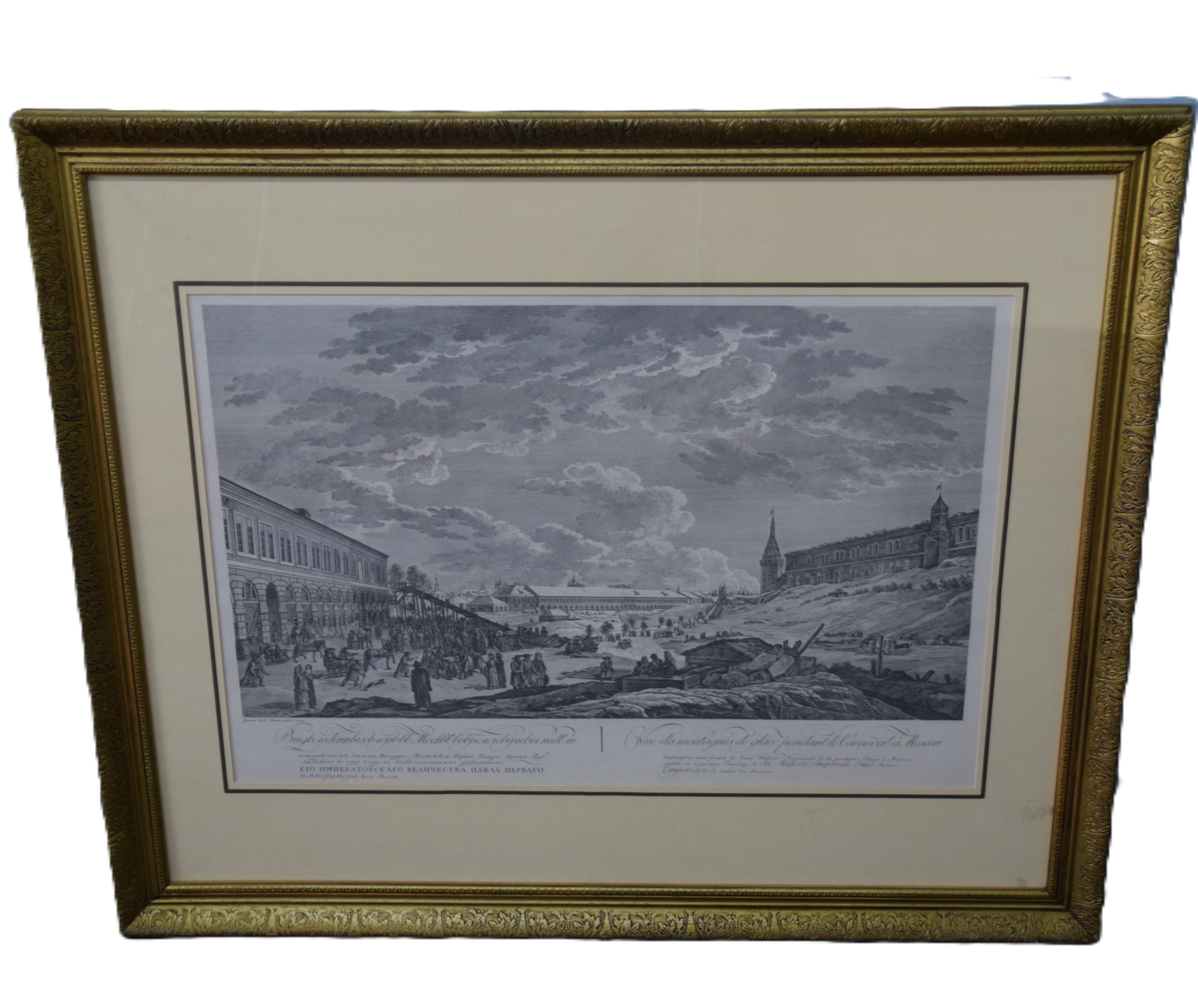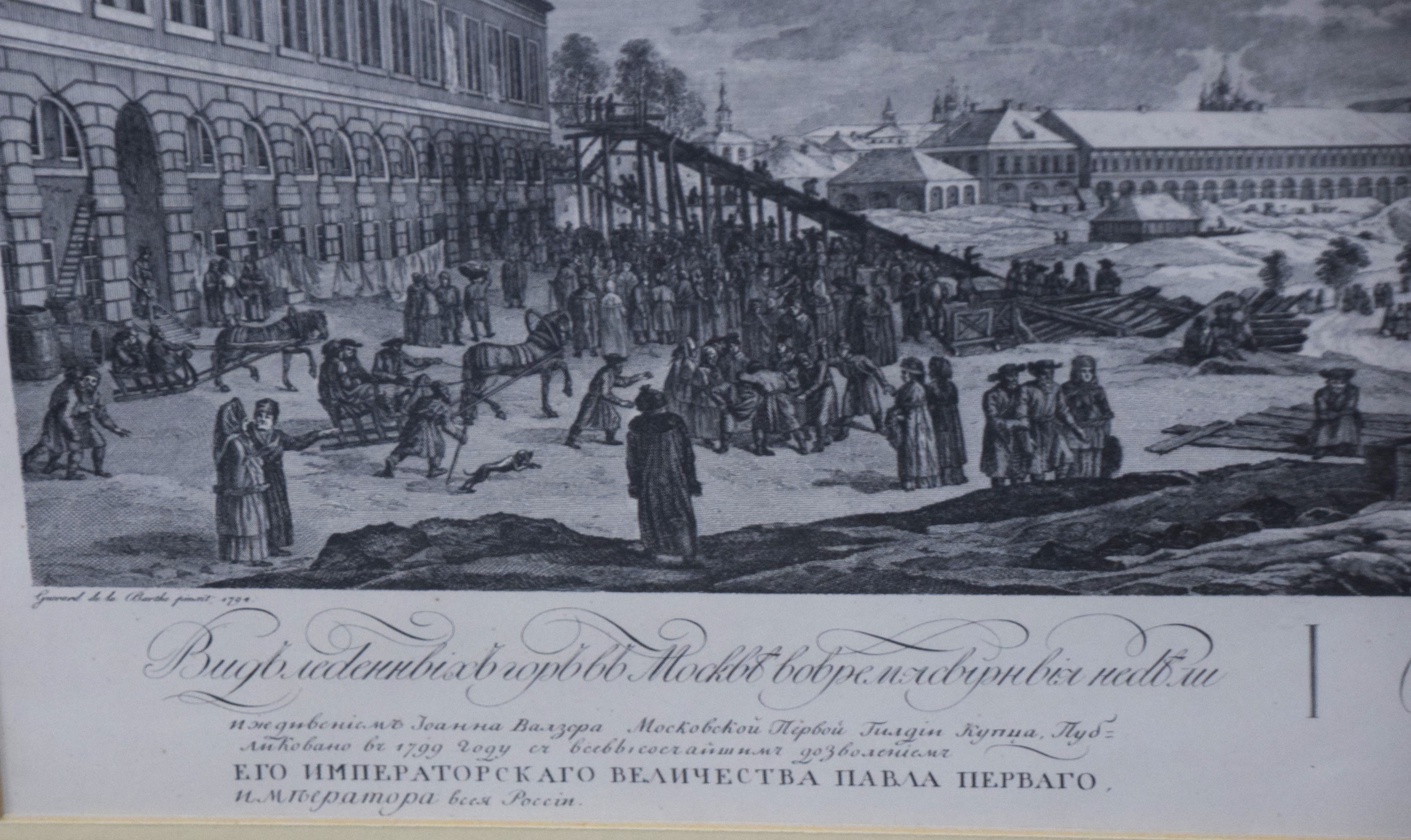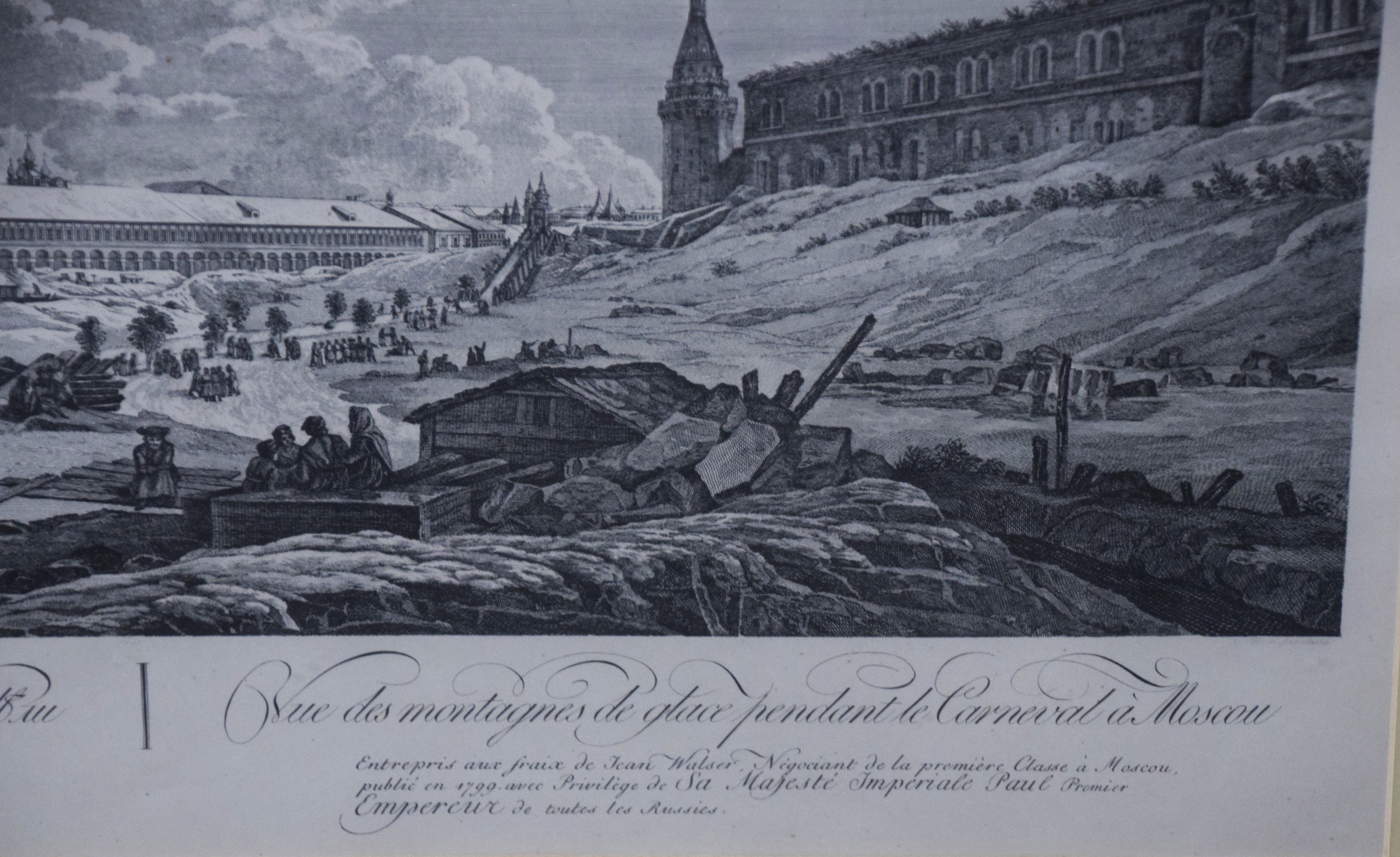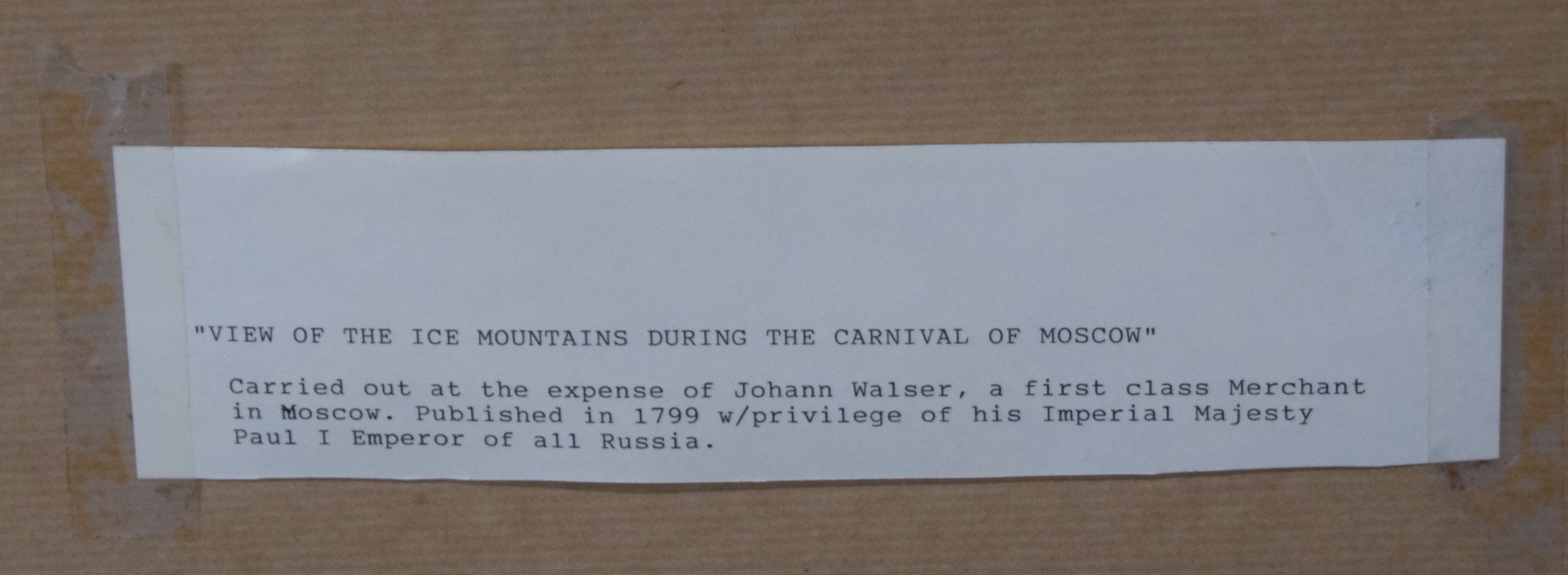 Framed 1799 Russian engraving titled “The View of the Ice Mountain During the Carnival of Moscow” published with the privilege of the Imperial Majesty, Paul 1, emperor. Dimensions: 30″ x 36″ Overall
