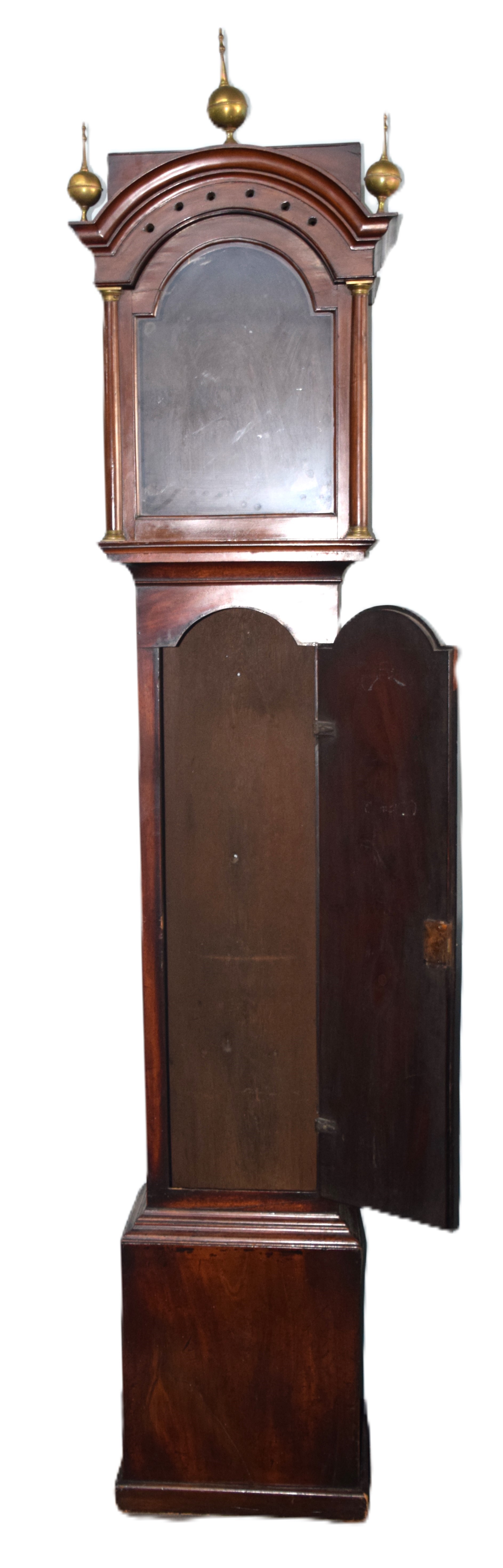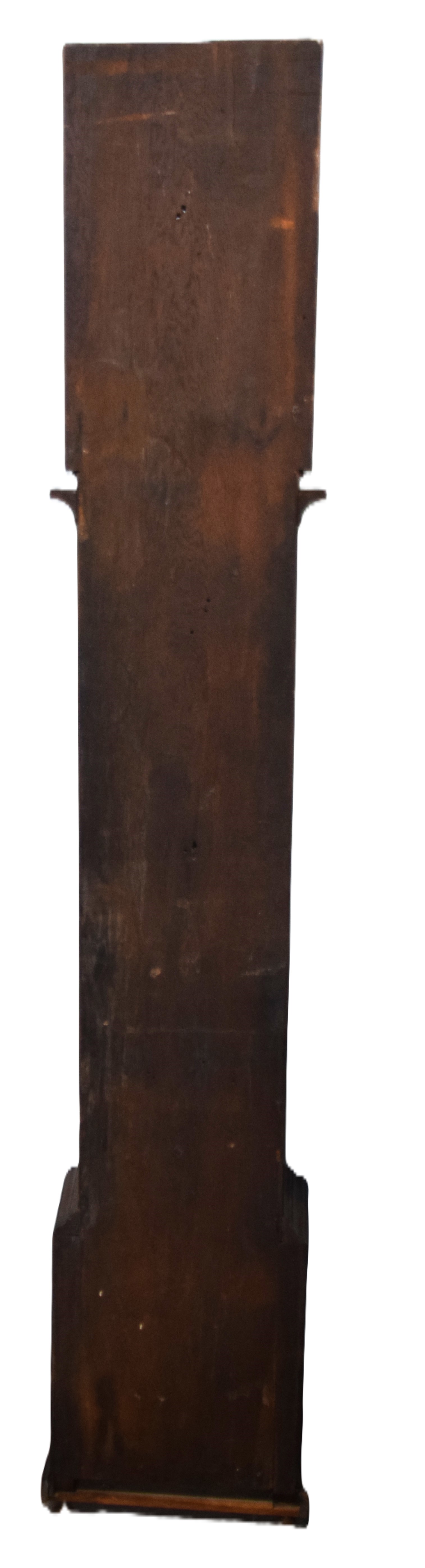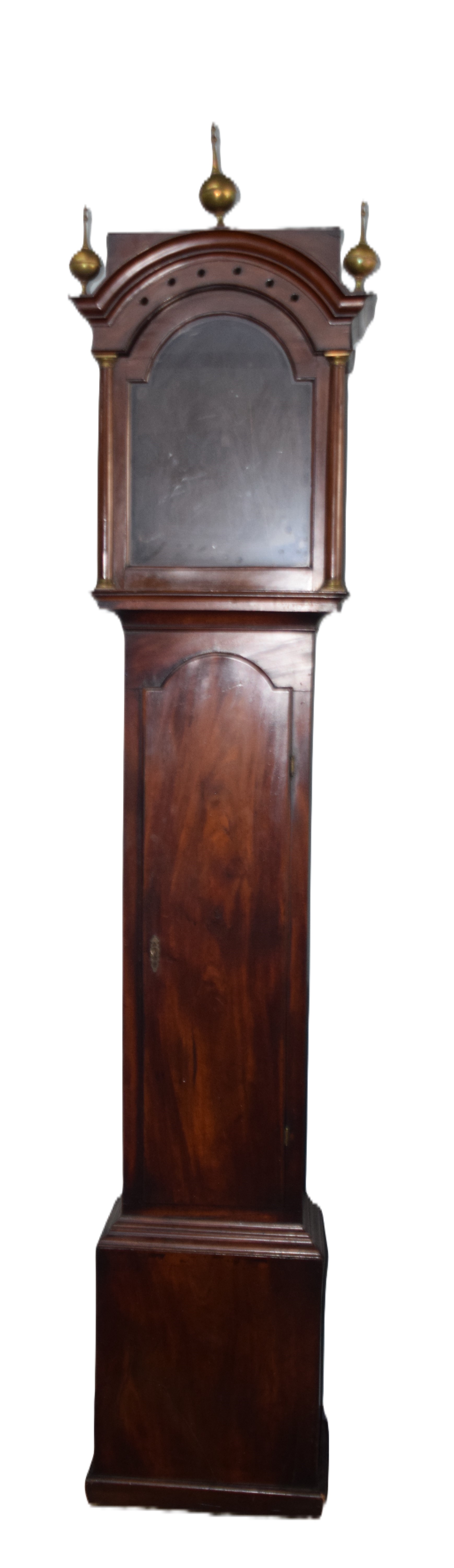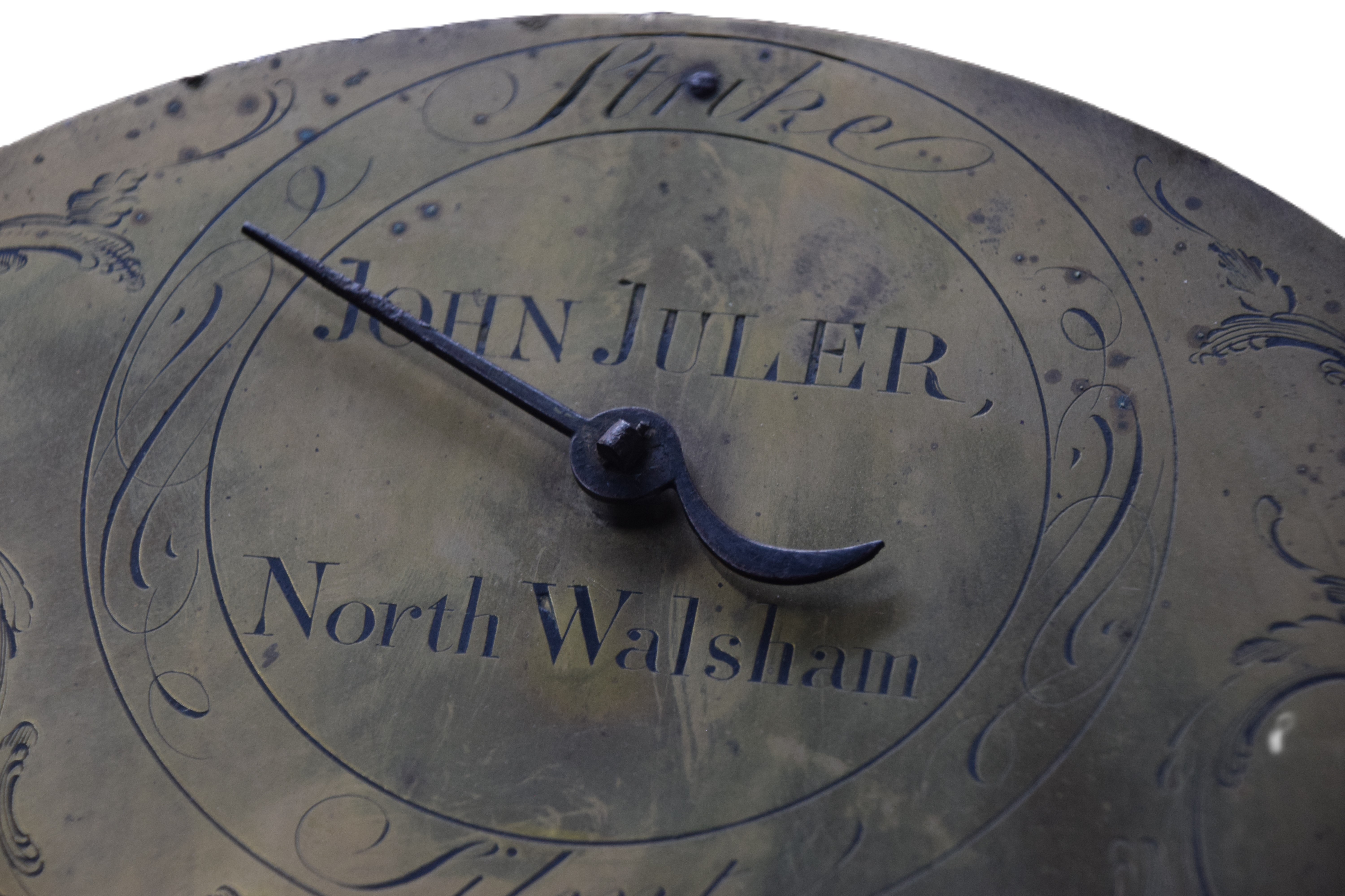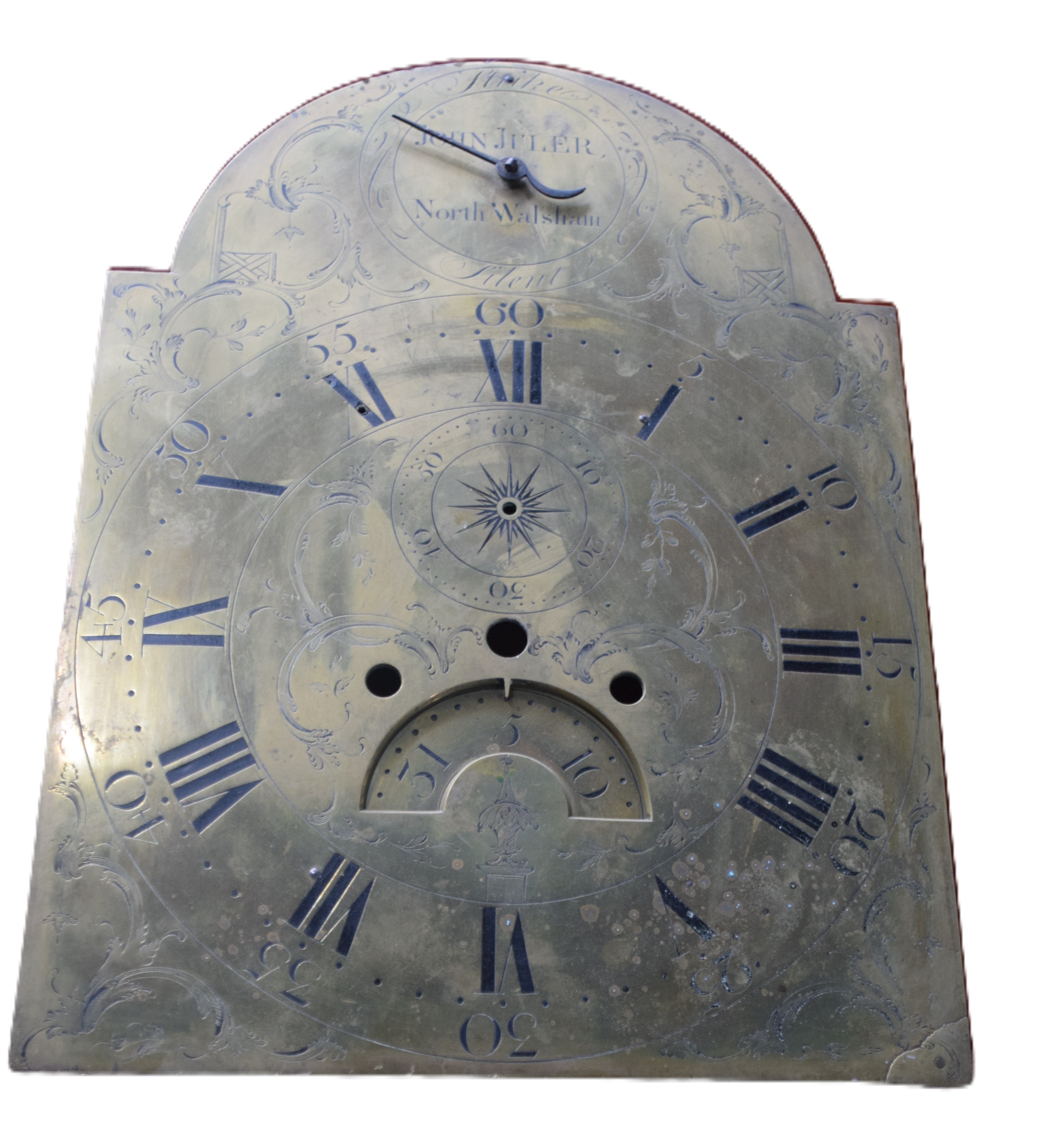 19th Century English tall clock with arch shaped bonnet, brass dial with name John Juler, North Walsham (worked from 1830-1858), Roman numerals dial, brass works, weights and pendulum, prospect door on molded base. Dimensions: 88″ H