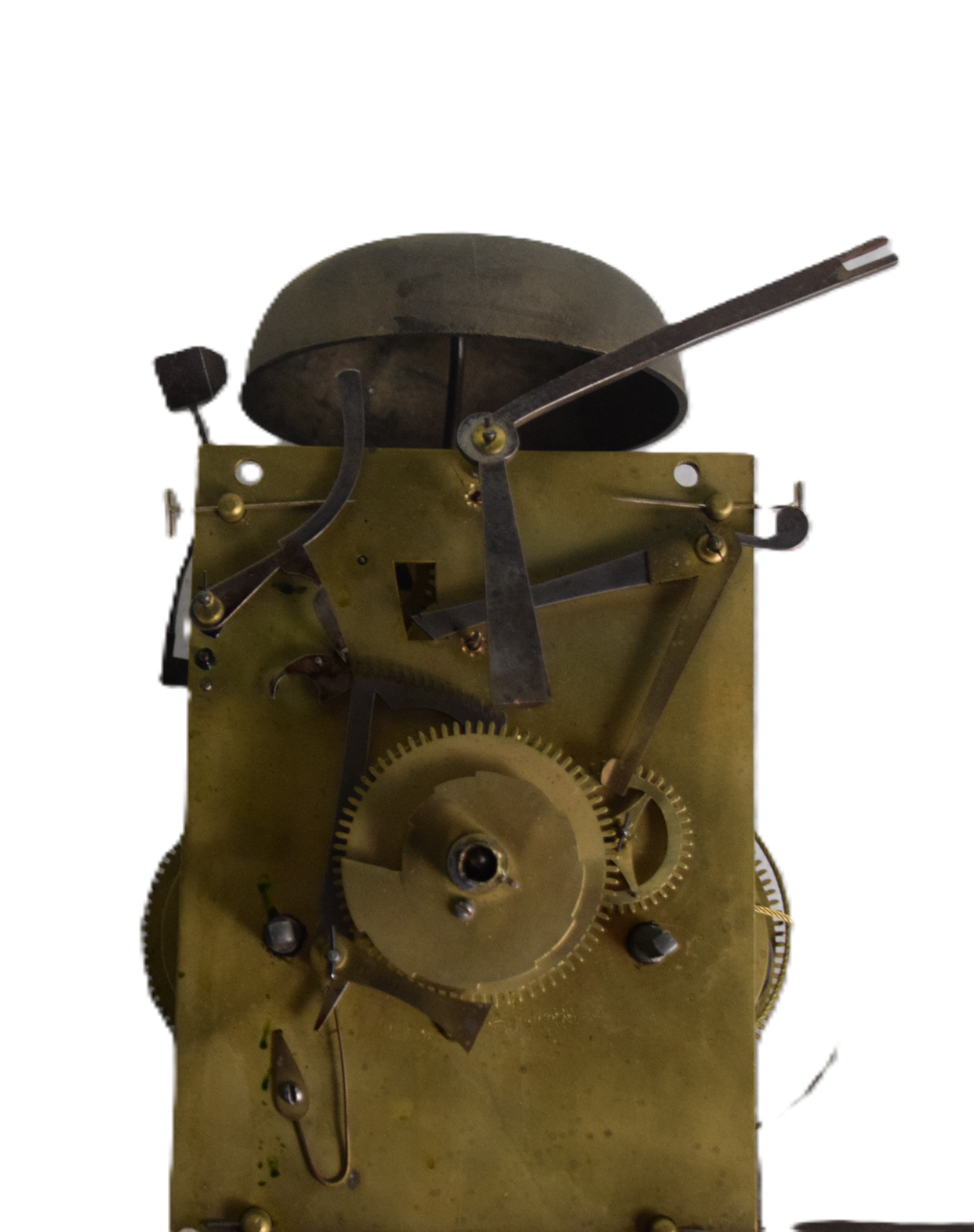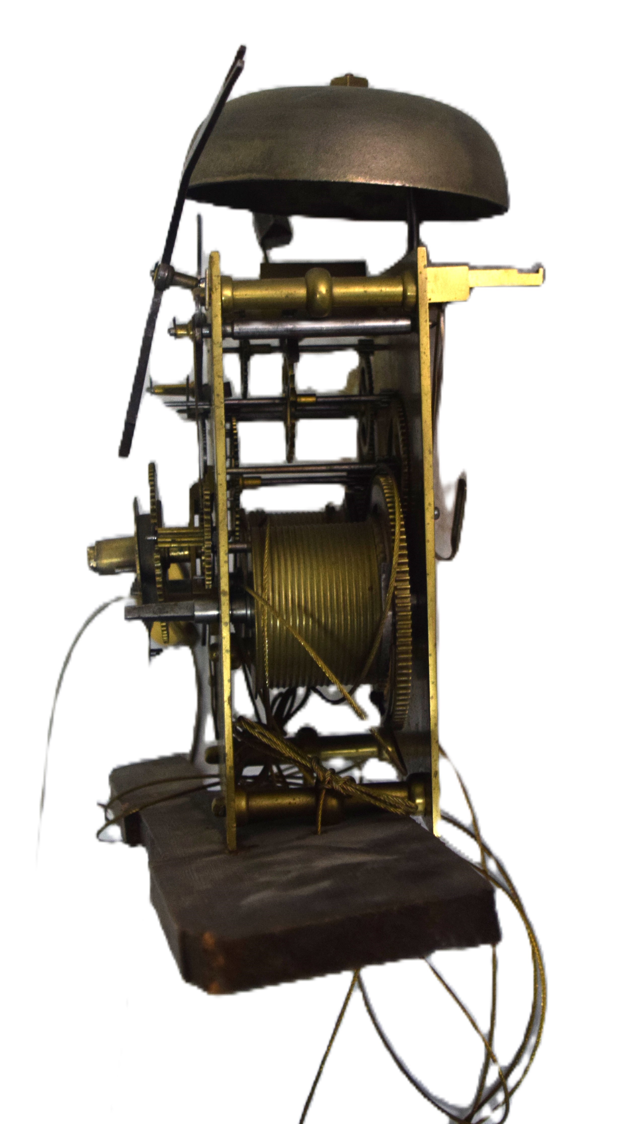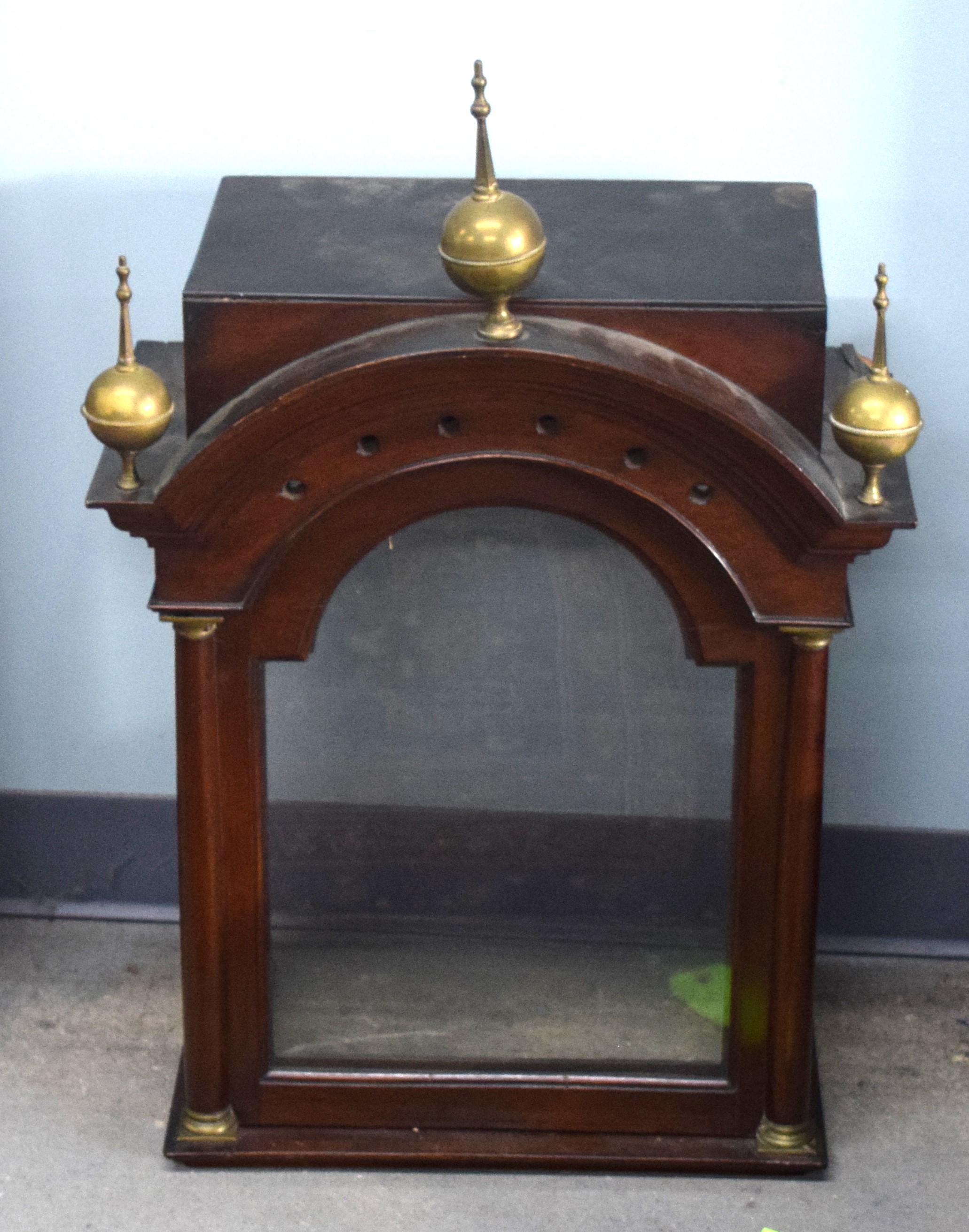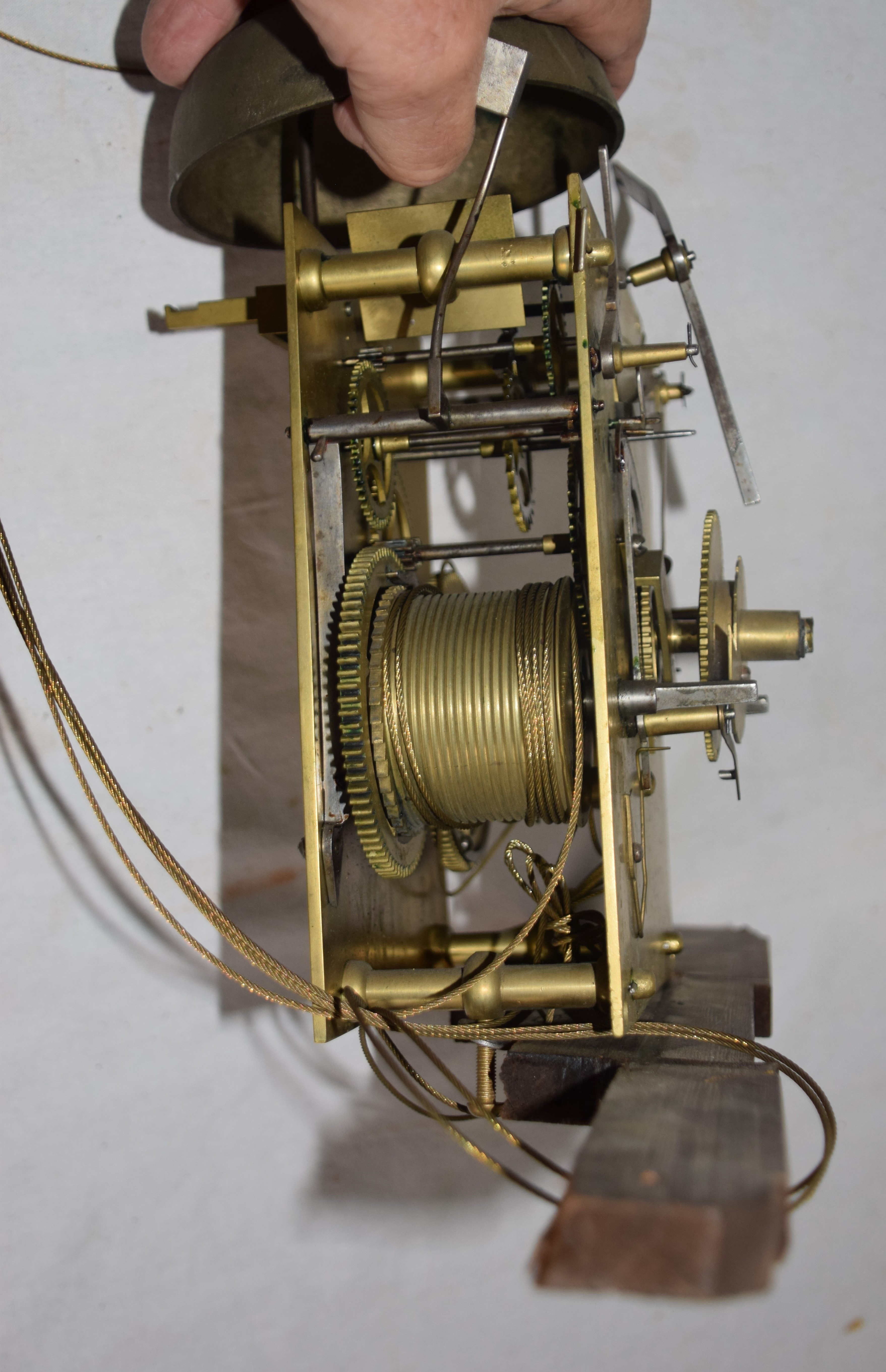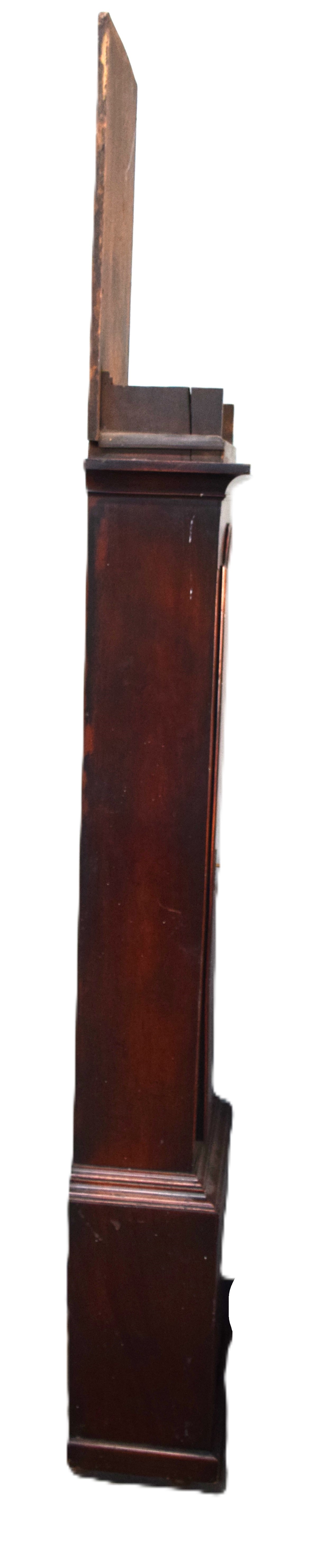 19th Century English tall clock with arch shaped bonnet, brass dial with name John Juler, North Walsham (worked from 1830-1858), Roman numerals dial, brass works, weights and pendulum, prospect door on molded base. Dimensions: 88″ H