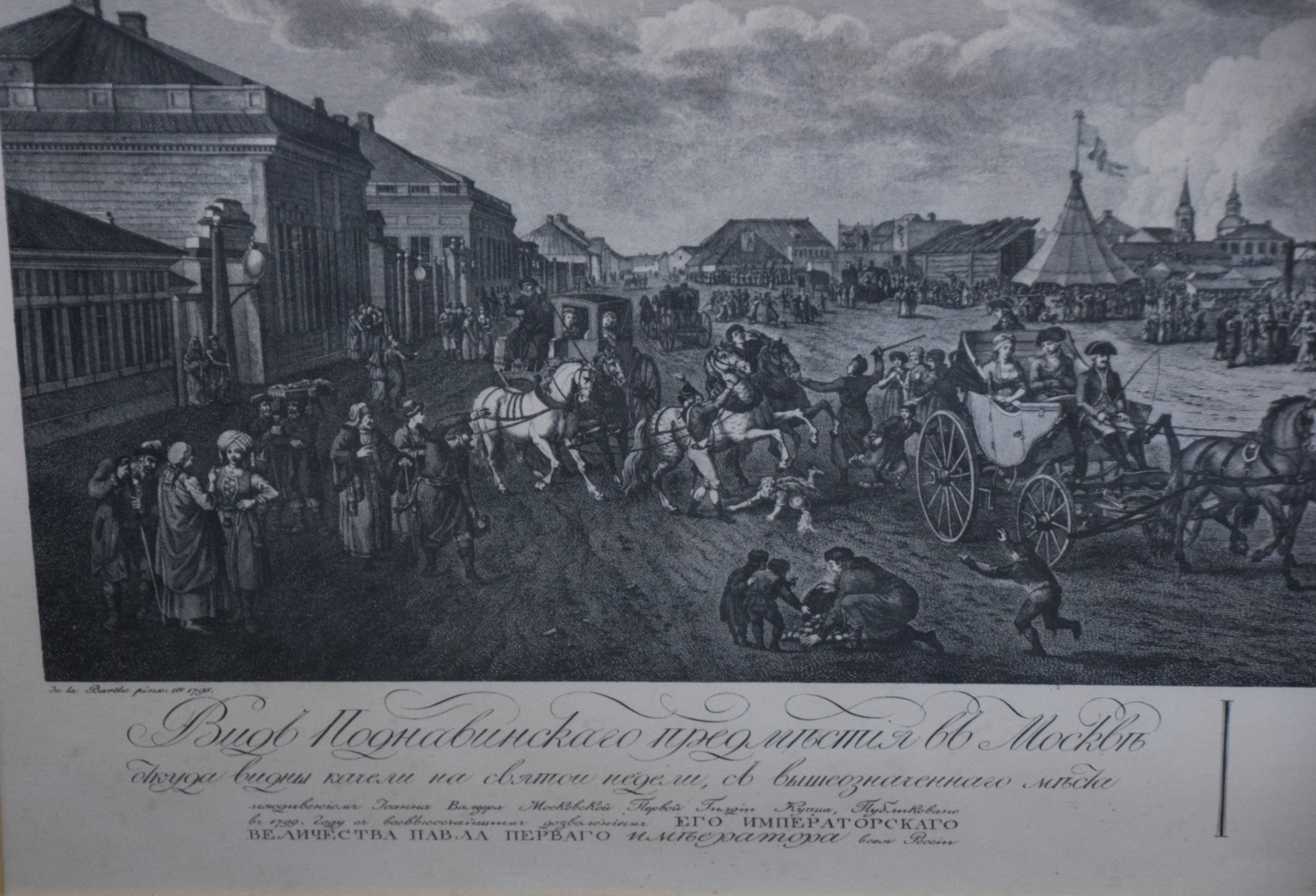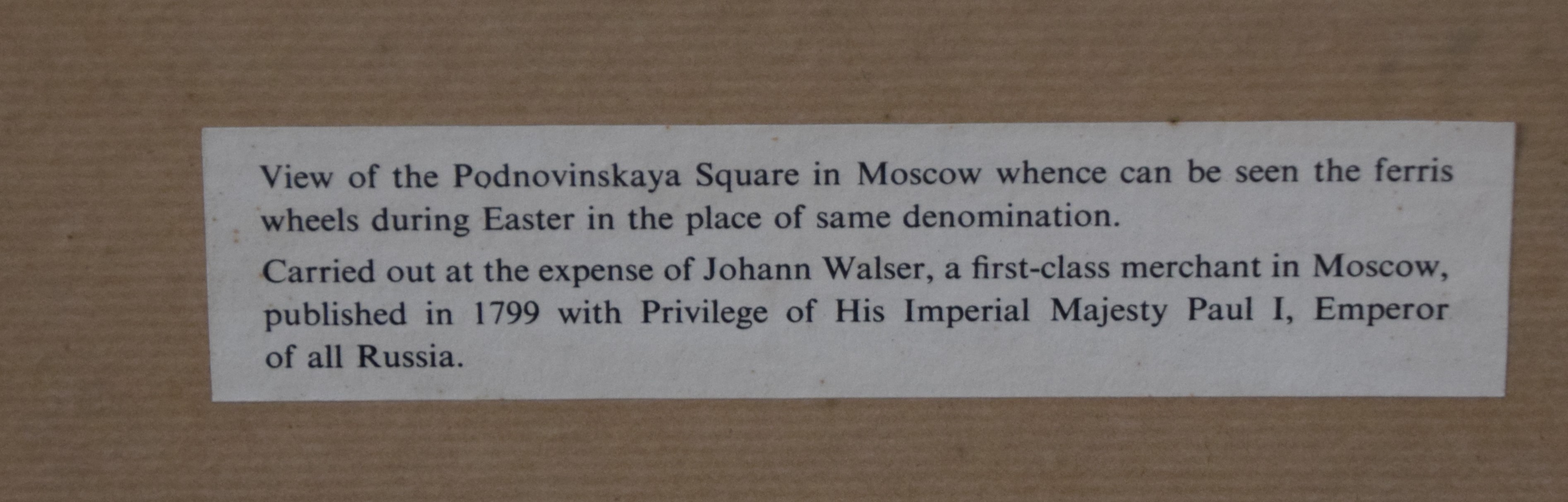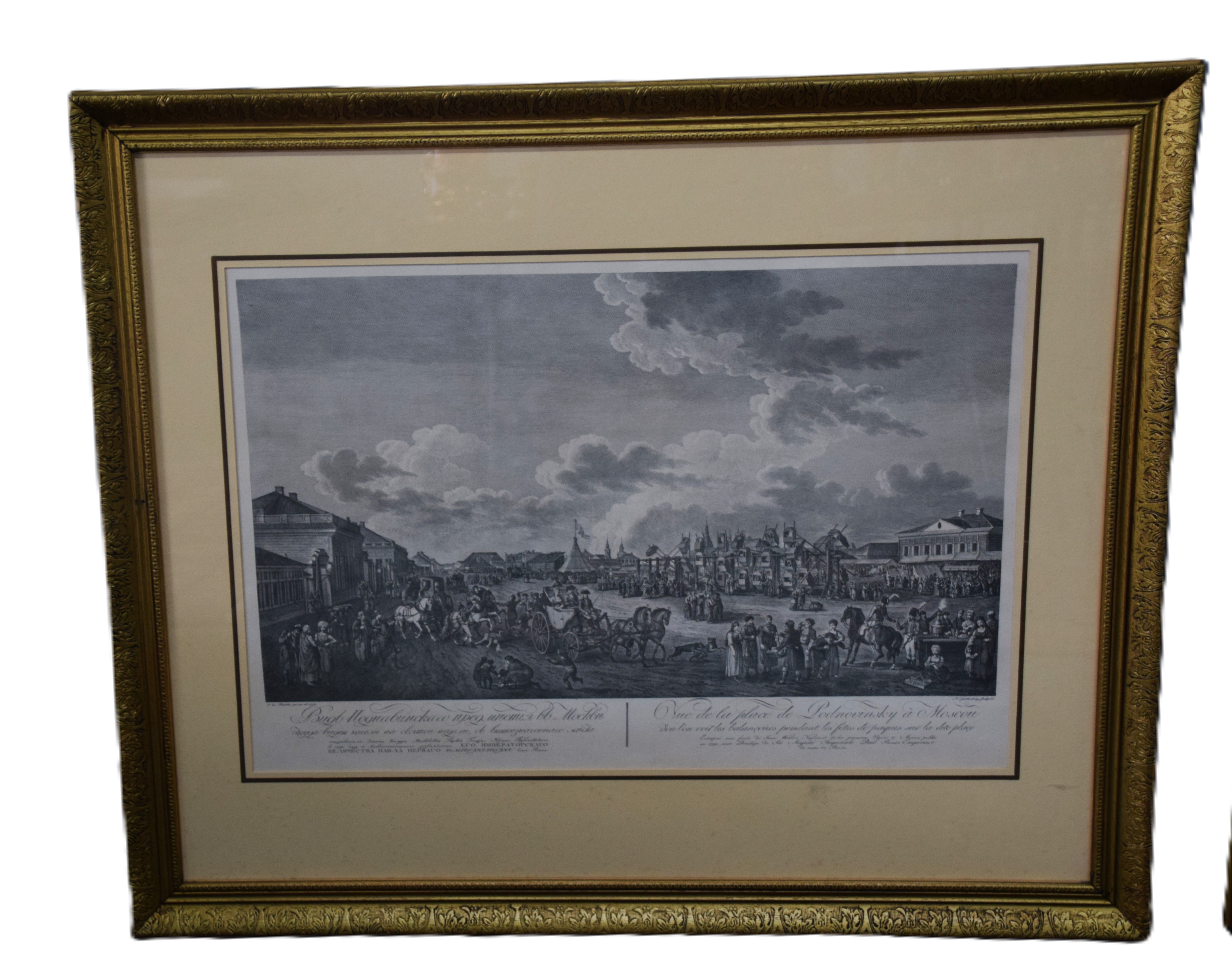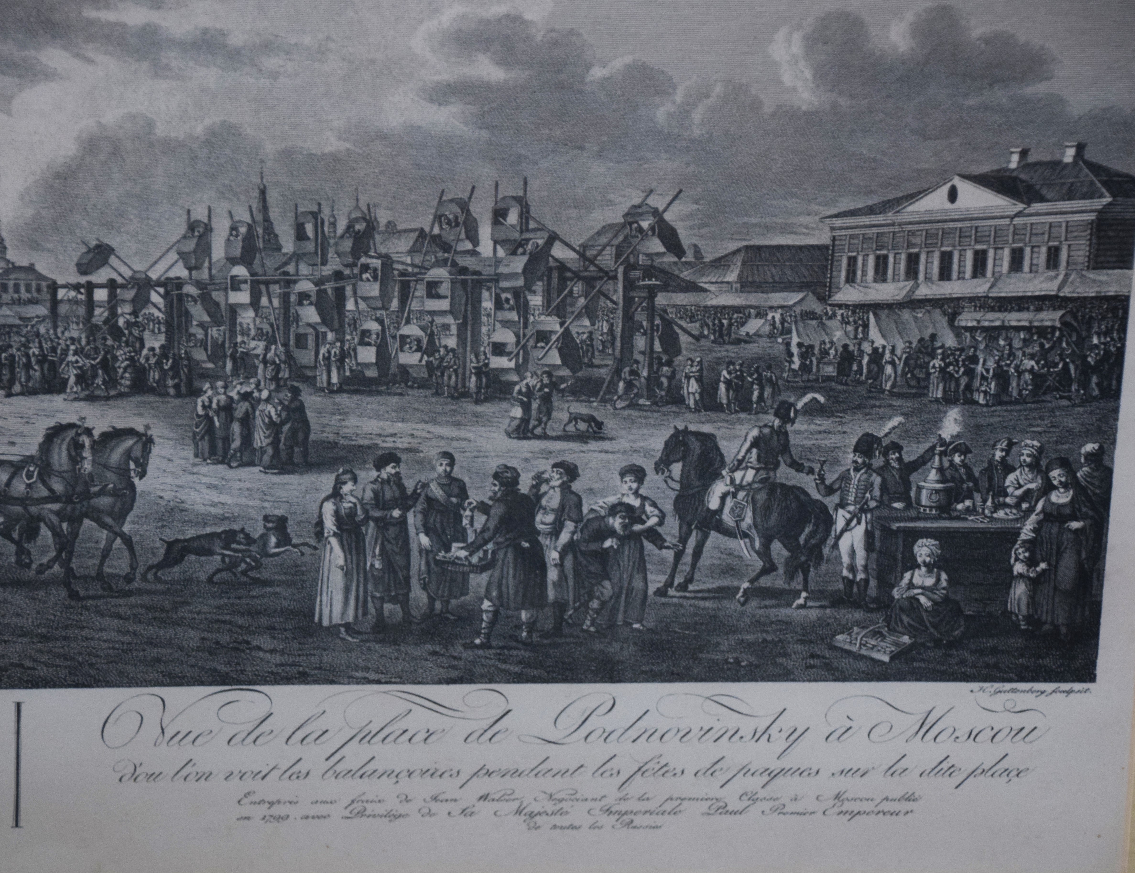 Framed 1799 Russian engraving titled “The View of the Podnovinskaya Square Which Can Be Seen by the Ferris Wheel During Easter” published with the privilege of the Imperial Majesty, Paul 1, emperor. Dimensions: 30″ x 36″ Overall