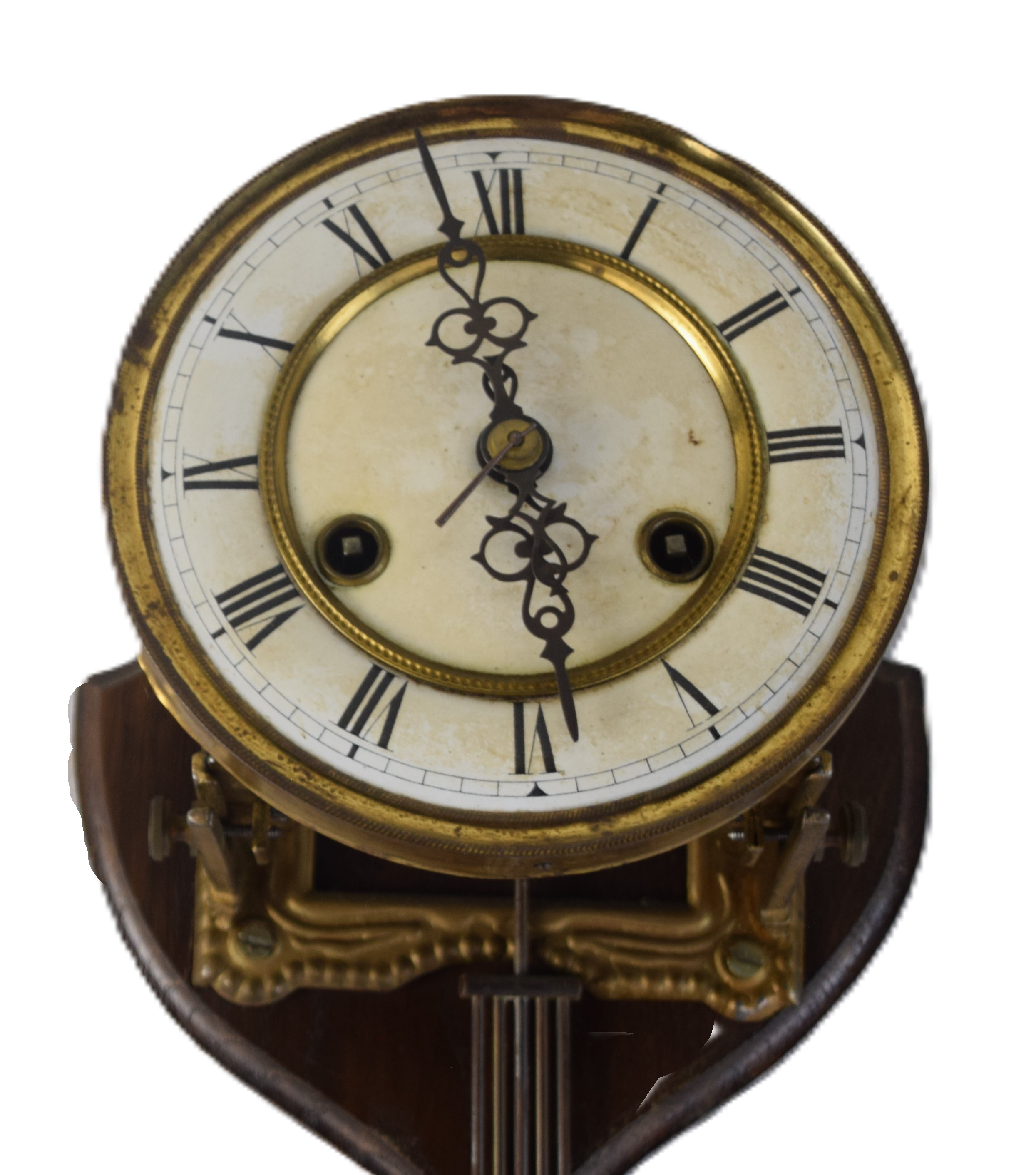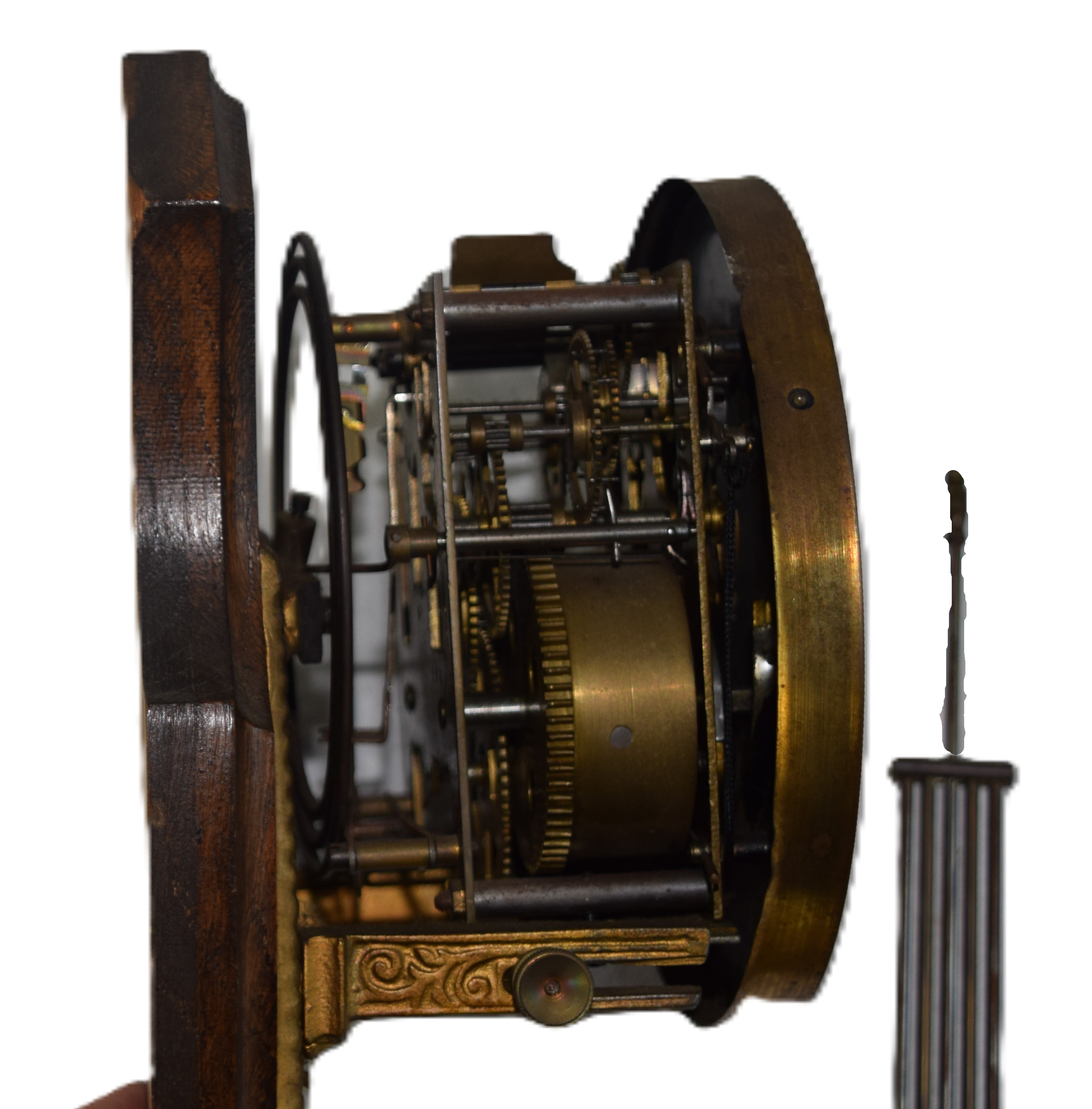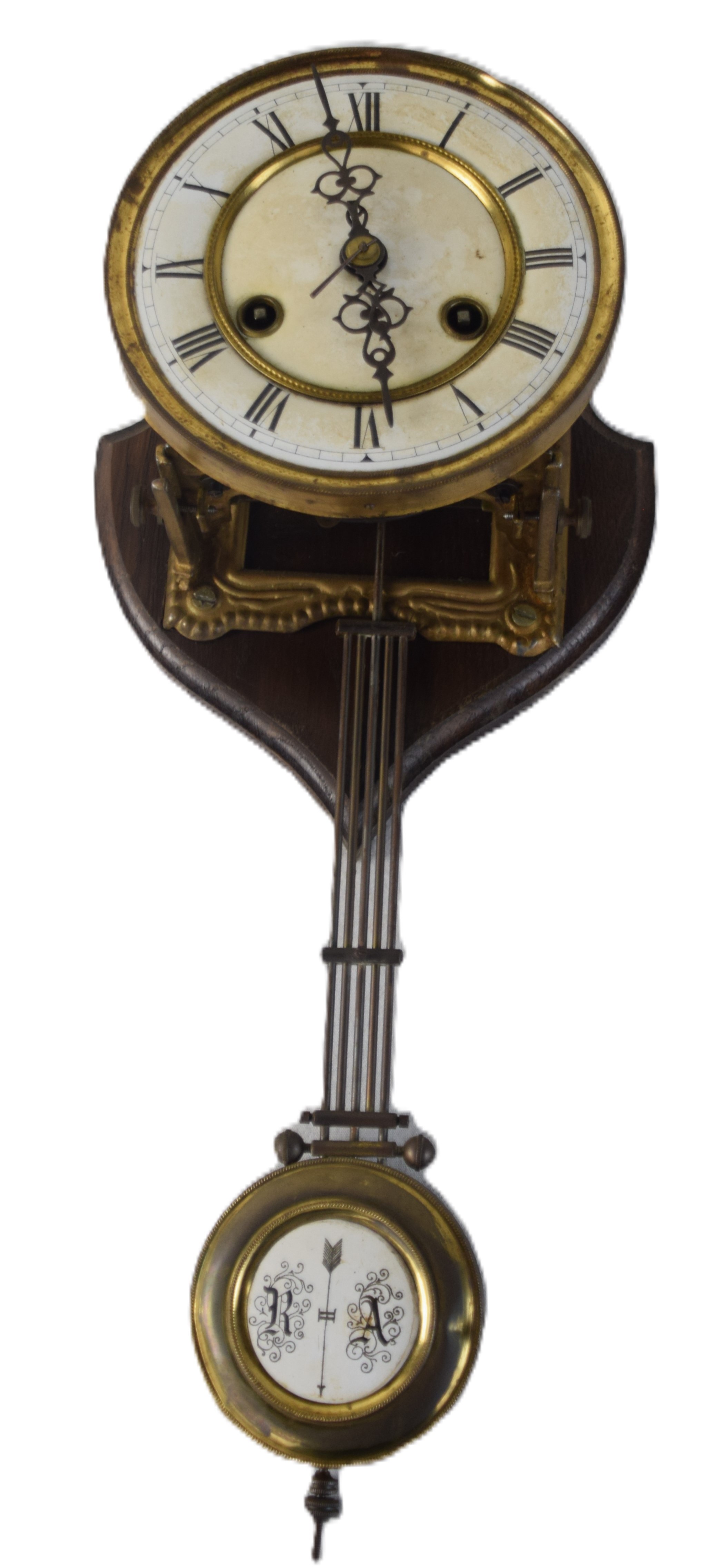 French hanging wall clock with circular Roman numerals dial with long pendulum and brass works. Dimensions: 17″ H